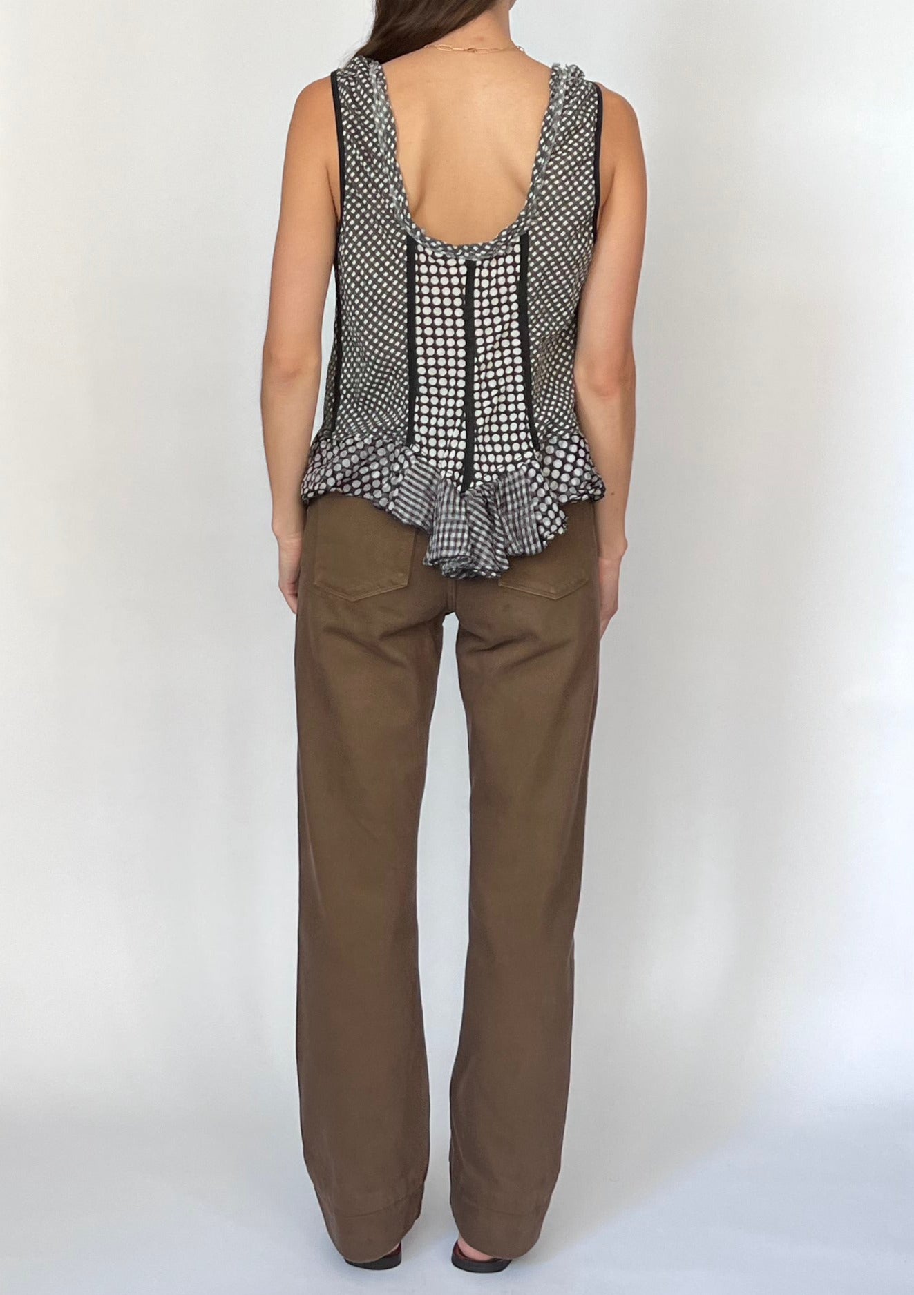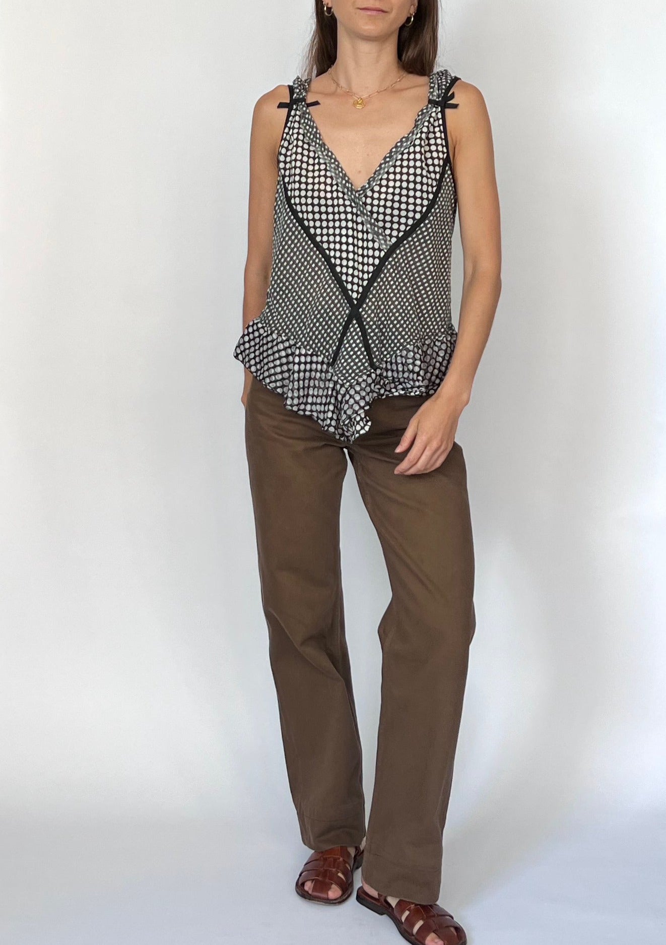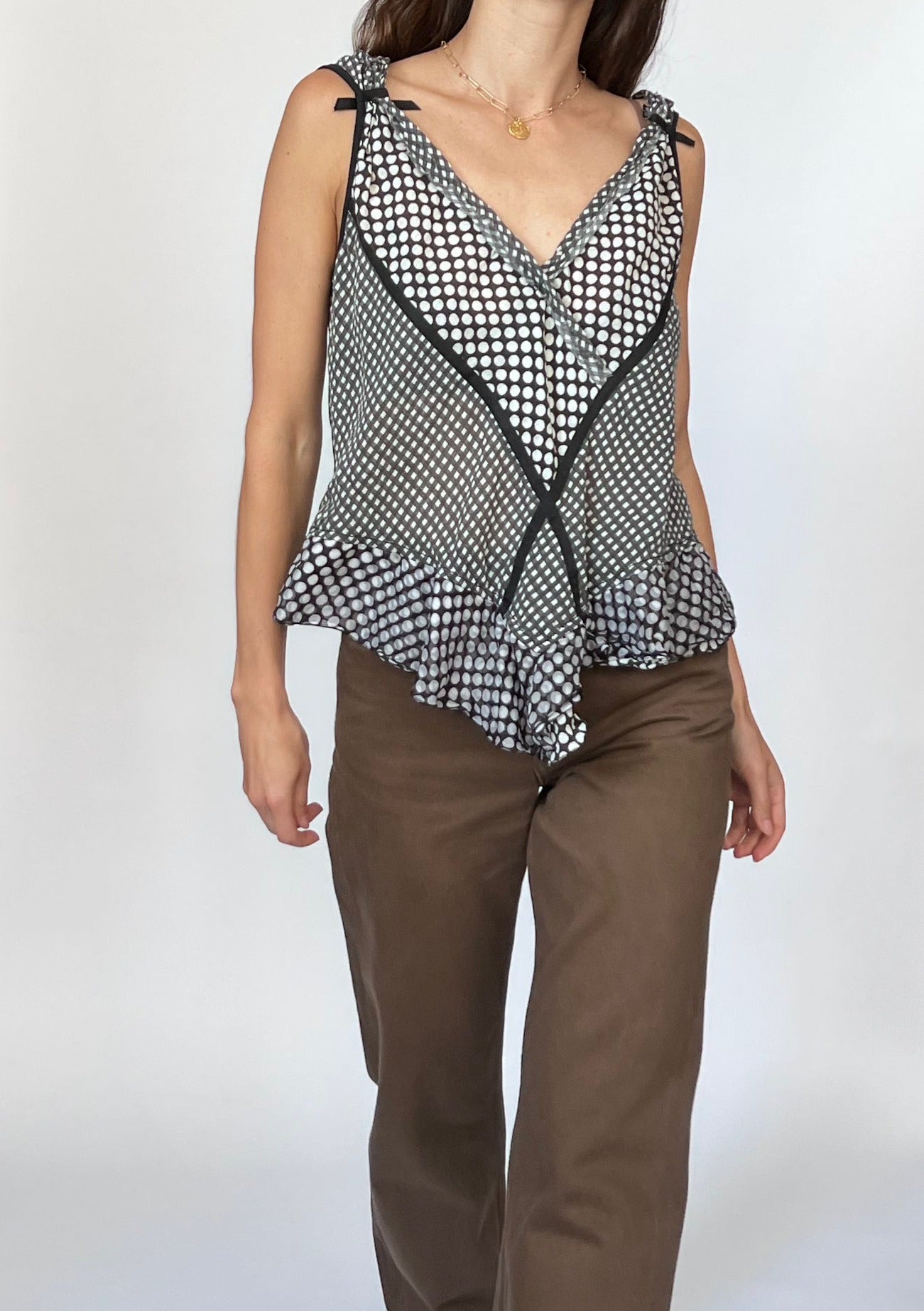 00s polka dot silk layered top. Features a vest strap, double layer fluted hem, raw edges and a v-neck. Made by Marithe Francois Girbaud