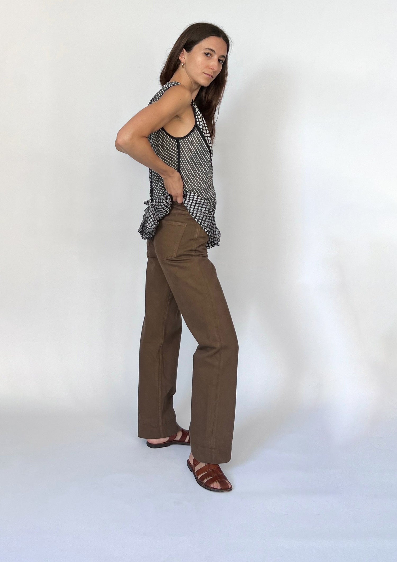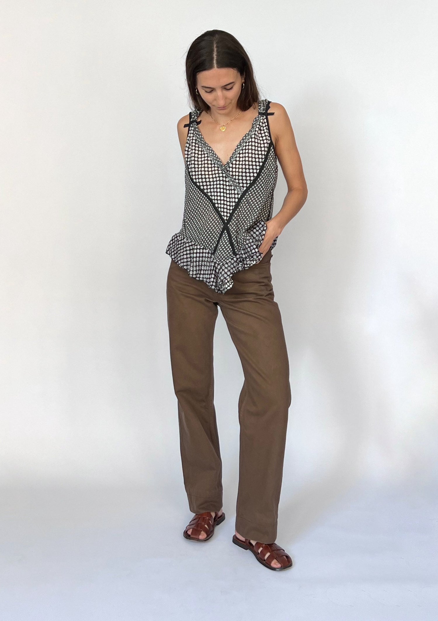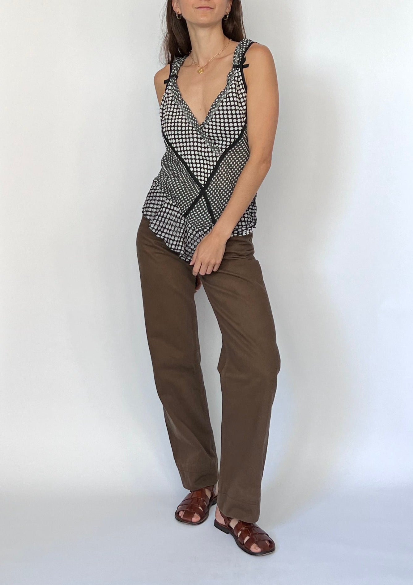 00s polka dot silk layered top. Features a vest strap, double layer fluted hem, raw edges and a v-neck. Made by Marithe Francois Girbaud