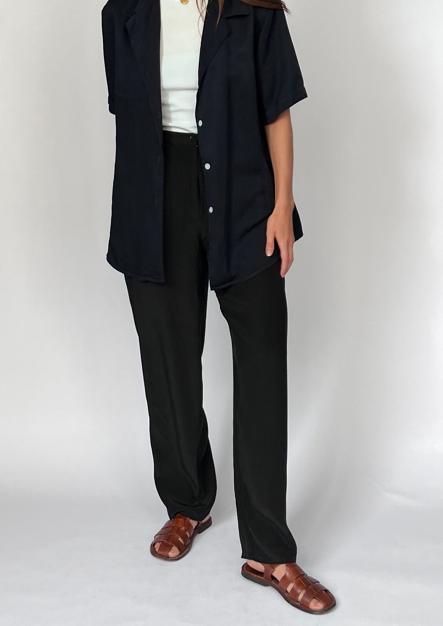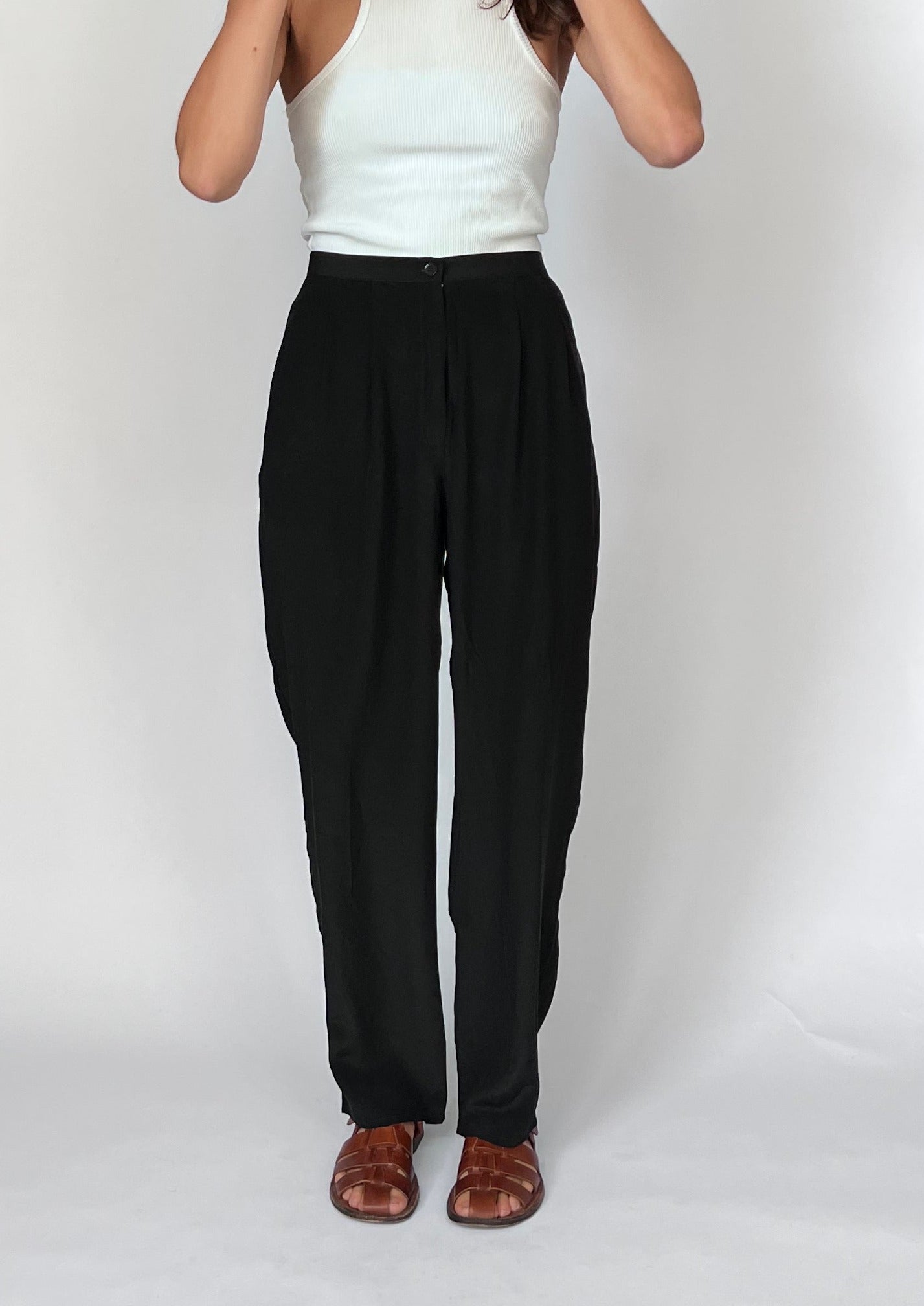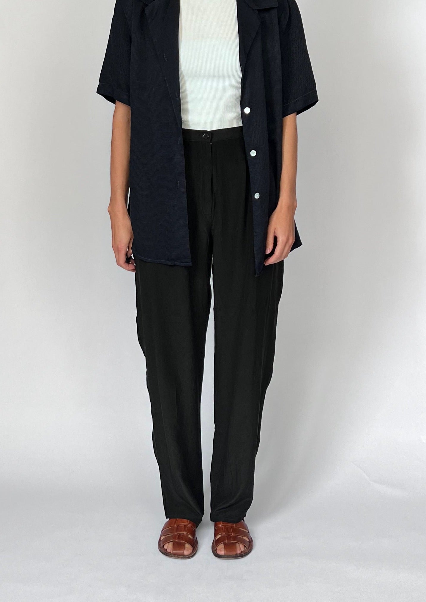 90s Silk black trousers. Features a lightweight silk, fly and button fastening and a relaxed, straight leg. Side pockets for essentials.