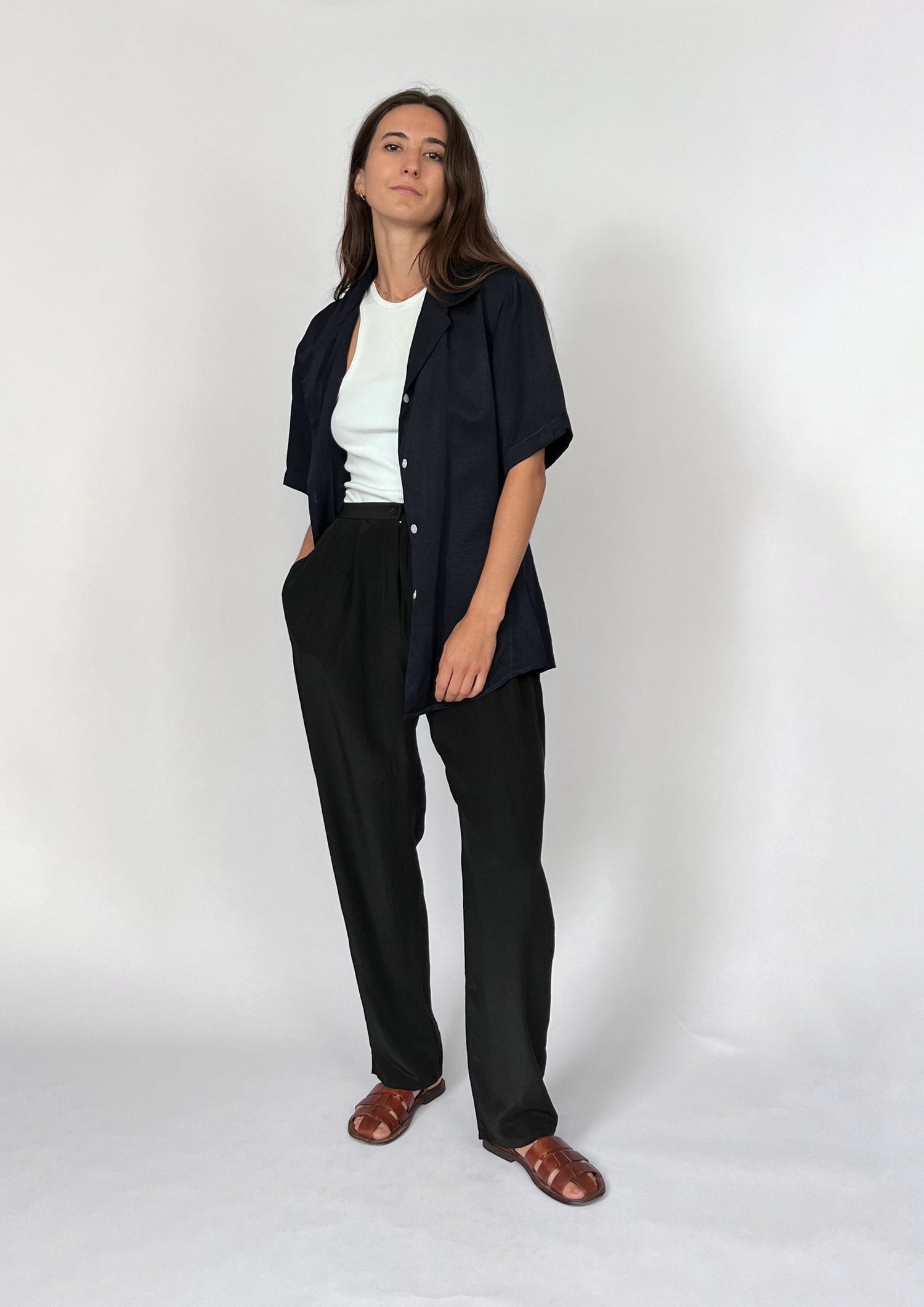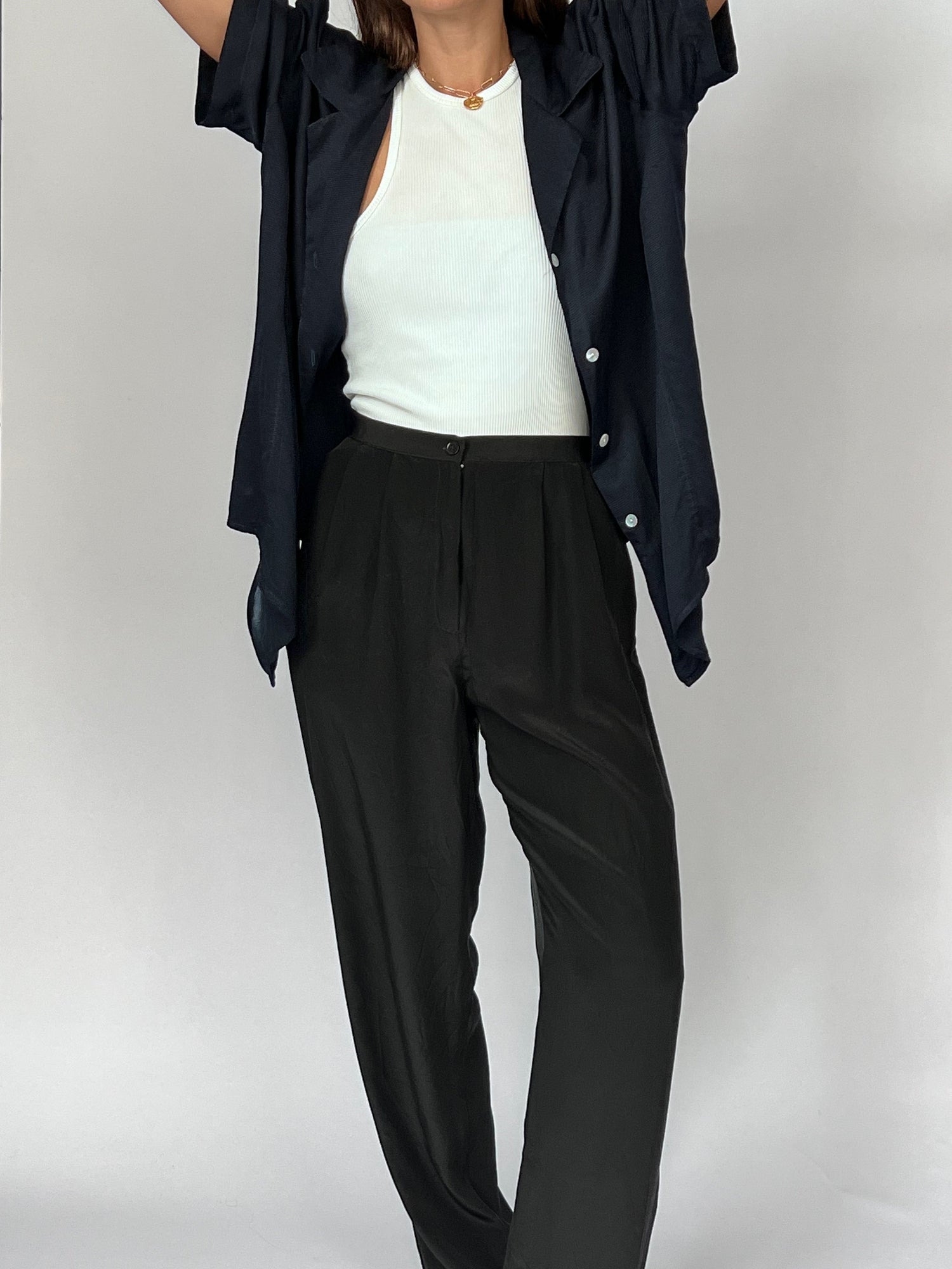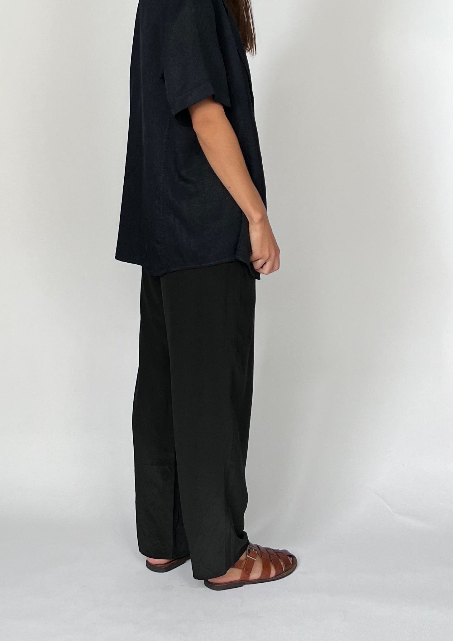 90s Silk black trousers. Features a lightweight silk, fly and button fastening and a relaxed, straight leg. Side pockets for essentials.