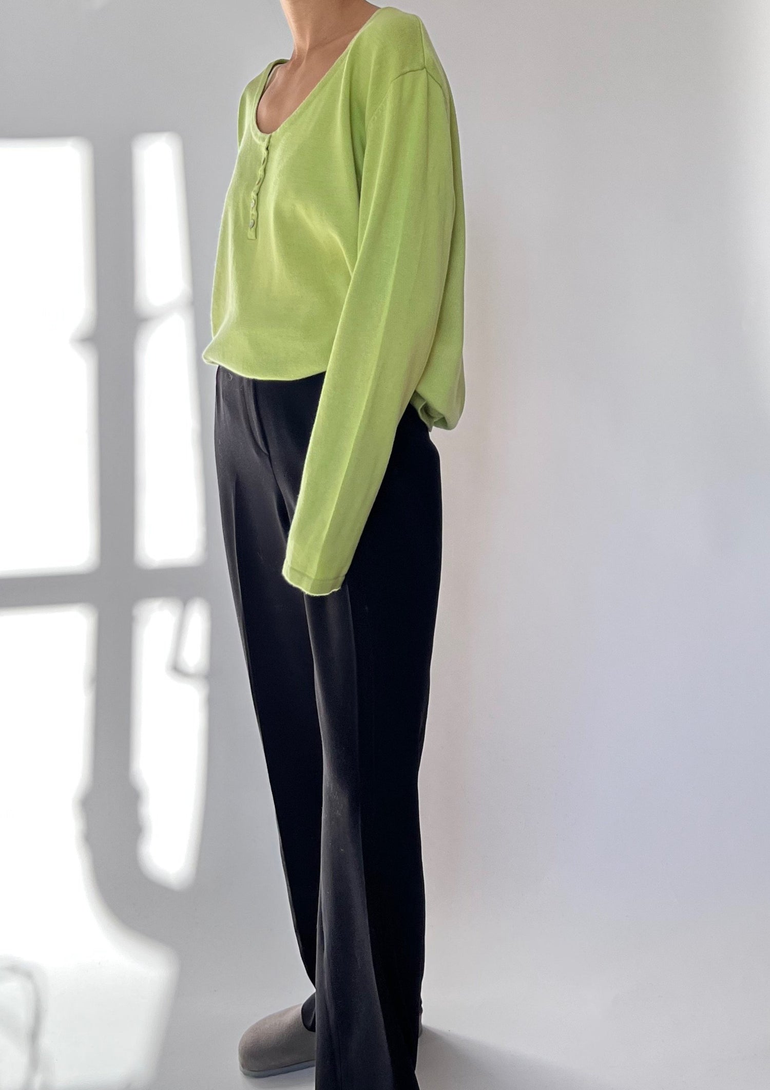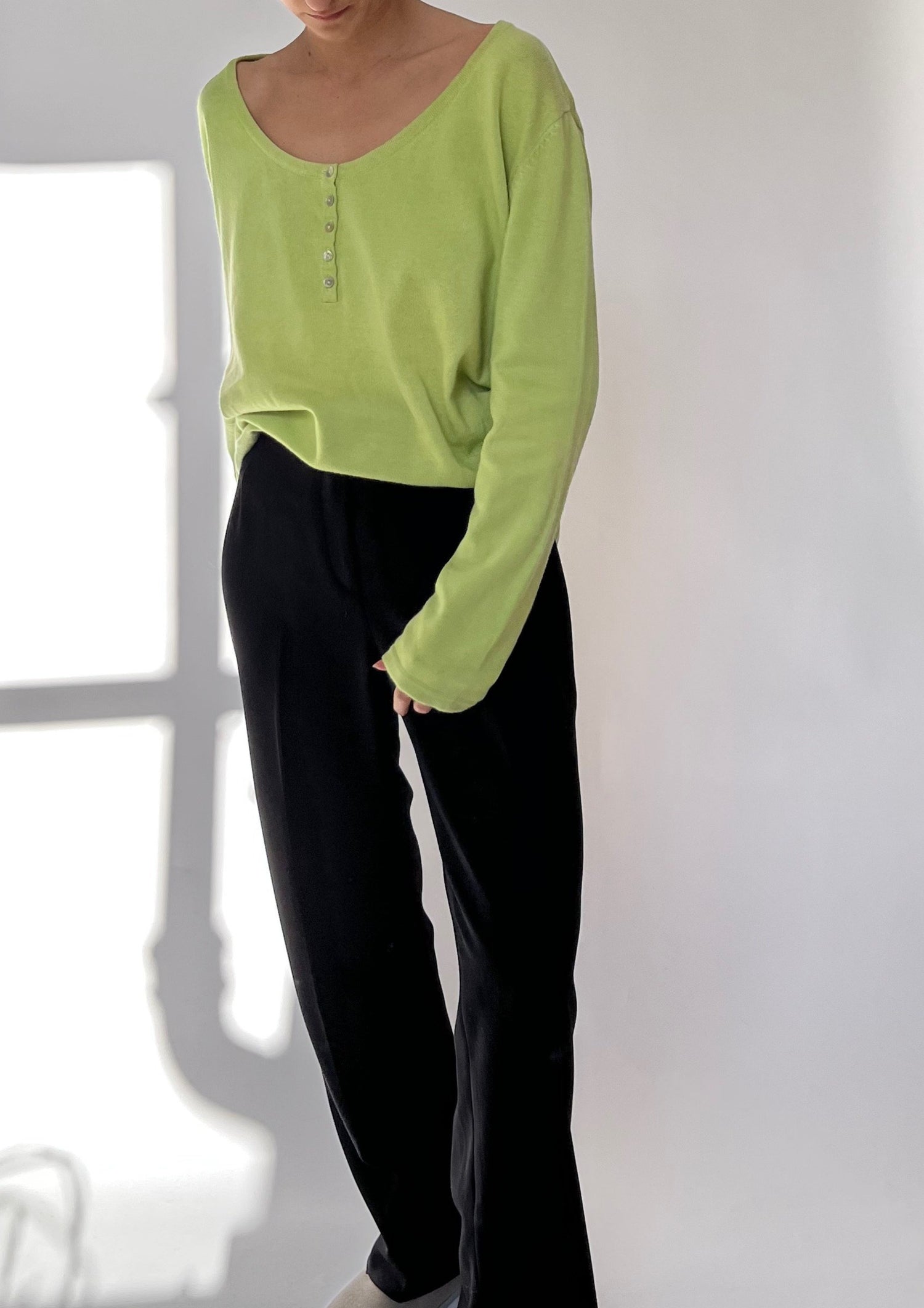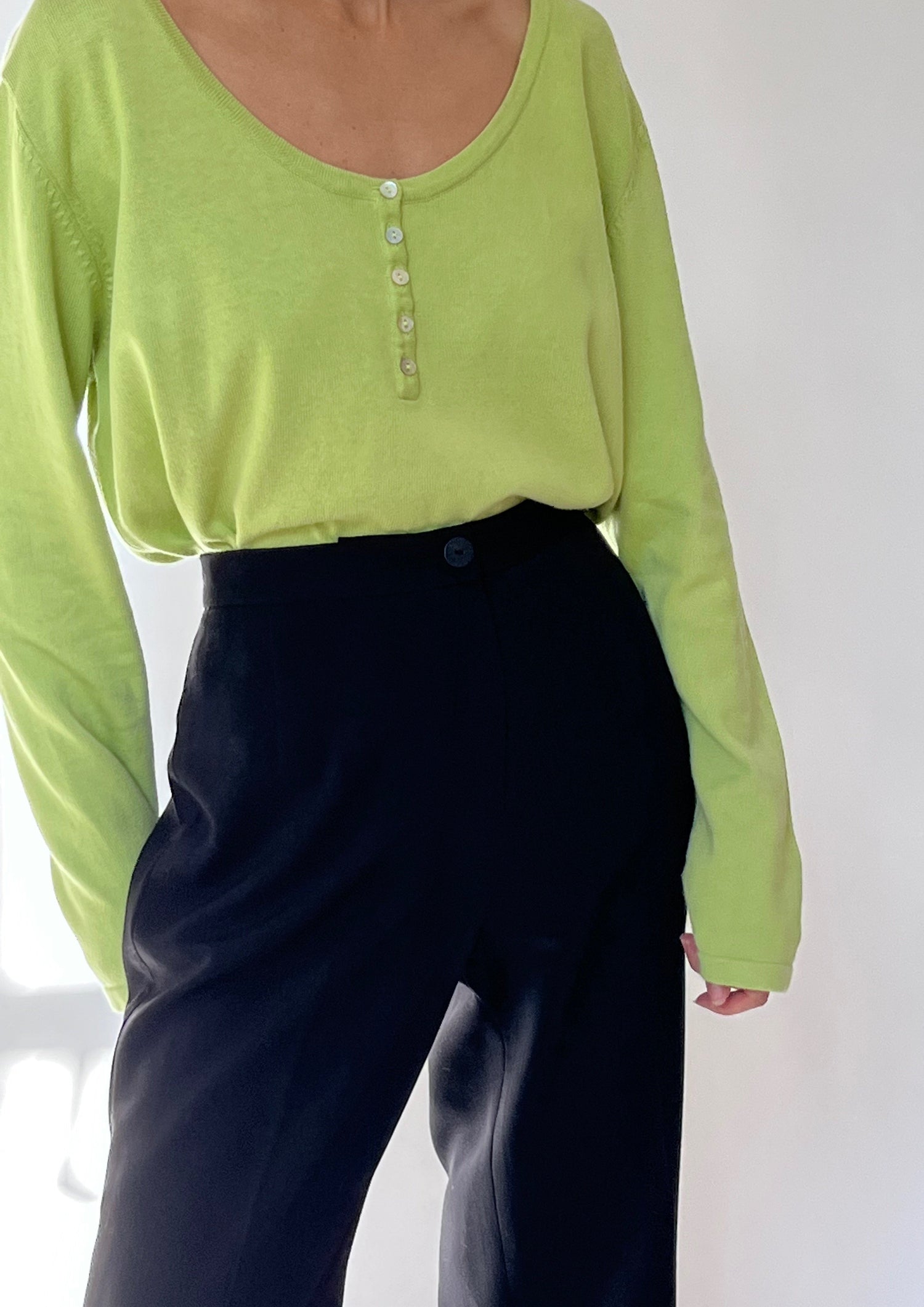 Oversized 1980s-90s vintage lime green jumper. Made by 'Best Connections'. 100% Cotton. In a relaxed, oversized fit, a long sleeve and henley button detail.