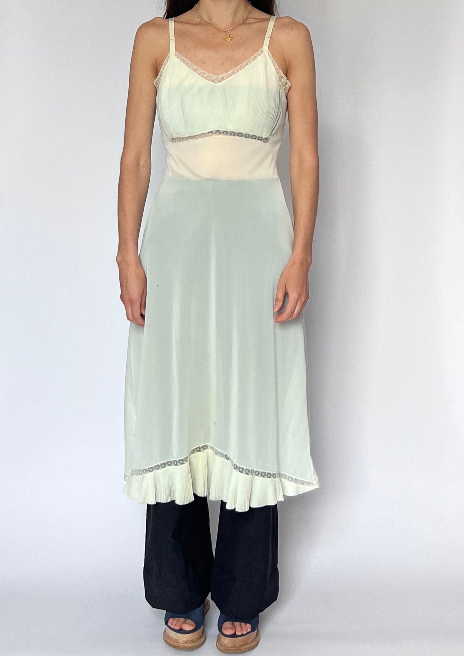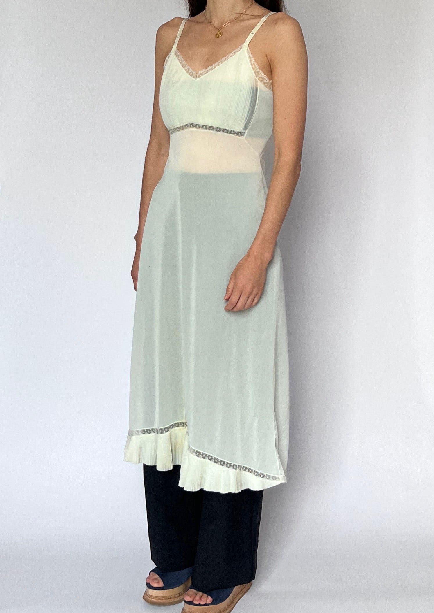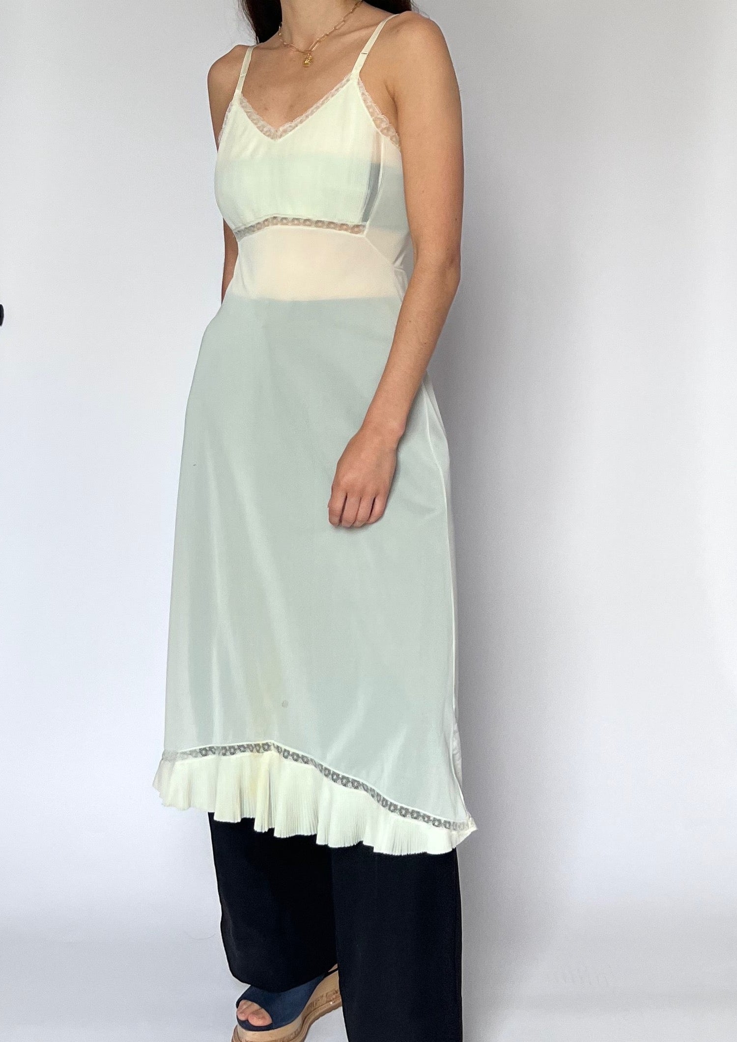 70s lingerie slip dress in ivory mesh. Features a pleated bust, lace trim detail and sheer body. Perfect for layering over trousers. With adjustable straps