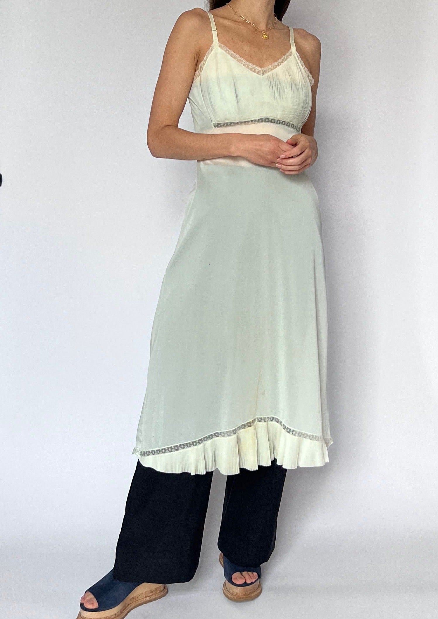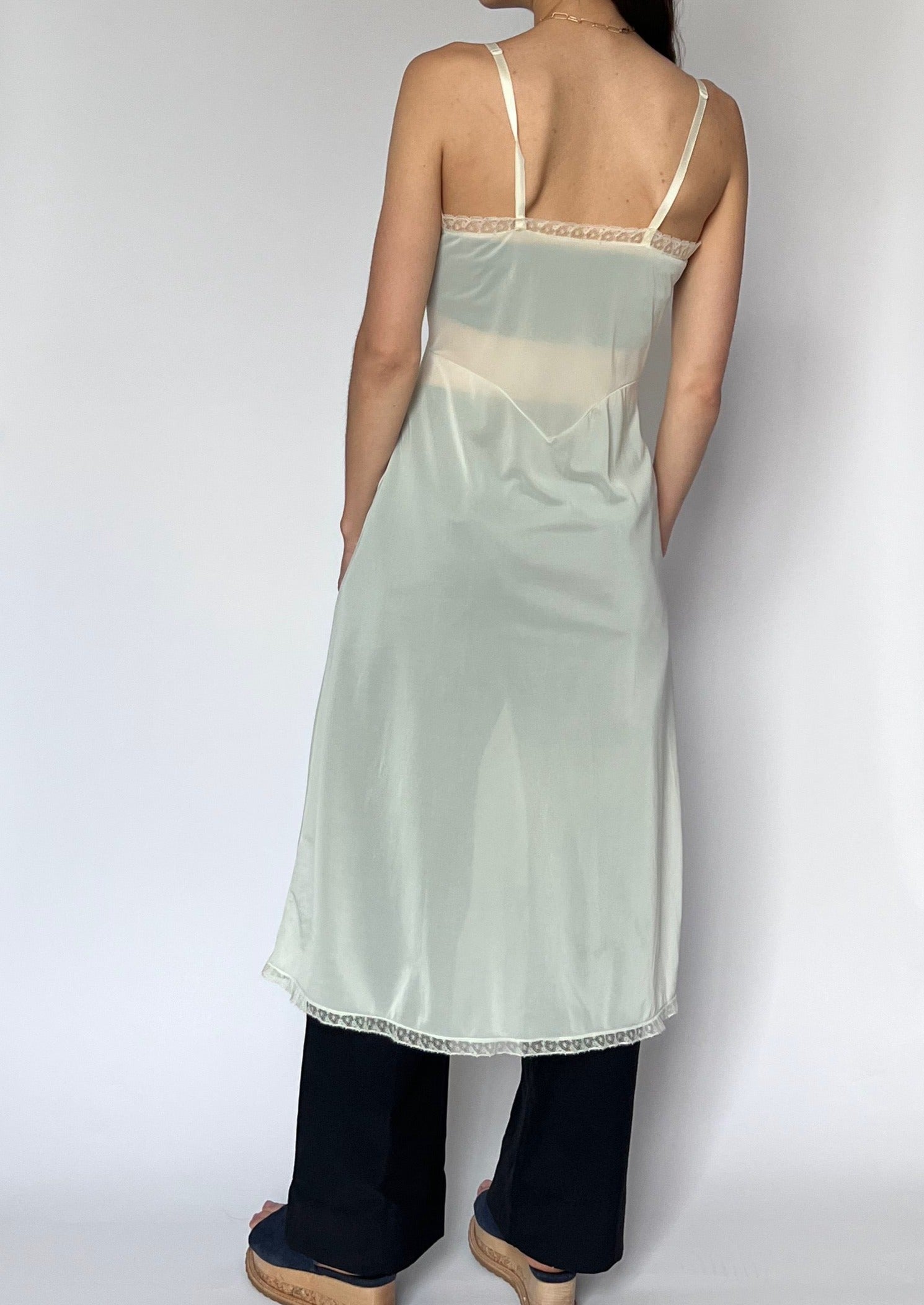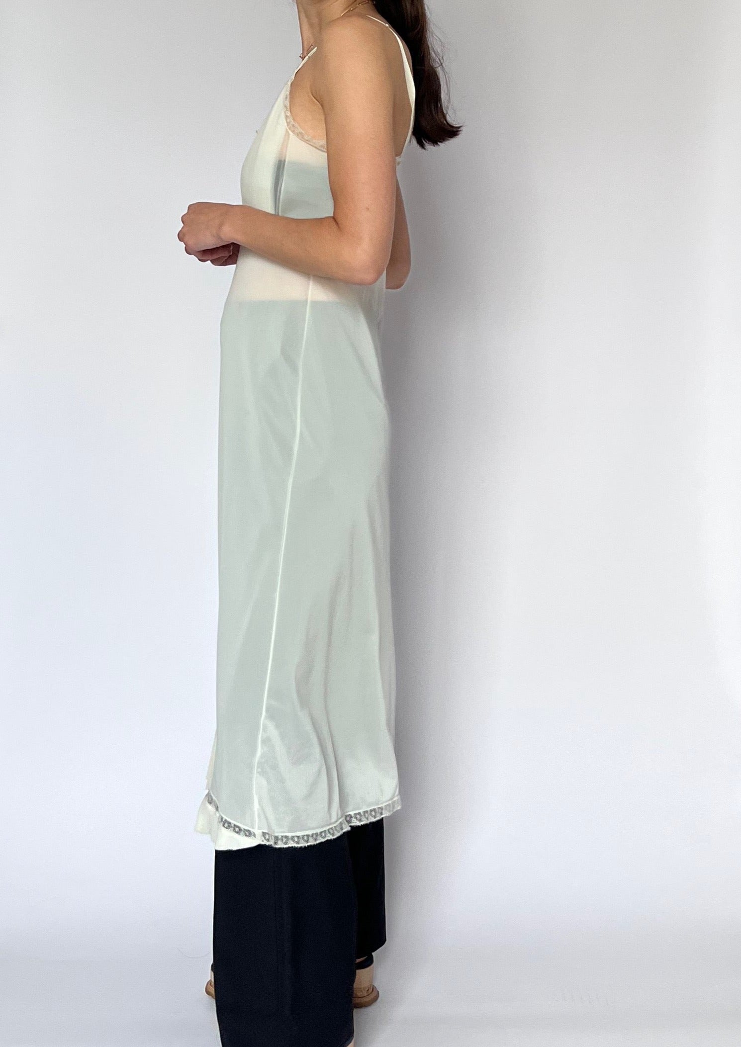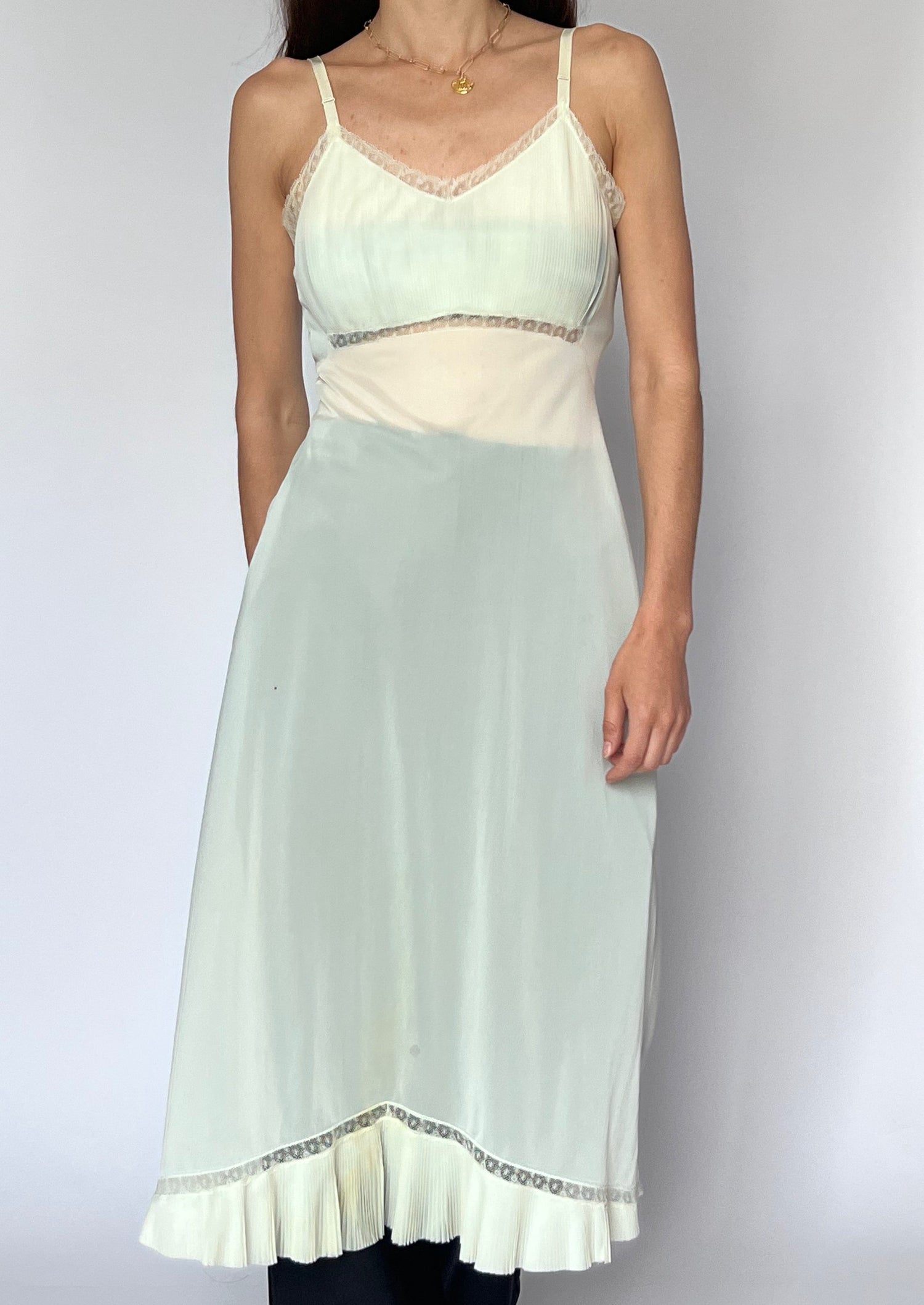 70s lingerie slip dress in ivory mesh. Features a pleated bust, lace trim detail and sheer body. Perfect for layering over trousers. With adjustable straps