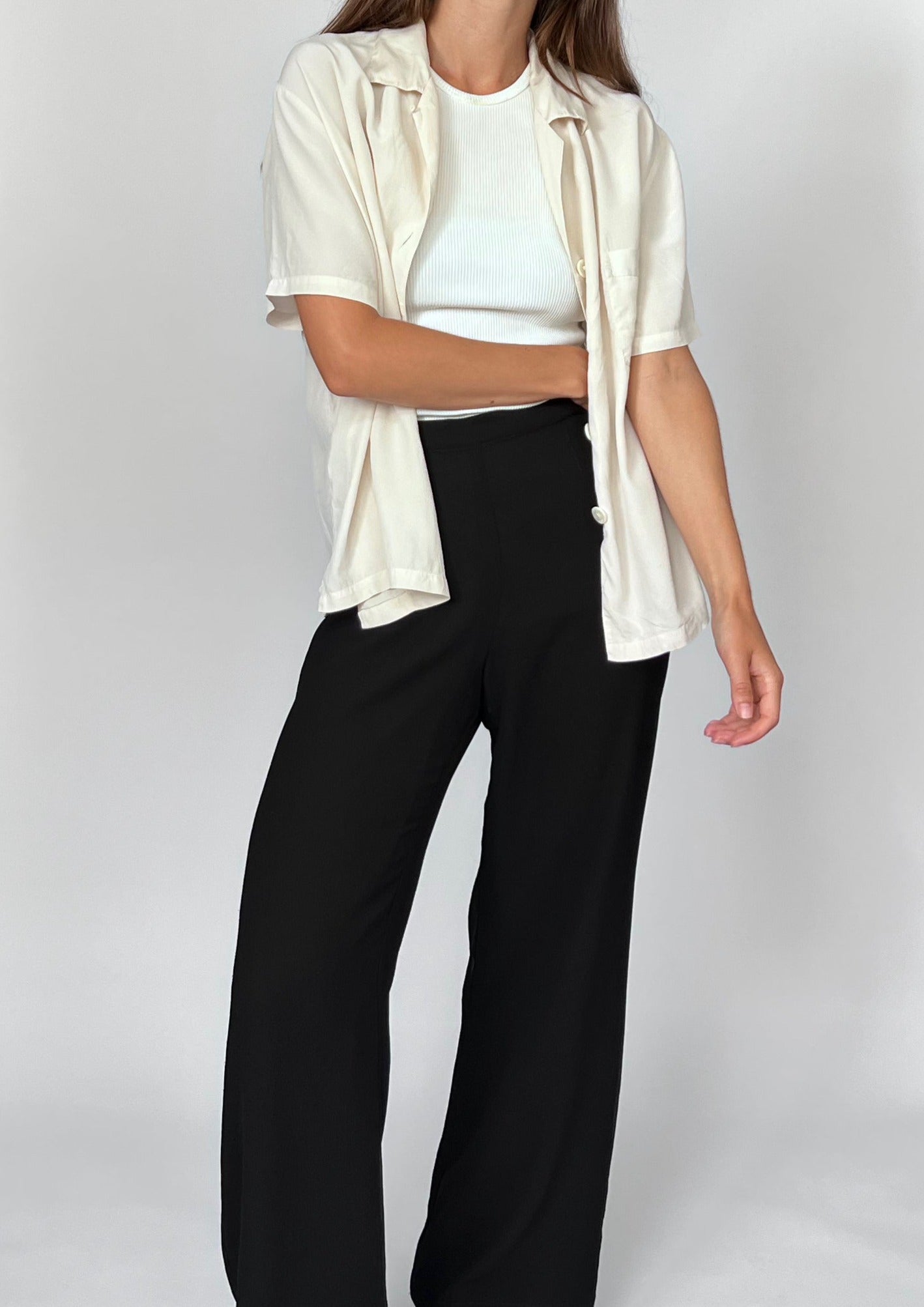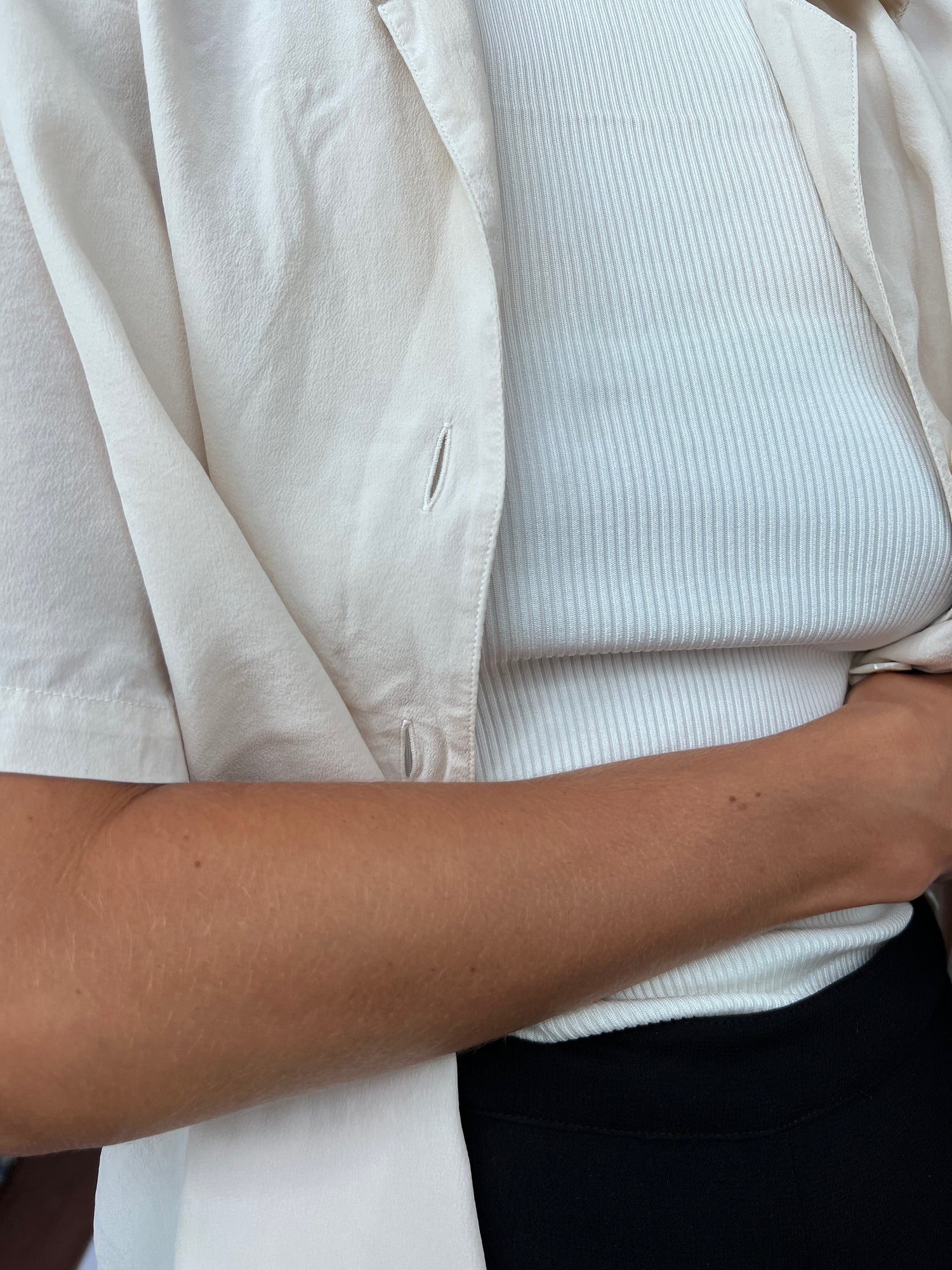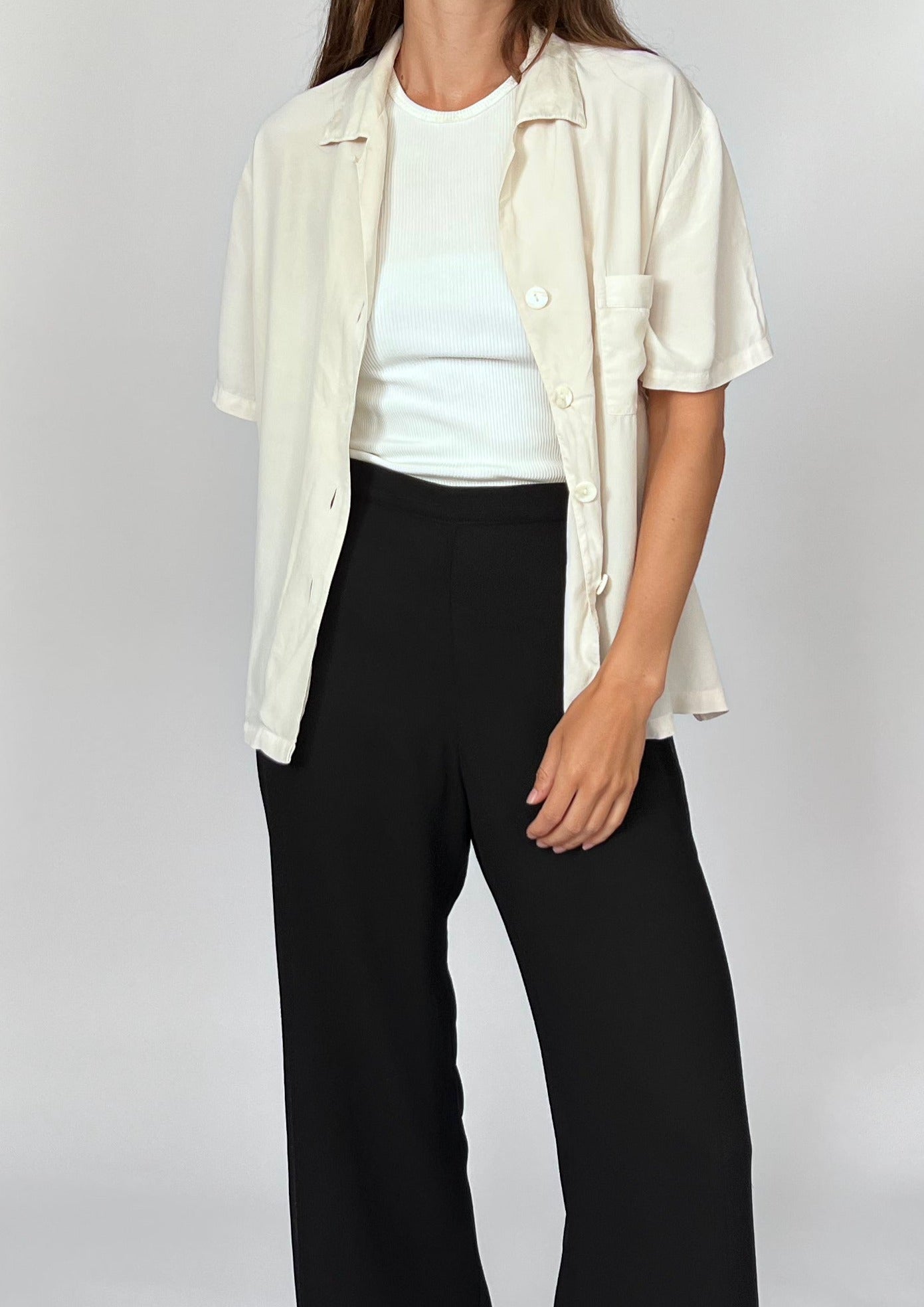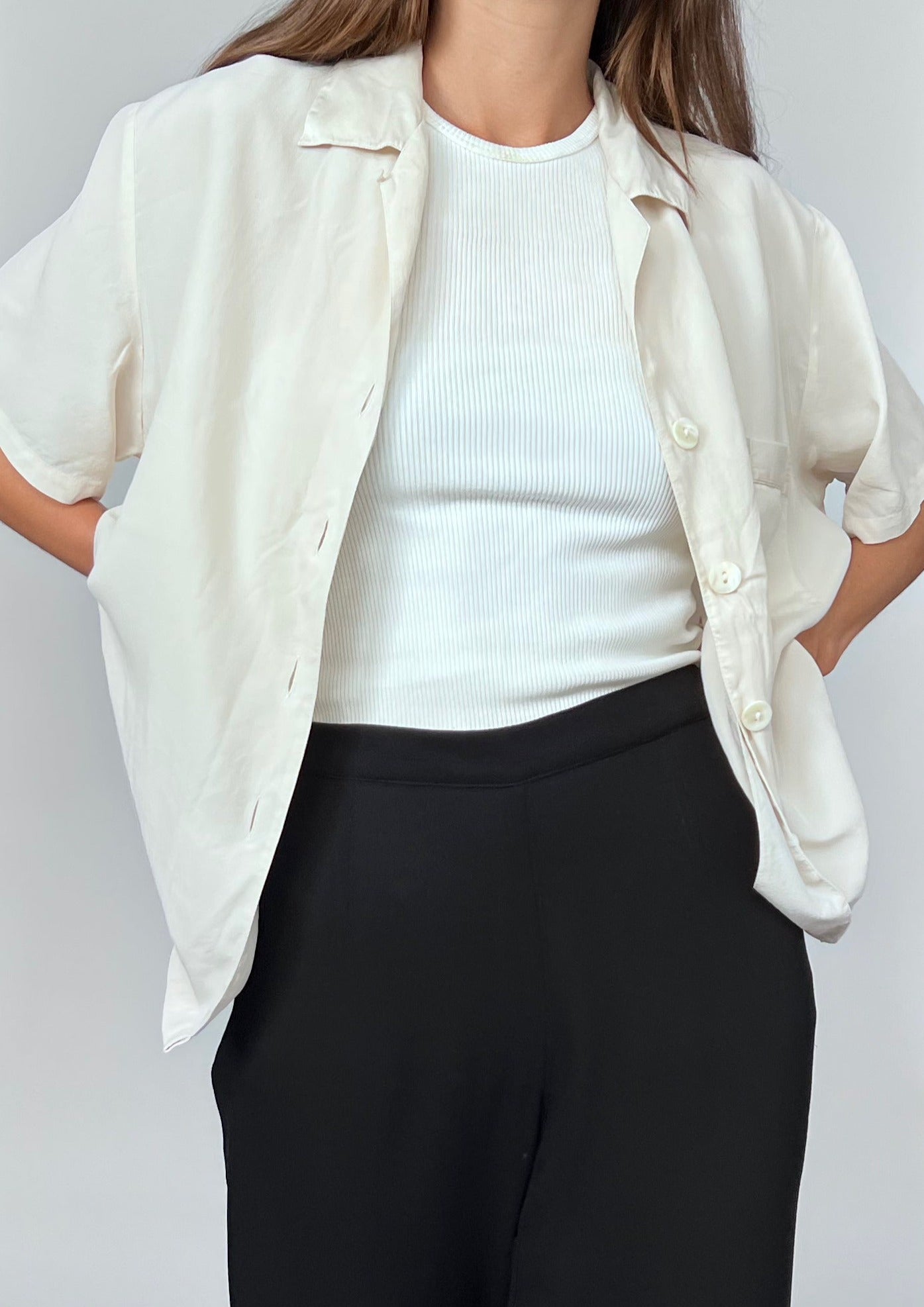 70s resort shift made in 100% silk. Feels like cupro silk, luxuriously soft. Features a revere/convertible collar, short sleeves and button down fastening