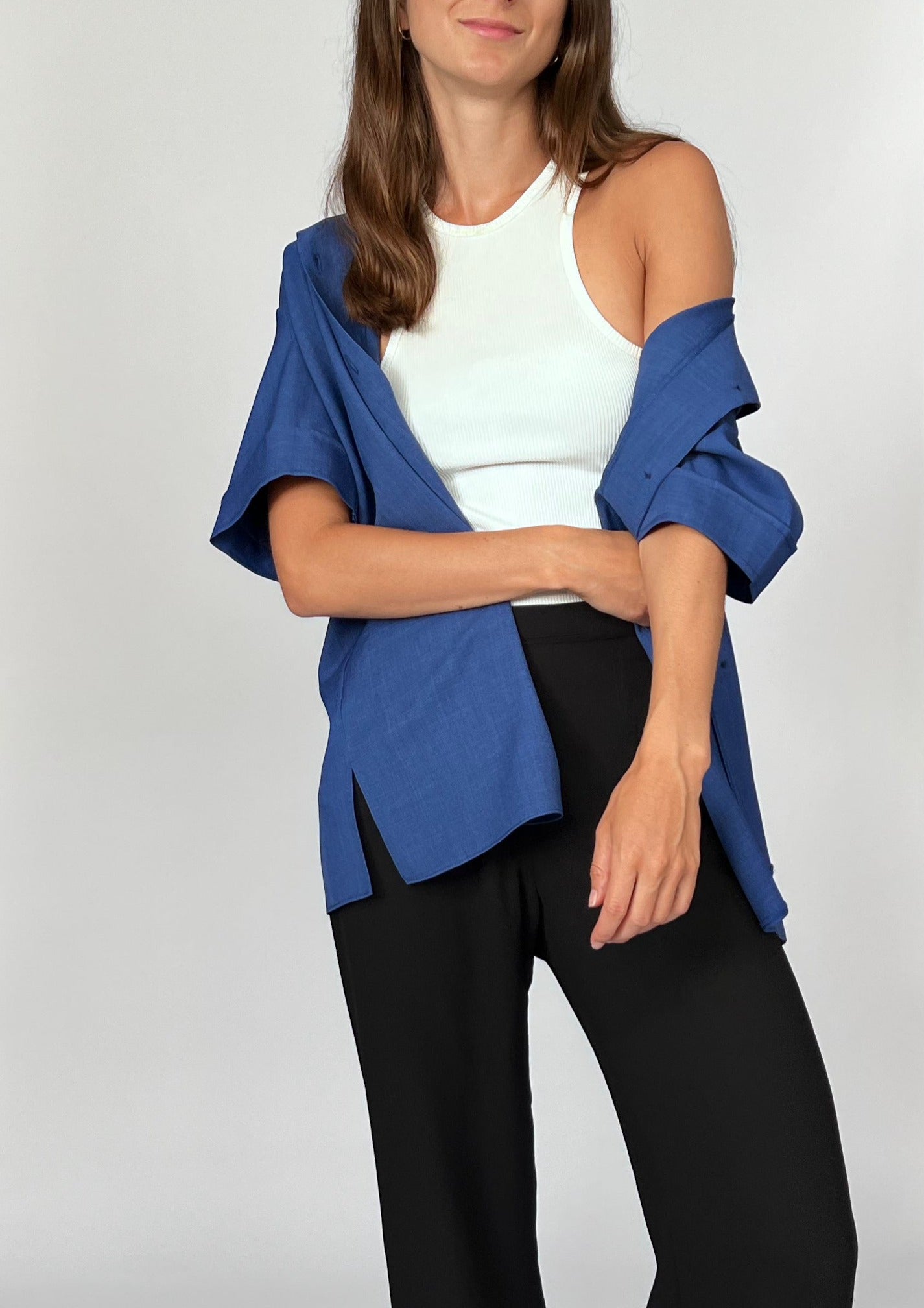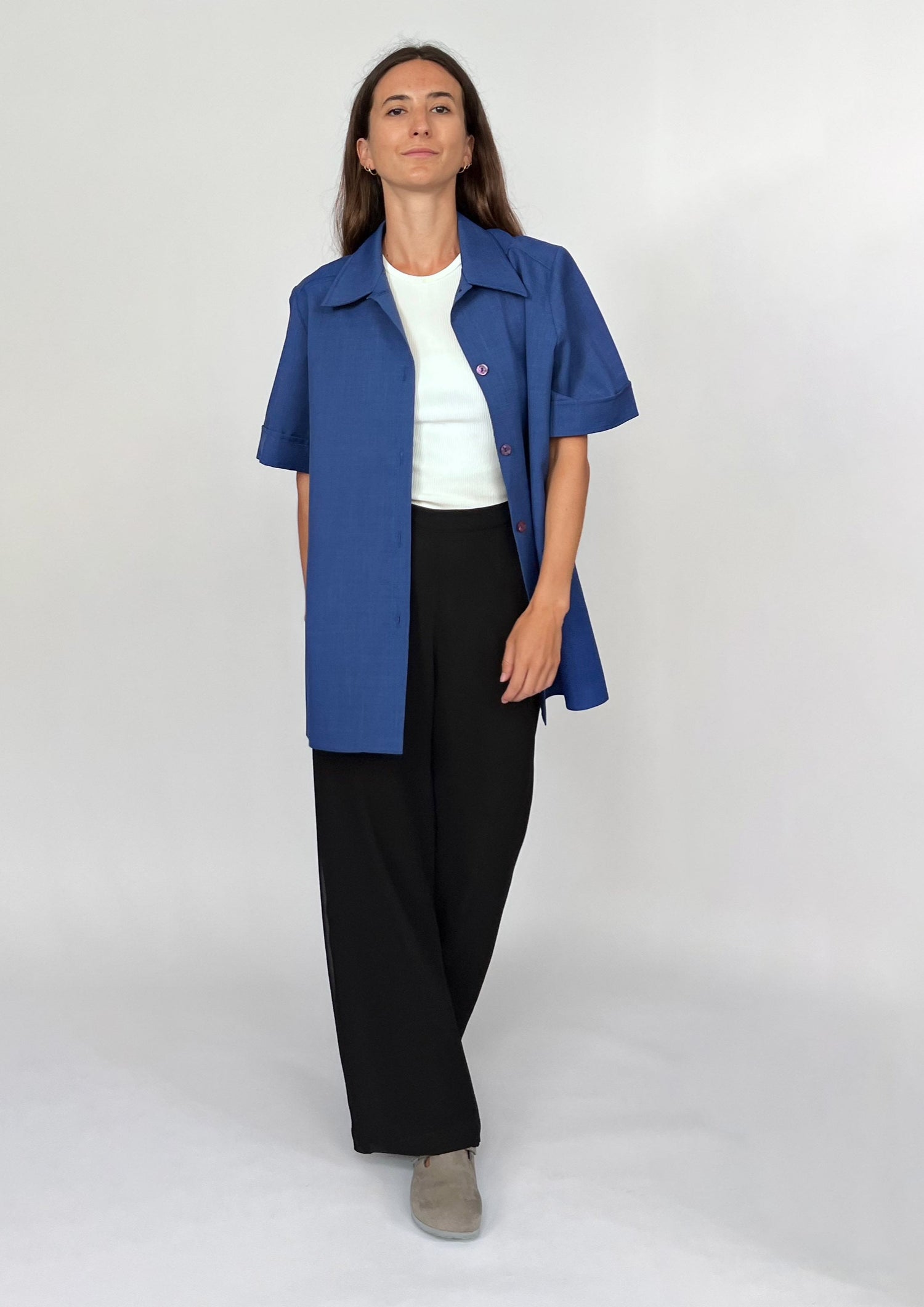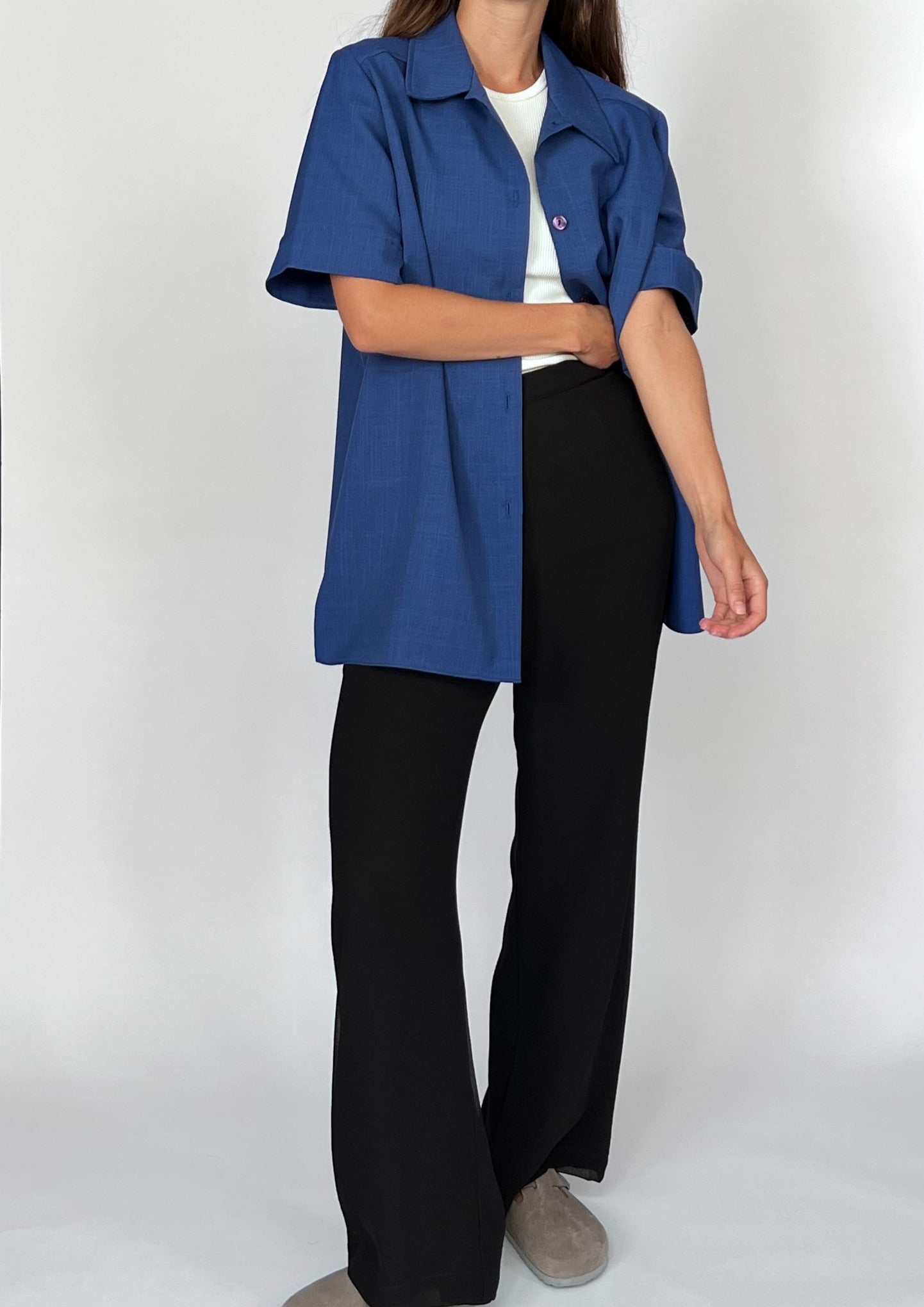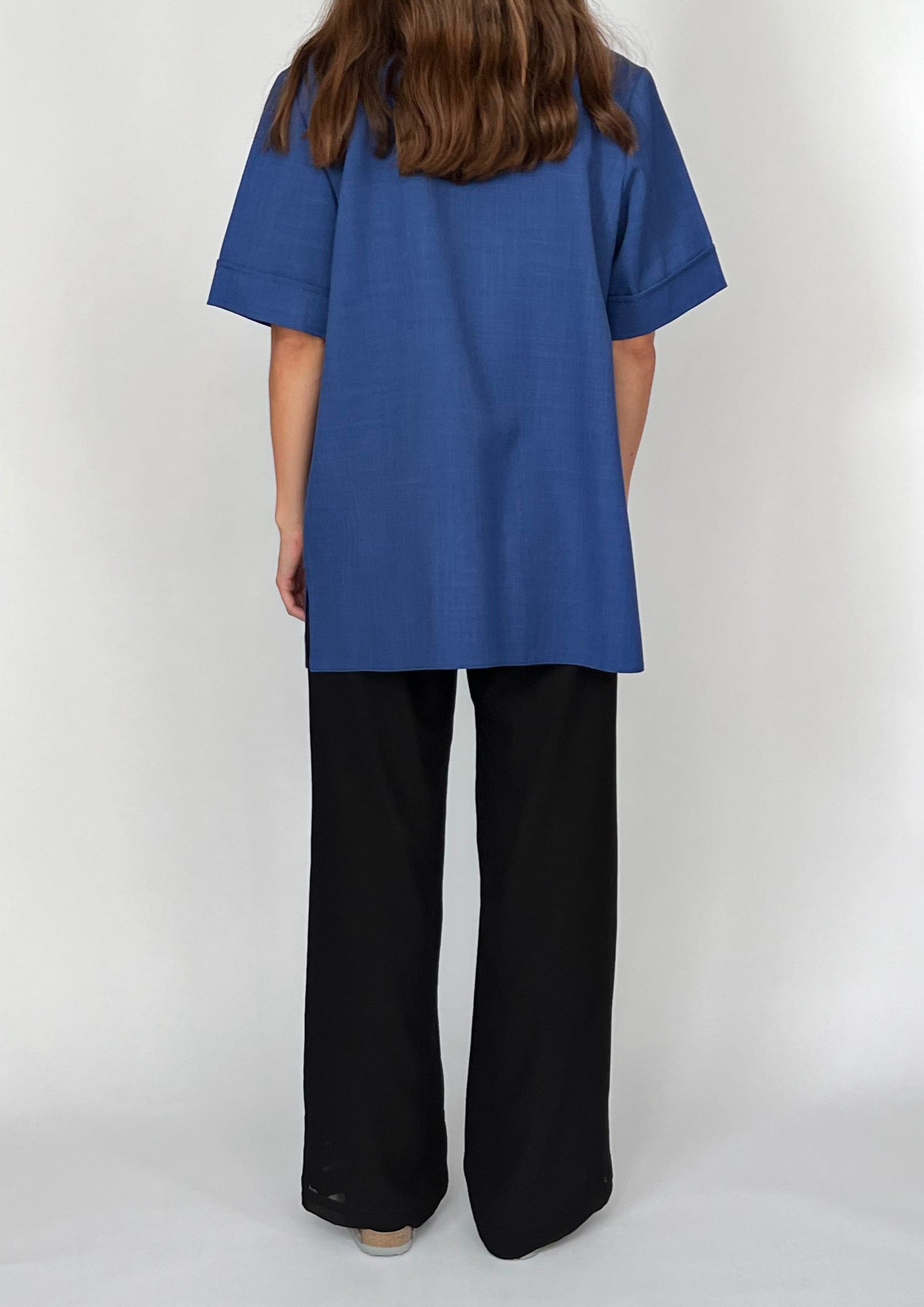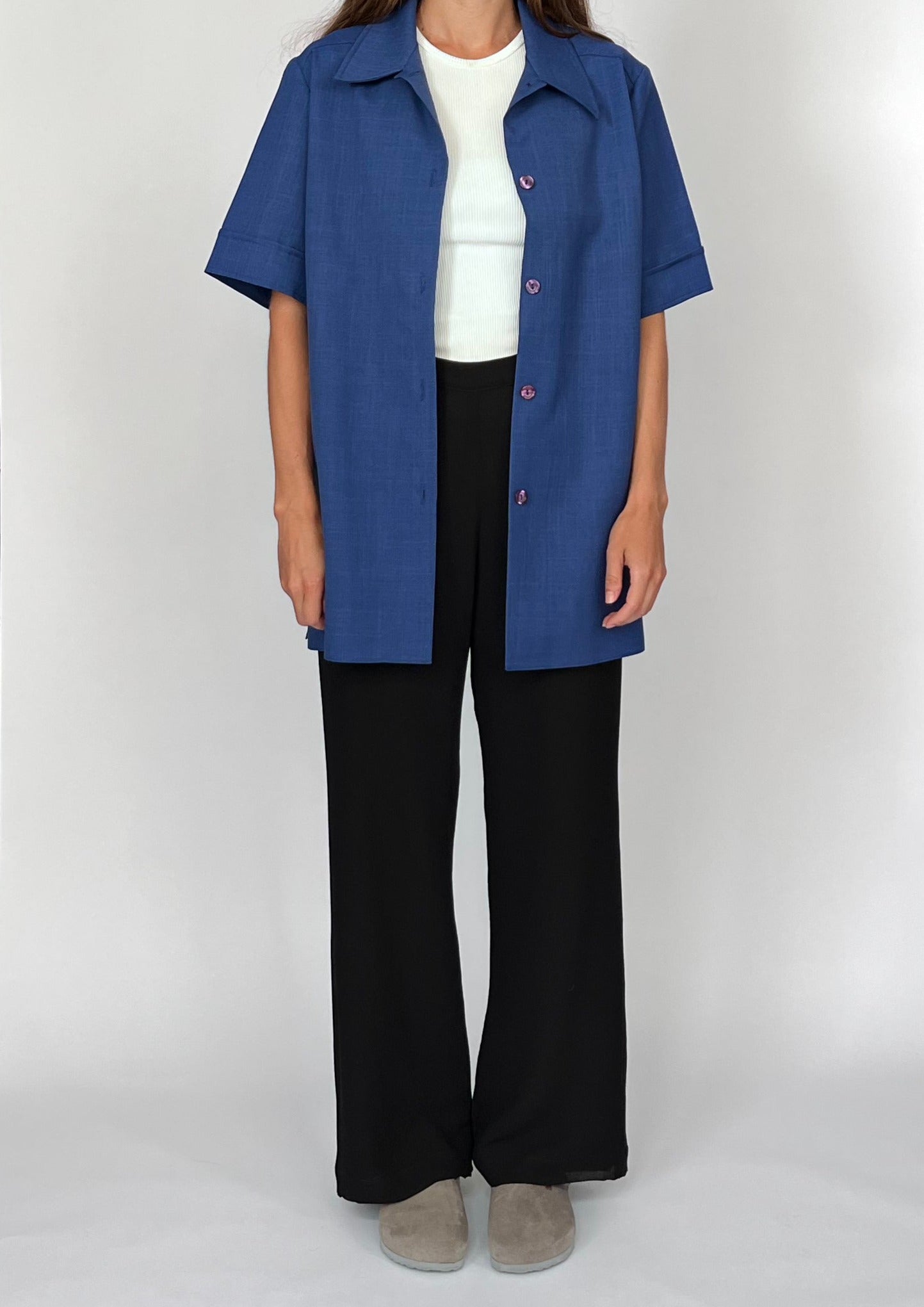 Blue marl resort shirt featuring short sleeves, a revere collar and a wrinkle free fabric.