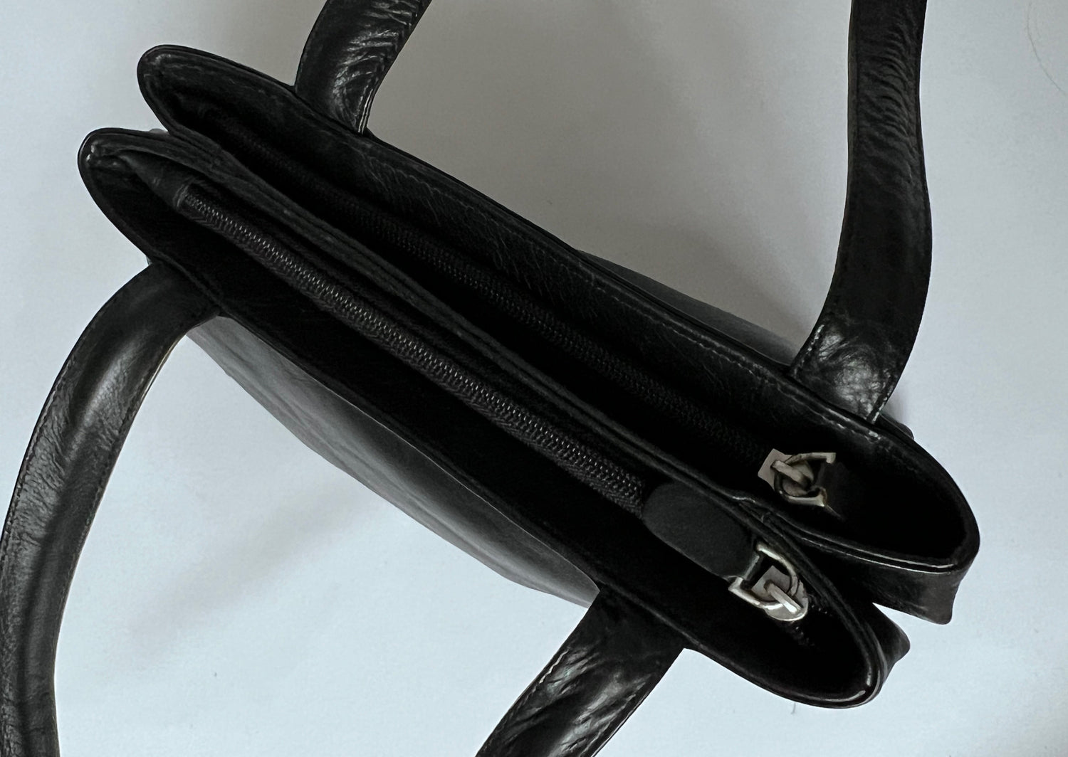 90s Black leather shoulder bag. Features two zip compartments with an inner zip pocket for essentials. Double strap detail.