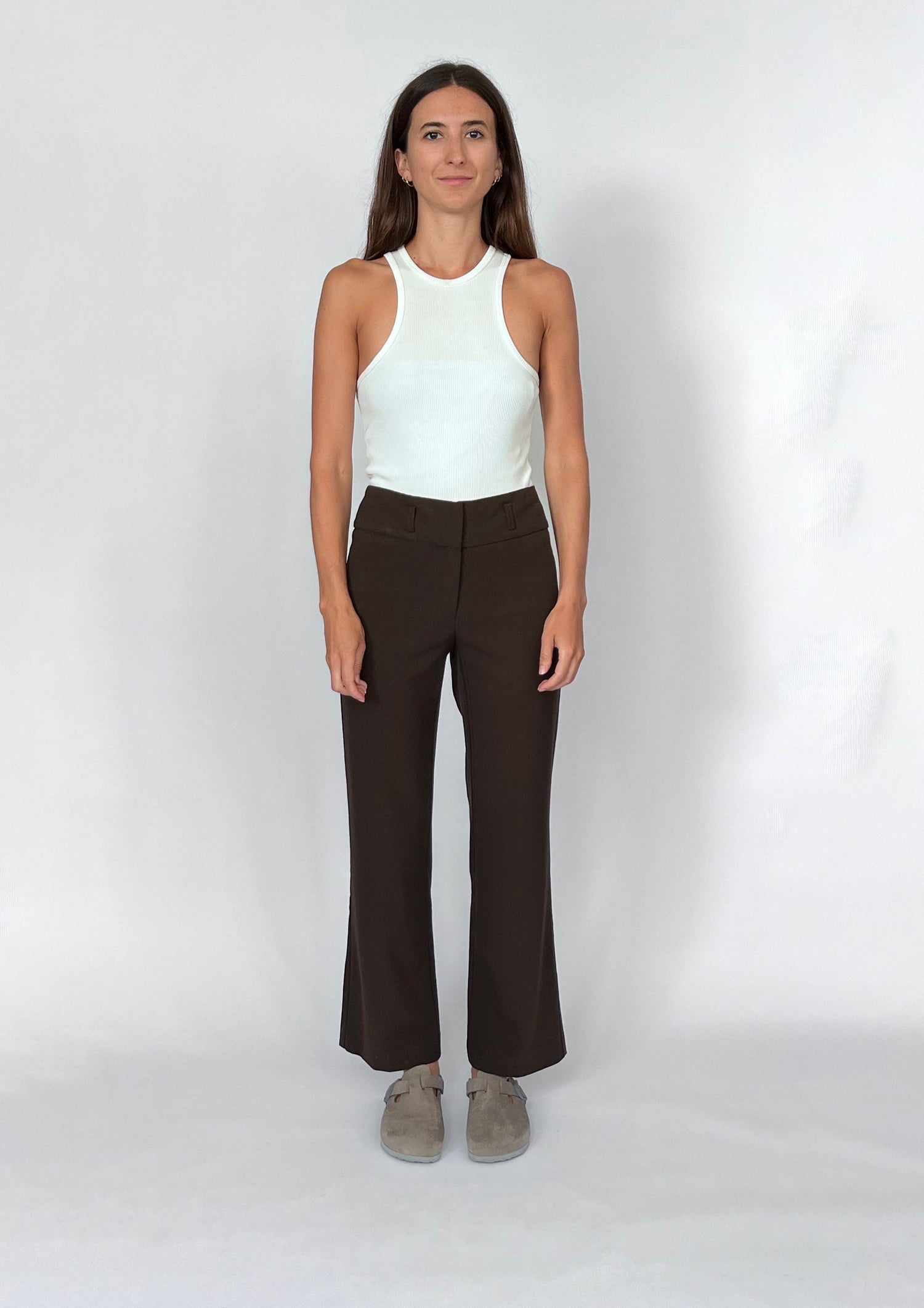 90s Brown wide leg trousers. Perfectly fitted at the waist with a gentle flare to the wide hem. Fasten with a fly/hook and eye.