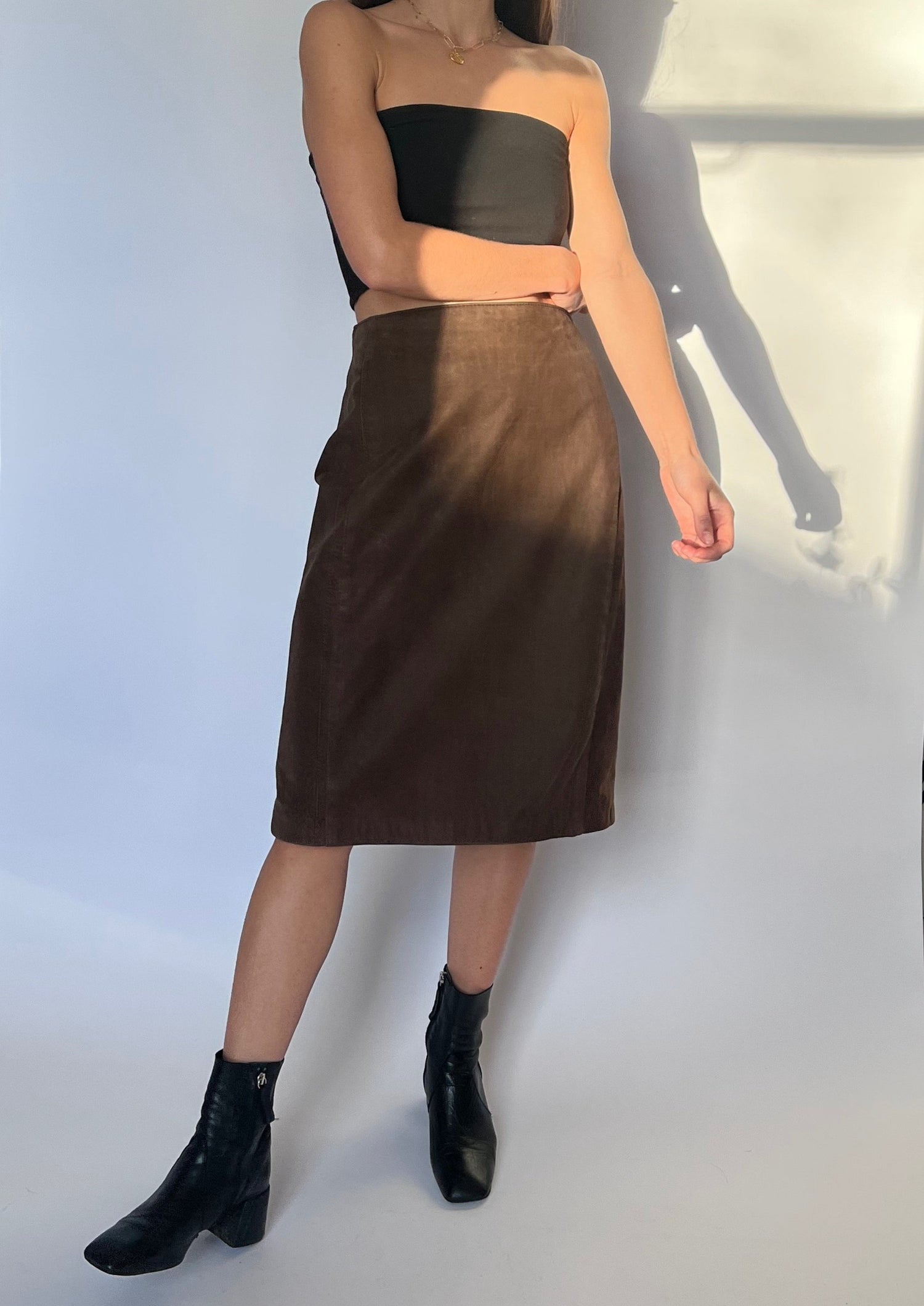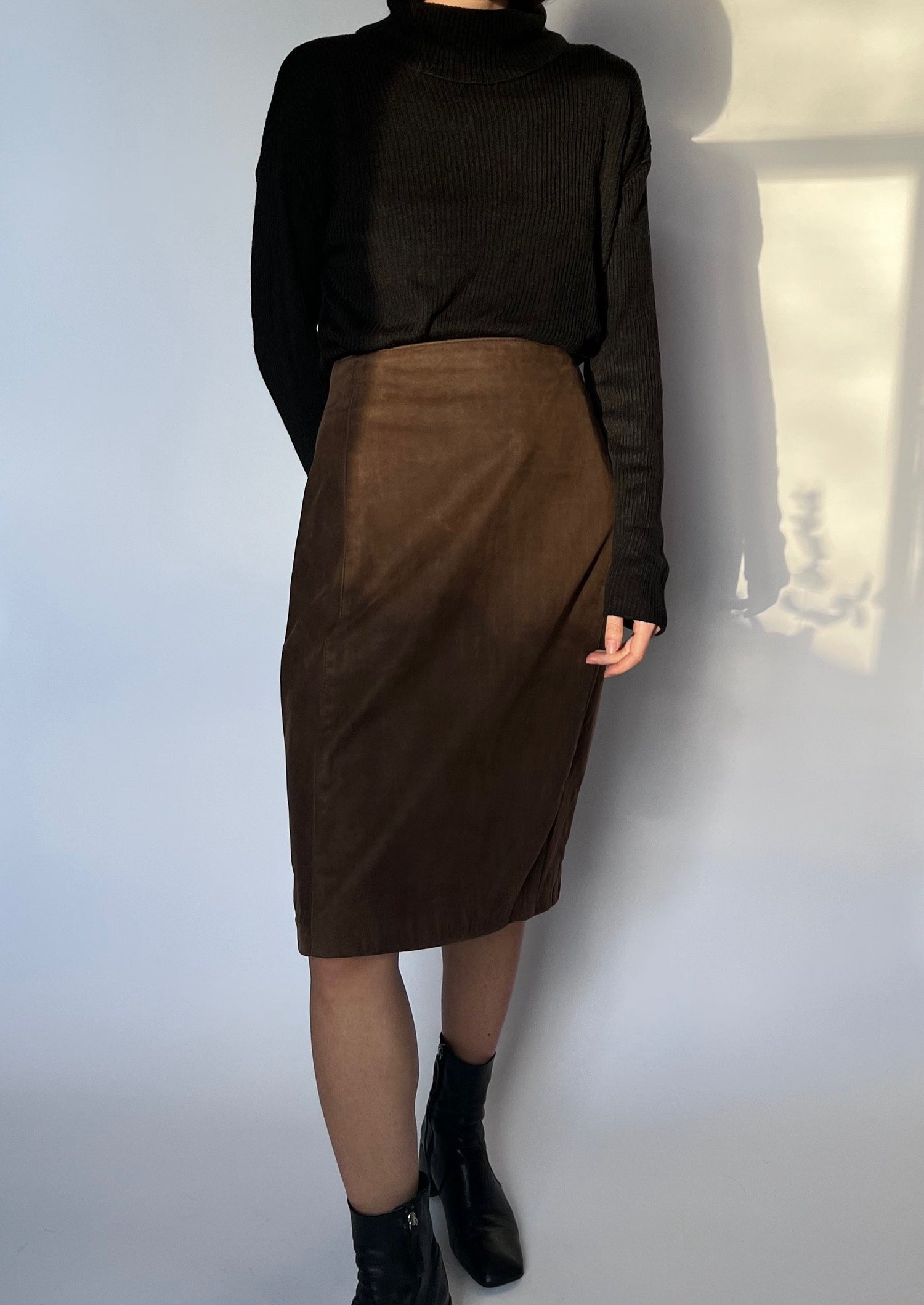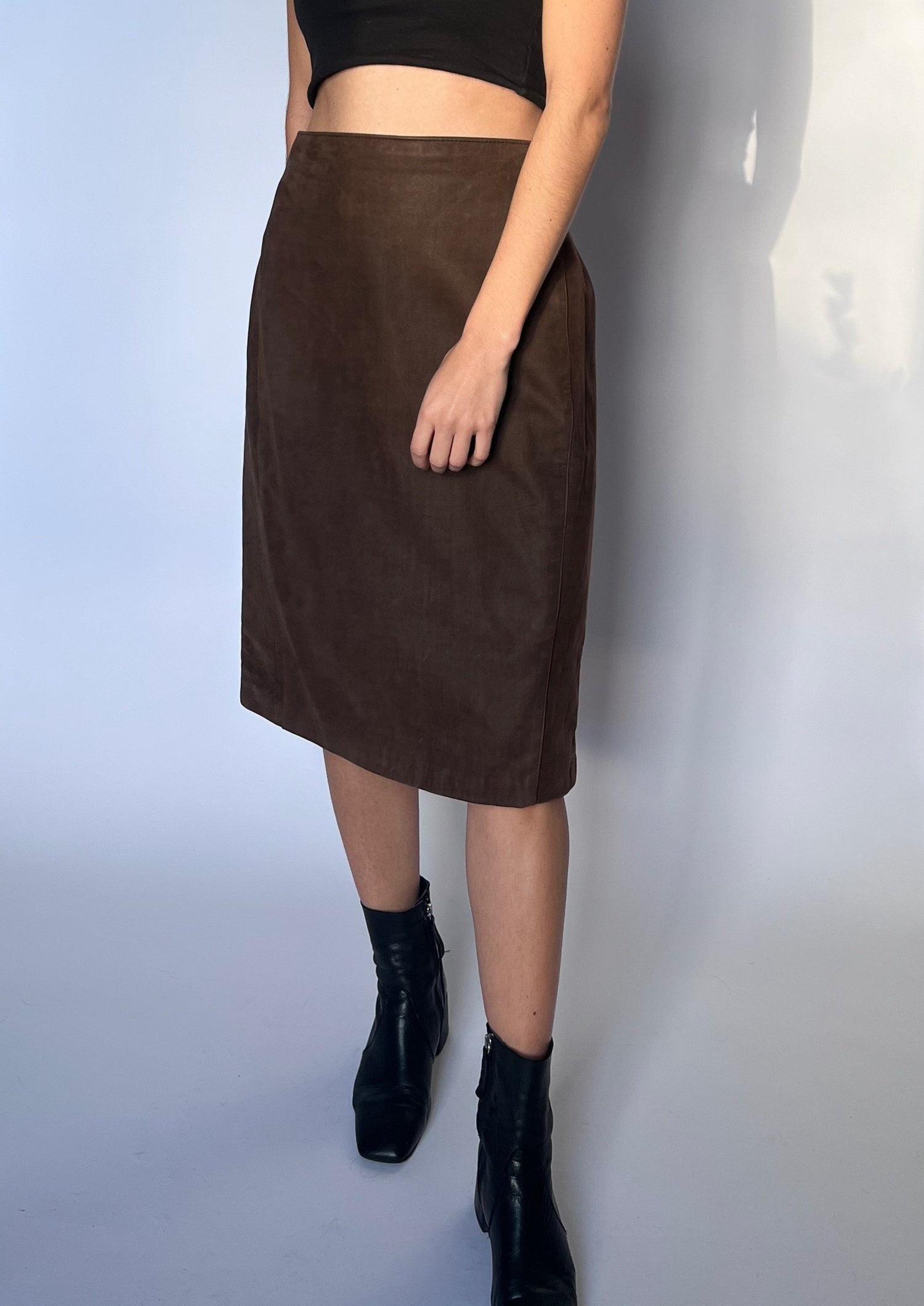 Incredible 80s/90s leather skirt in a chocolate brown. Features a midi length, back split and a super soft suede. Zip to fasten down the front. Made by Austin Reed. Fully lined.