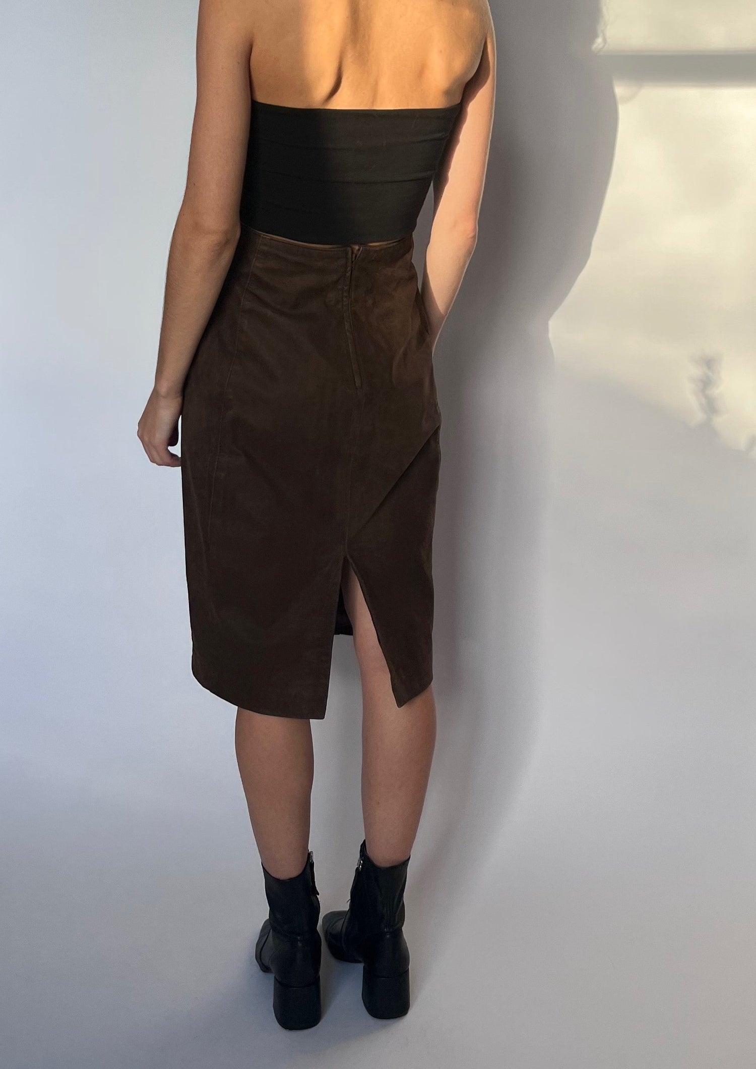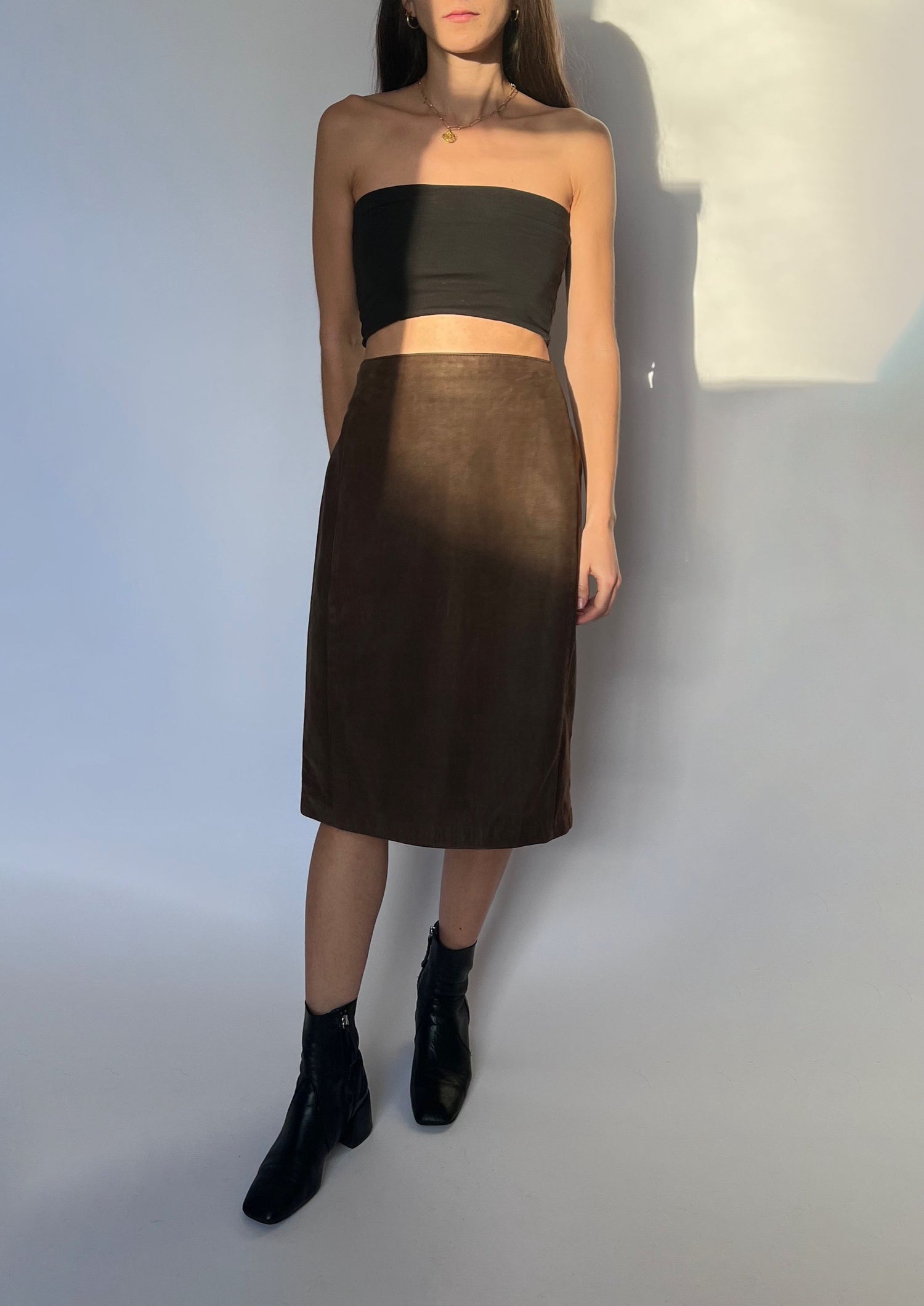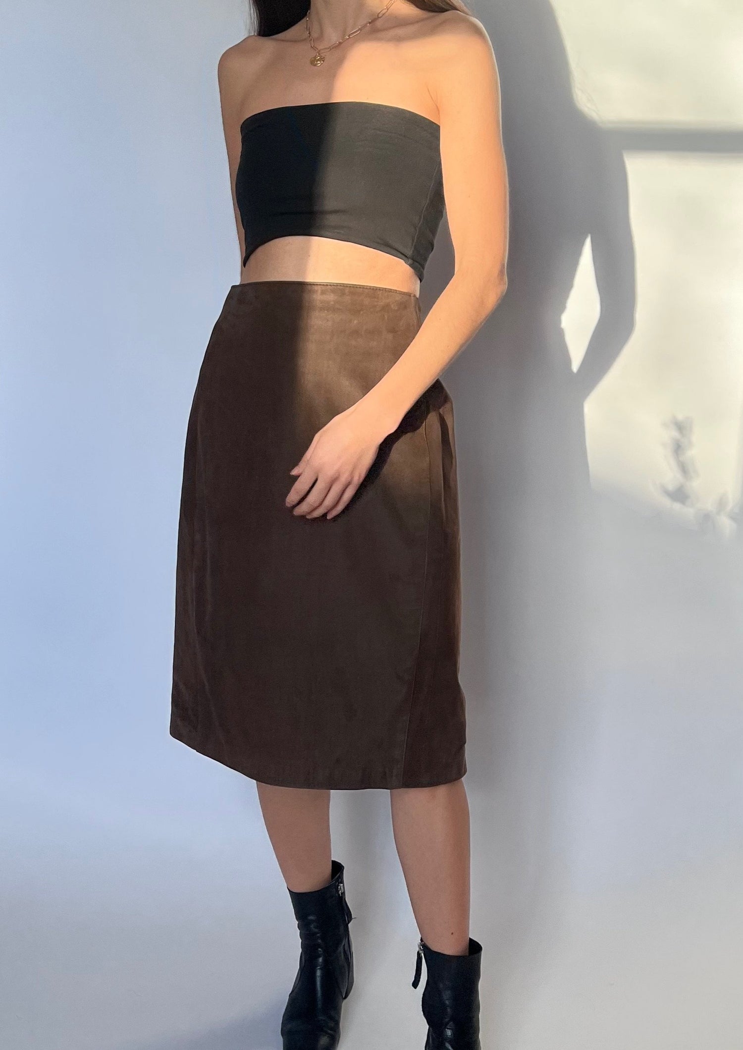 Incredible 80s/90s leather skirt in a chocolate brown. Features a midi length, back split and a super soft suede. Zip to fasten down the front. Made by Austin Reed. Fully lined.