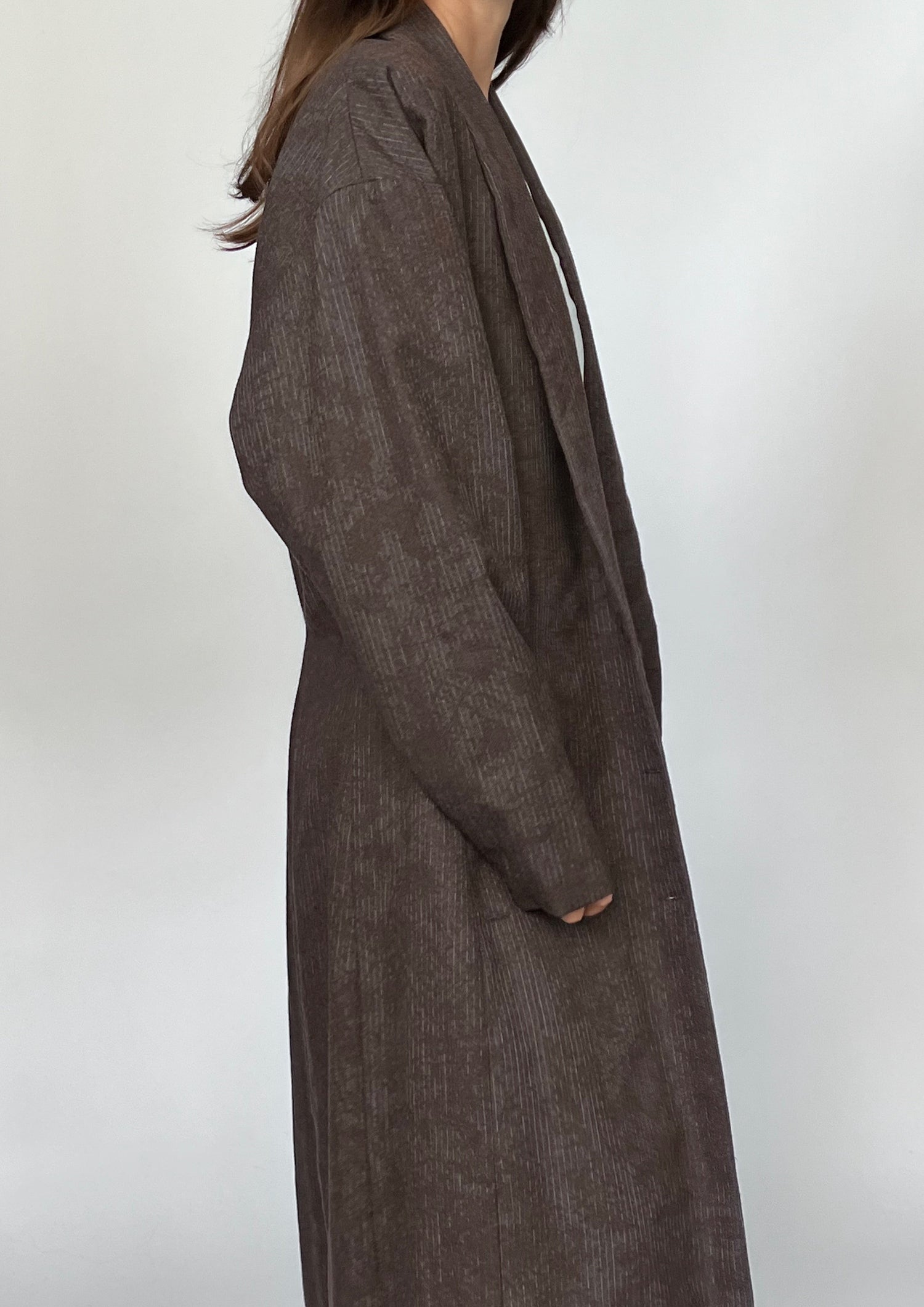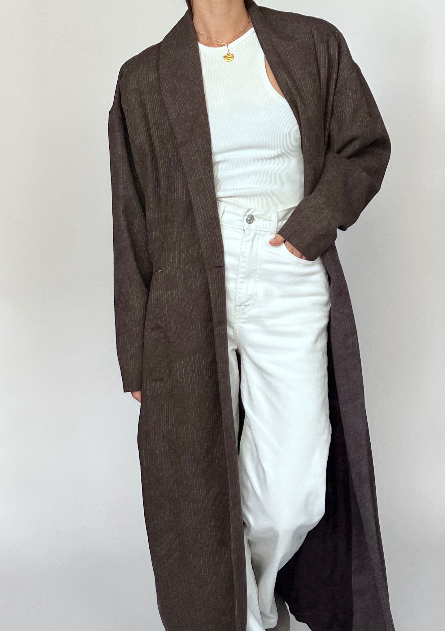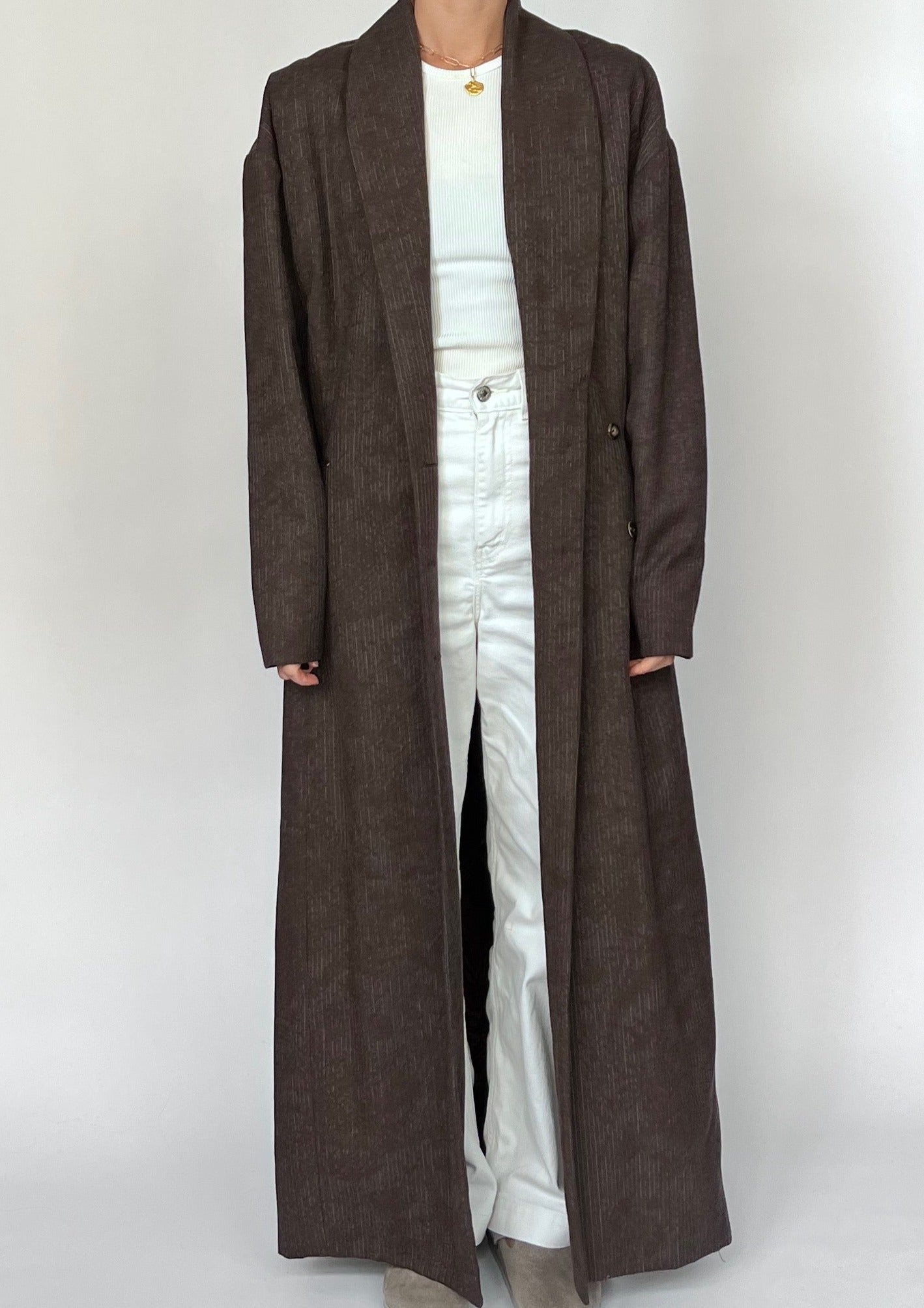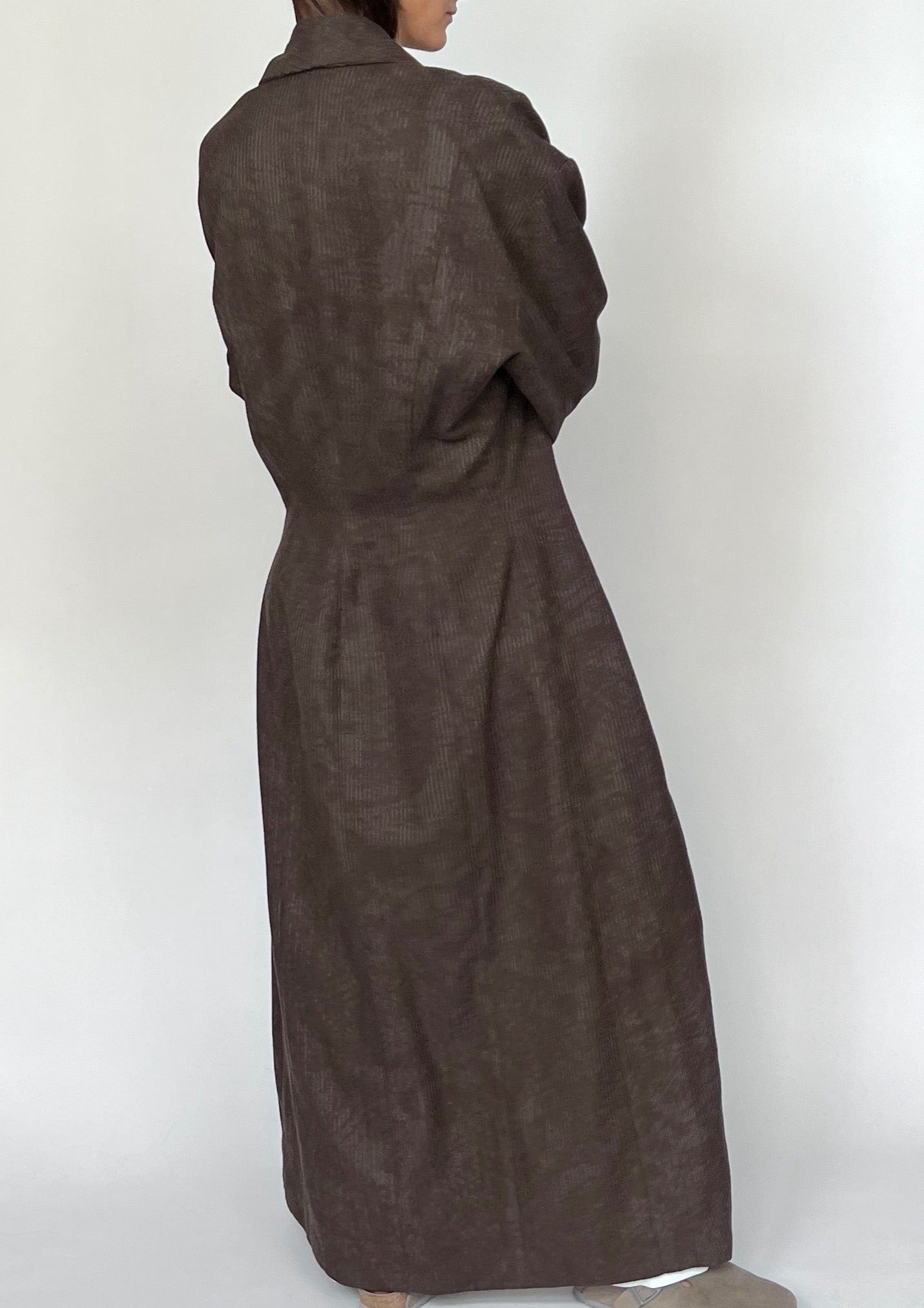 90s Brown maxi coat. Features a double breasted fastening, relaxed collar, fitted seam details. The coat has a brown striped design with a background subtle textured pattern