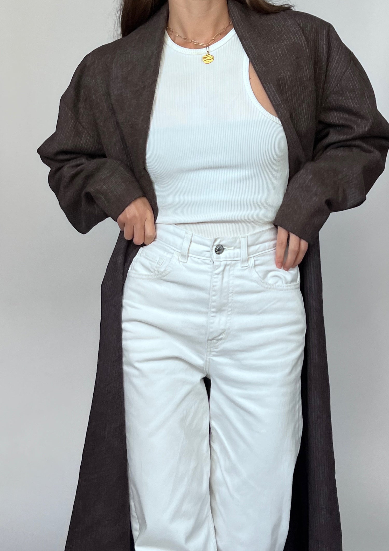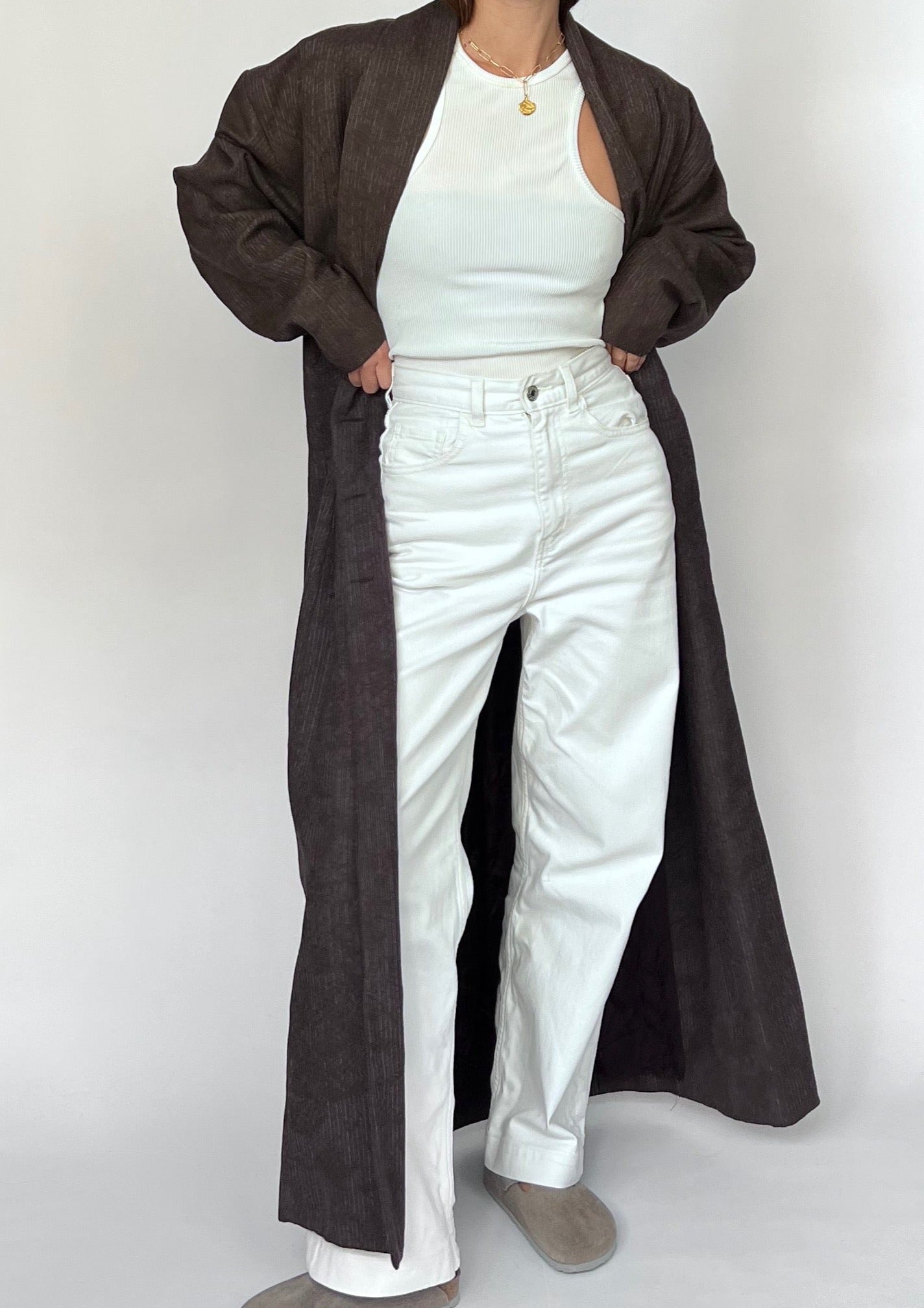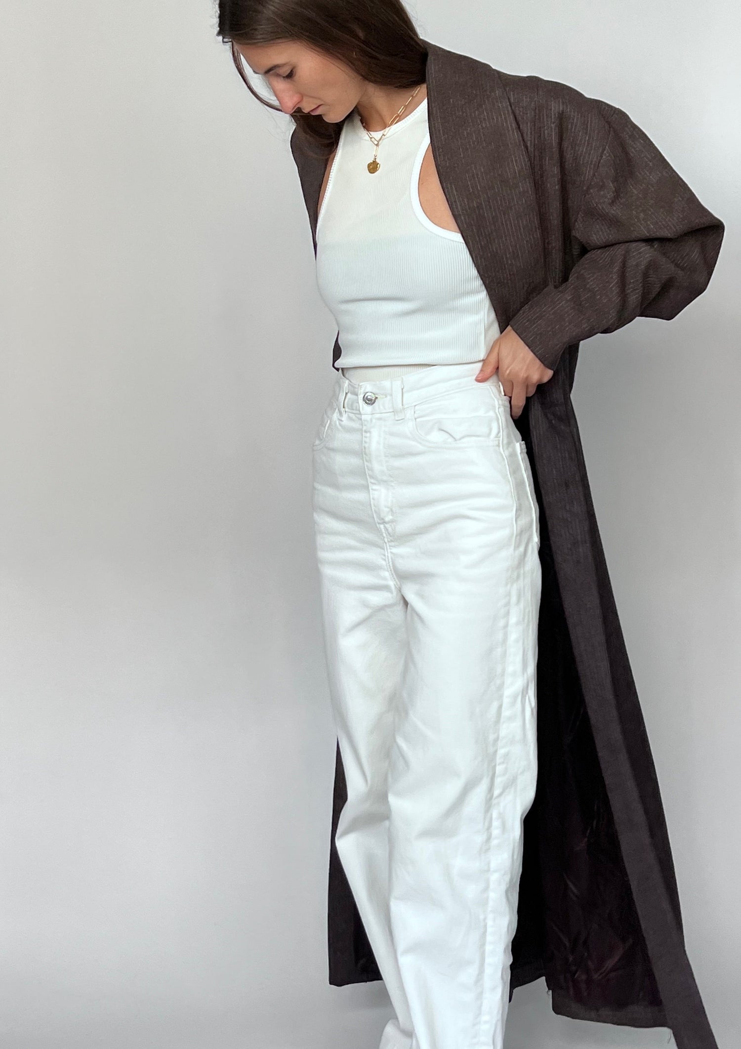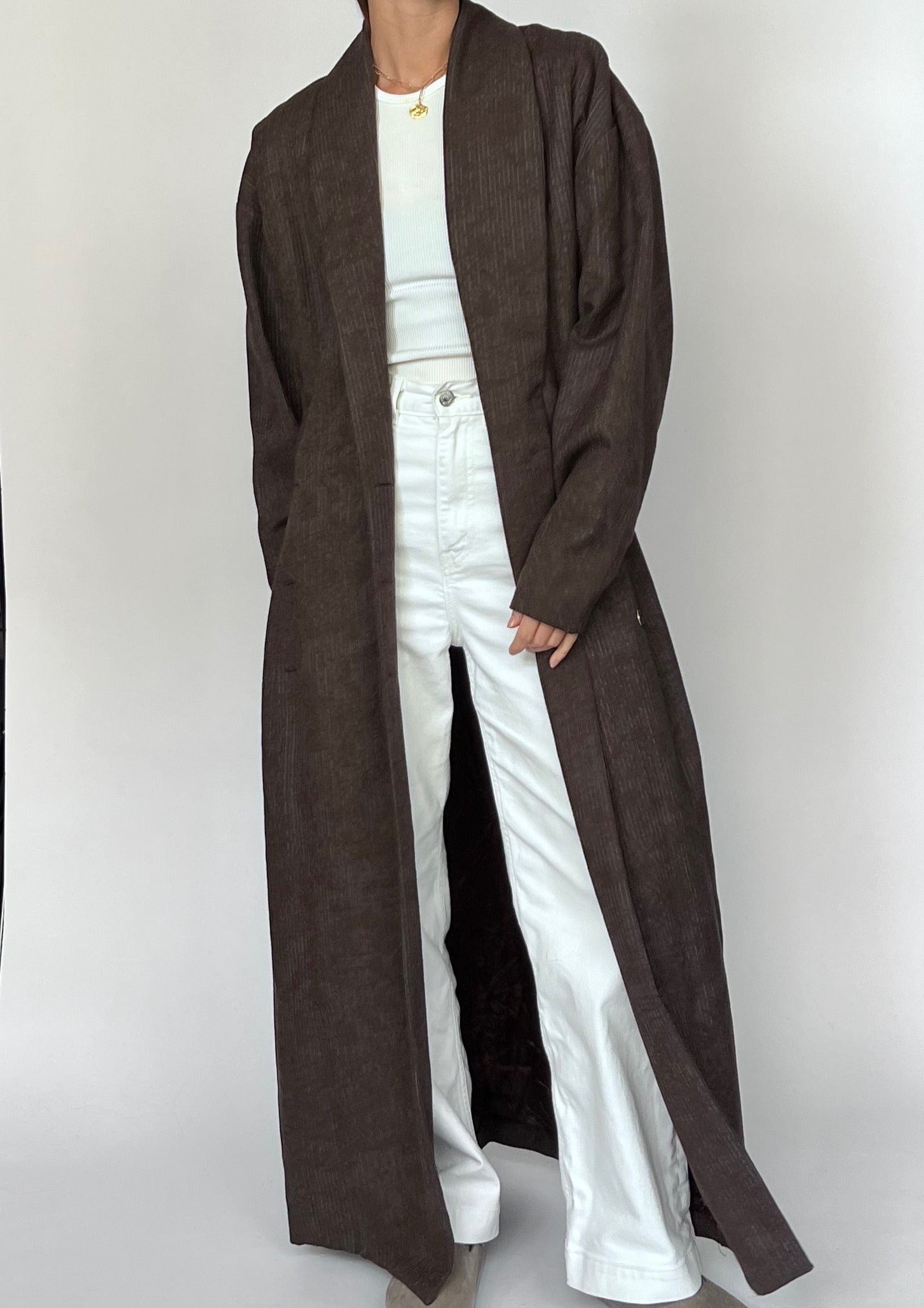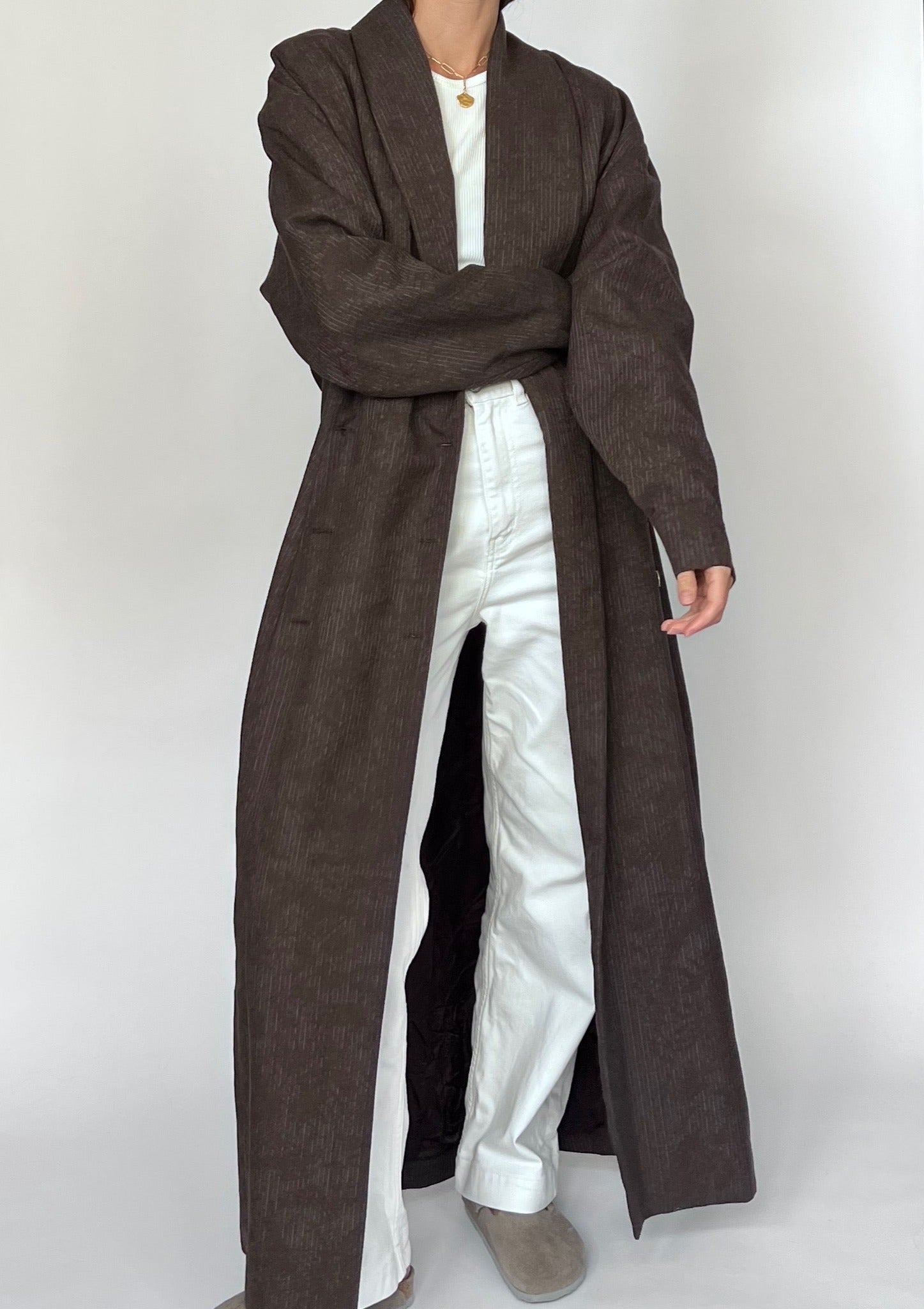 90s Brown maxi coat. Features a double breasted fastening, relaxed collar, fitted seam details. The coat has a brown striped design with a background subtle textured pattern