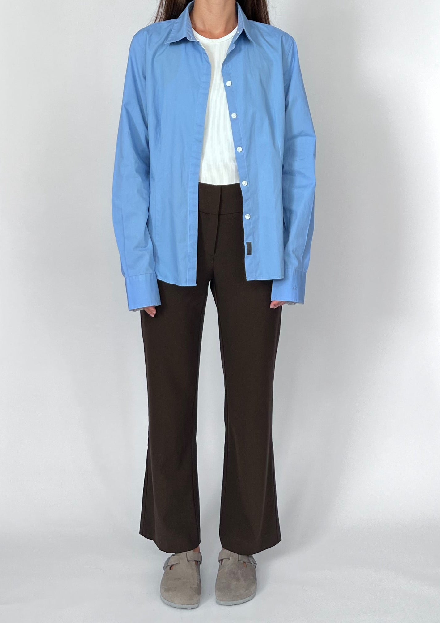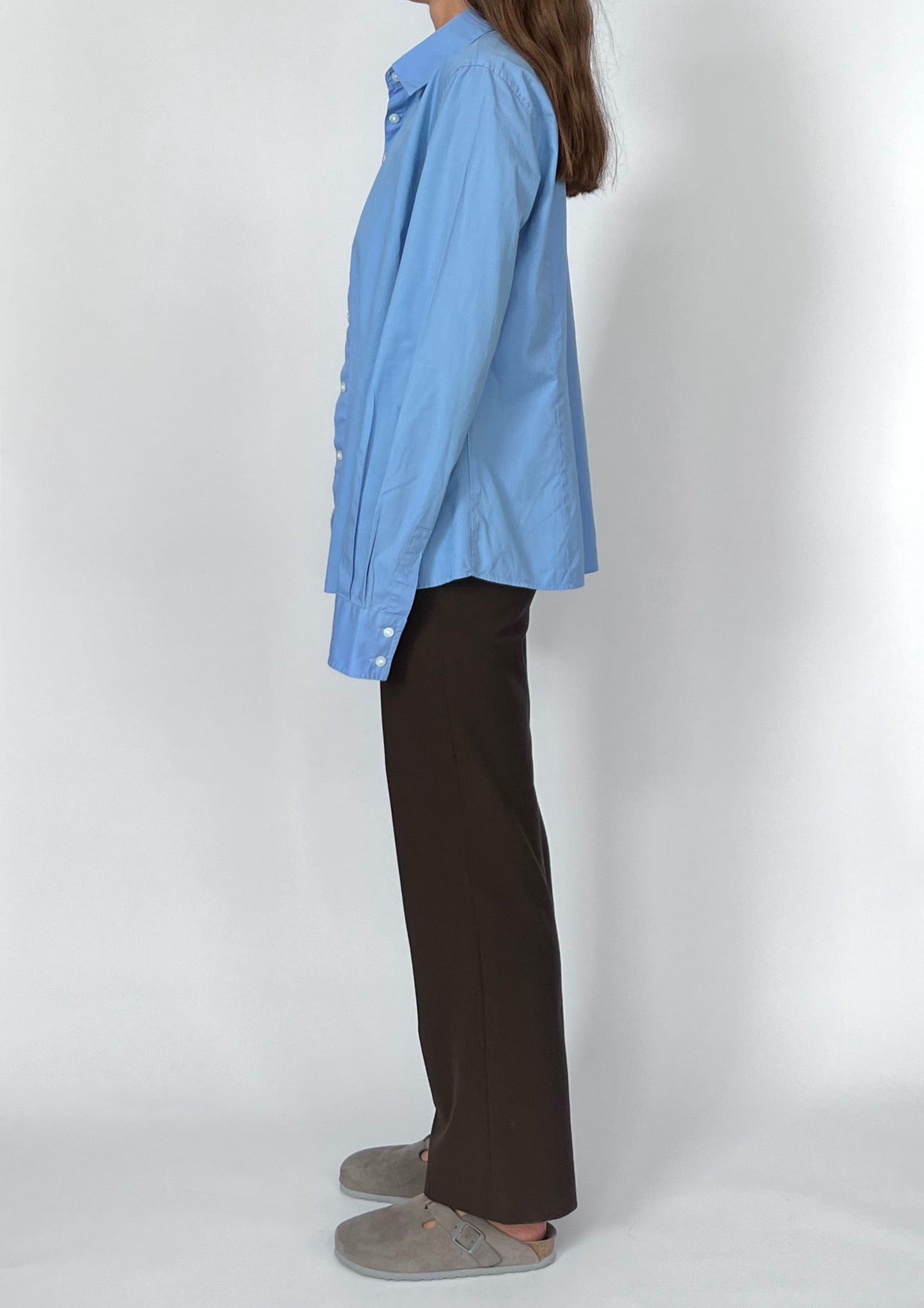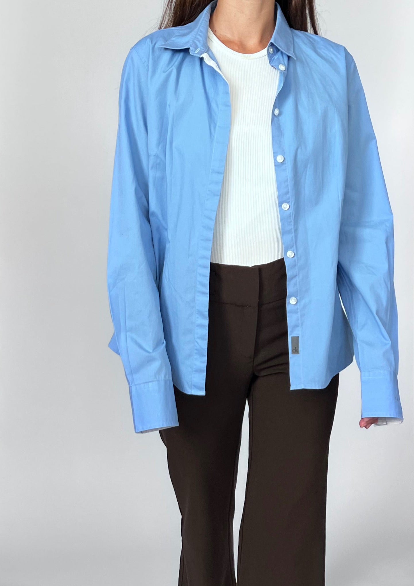 90s Calvin Klein shirt in a classic blue. Features a fitted, longline 90s shape and long sleeves.