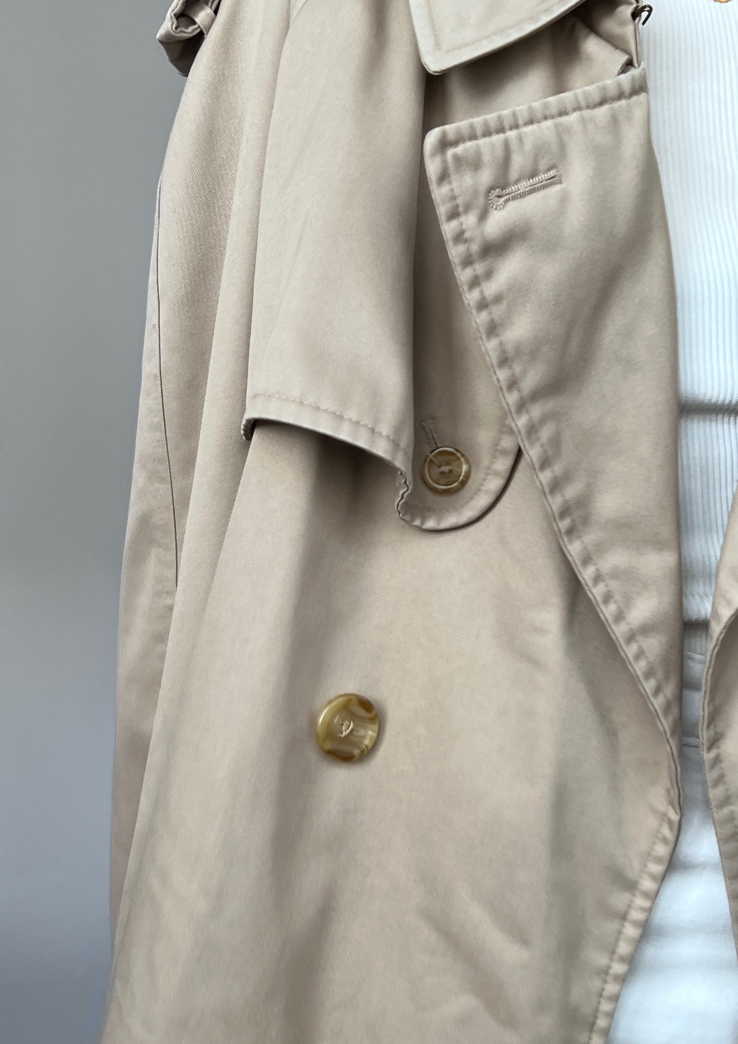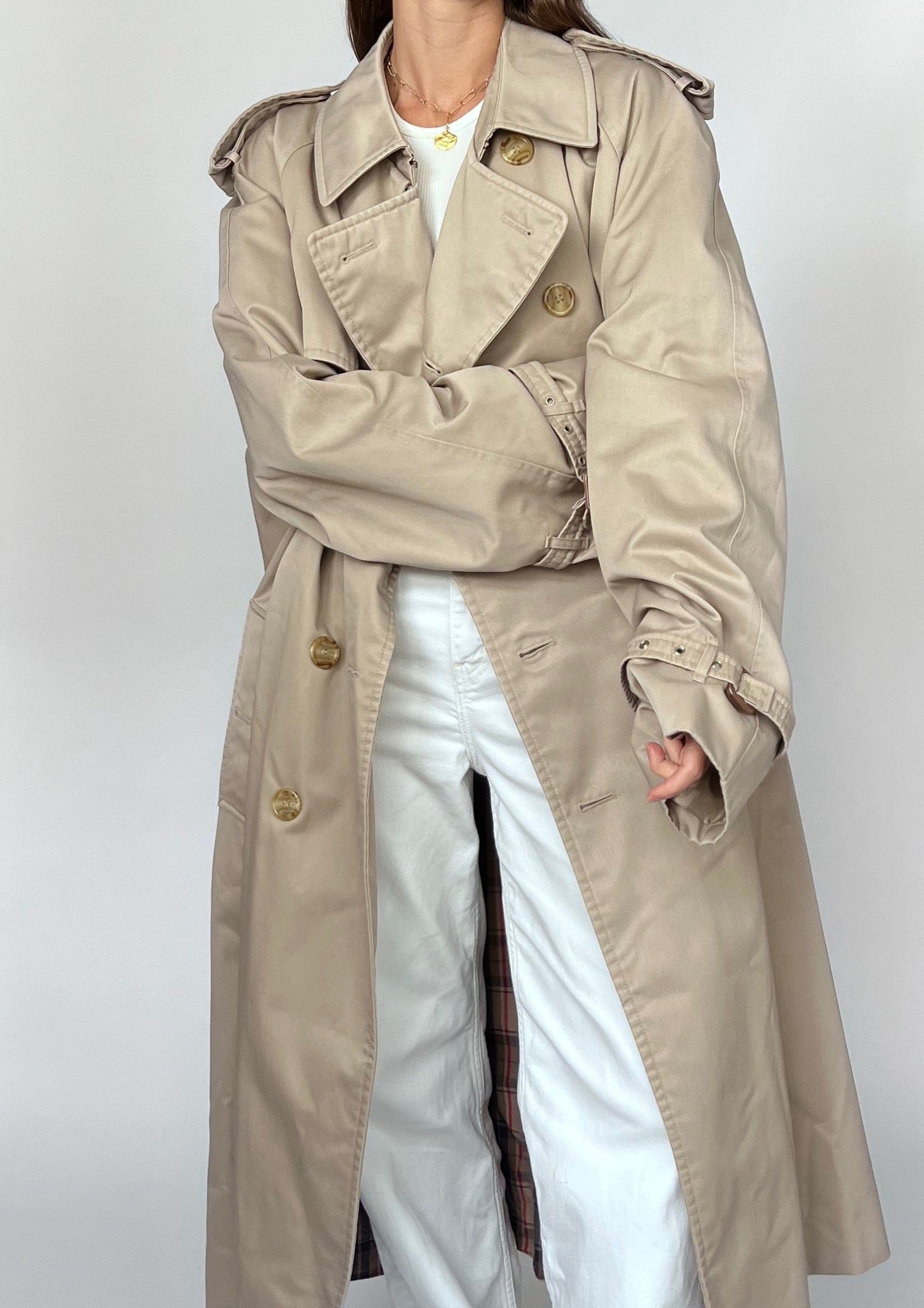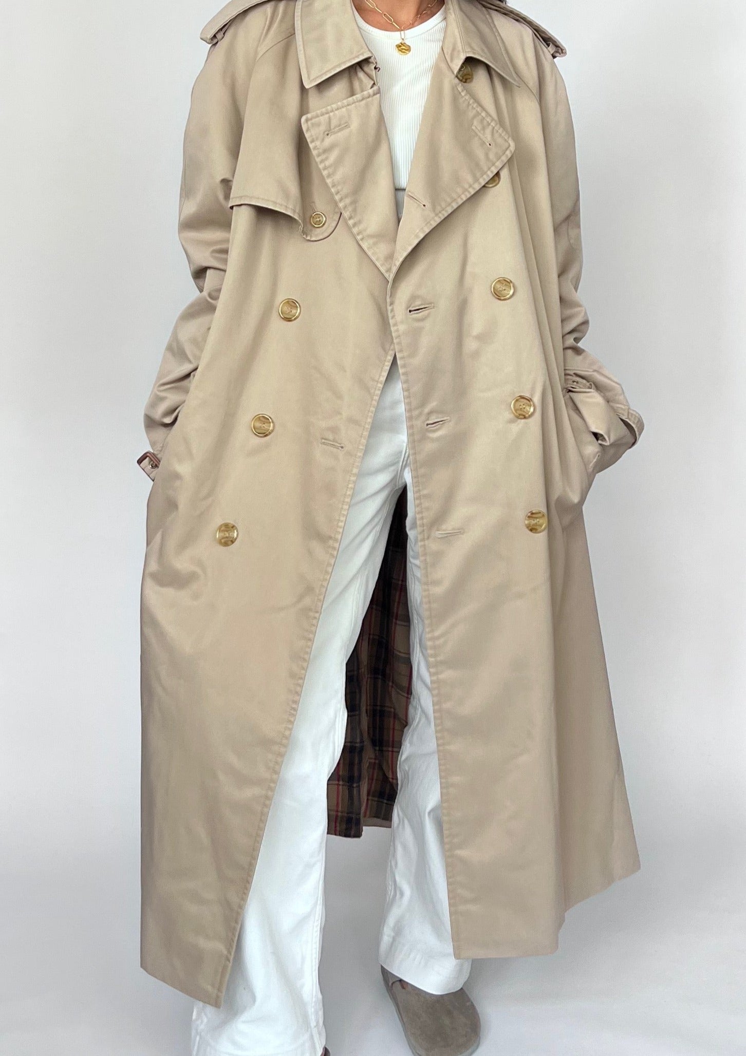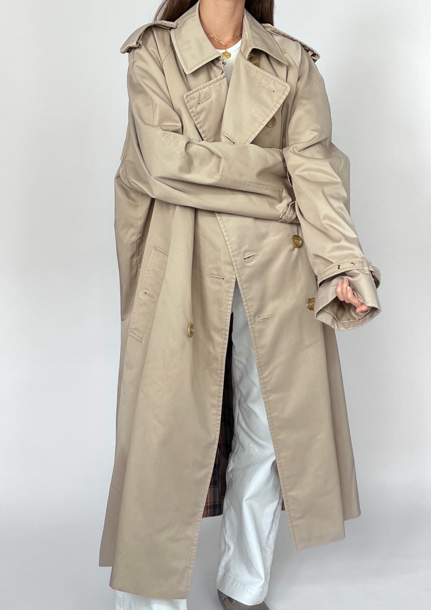 90s Classic beige maxi trench coat. Features two side pockets, a double breasted button fastening, fully lined in a classic check and a clean, maxi cut. With a raglan, the fit is relaxed. There is a cape detail with a button, and an internal pocket.