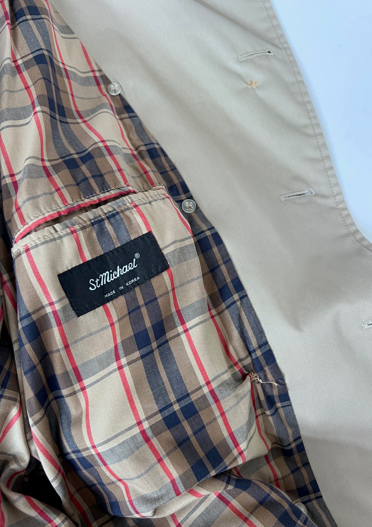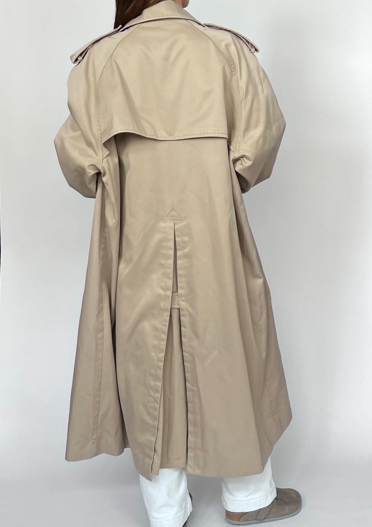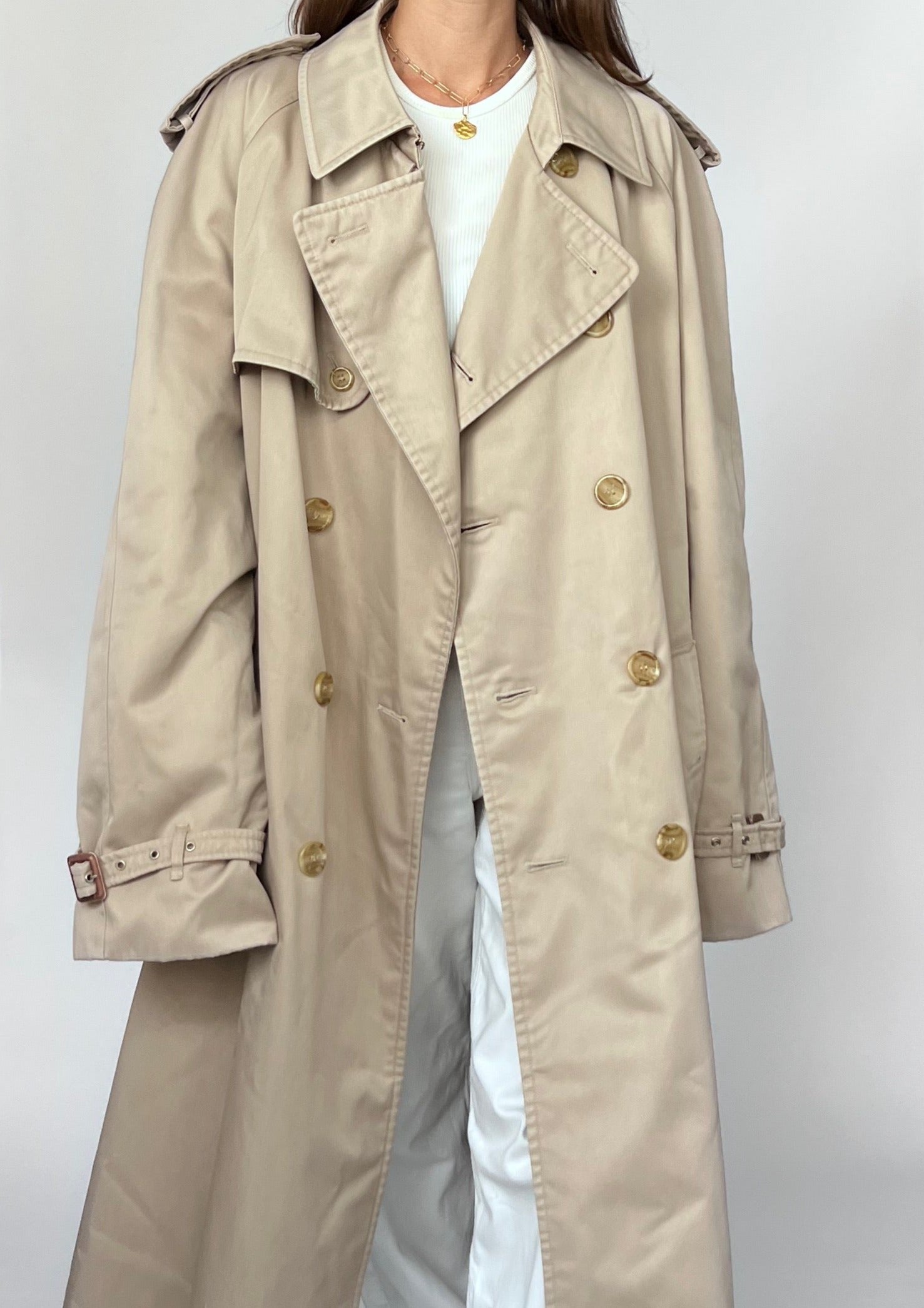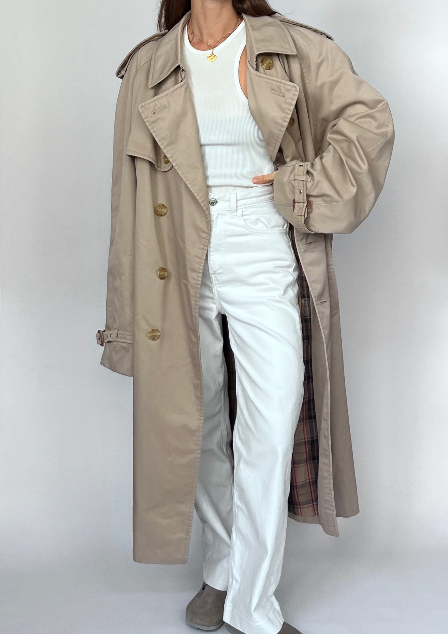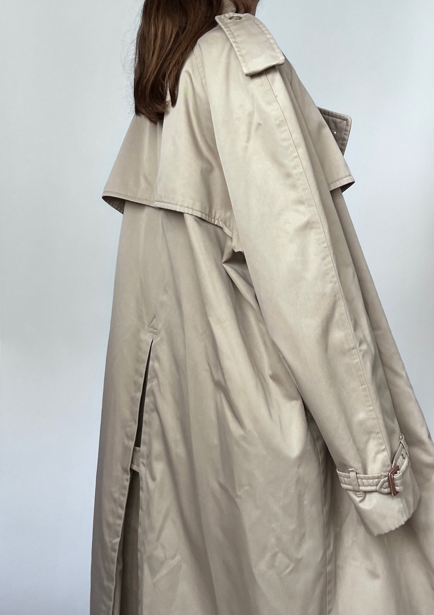 90s Classic beige maxi trench coat. Features two side pockets, a double breasted button fastening, fully lined in a classic check and a clean, maxi cut. With a raglan, the fit is relaxed. There is a cape detail with a button, and an internal pocket.
