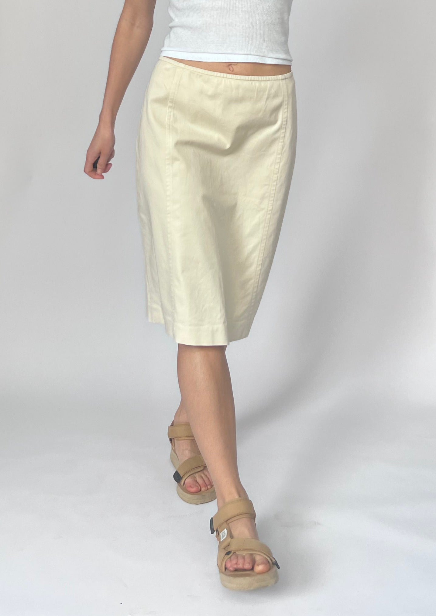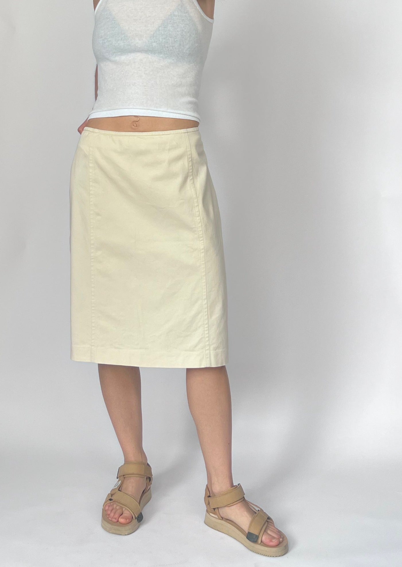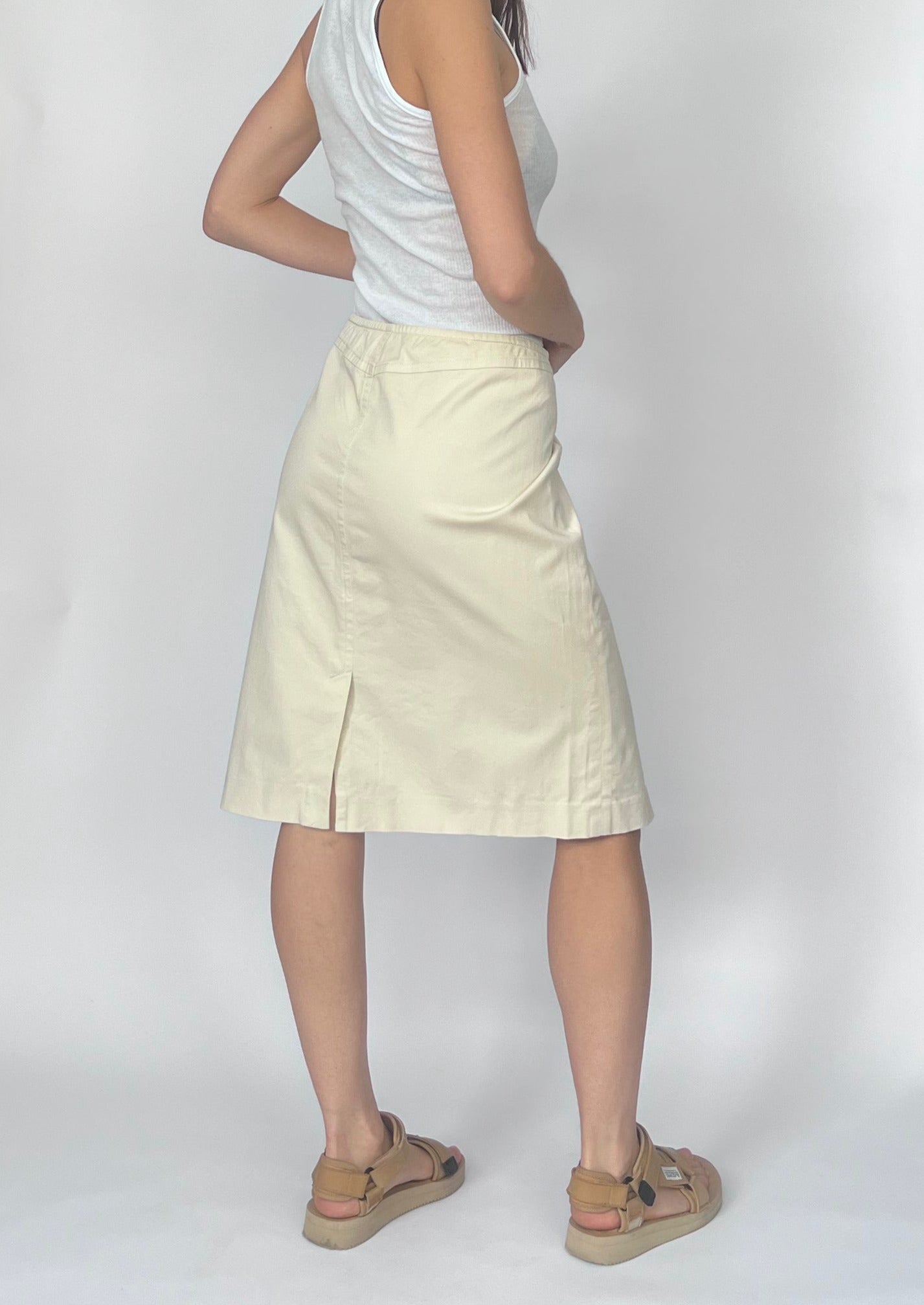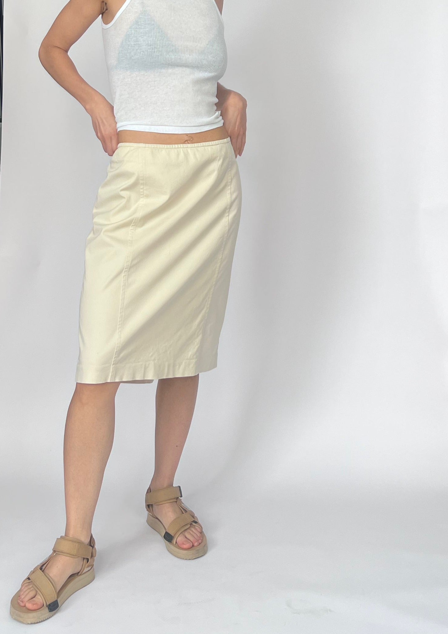 Vintage 90s cream midi skirt. Features a zip fastening at the side, back split and a relaxed shape. Love the awkward length