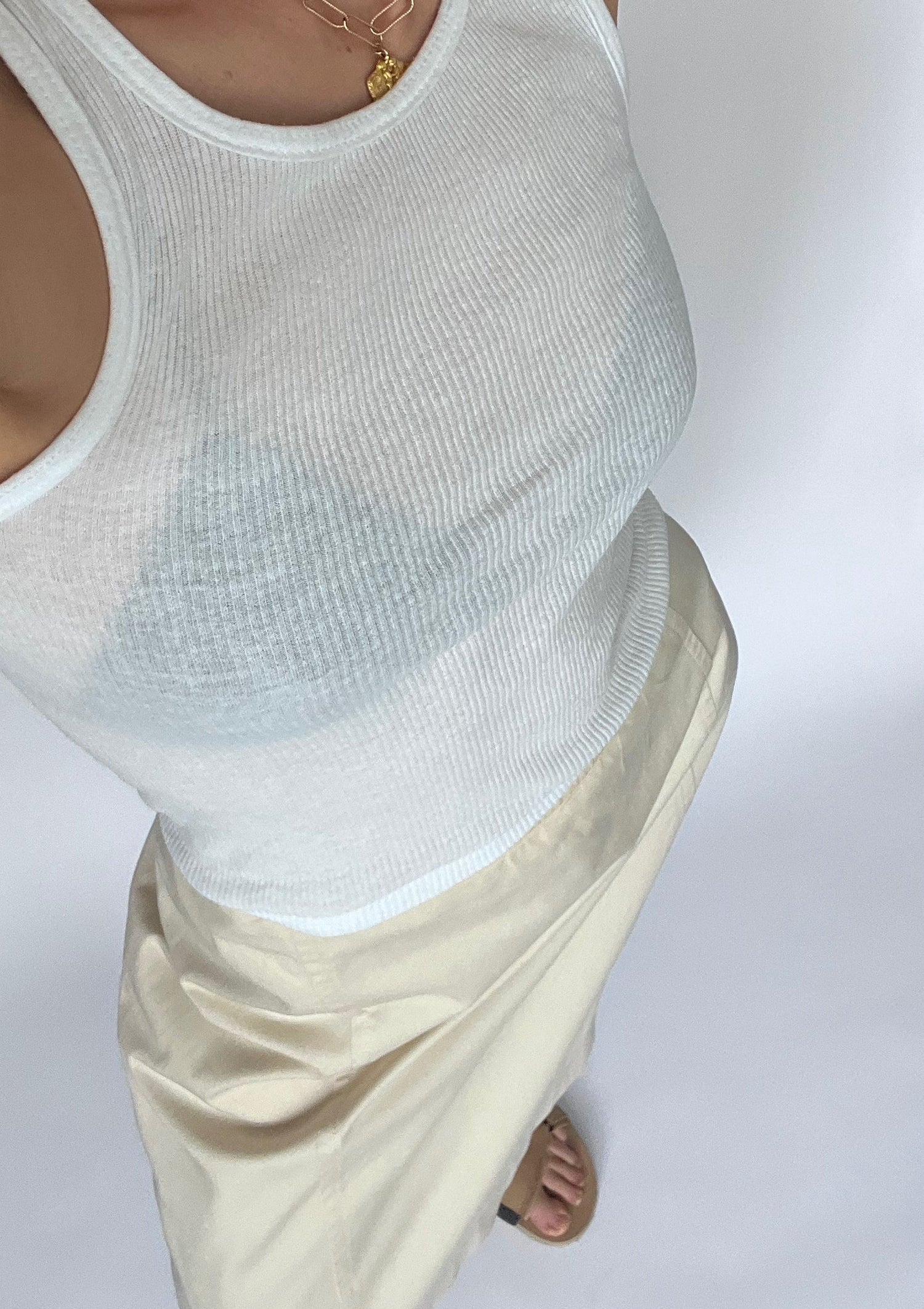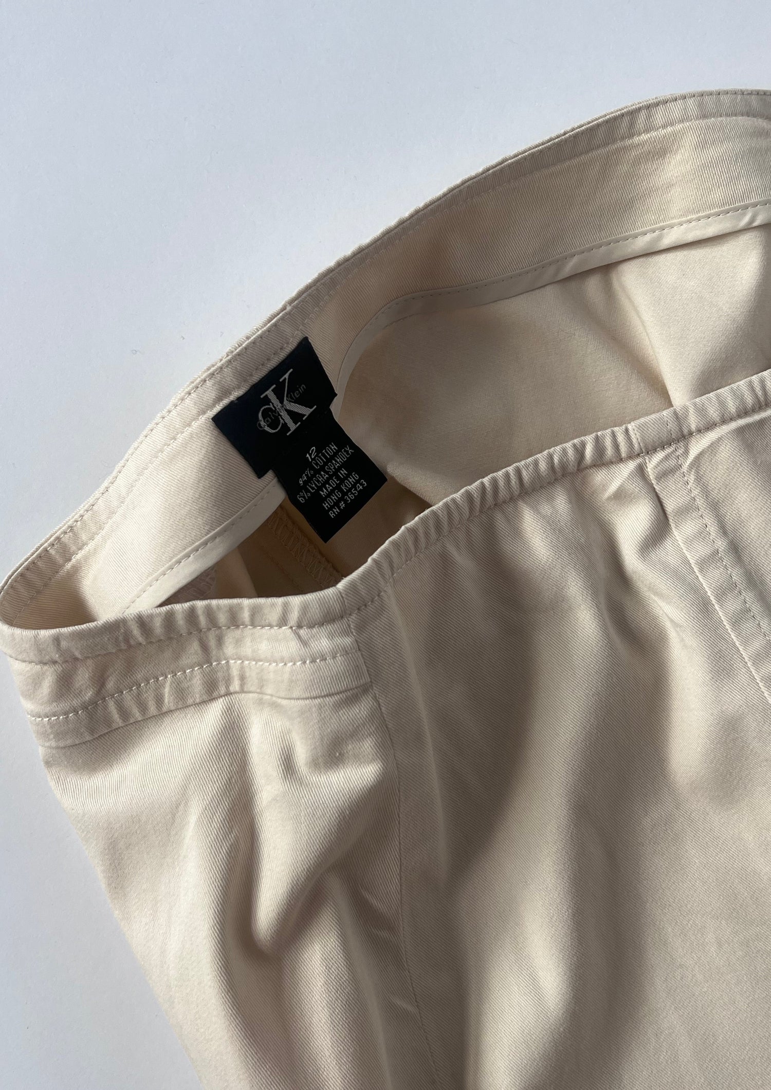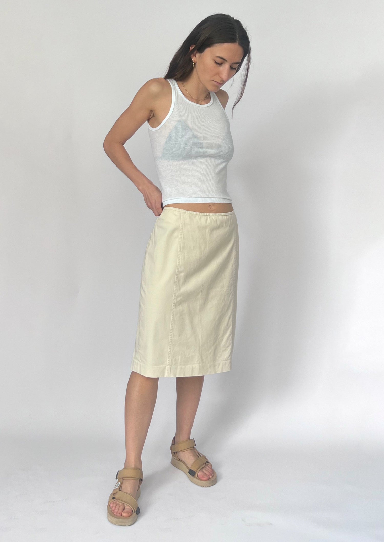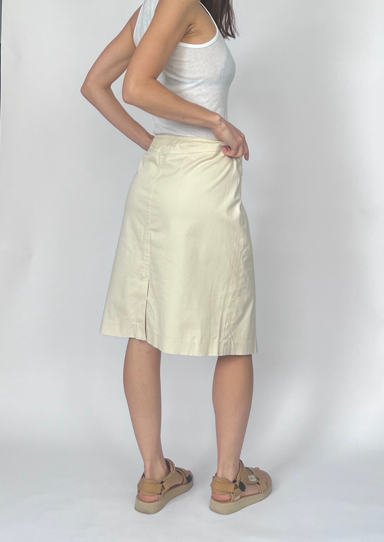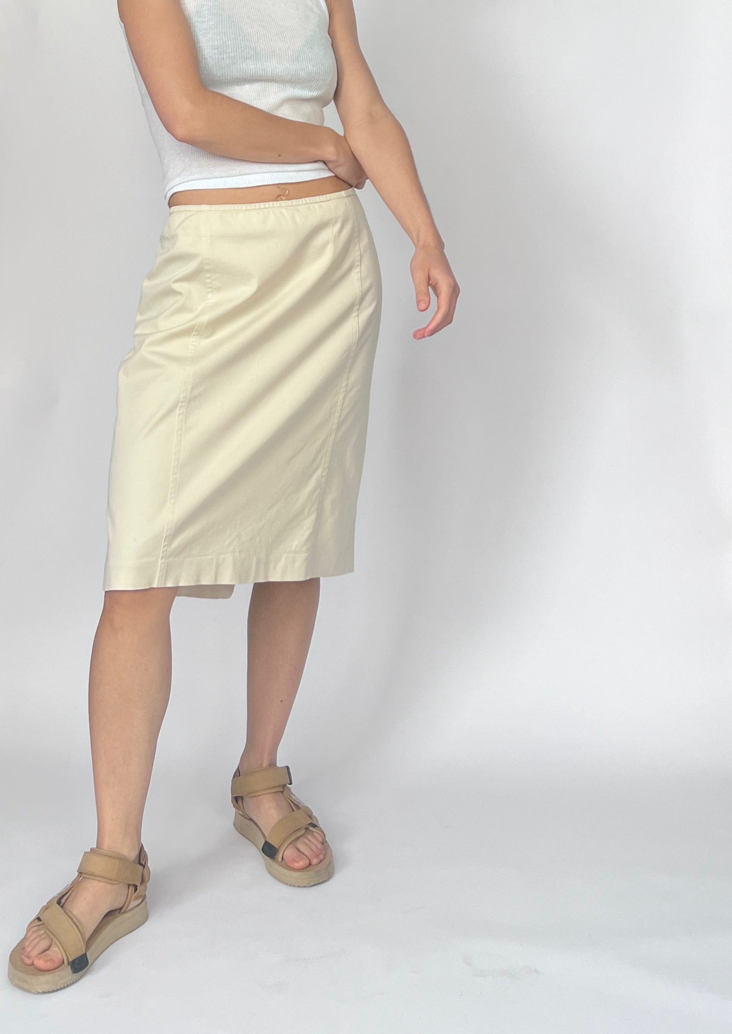 Vintage 90s cream midi skirt. Features a zip fastening at the side, back split and a relaxed shape. Love the awkward length