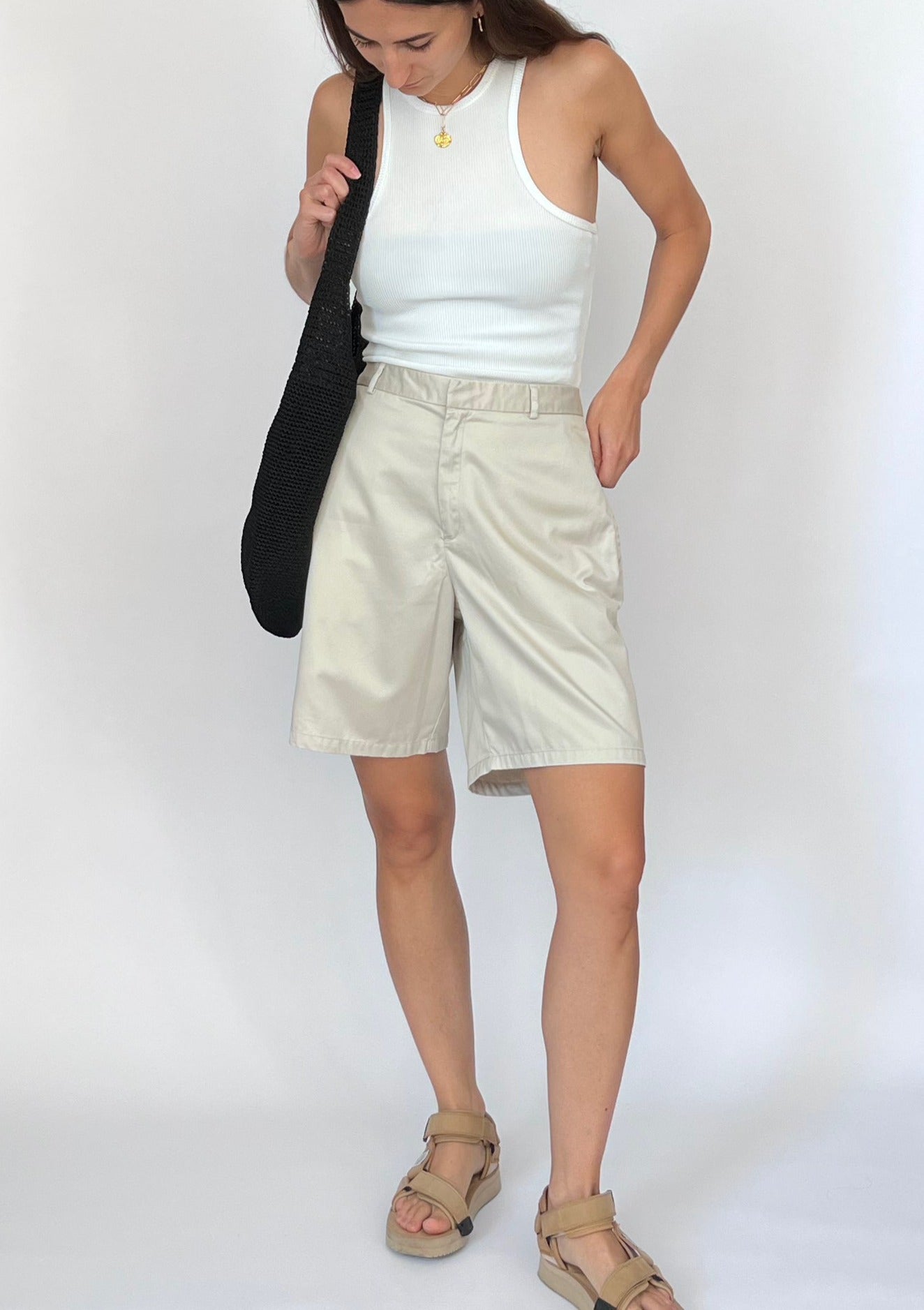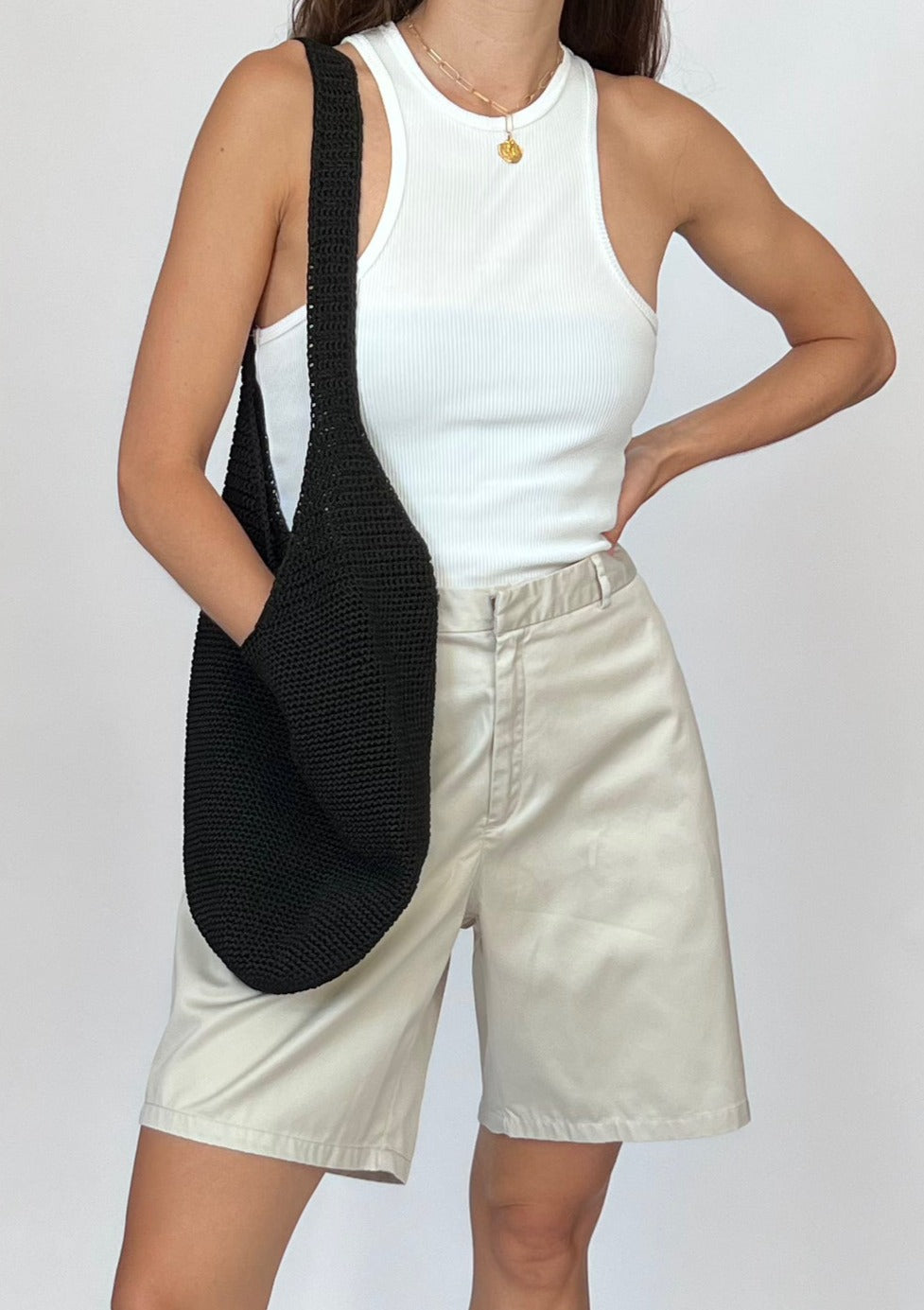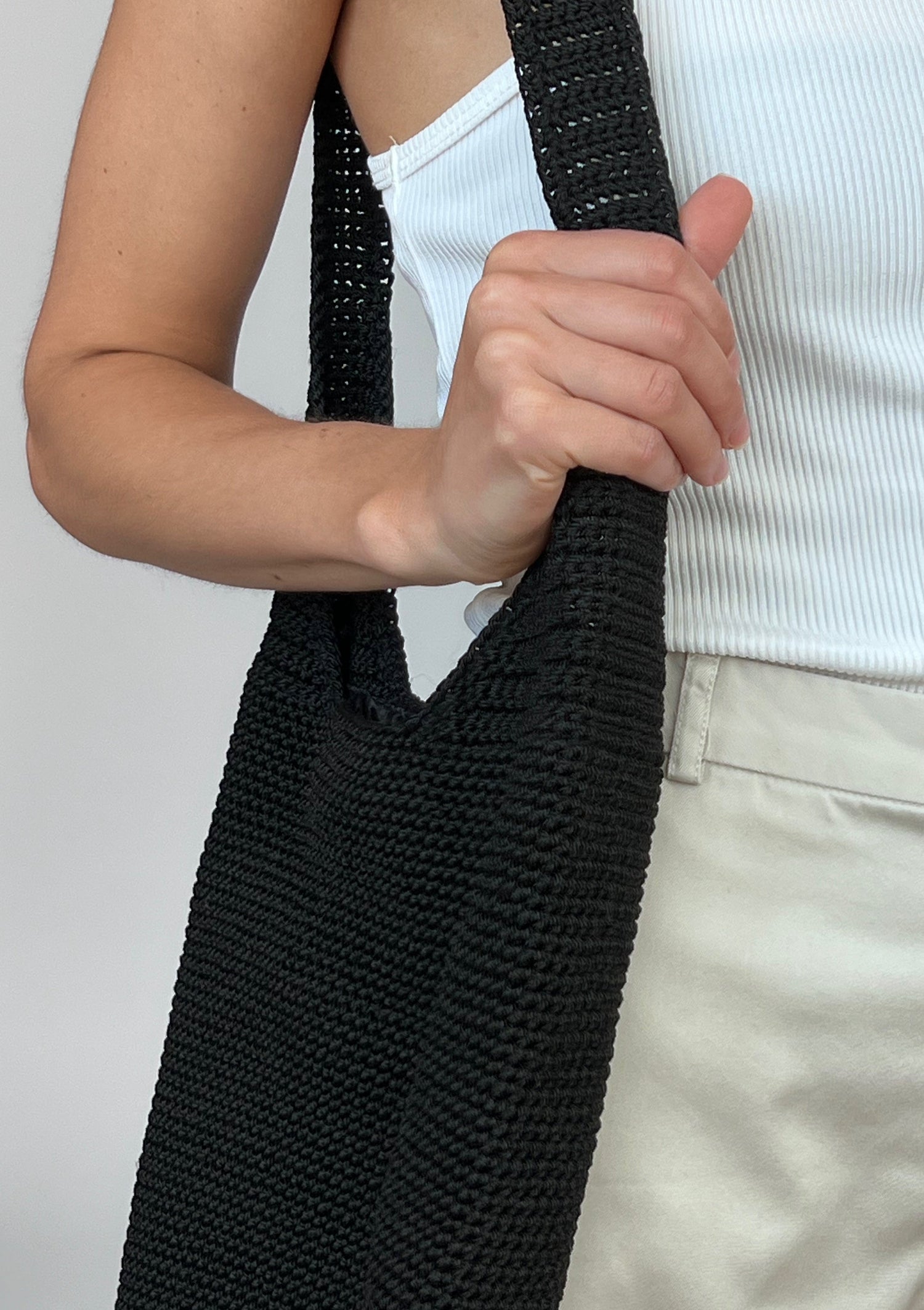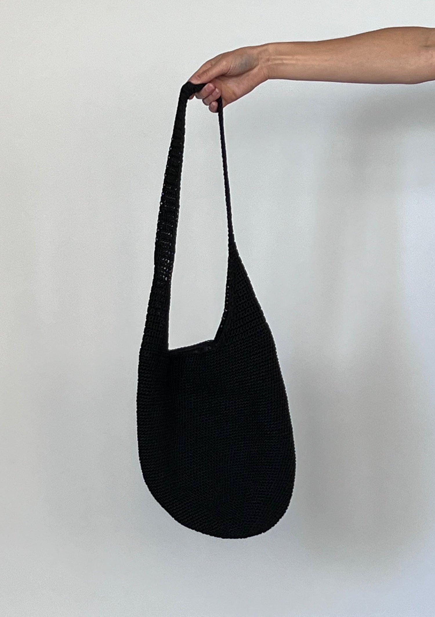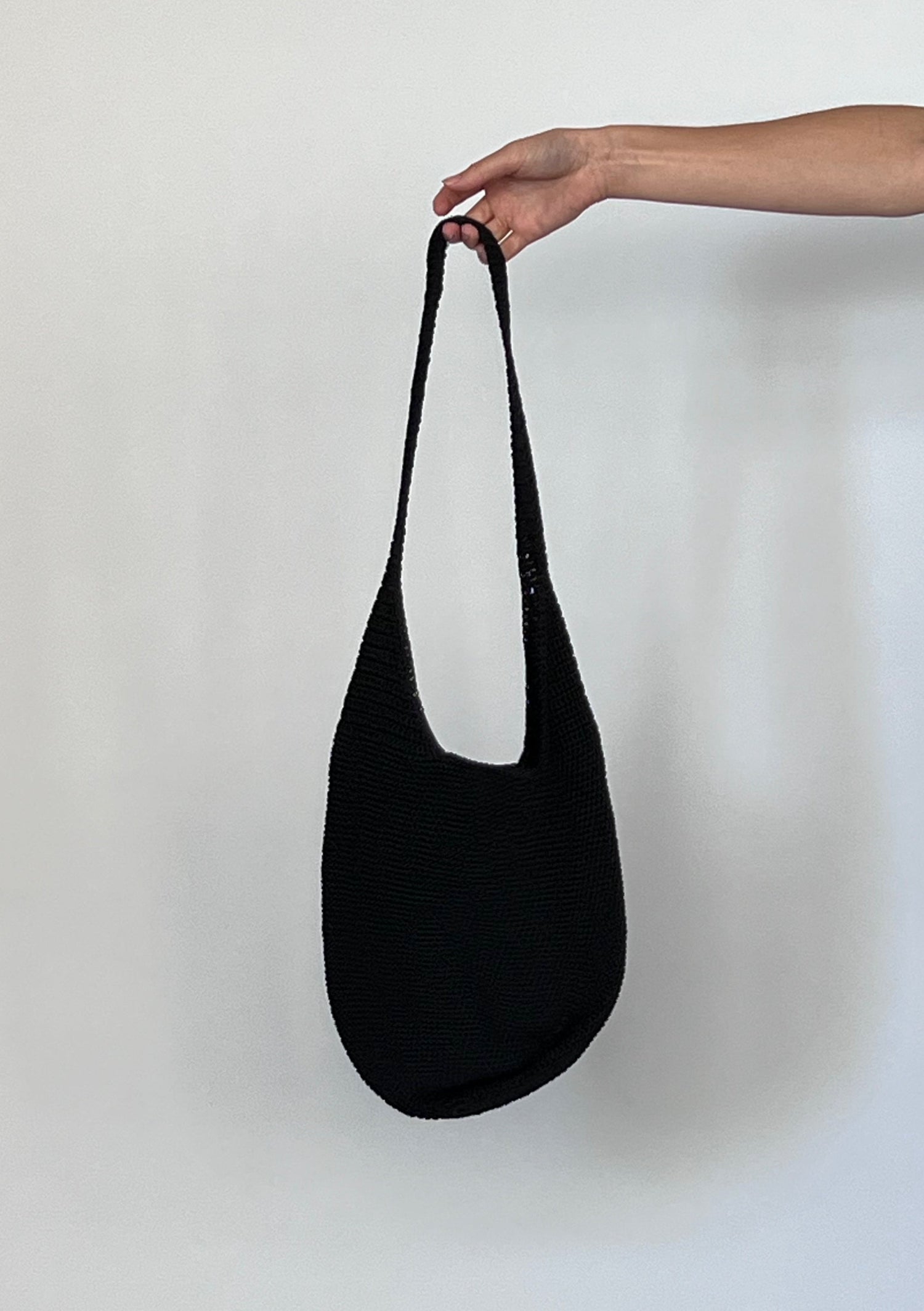 90s Essence crochet slouch bag in black. Fully lined with an inner zip pocket. Bucket bag style