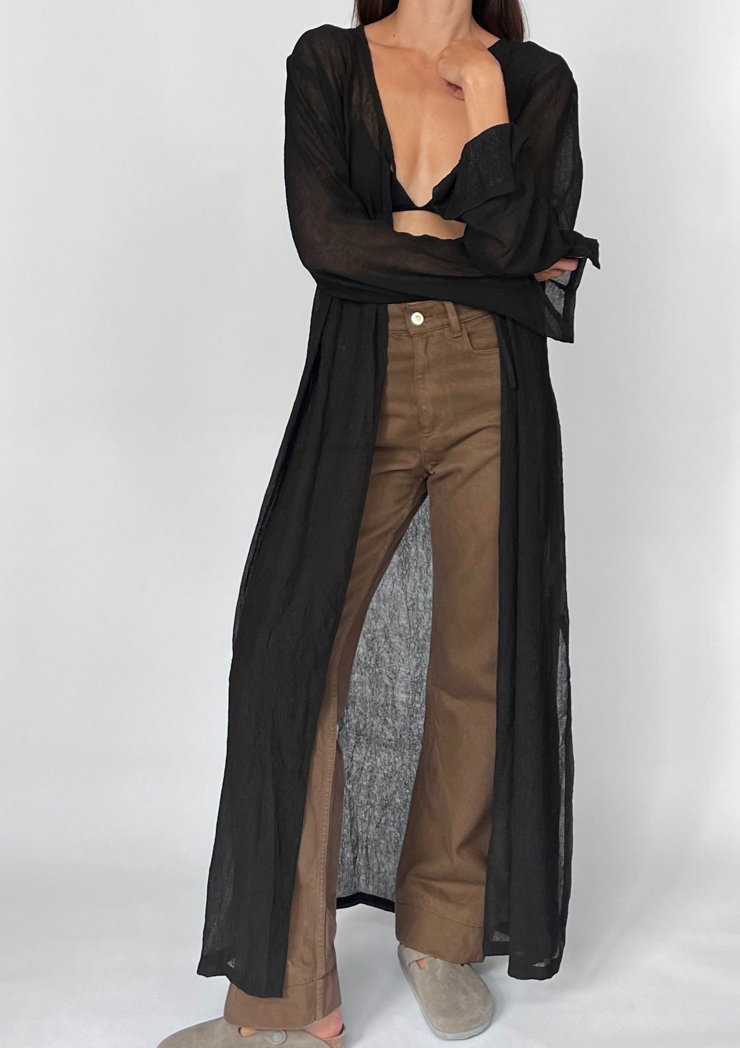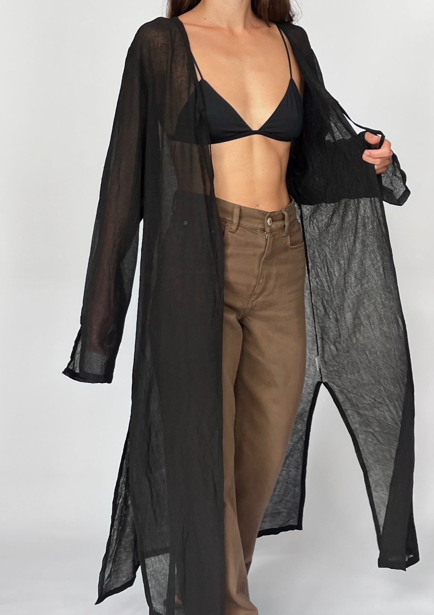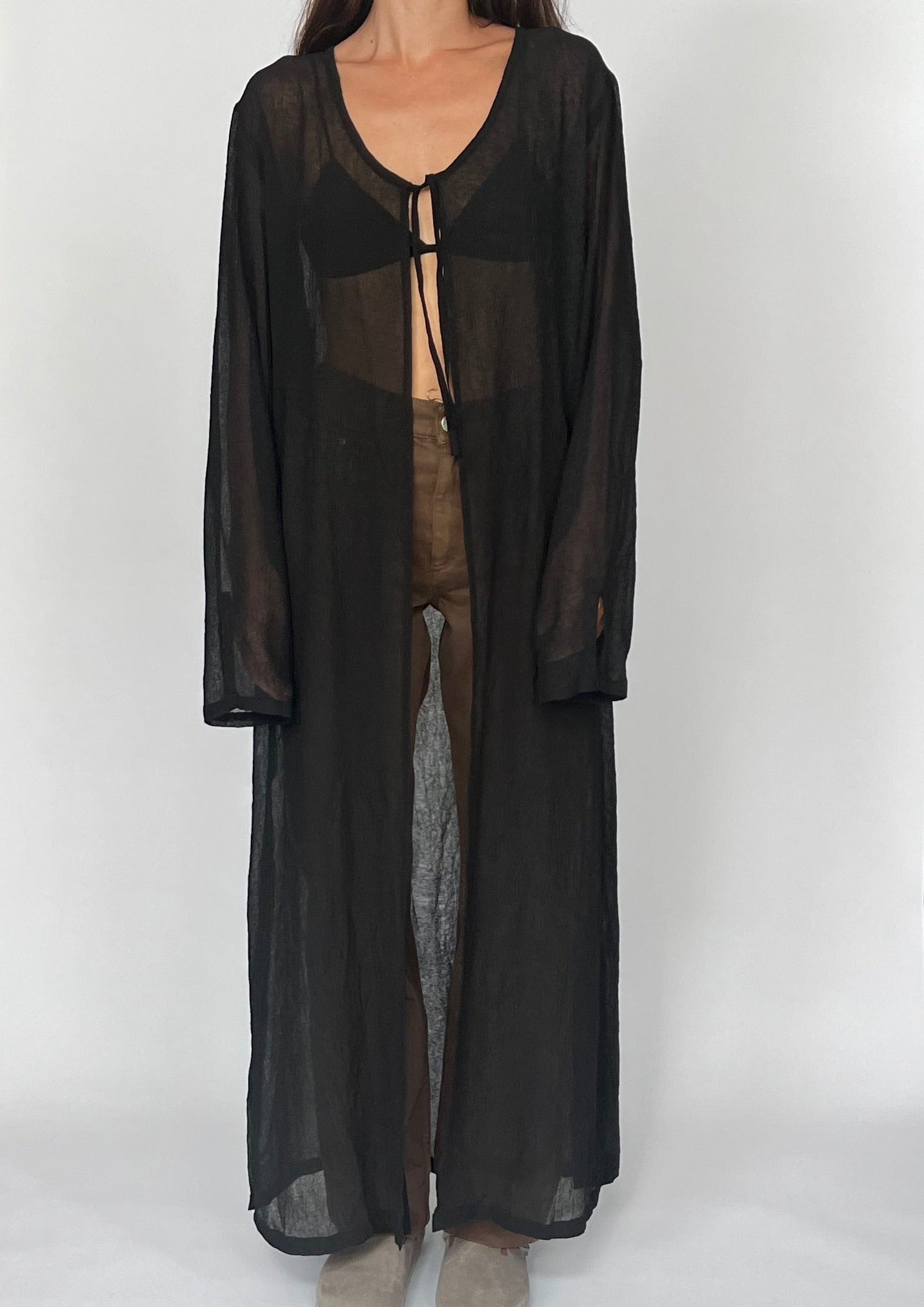 90s Maxi length sheer cardigan. Features a crinkle effect to the fabric, a tie at the bust and a relaxed shape. Side splits (48cm) create a more casual style