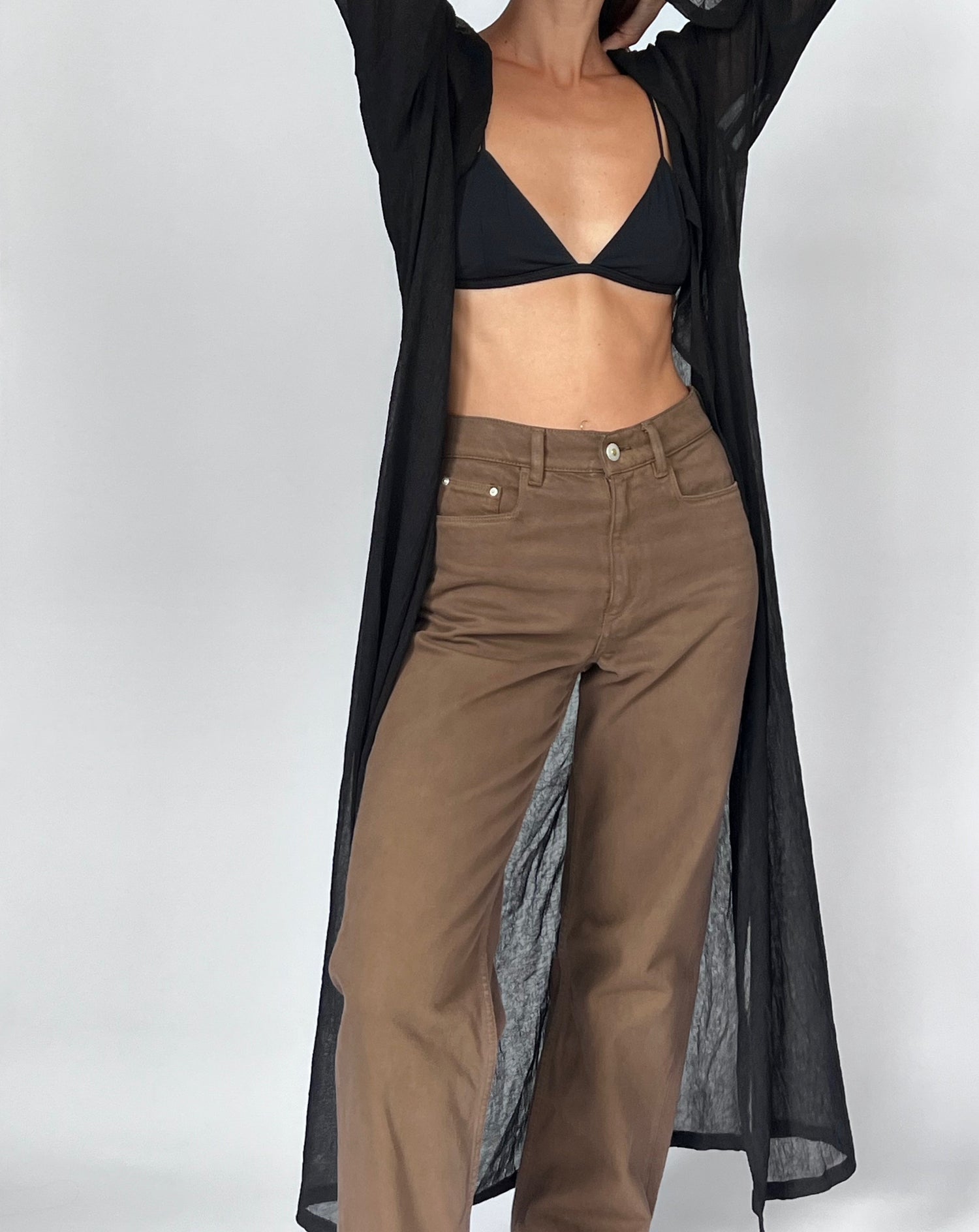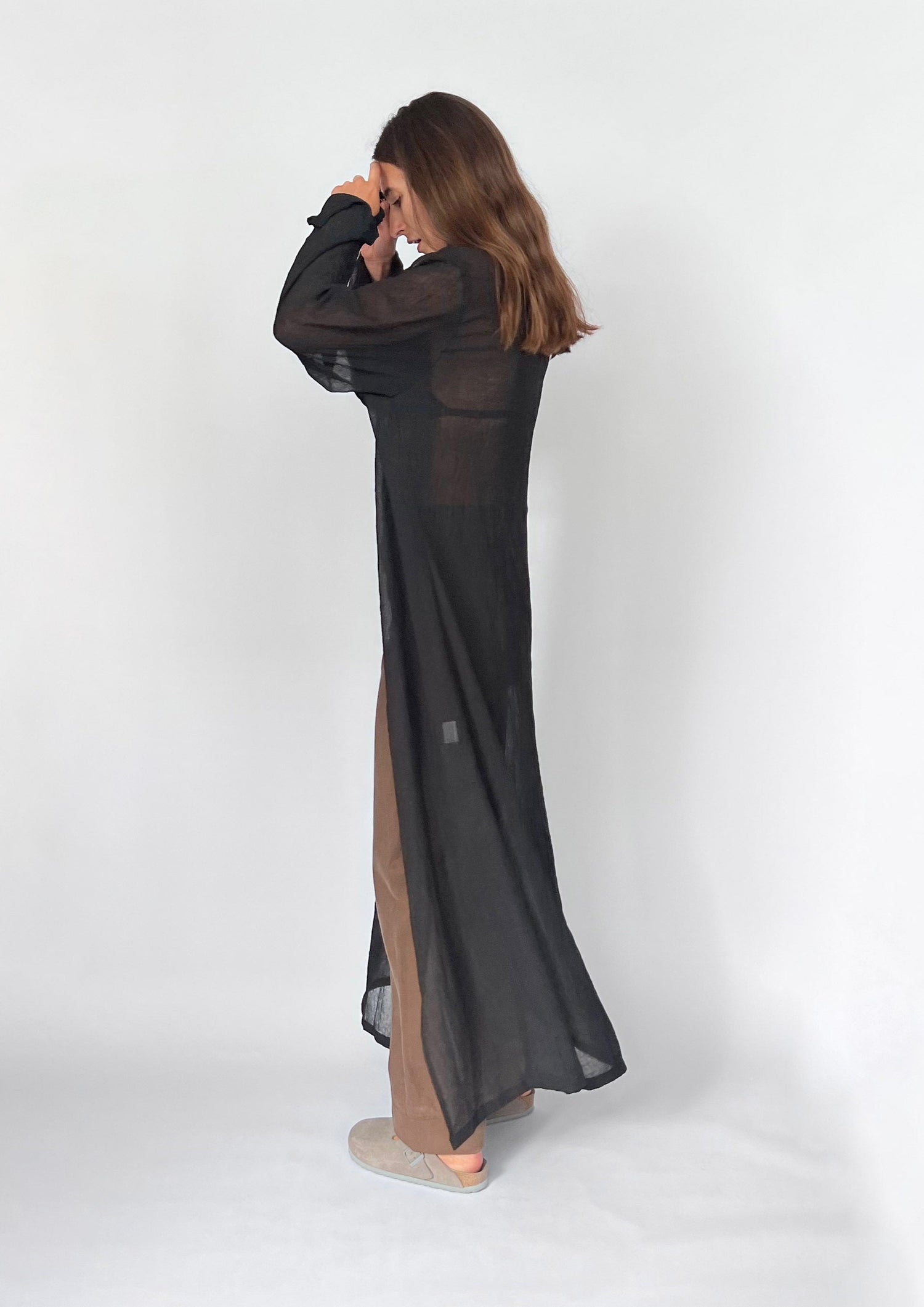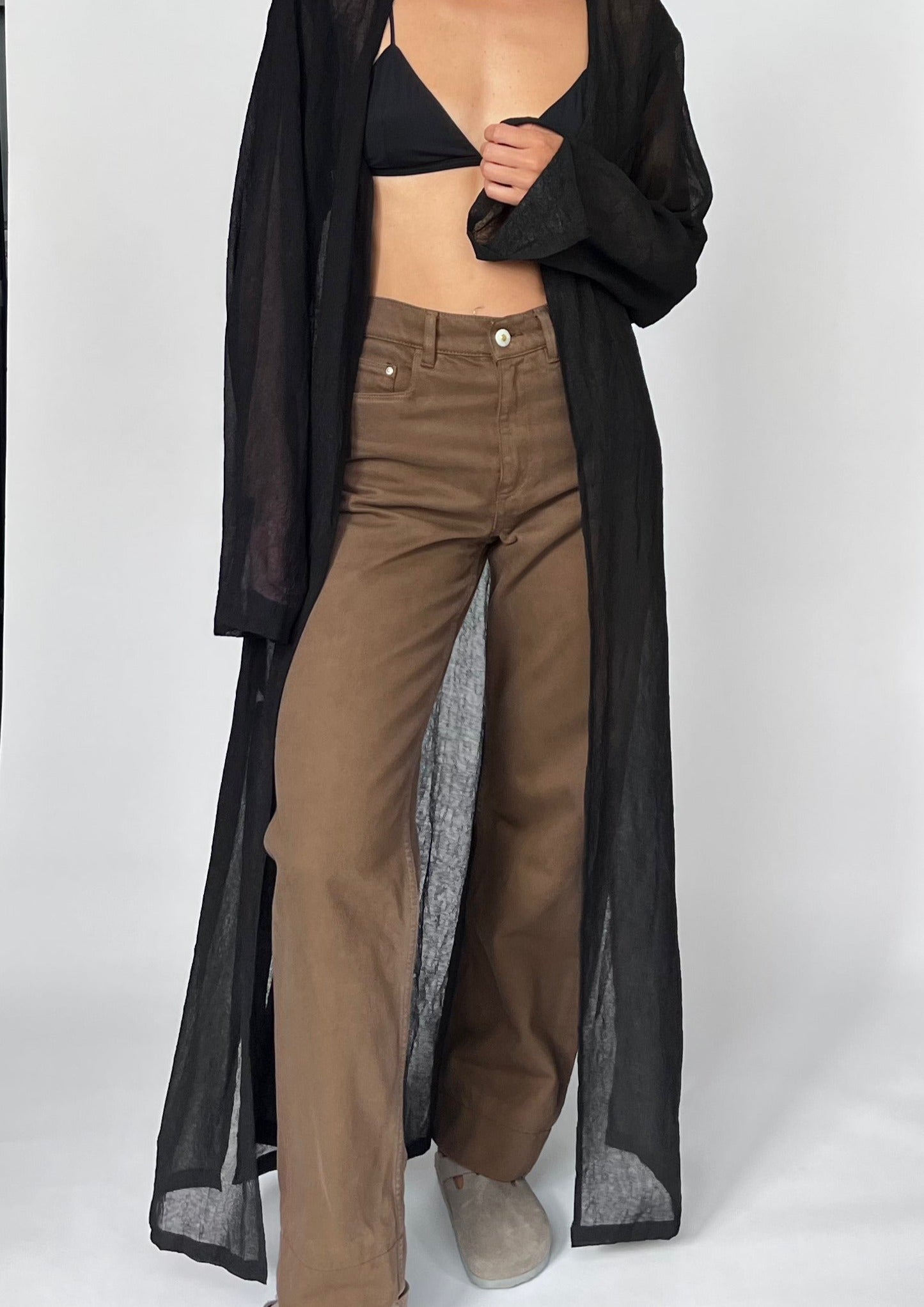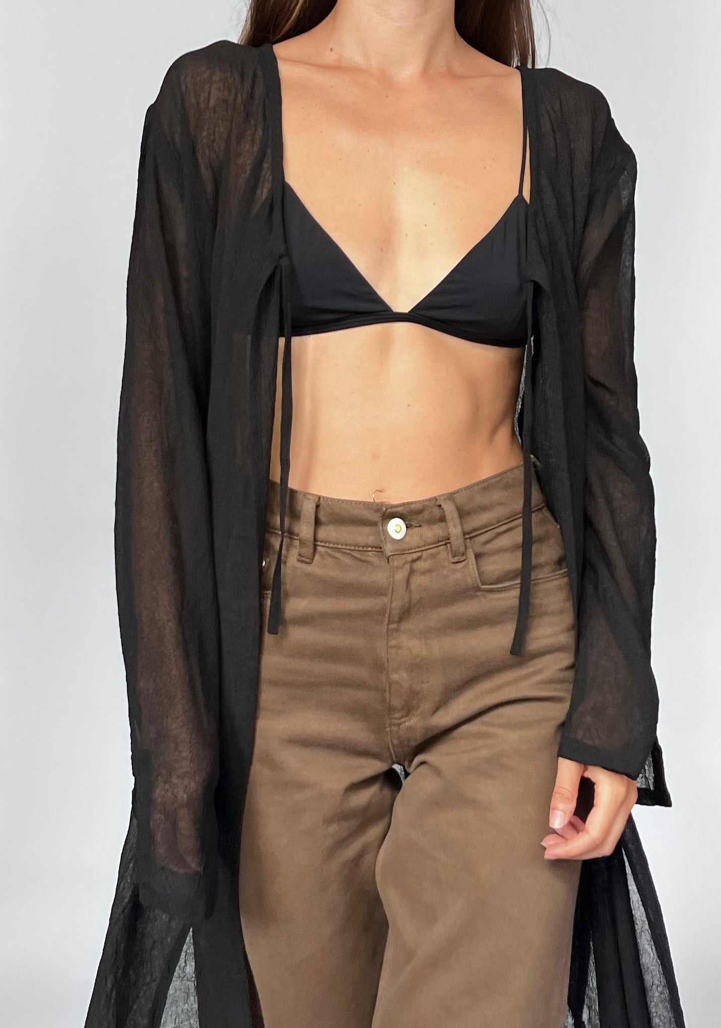 90s Maxi length sheer cardigan. Features a crinkle effect to the fabric, a tie at the bust and a relaxed shape. Side splits (48cm) create a more casual style