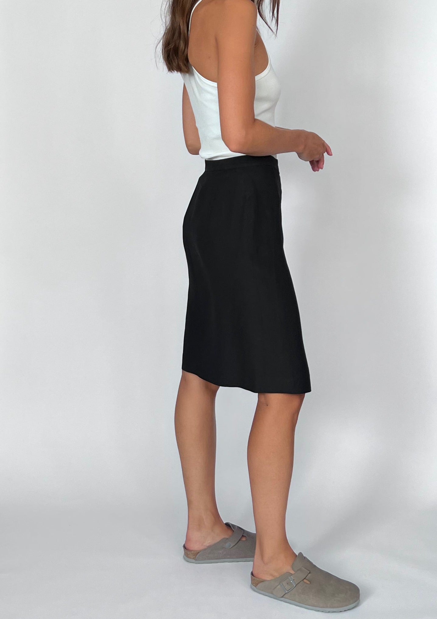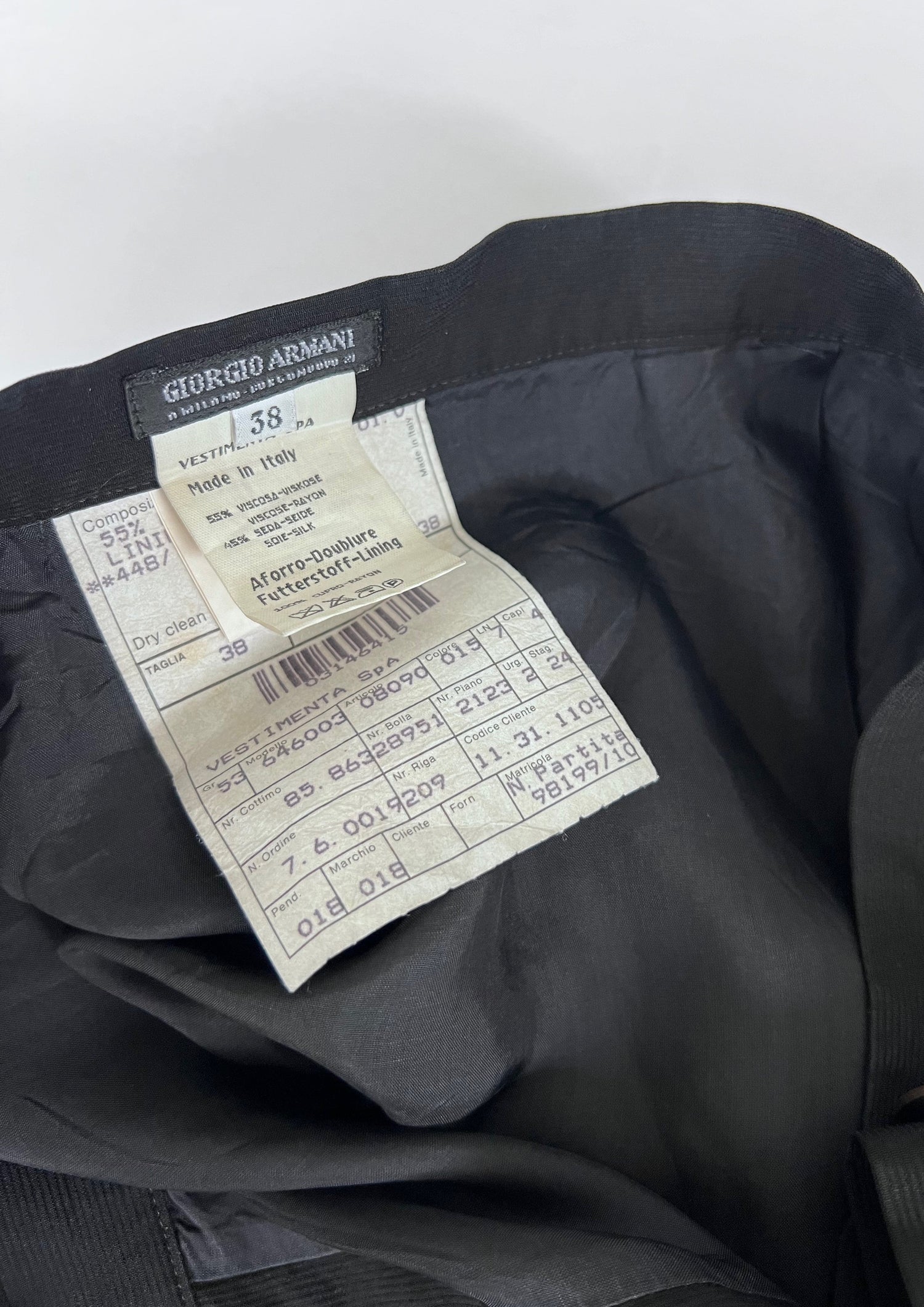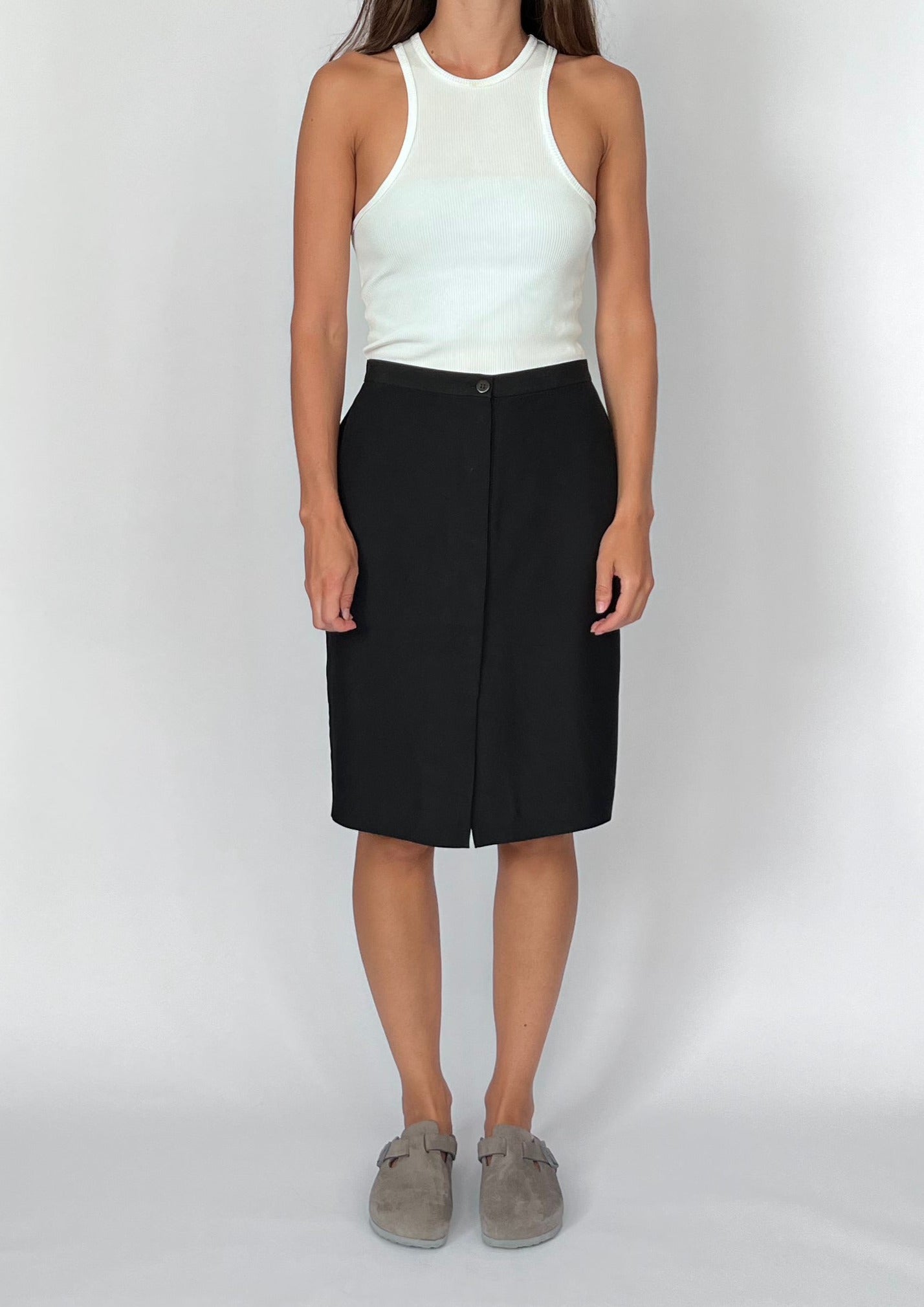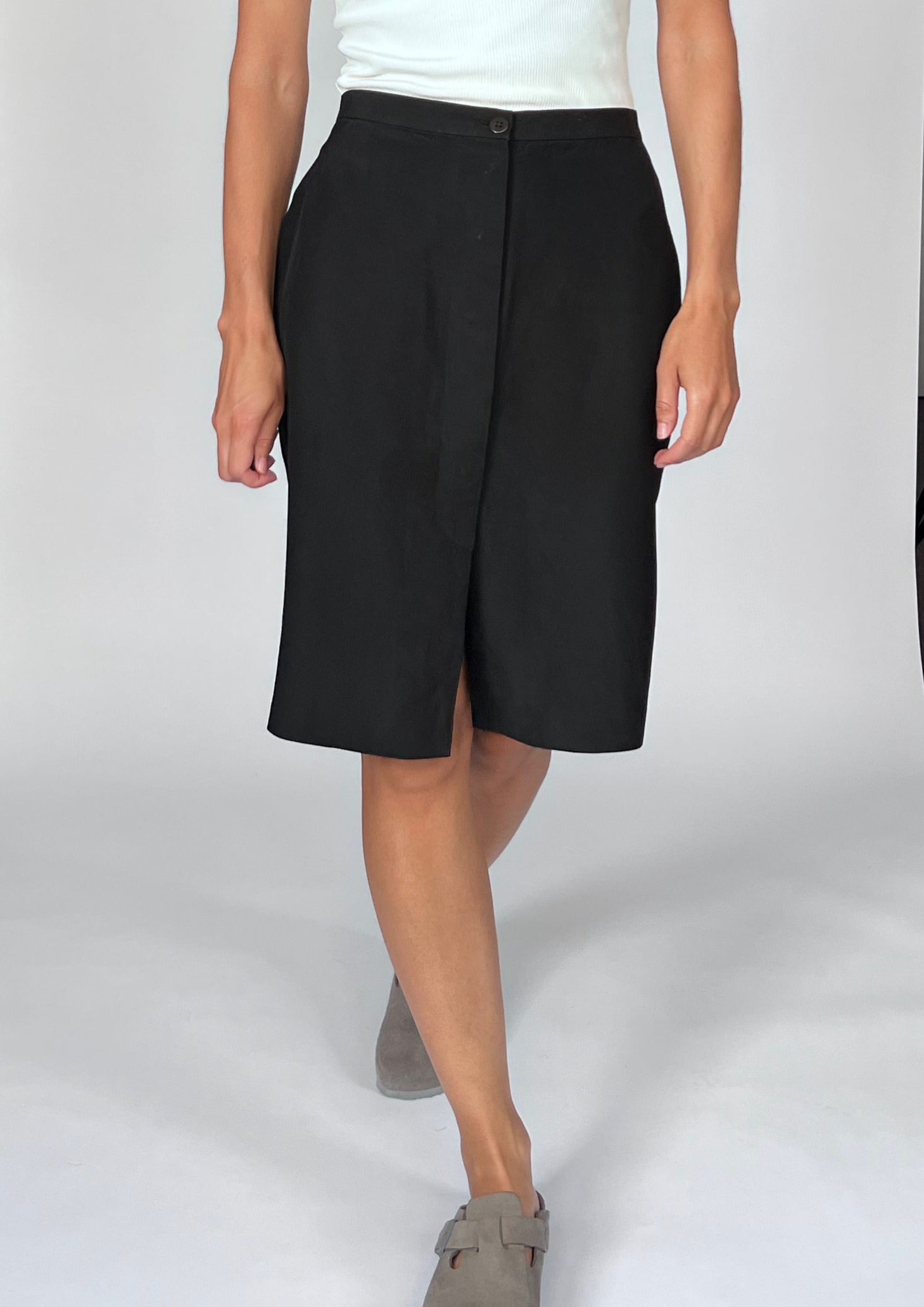 90s Giorgio Armani awkward length silk skirt. Features a button down fastening with a split at the front and a very subtle, tonal stripe design. Fully Lined