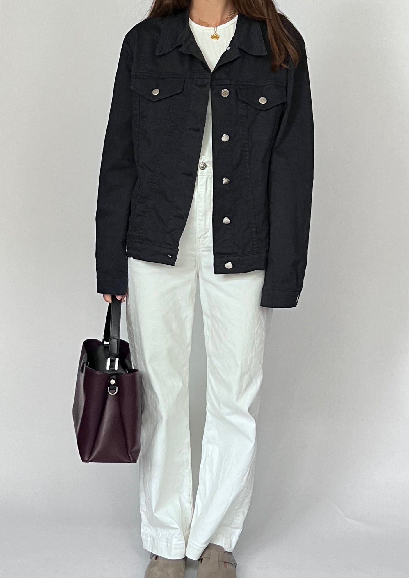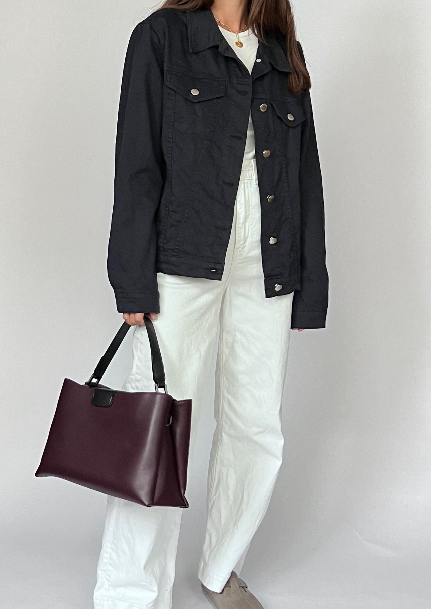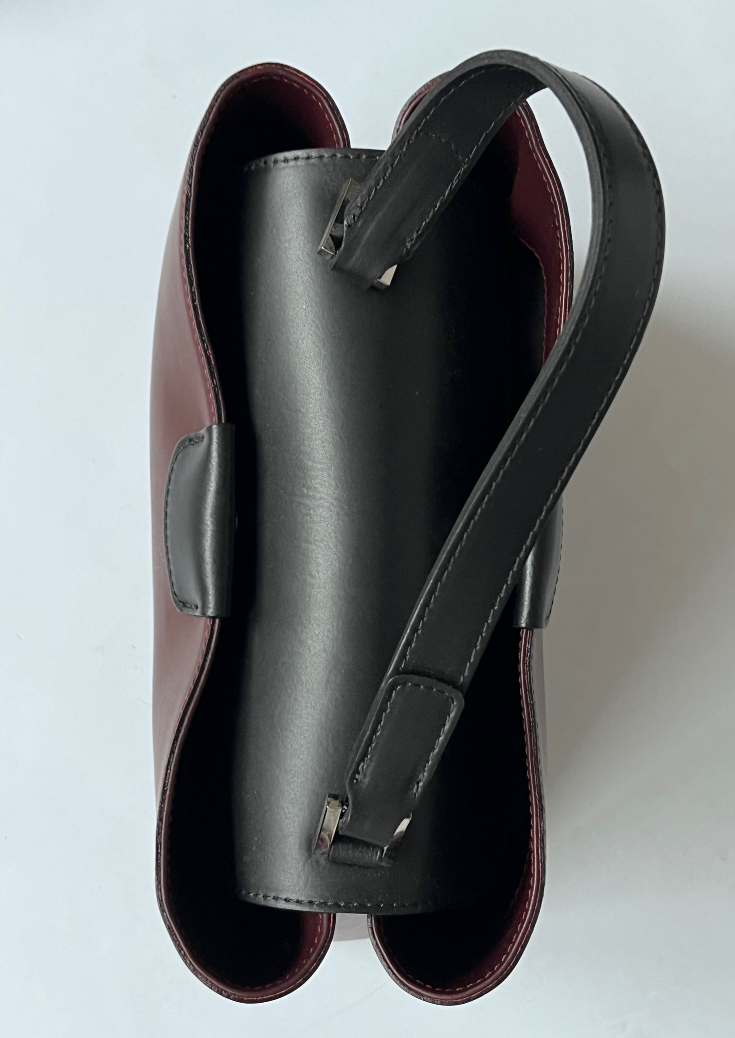 90s Burgundy and black leather shoulder bag. Features a shoulder strap, silver hardware, an inner zip pocket for essentials and a secure fastening with leather. Can be worn on the shoulder or as a hand held bag.