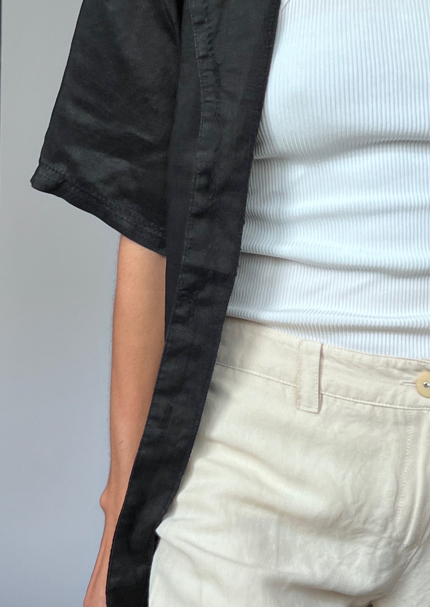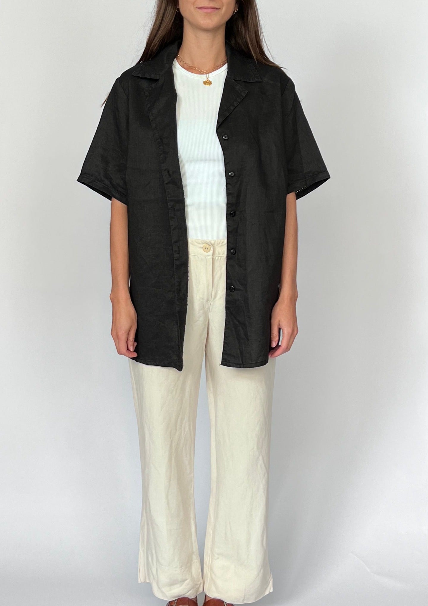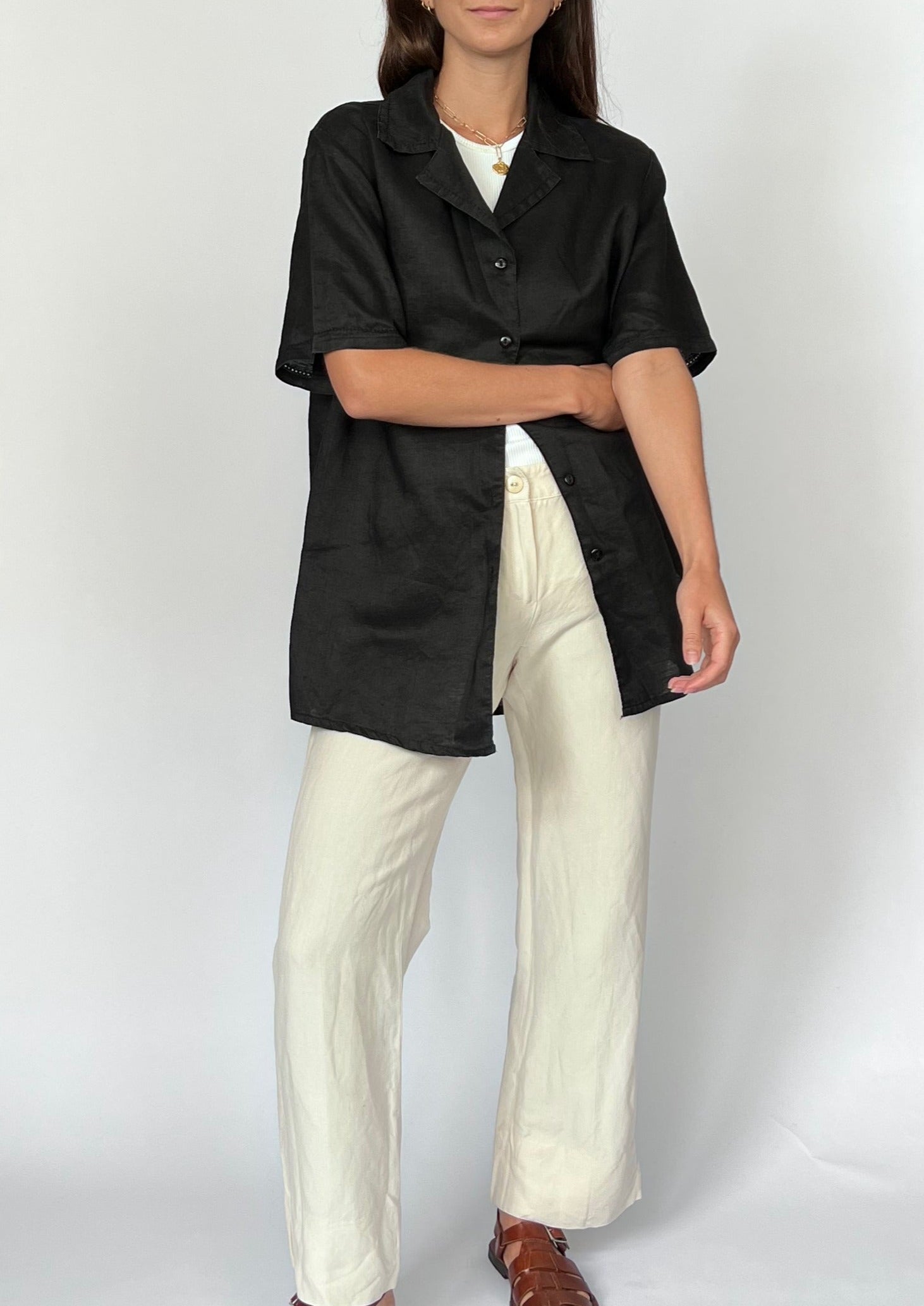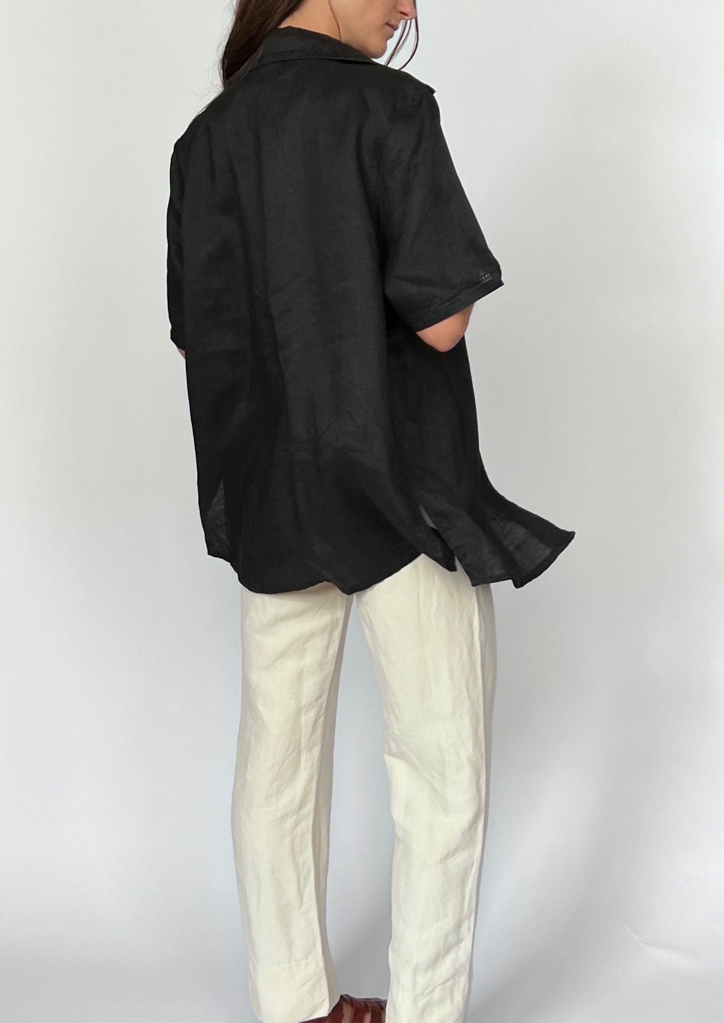 90s Boxy linen shirt in black. Features a boxy fit, short sleeves, side splits and a resort collar with embroidery detailing.