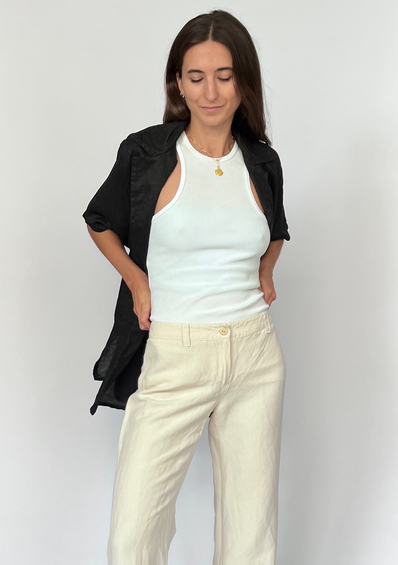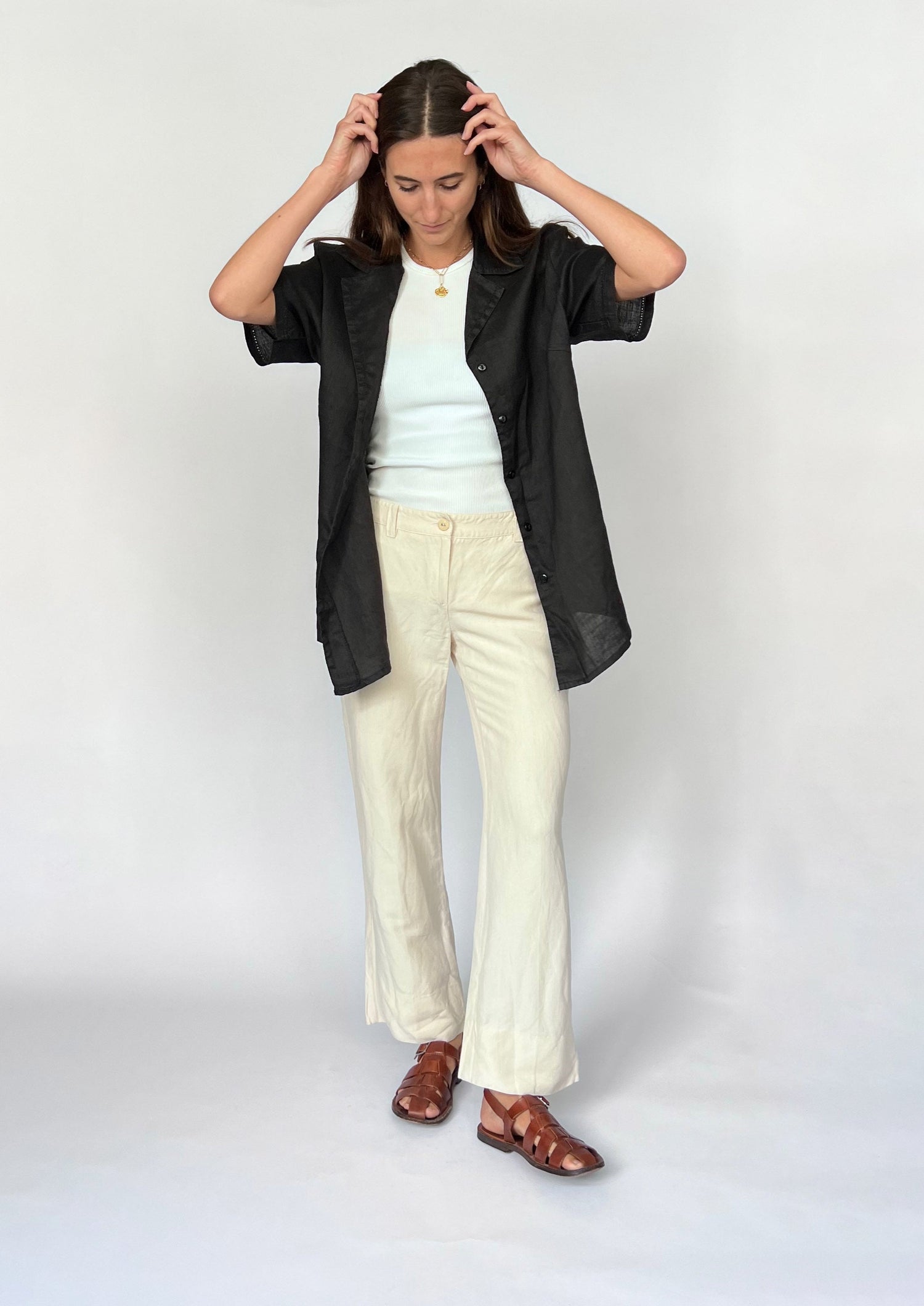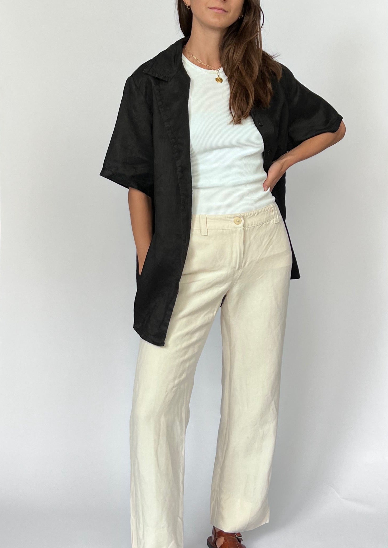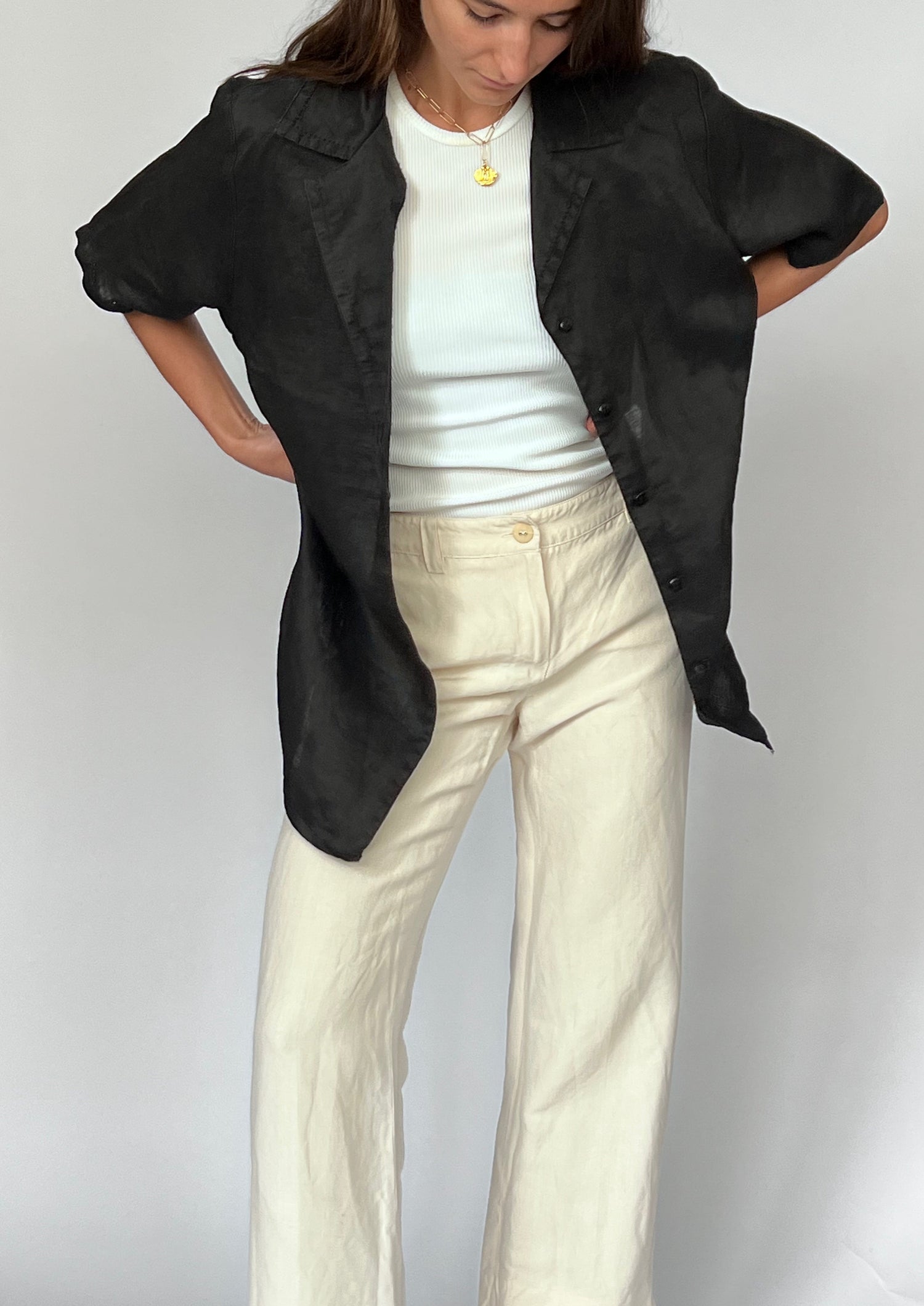 90s Boxy linen shirt in black. Features a boxy fit, short sleeves, side splits and a resort collar with embroidery detailing.