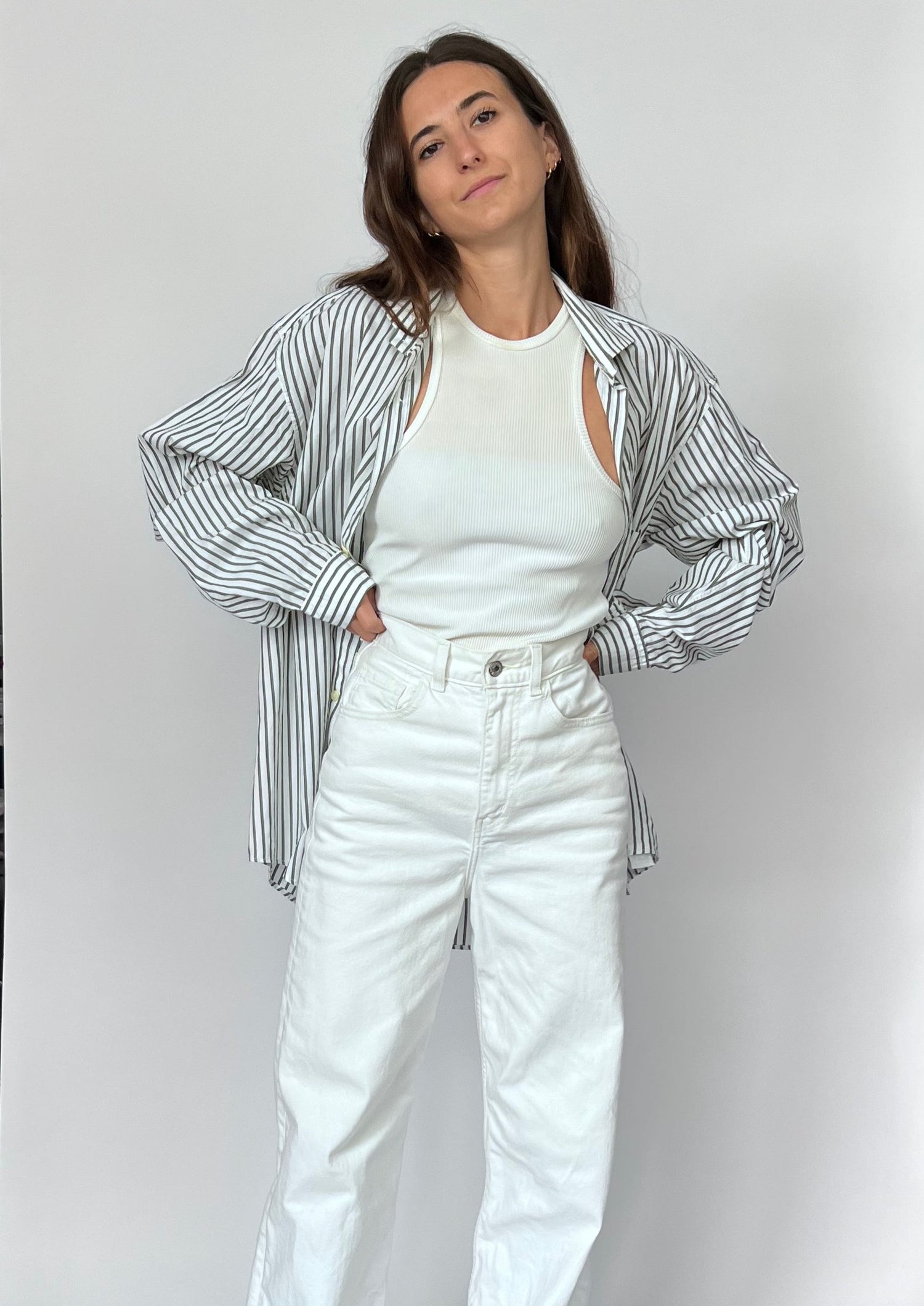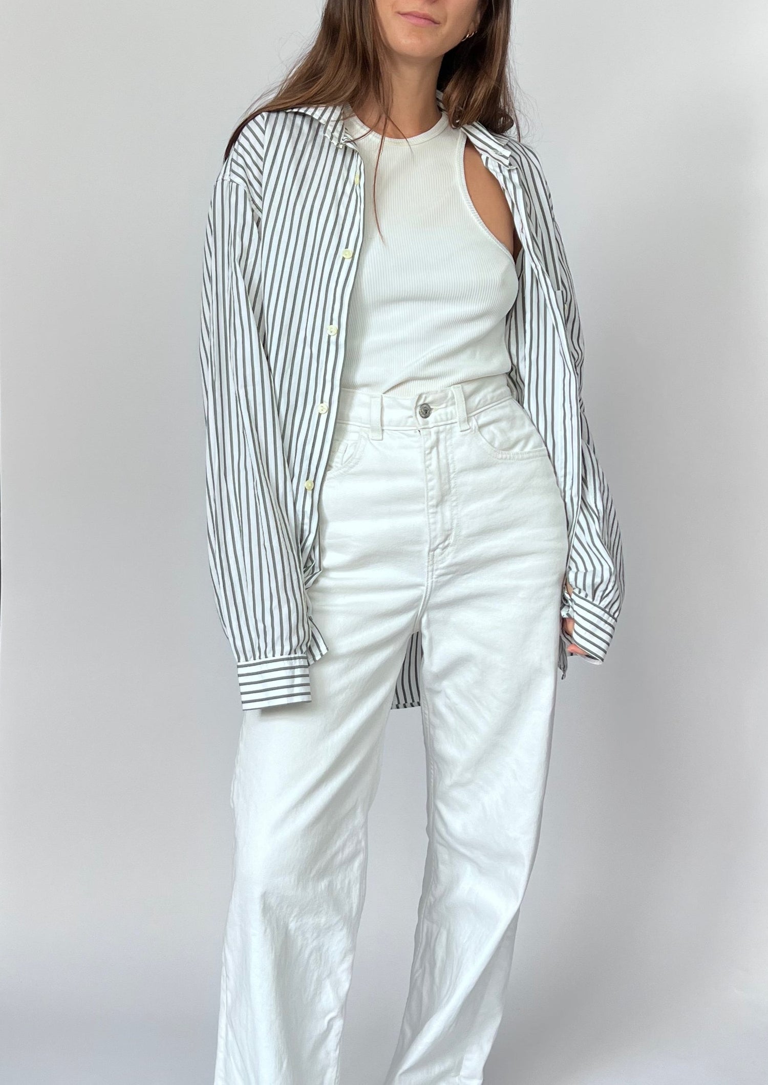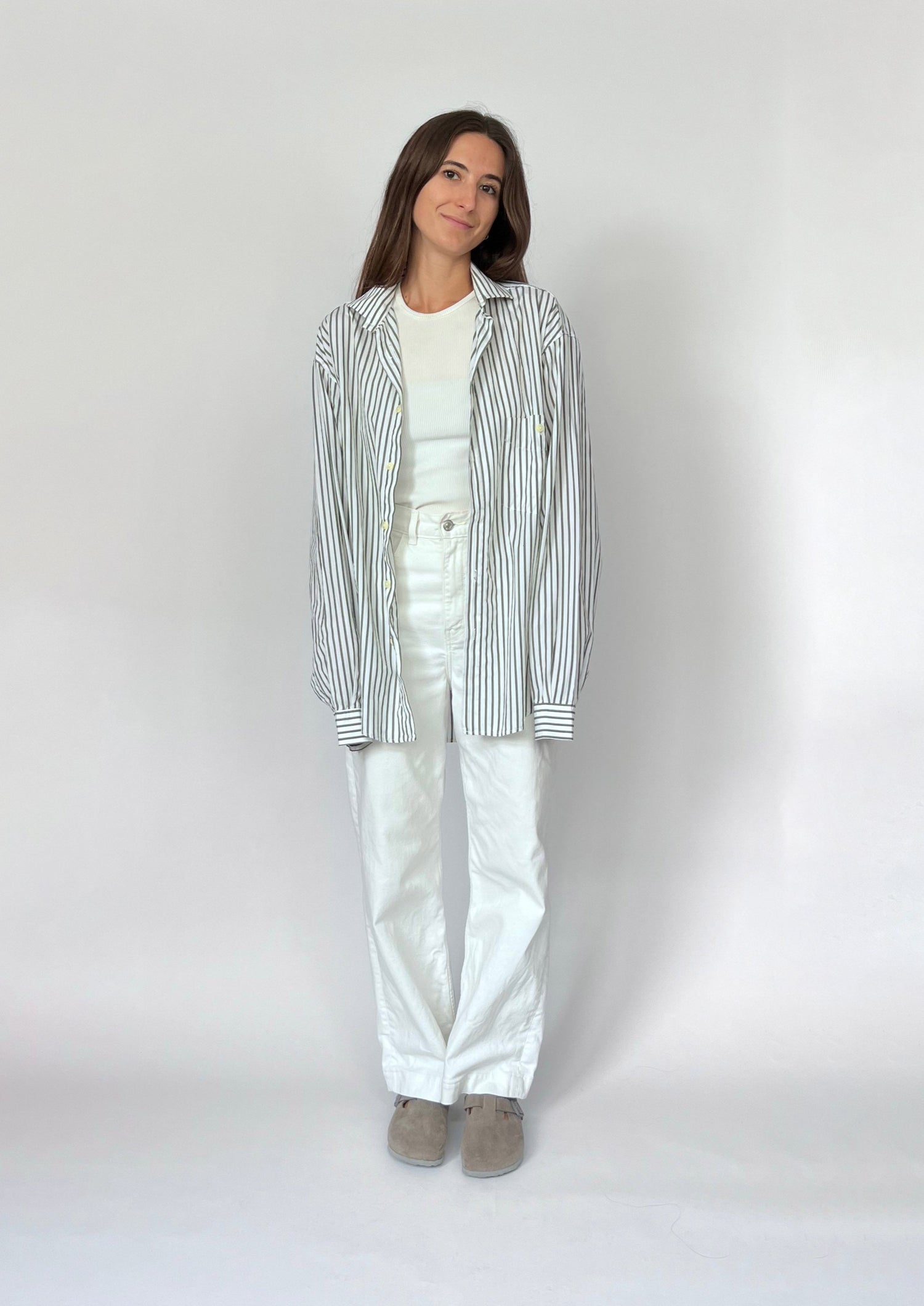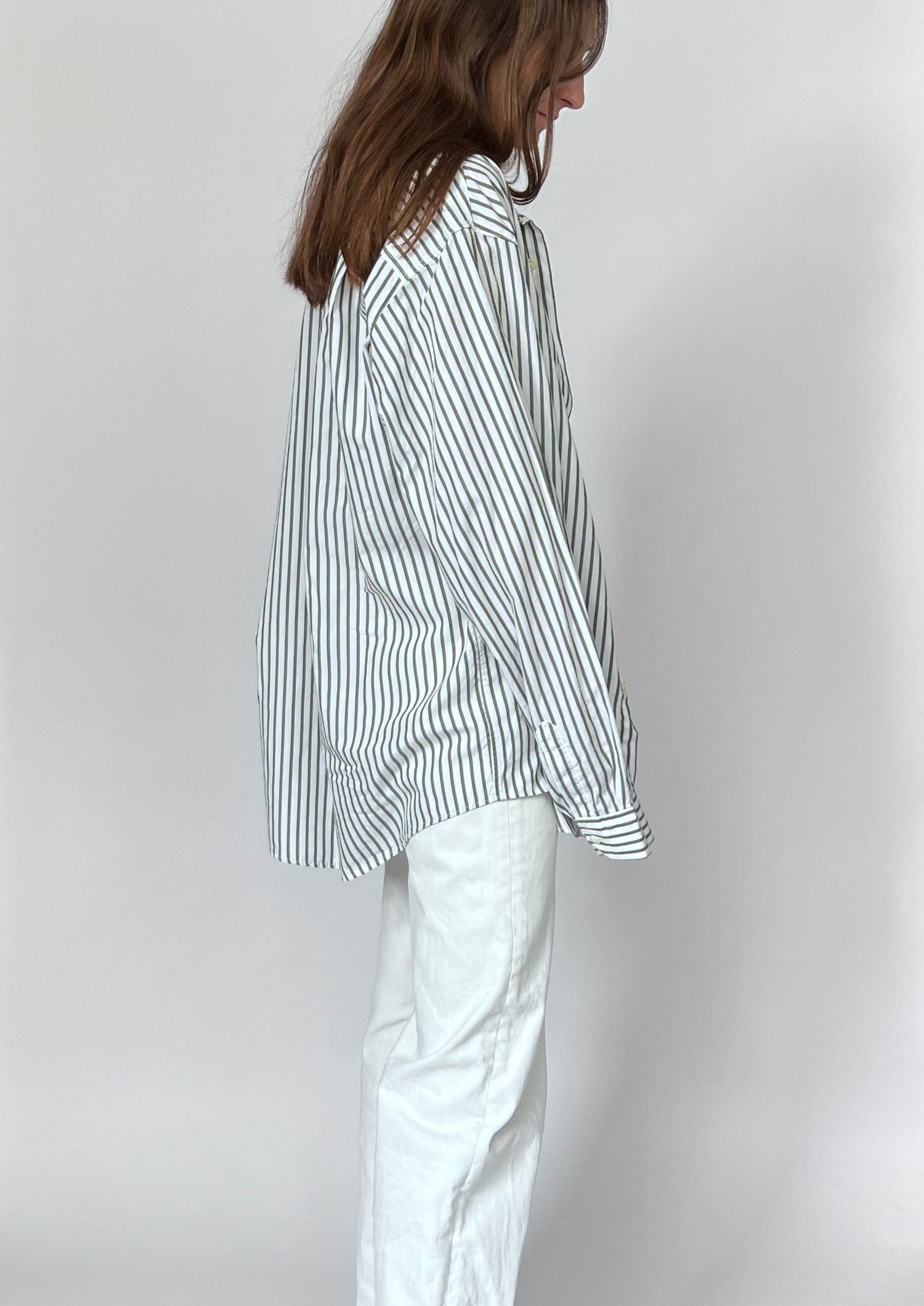 90s Stripe shirt. Features a grey/khaki stripe on a white 100% cotton. Features one patch pocket, longline length and classic shirt details.
