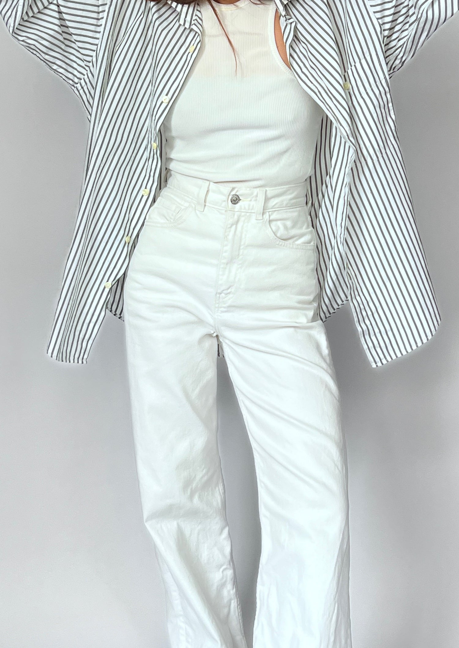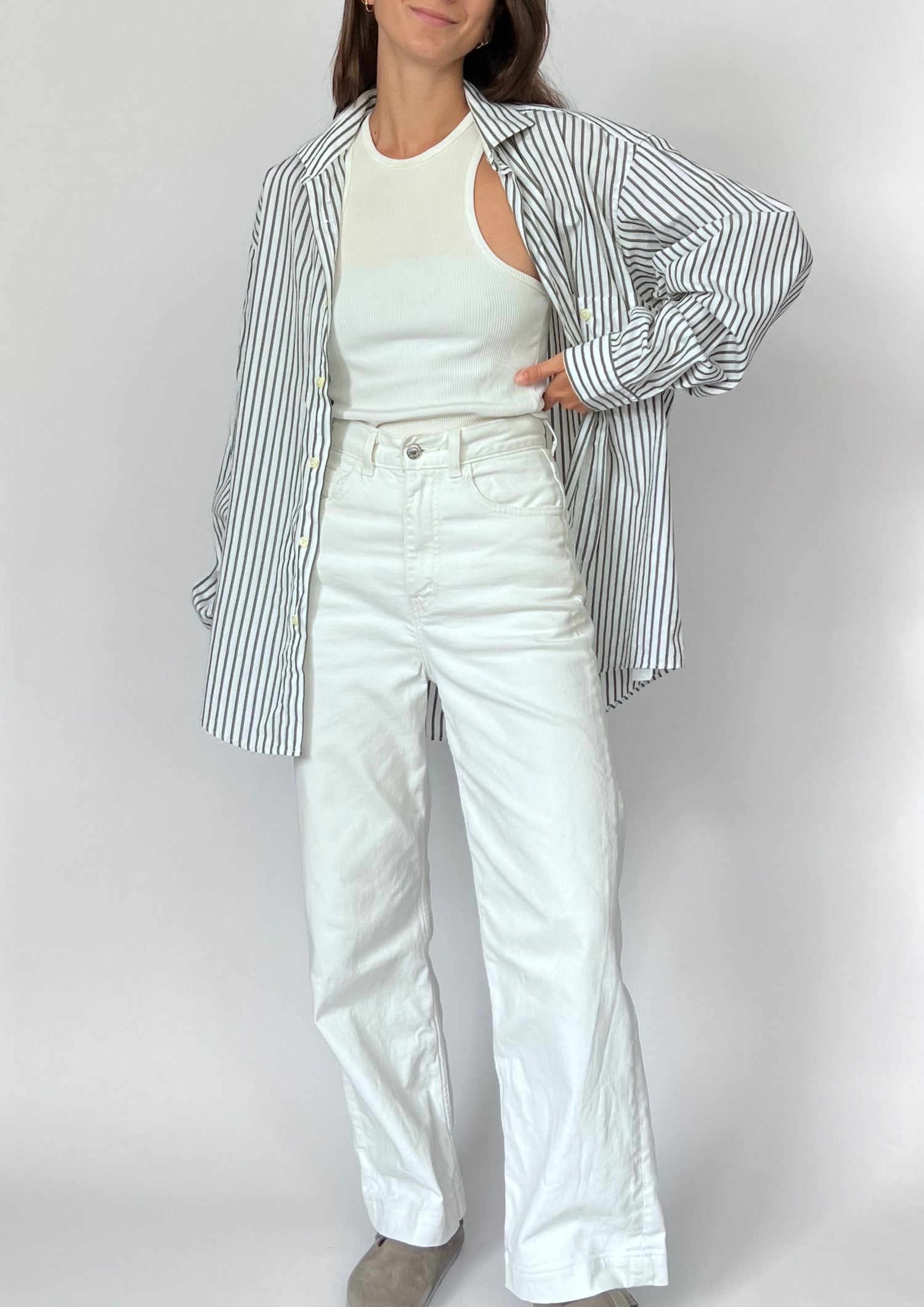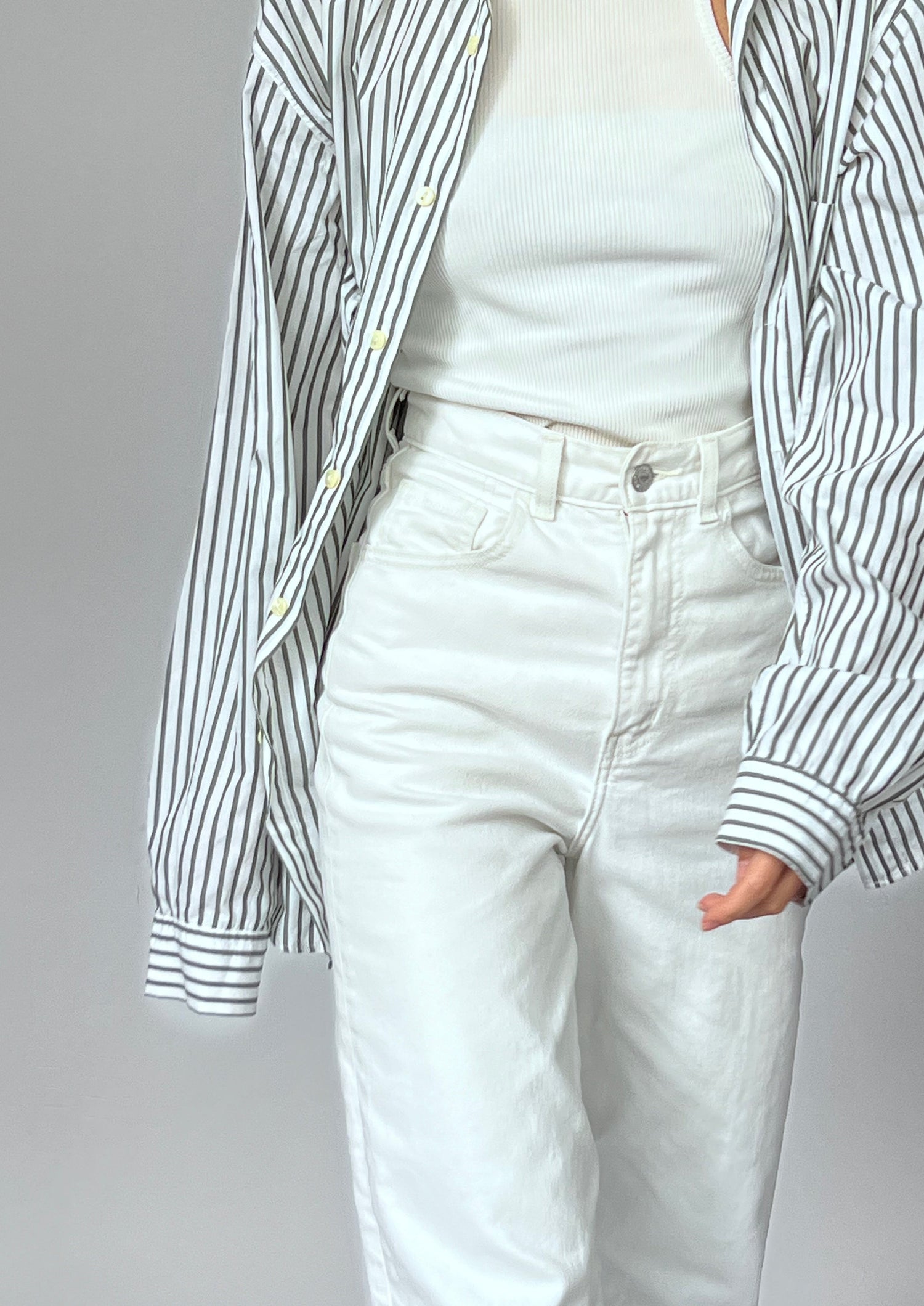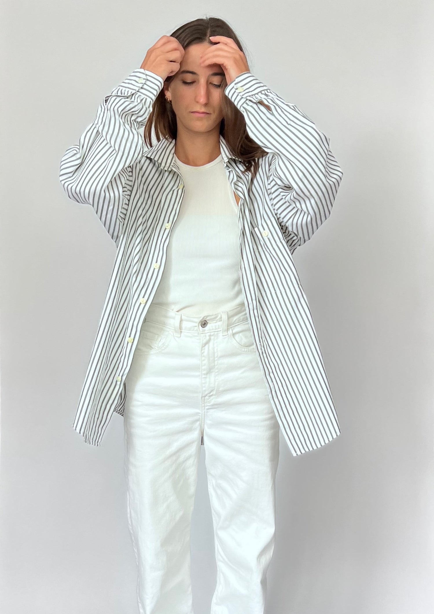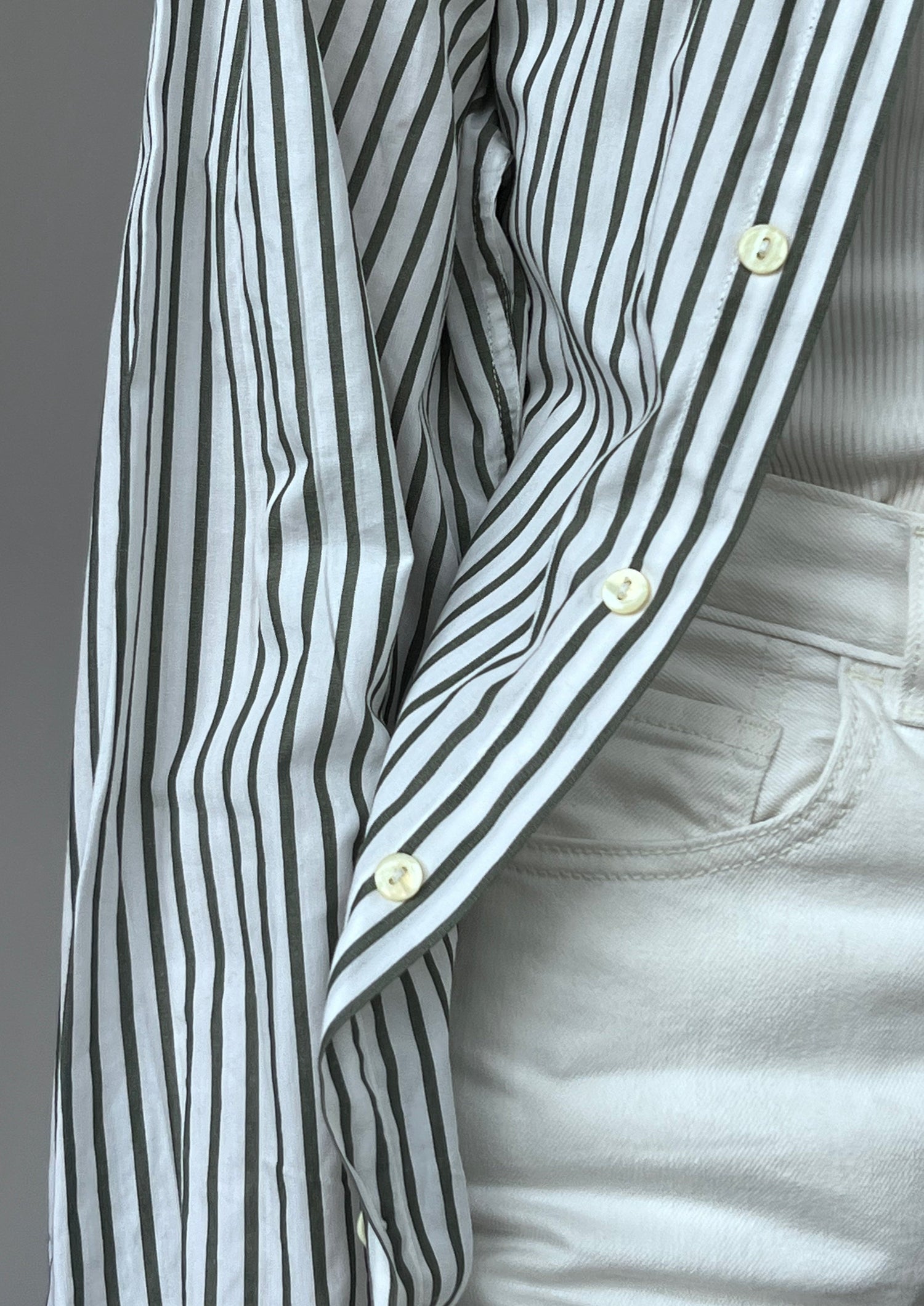 90s Stripe shirt. Features a grey/khaki stripe on a white 100% cotton. Features one patch pocket, longline length and classic shirt details.
