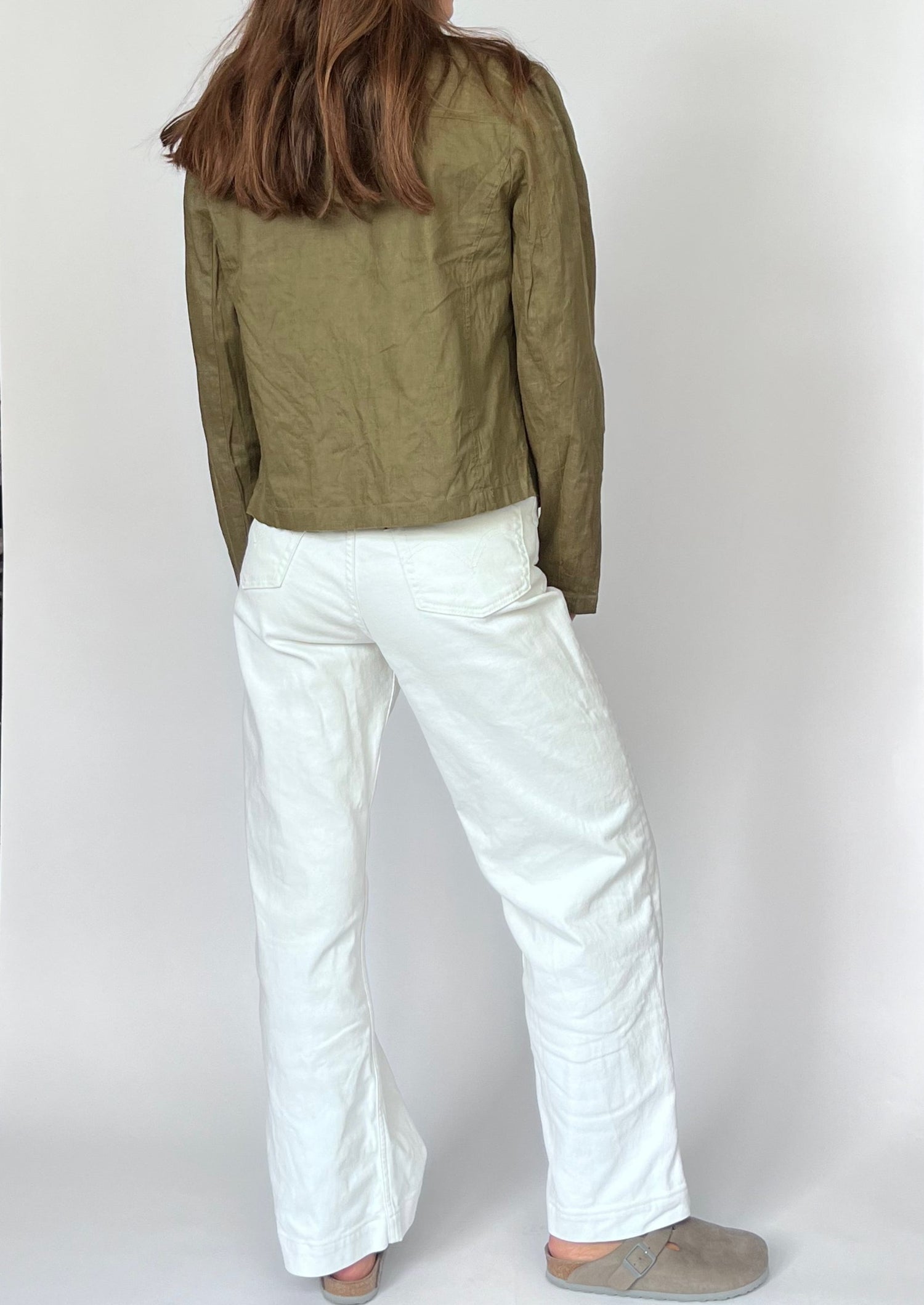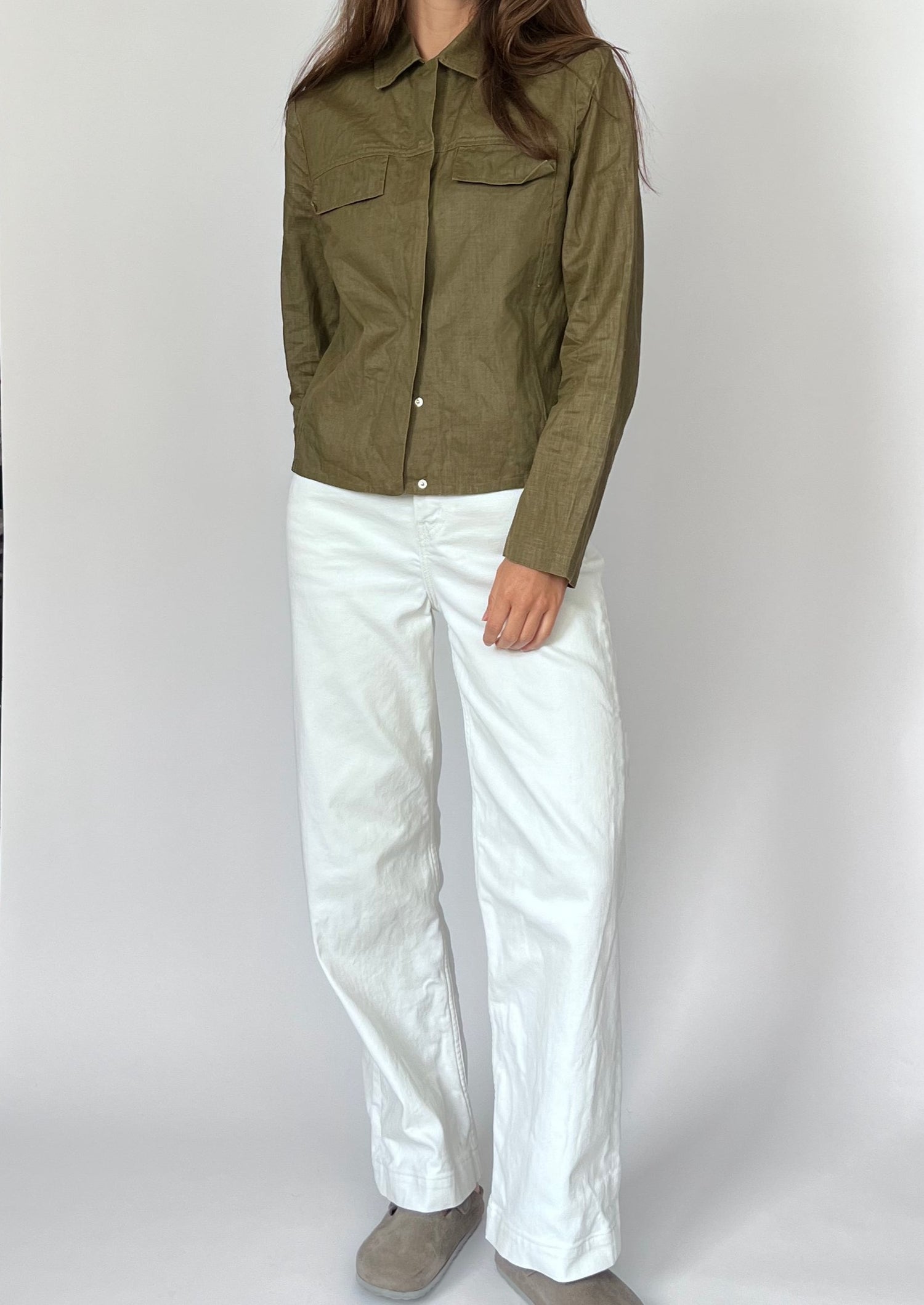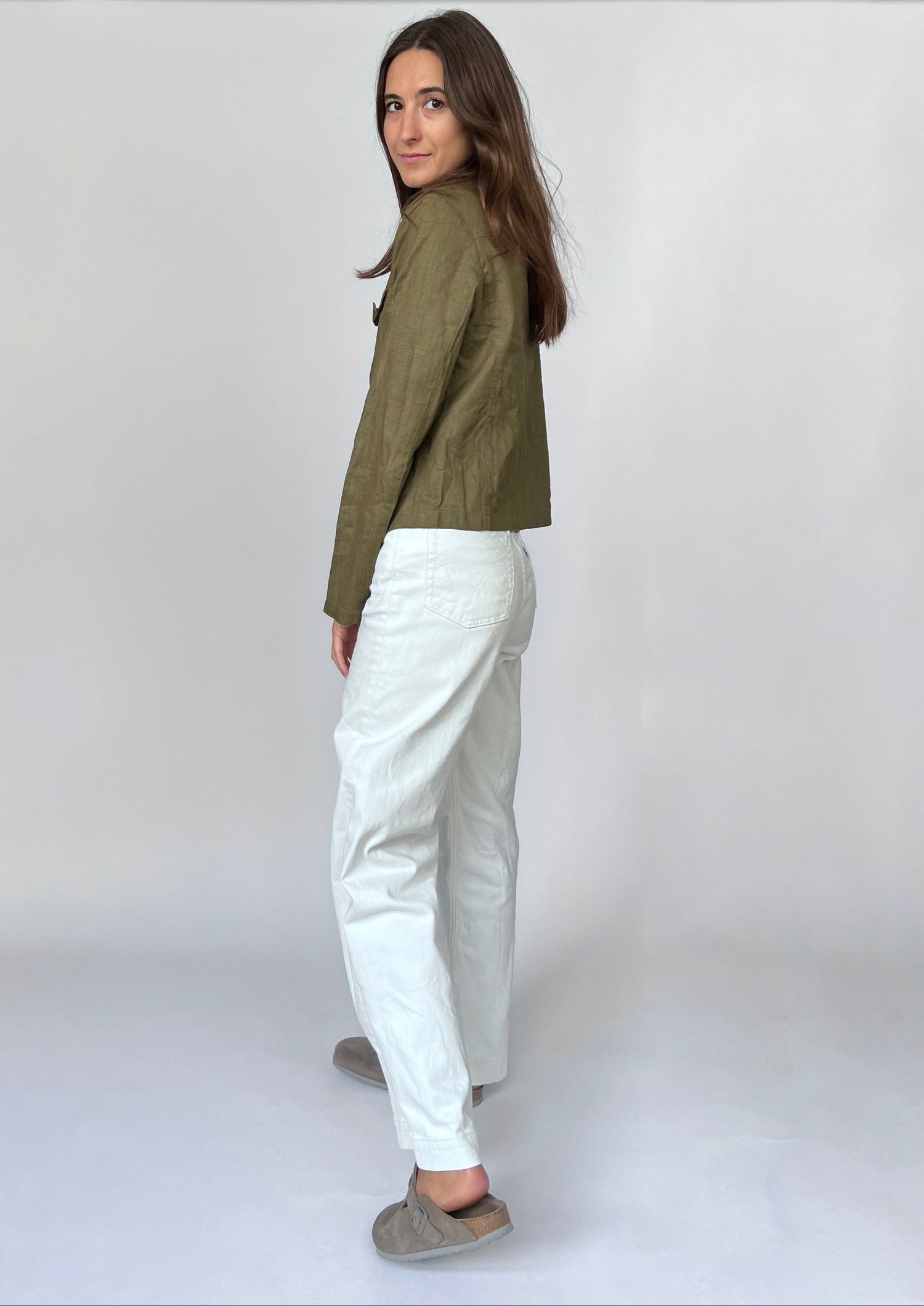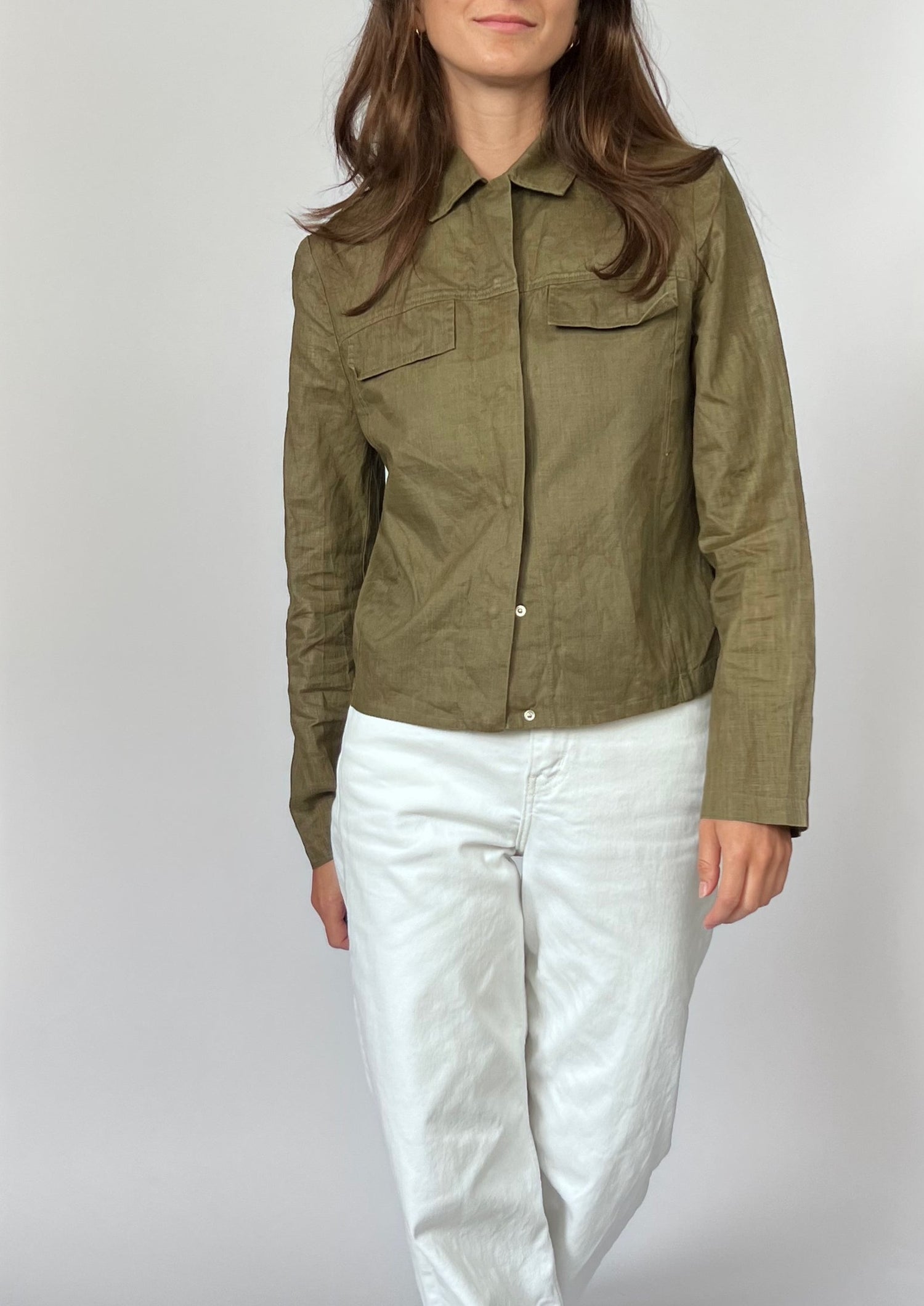 90s Linen cropped boxy jacket. Features seam detailing, two side pockets and poppers to fasten down the front. We love this as a layering piece underneath a trench when you don't want to wear a jumper!