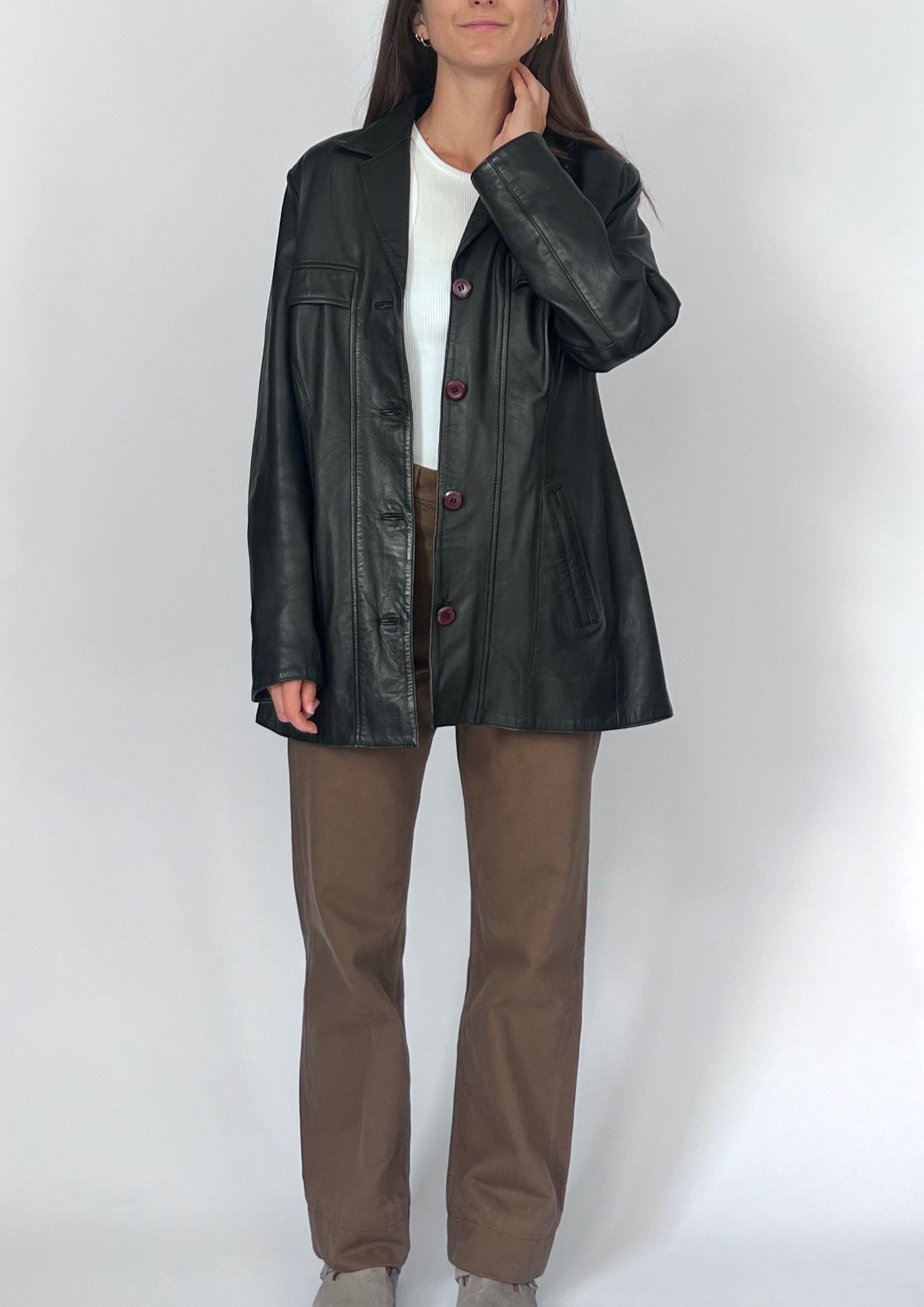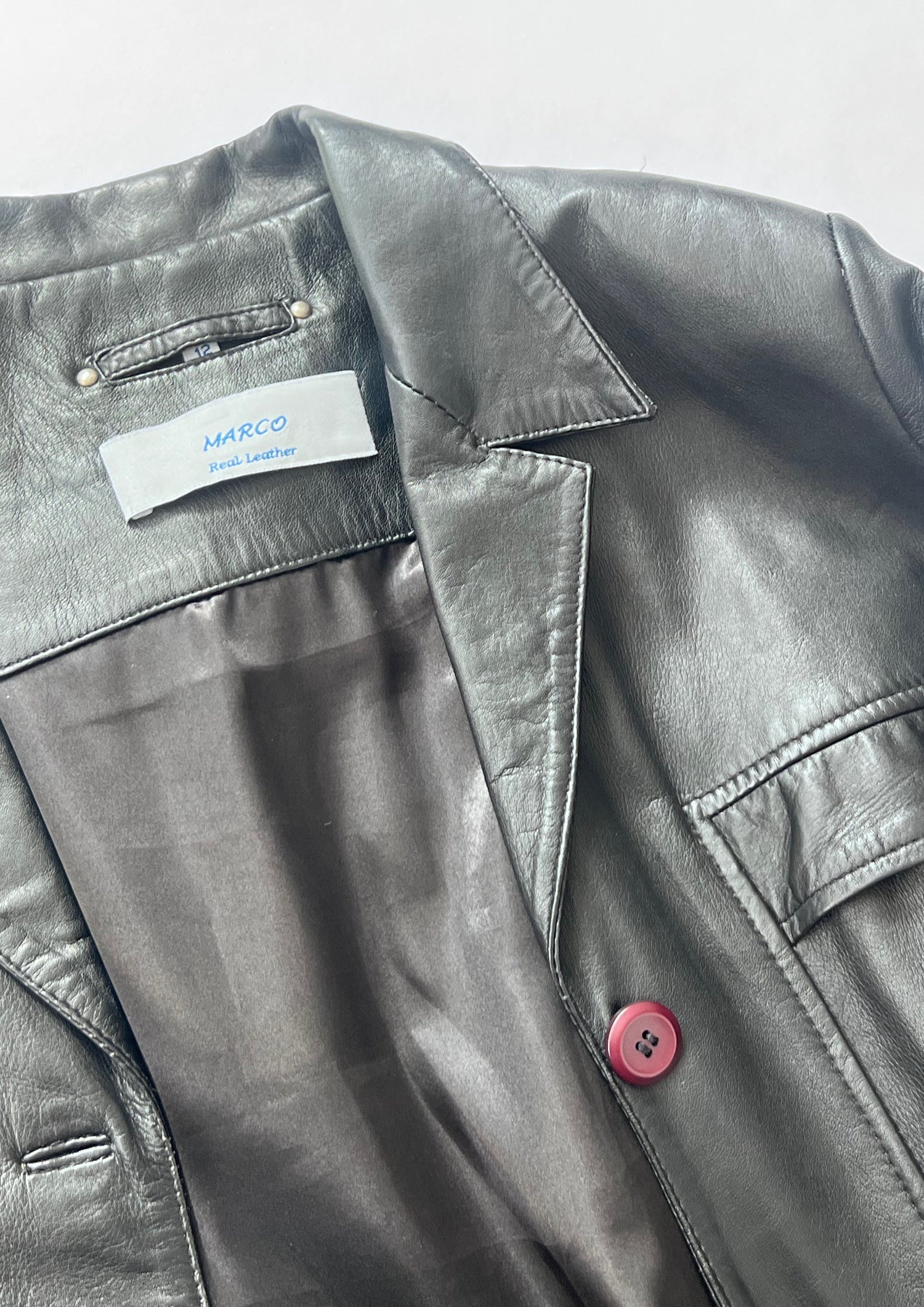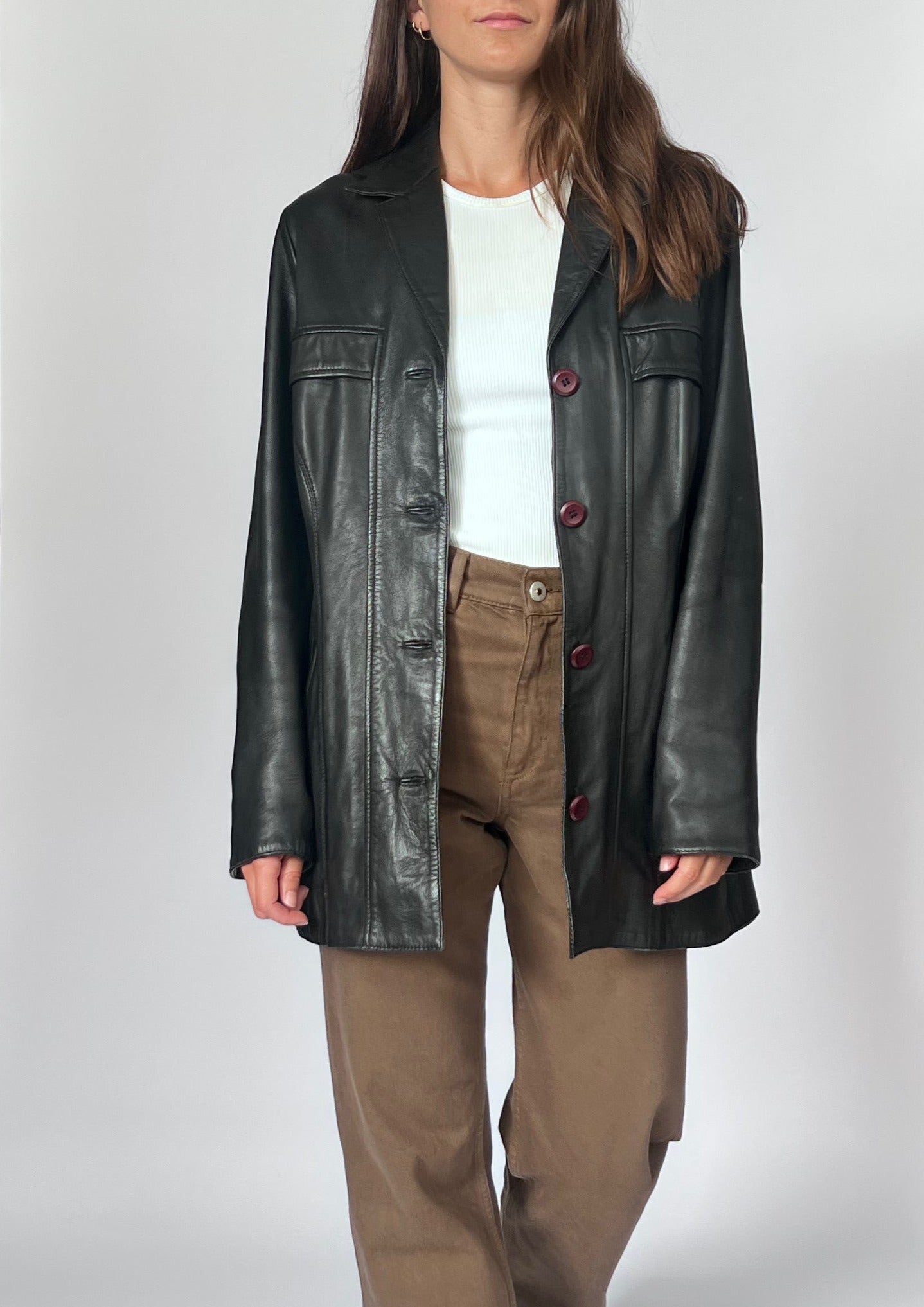 90s leather jacket in a longer length. Features pocket and seam detail, and two functional side pockets. Fully lined, beautifully made with maroon buttons at the front to fasten.