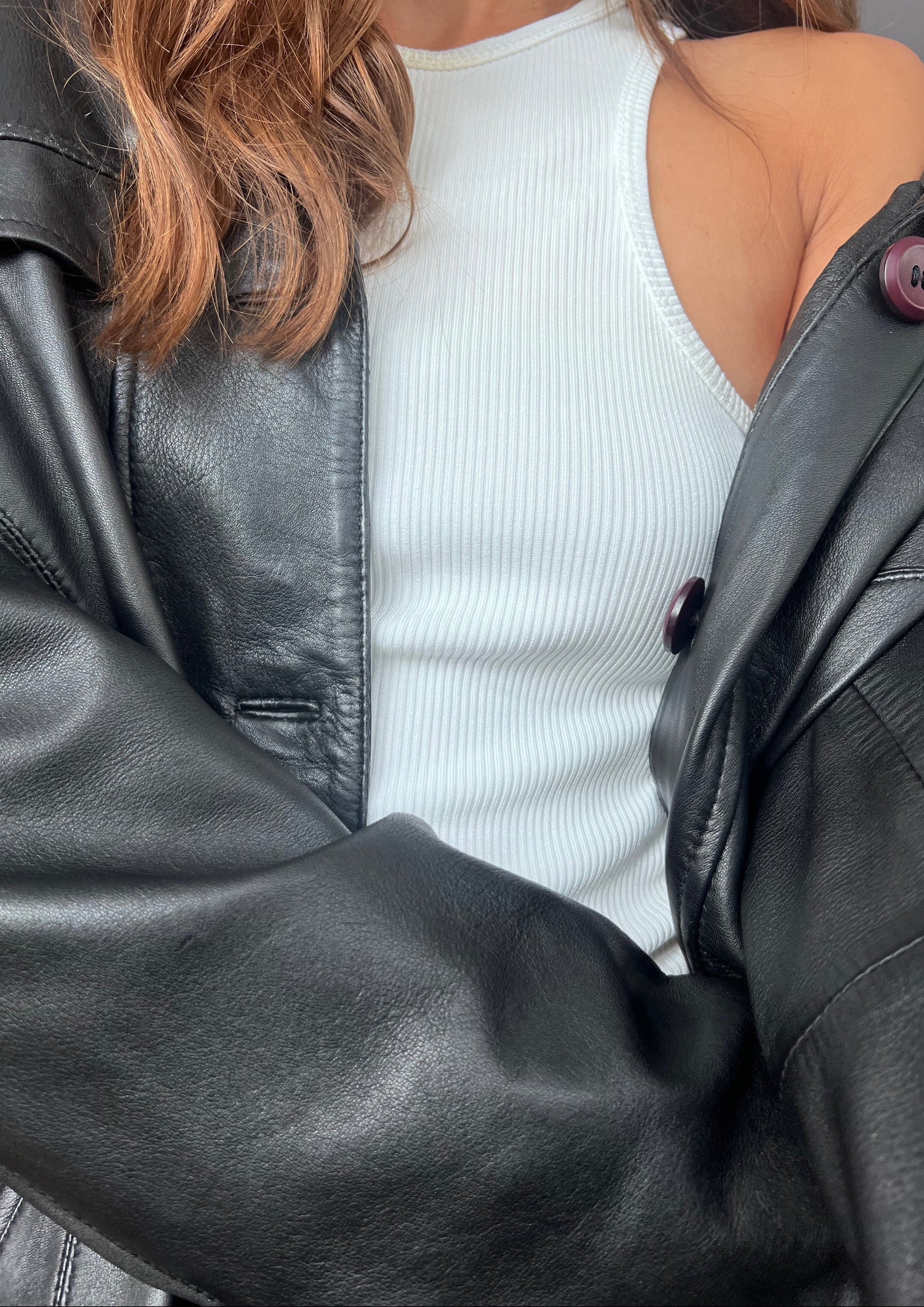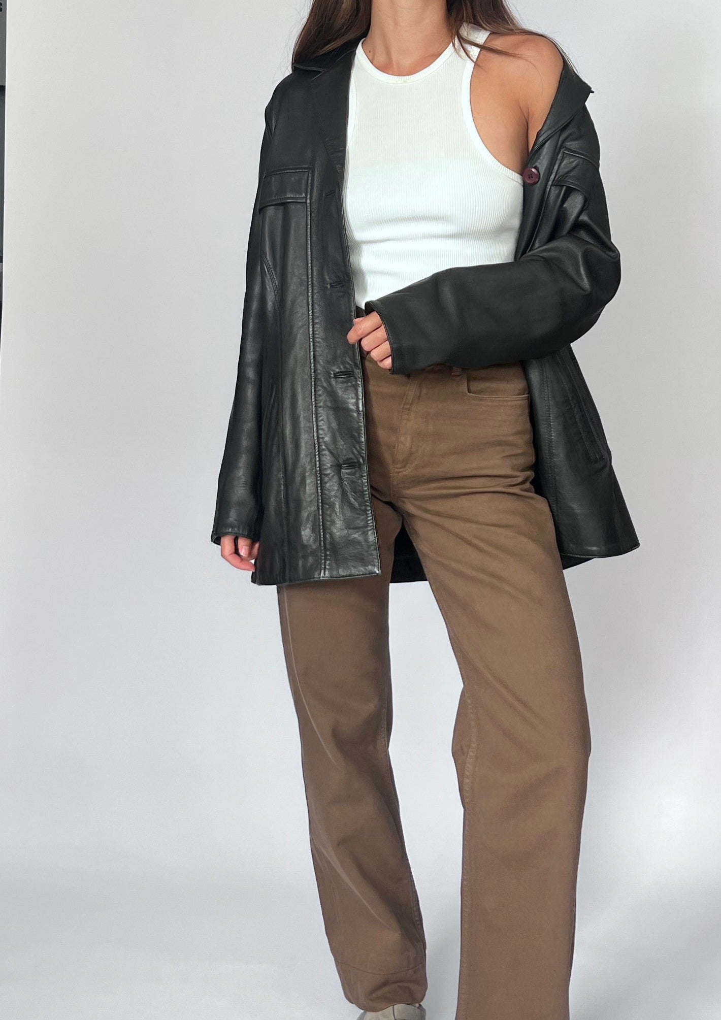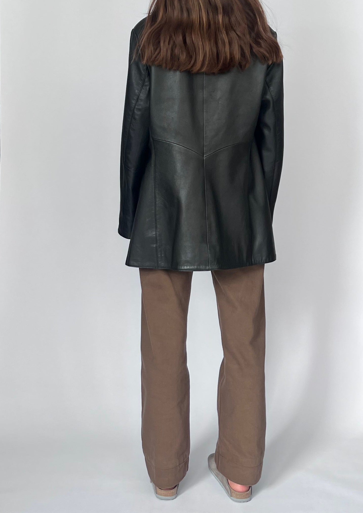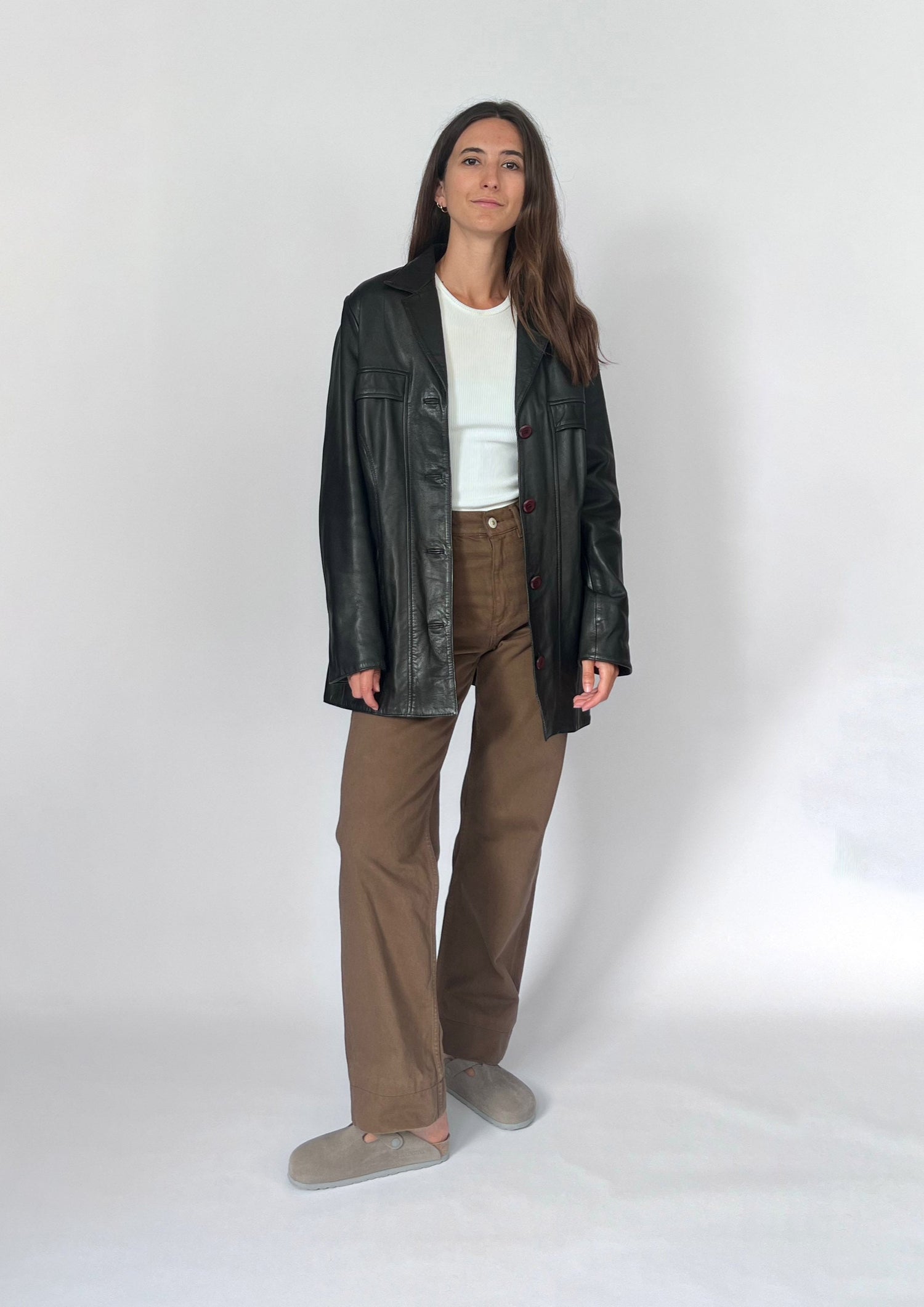 90s leather jacket in a longer length. Features pocket and seam detail, and two functional side pockets. Fully lined, beautifully made with maroon buttons at the front to fasten.