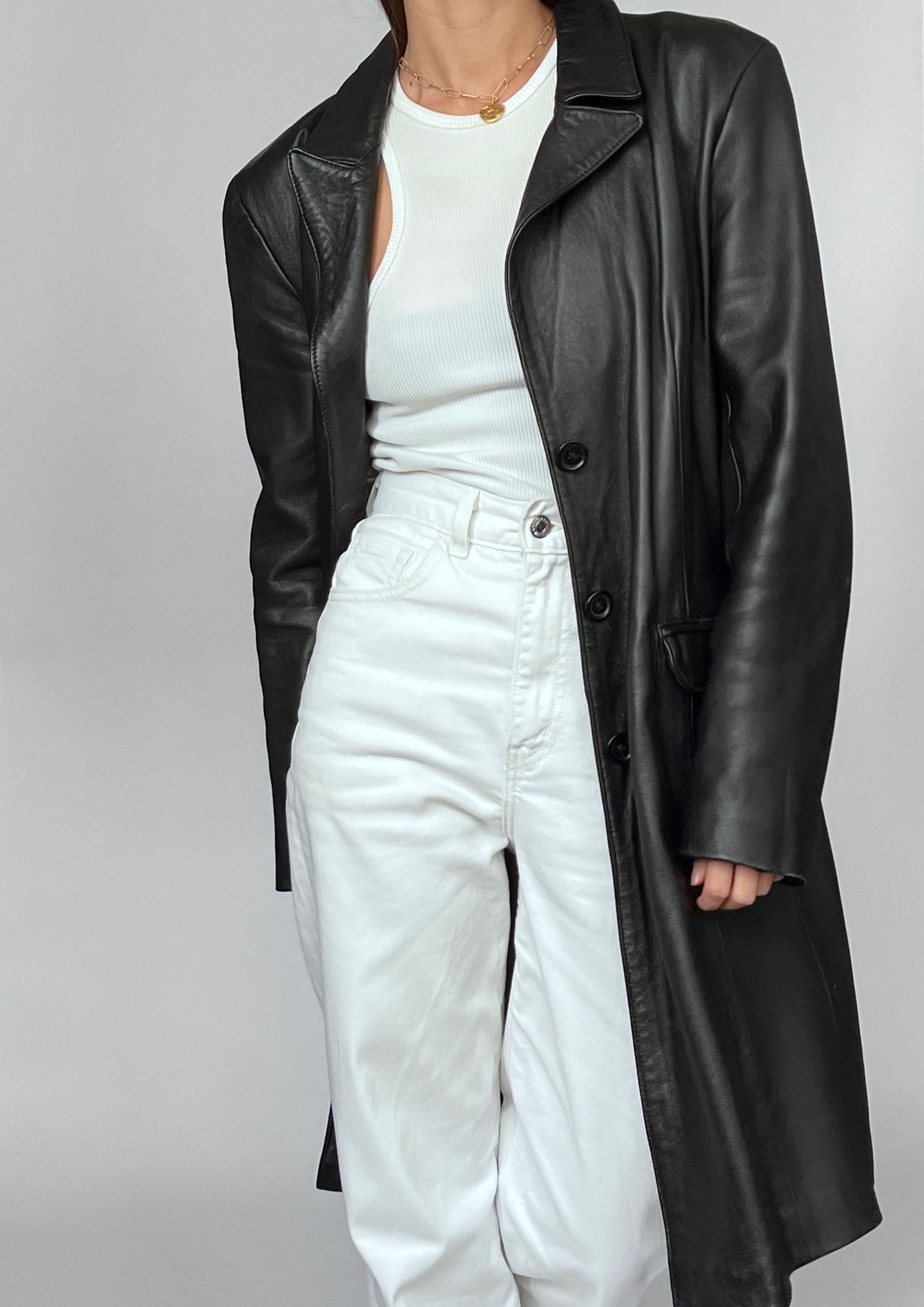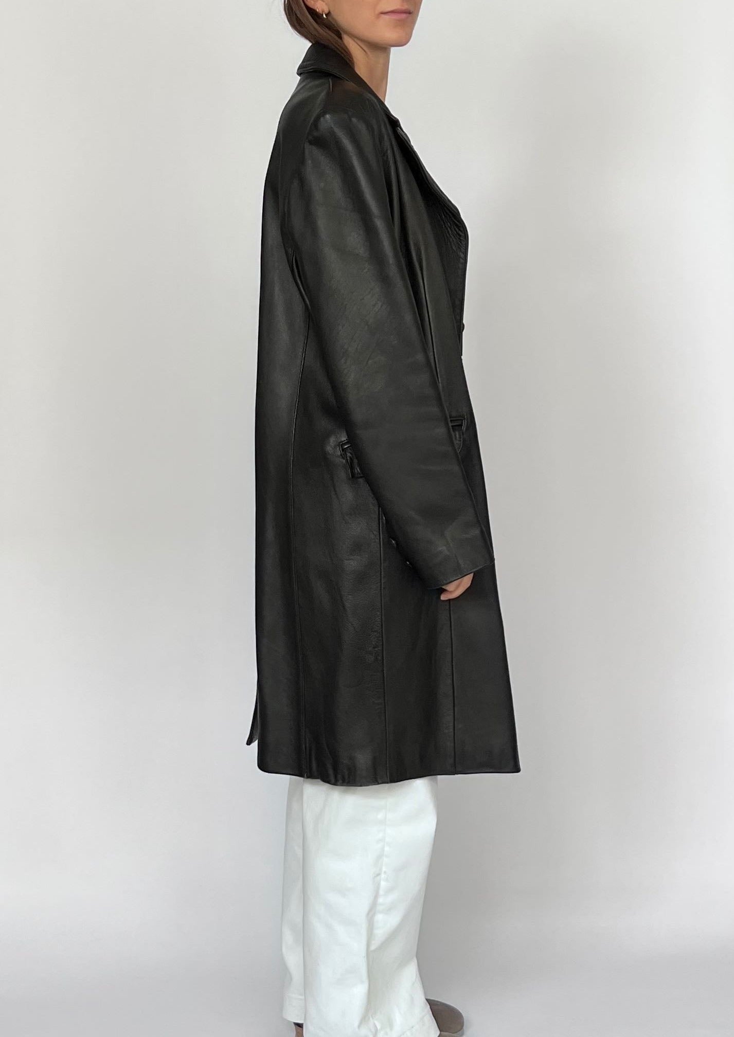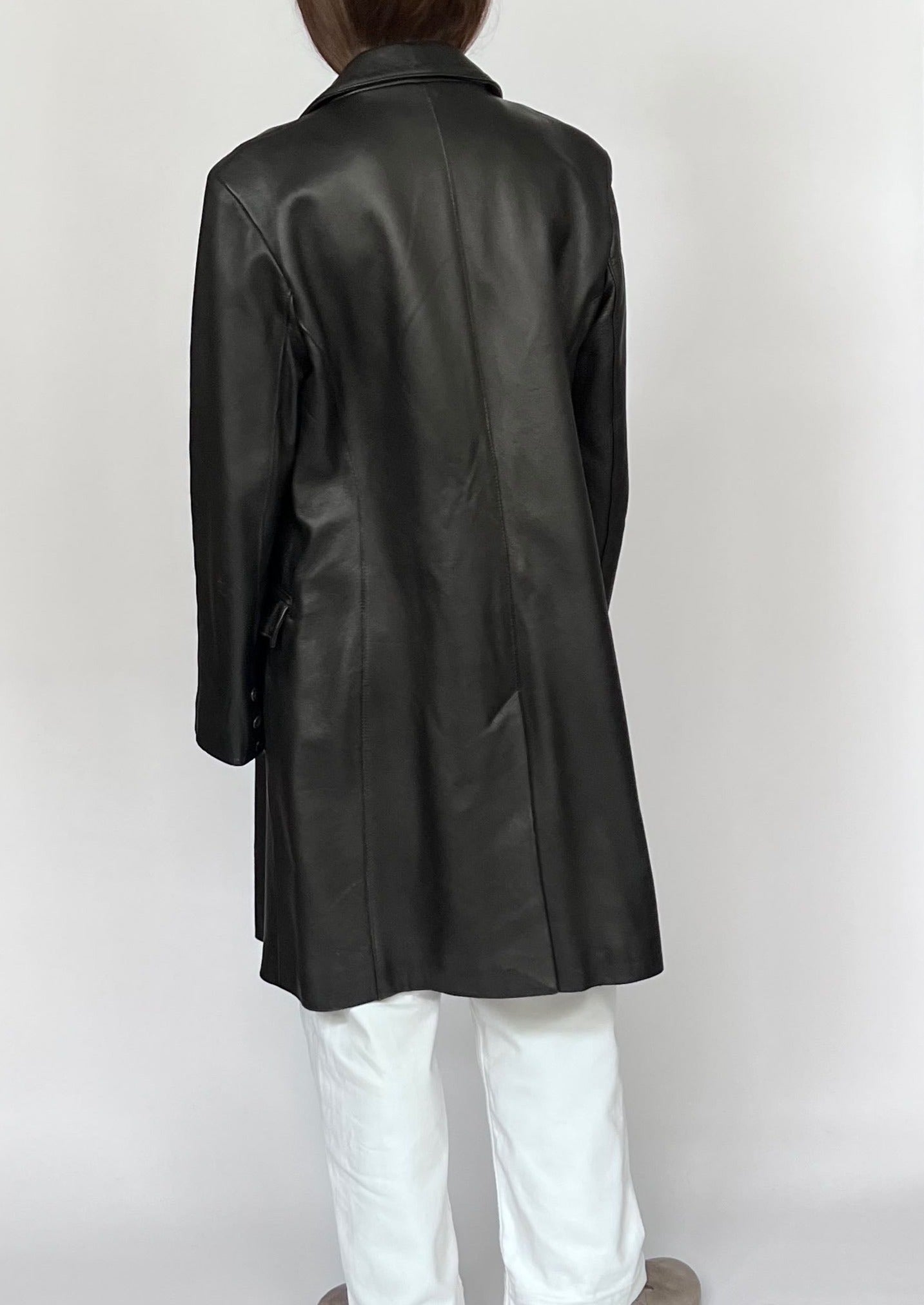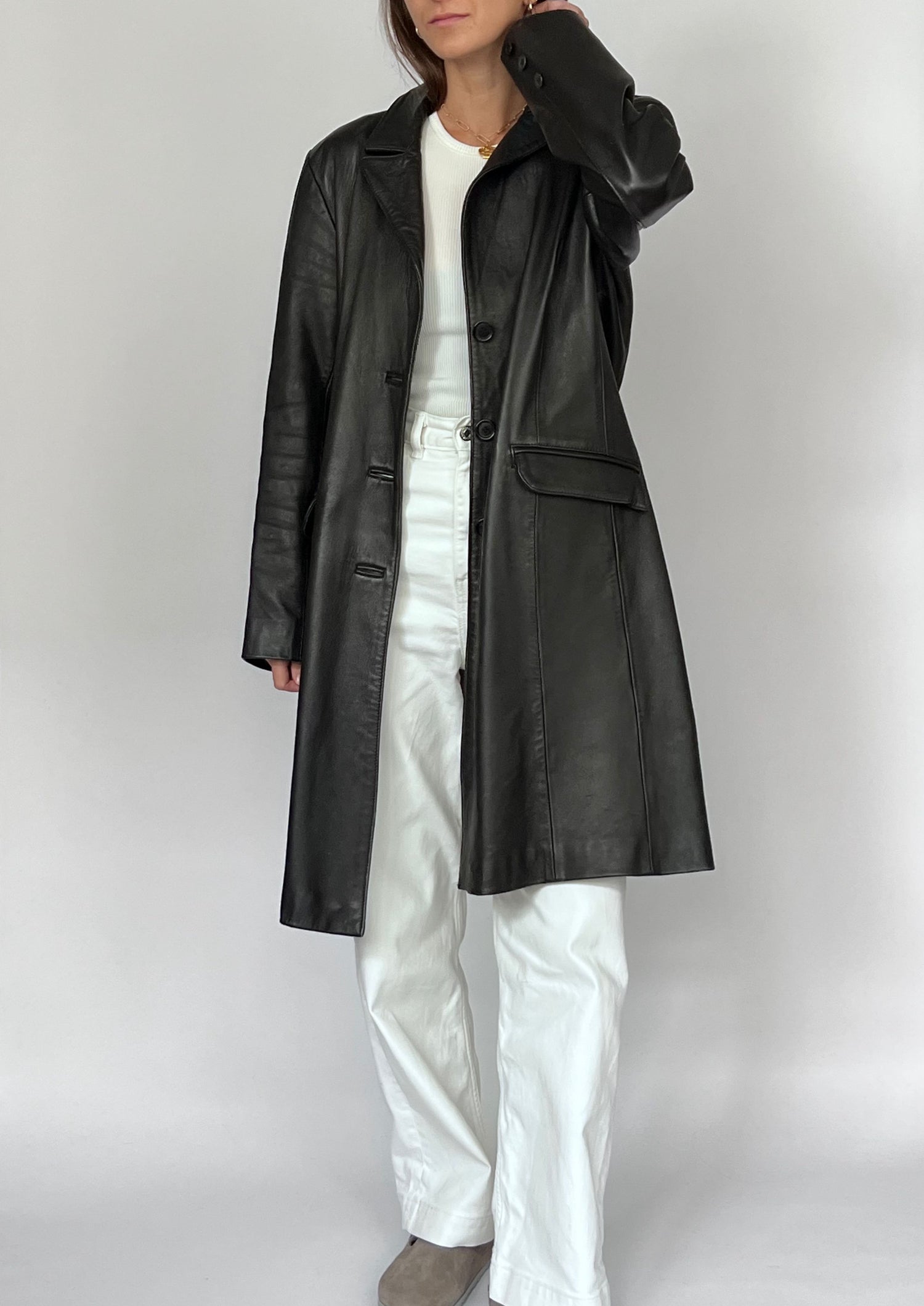 90s Black longline leather coat. Features two side pockets, a button fastening and fully lined.