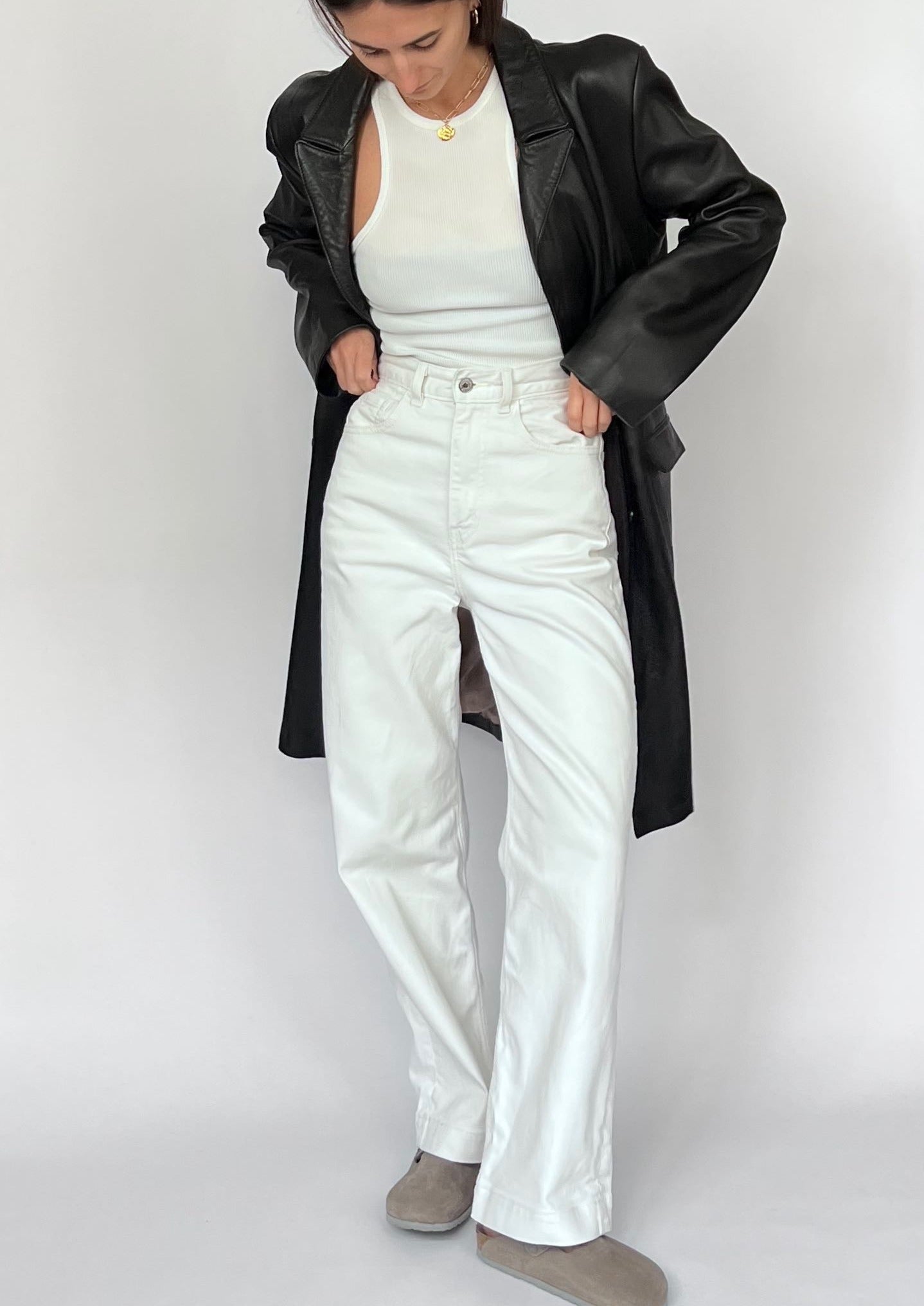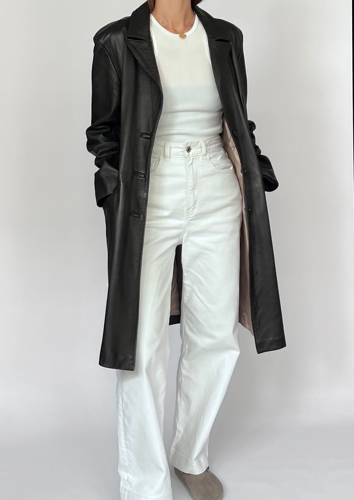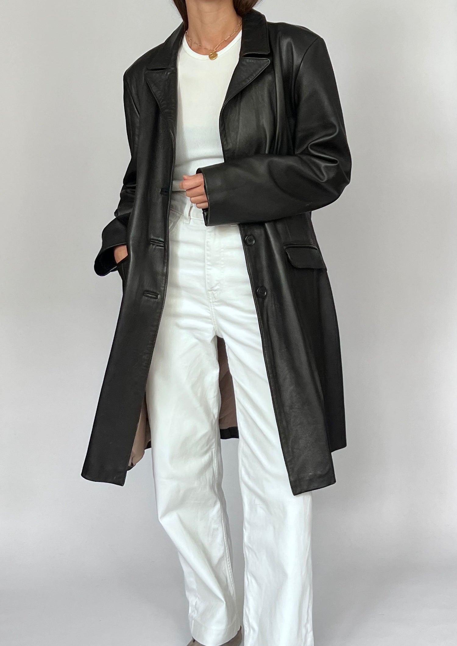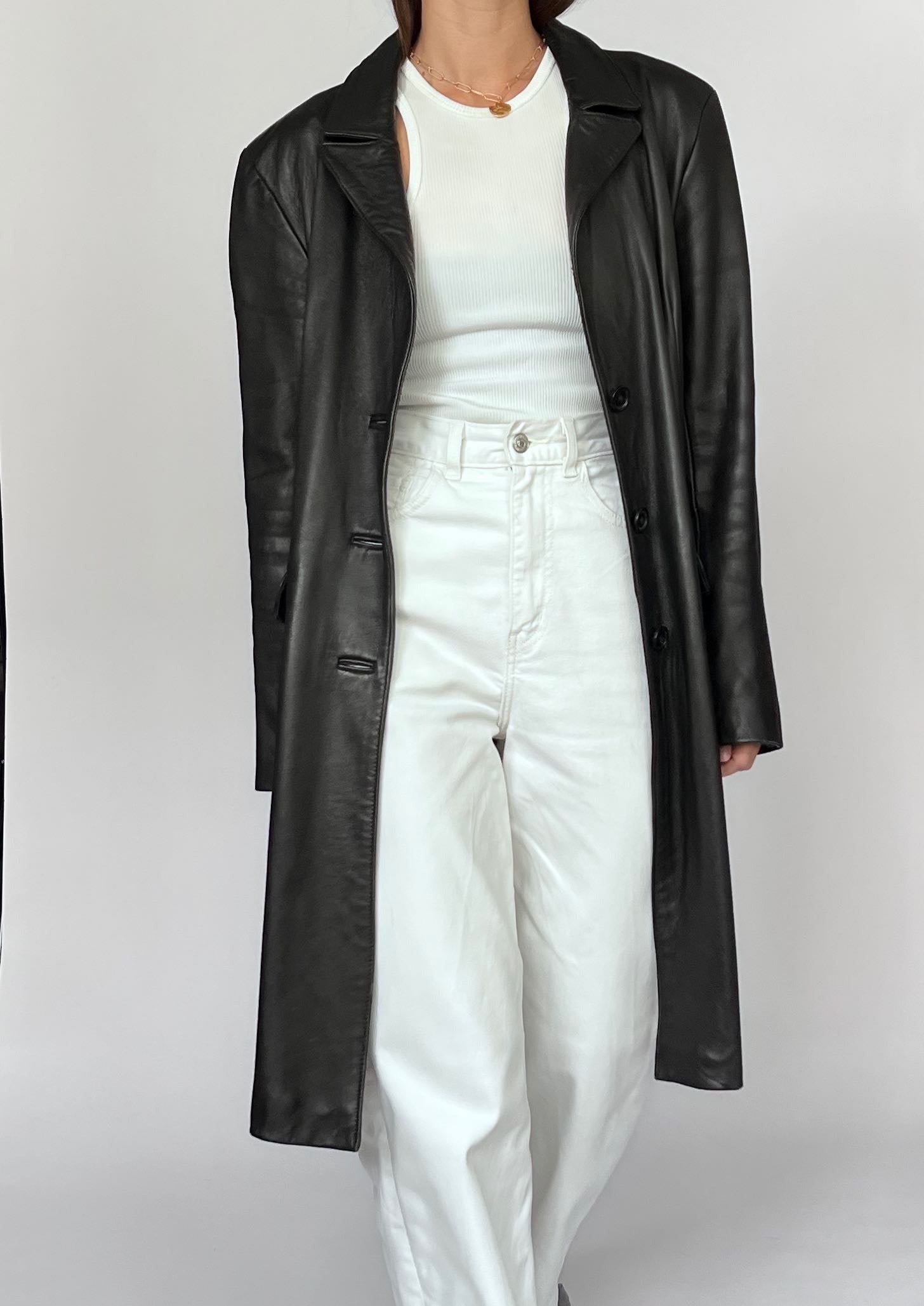 90s Black longline leather coat. Features two side pockets, a button fastening and fully lined.