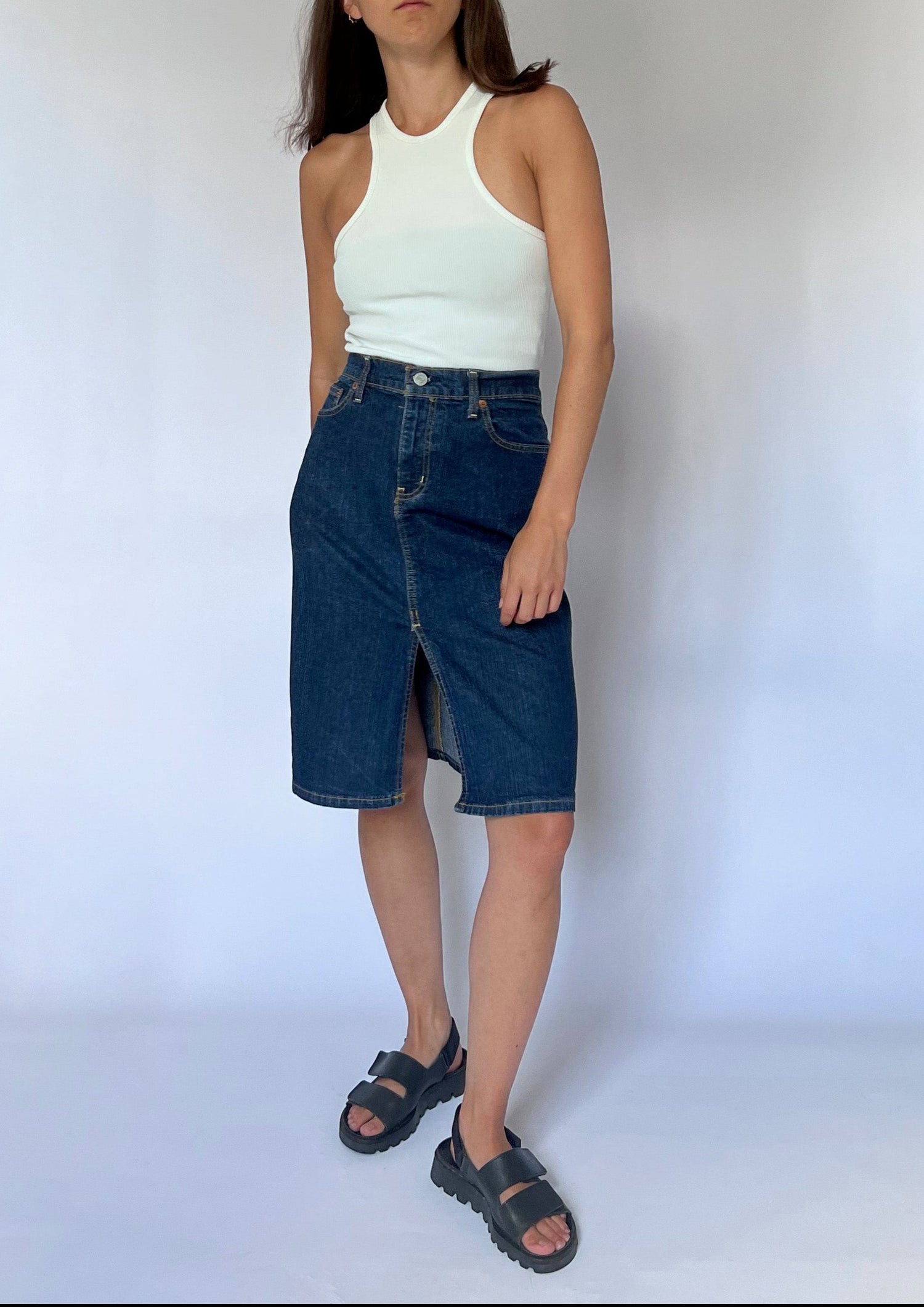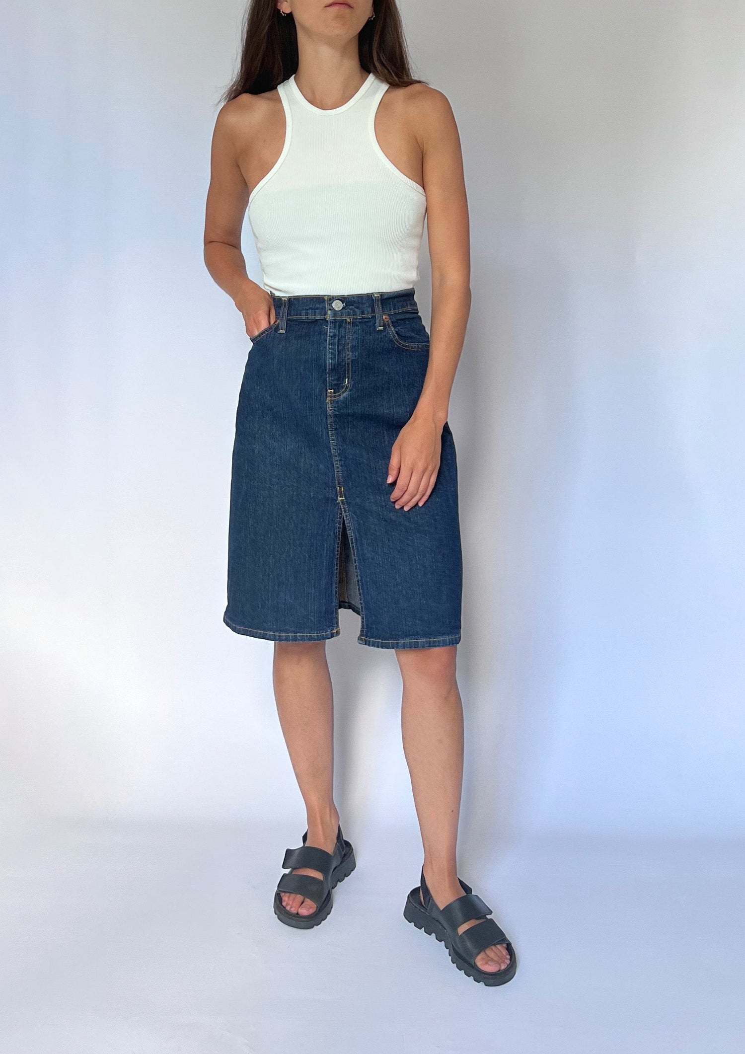 Vintage 90s denim skirt. Features a fly to fasten at the front, a deep centre front split and contrast stitching. Two pockets for essentials