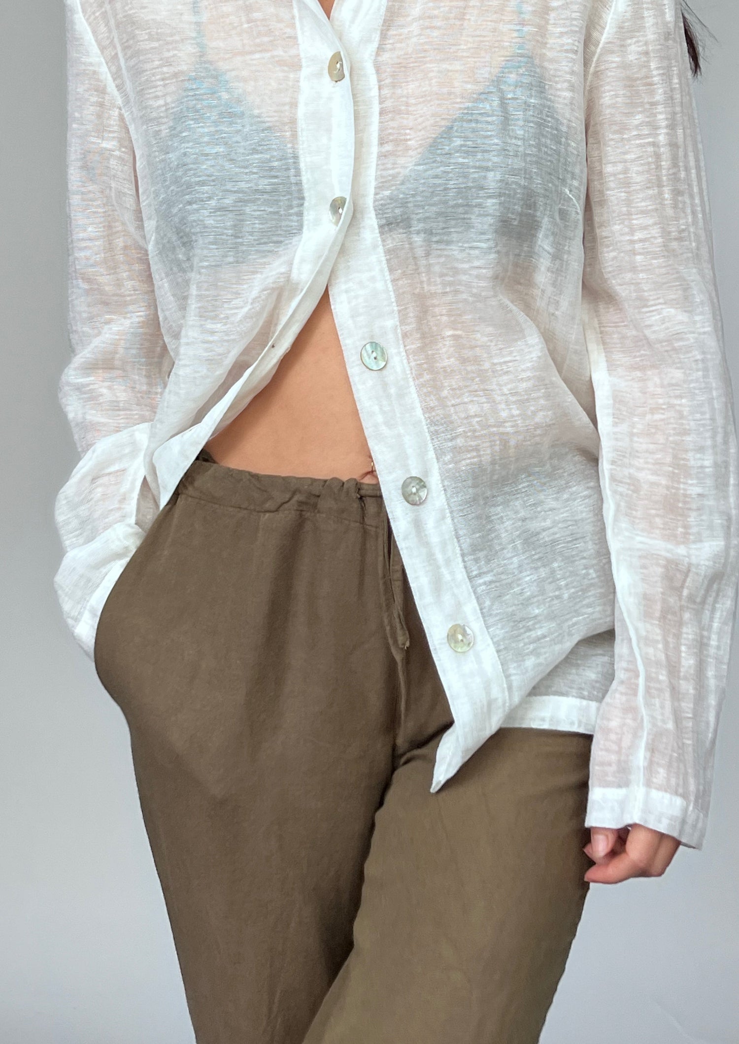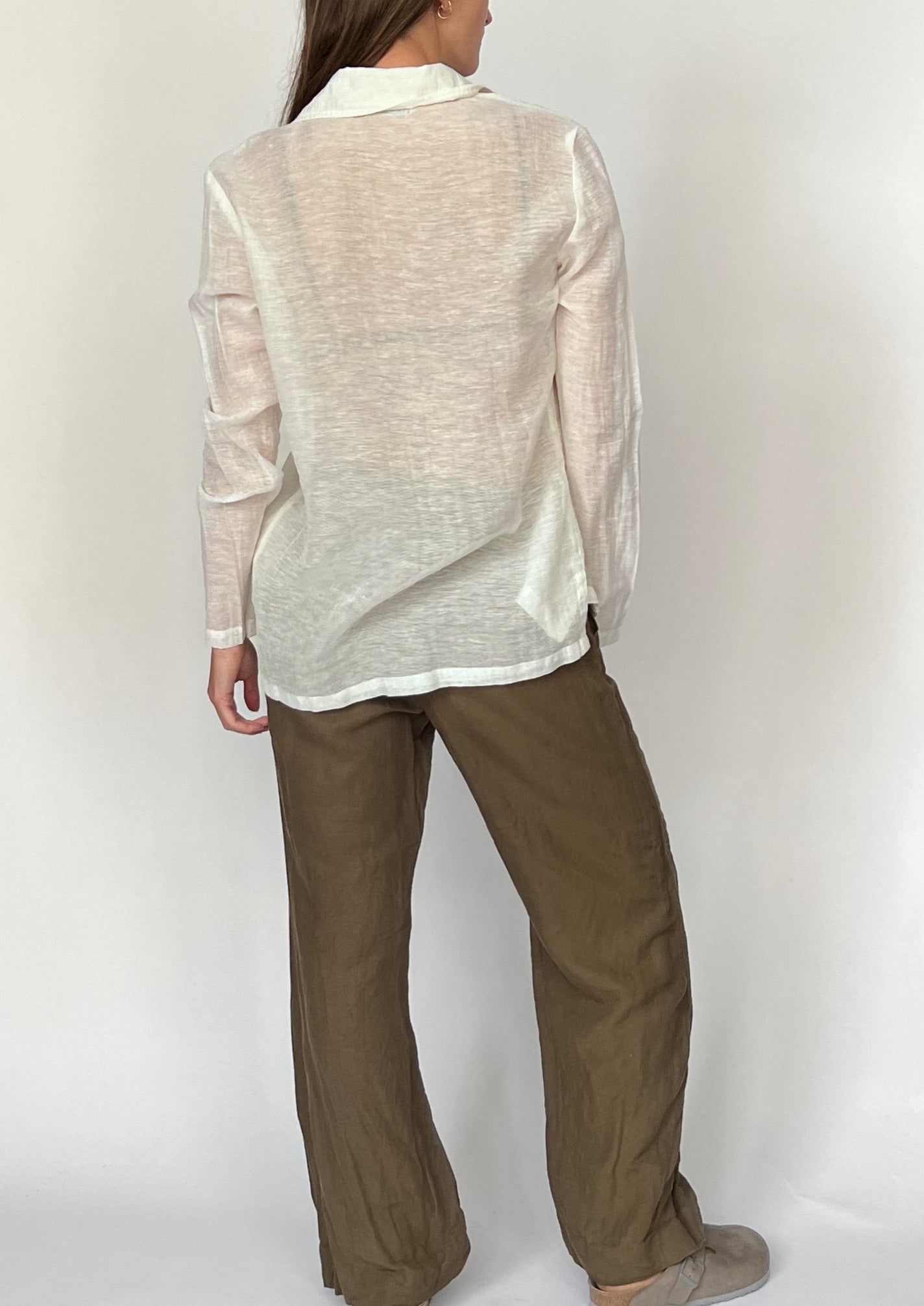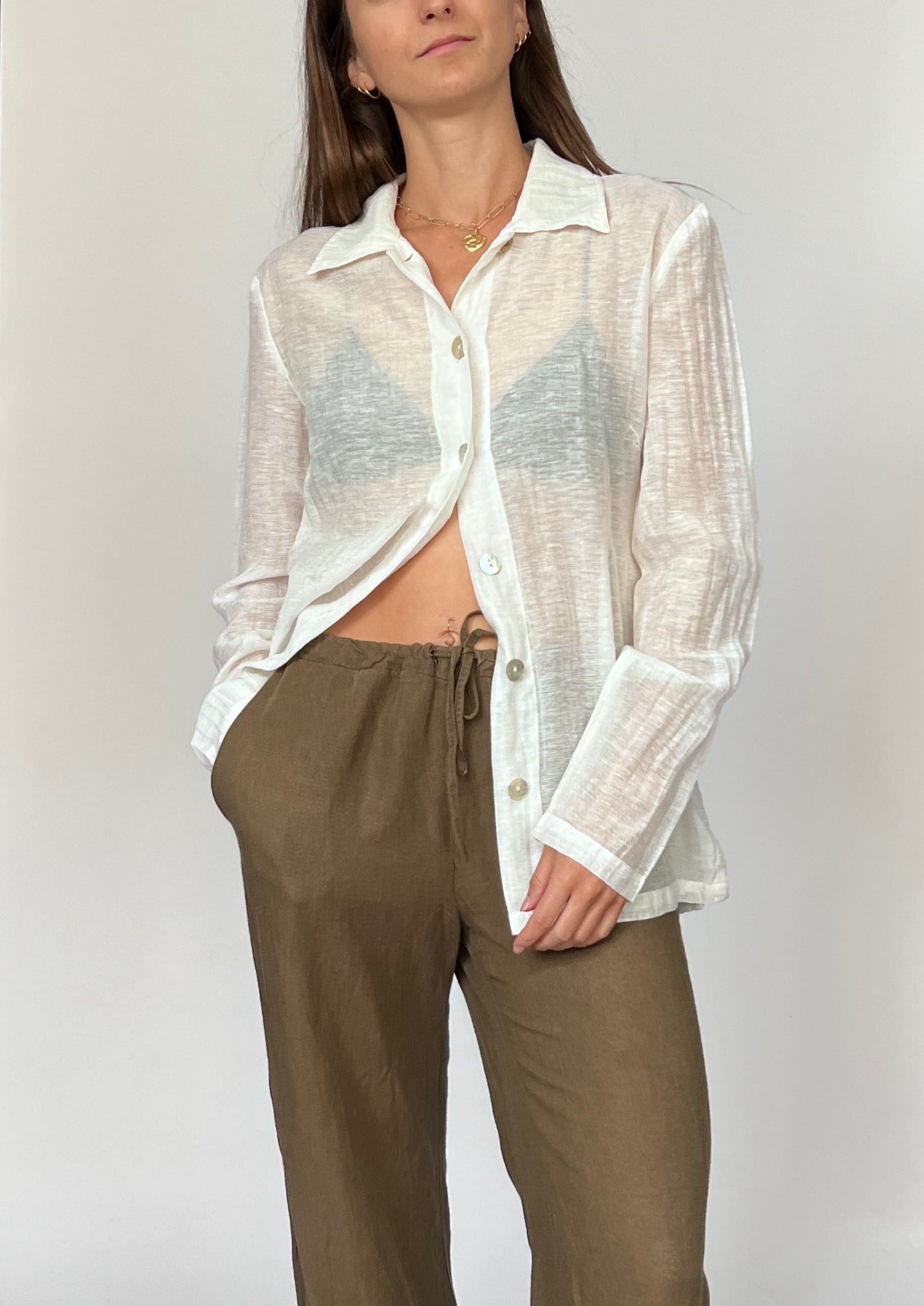 90s white sheer shirt. Features side splits, shell button fastening and long slim sleeves. Has a very slightly sheen to the fabric.