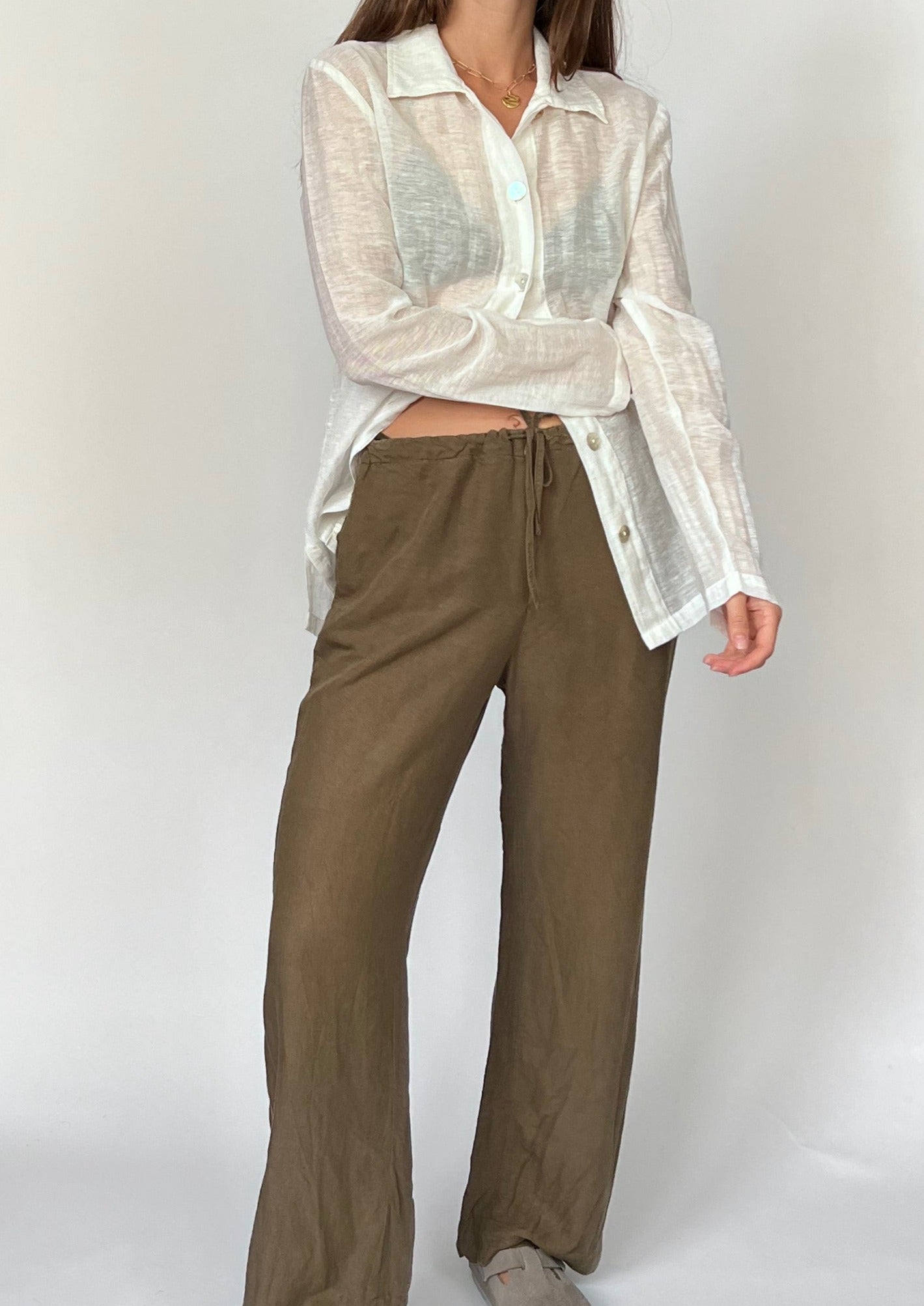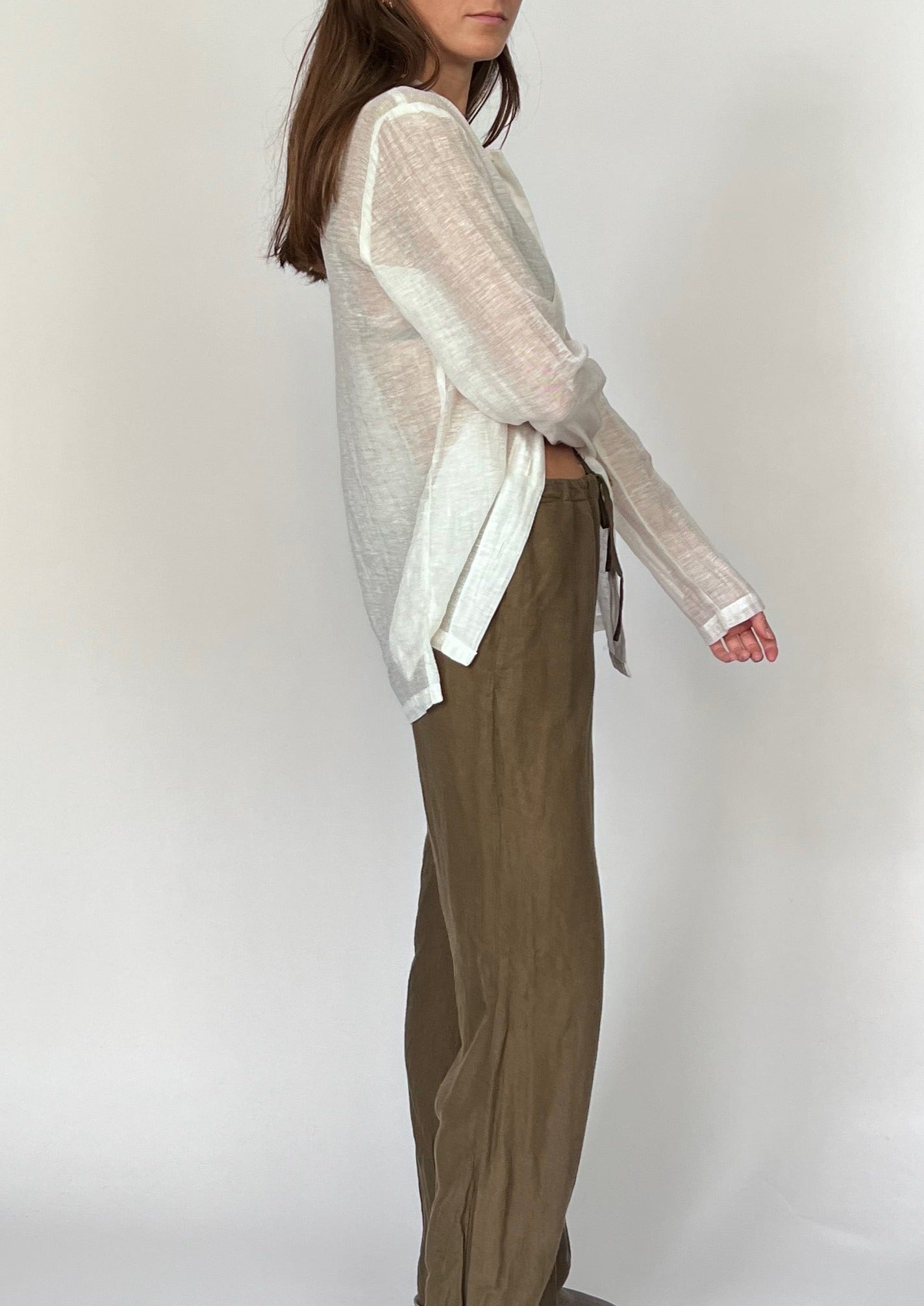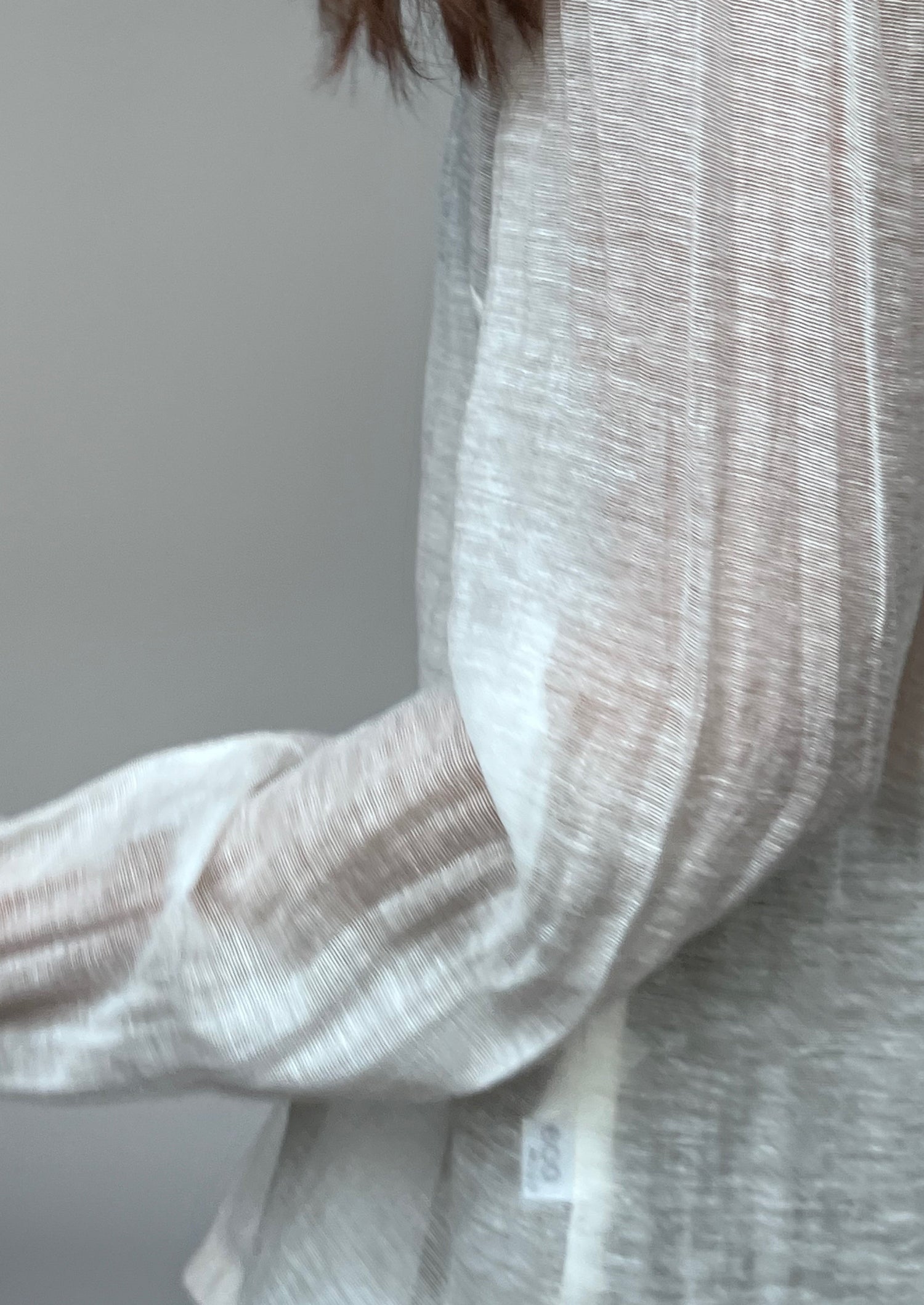 90s white sheer shirt. Features side splits, shell button fastening and long slim sleeves. Has a very slightly sheen to the fabric.