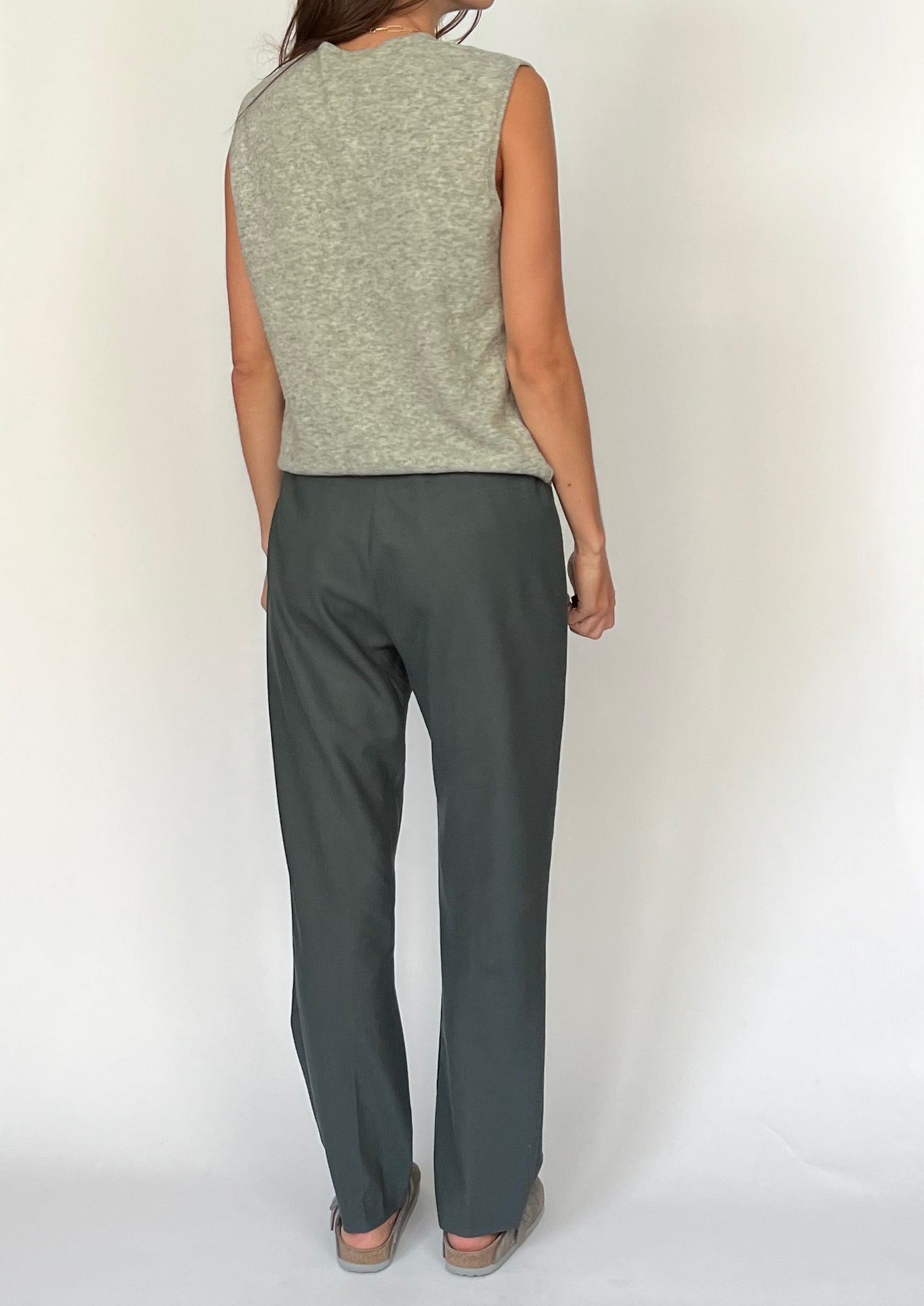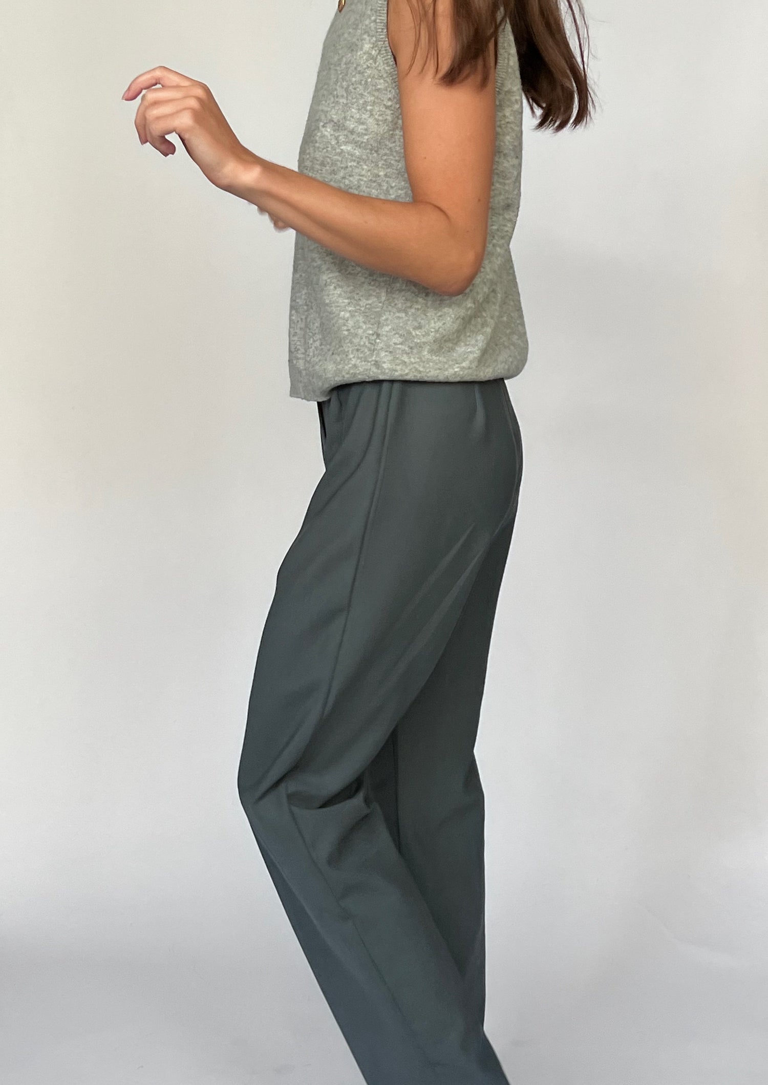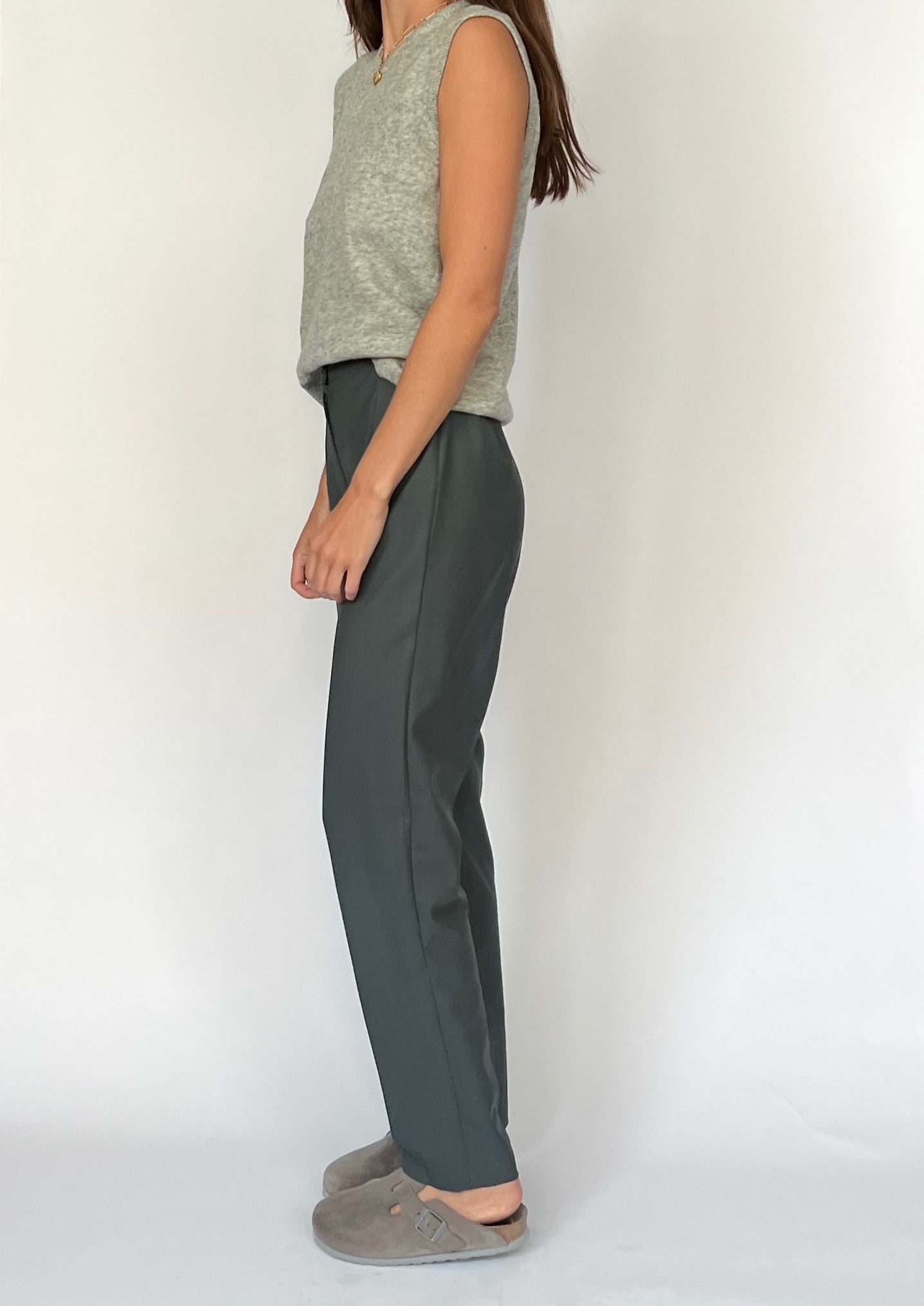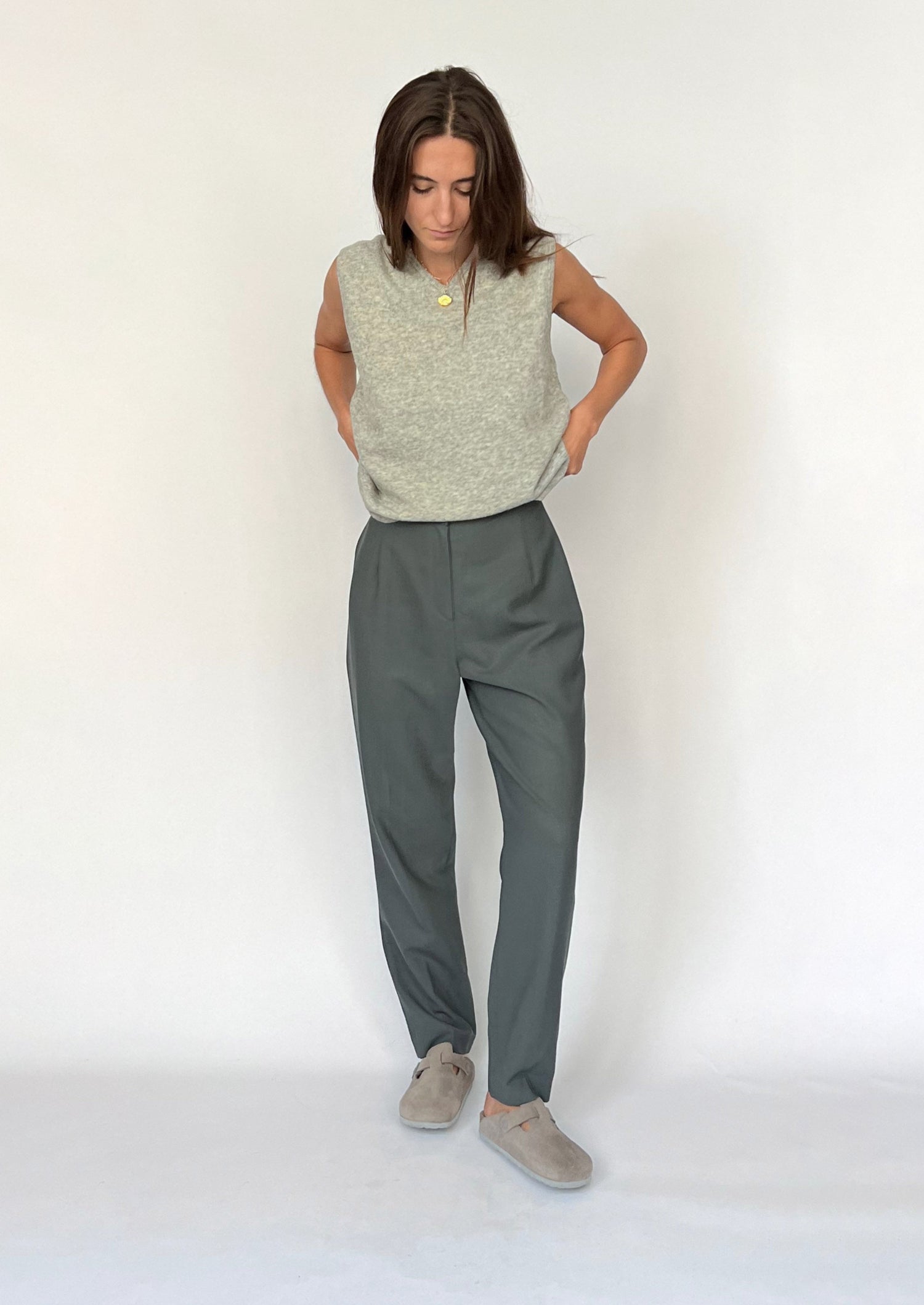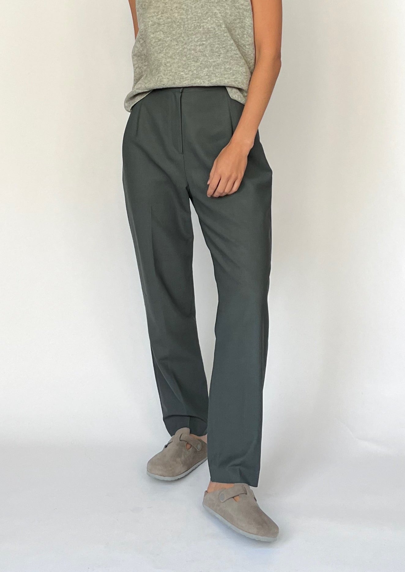 90s Grey tailored trousers. Features a softly tailored fold down the leg, a fly and button to fasten and a straight leg. They are made from a technical very lightweight wool, so they are a great soft trouser.