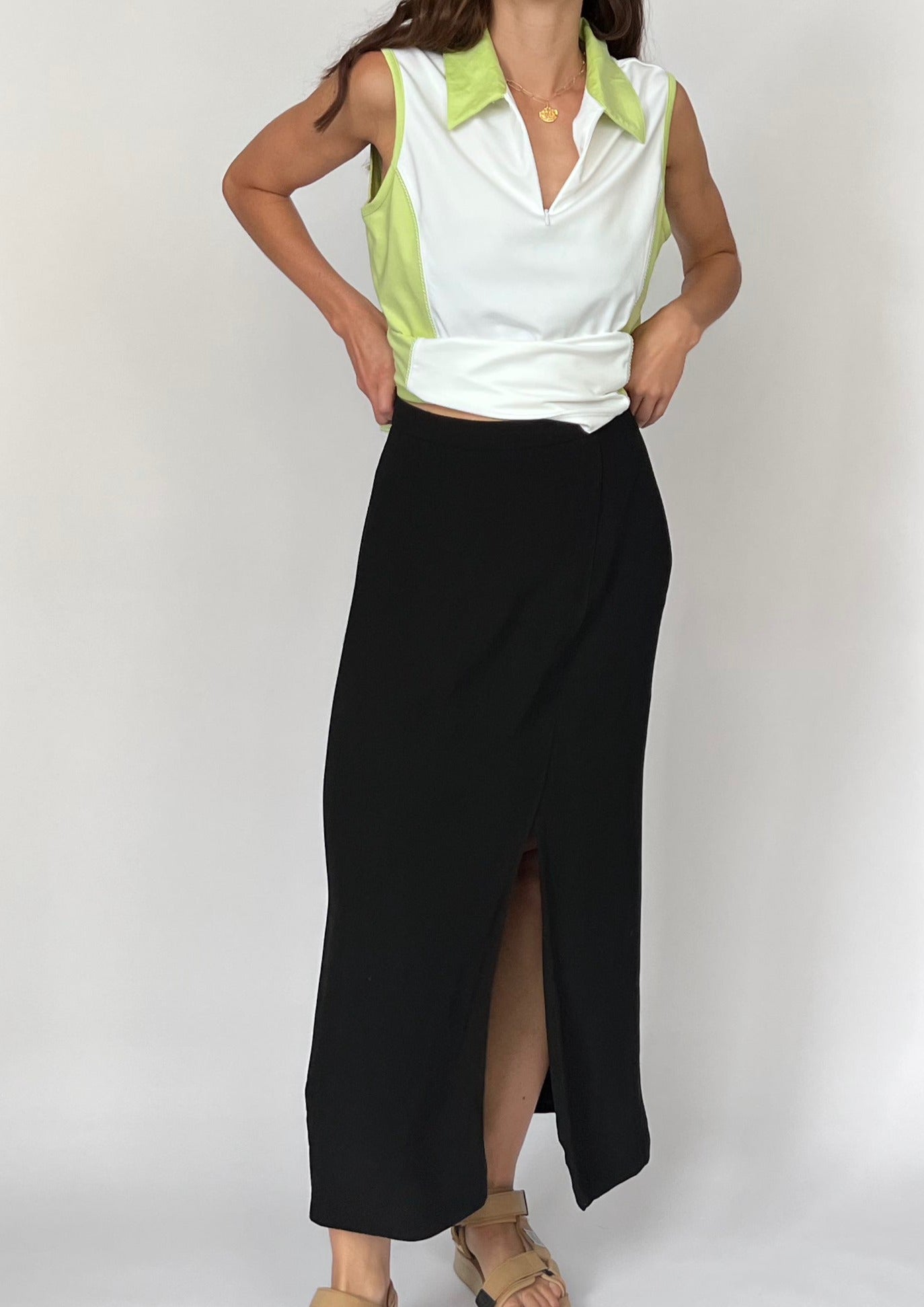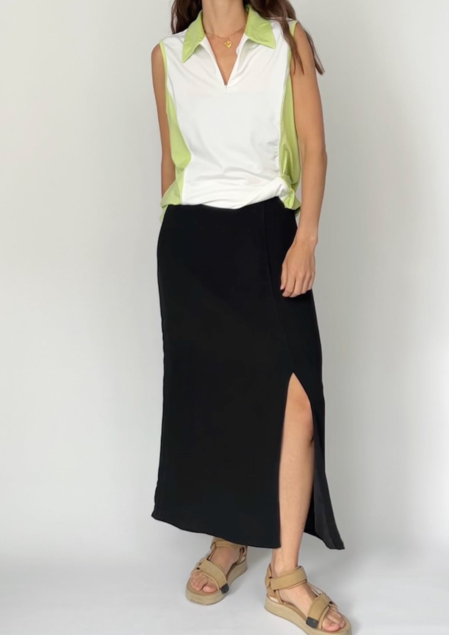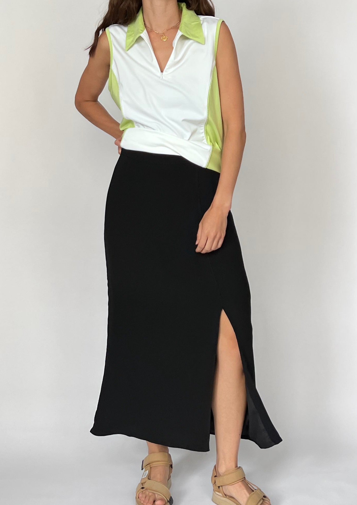 90s Tennis top made by Greg Norman. In white jersey with lime green panelling with an amazing white contrast stitch detailing. Features a zip neck fastening and collar