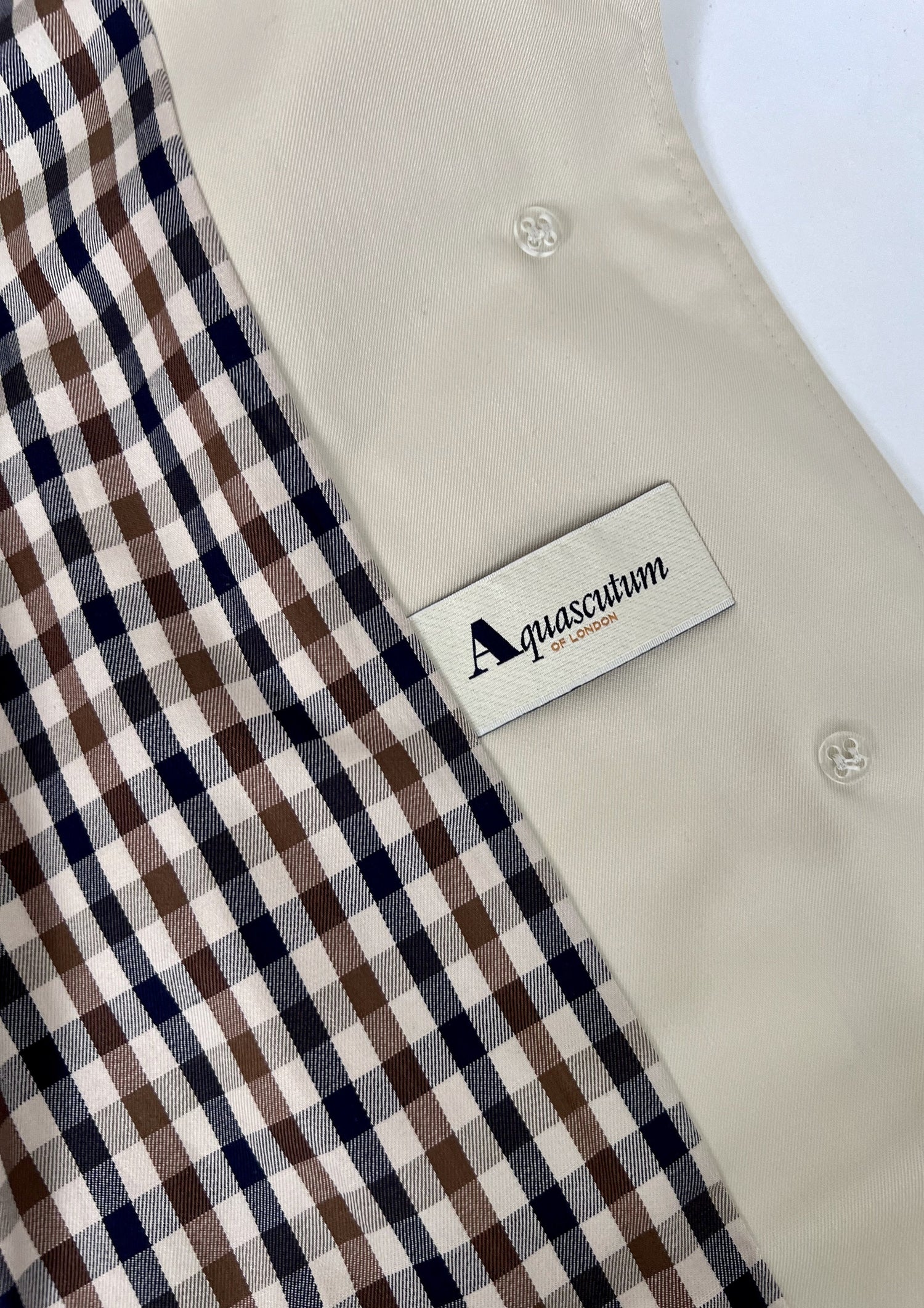 Made in England, sourced in the UK, made by Aquascutum. Excellent condition. 65% Polyester, 35% Cotton