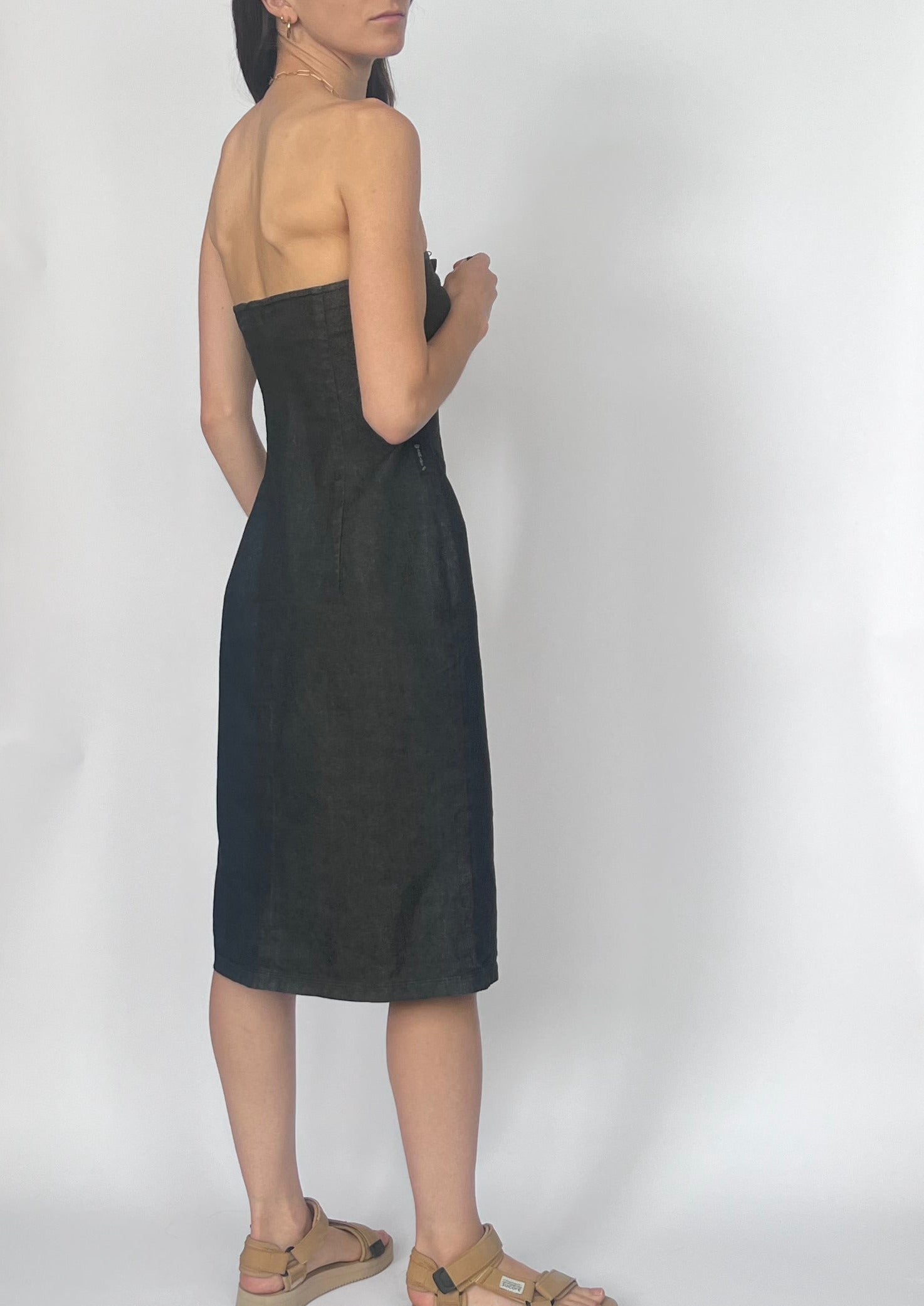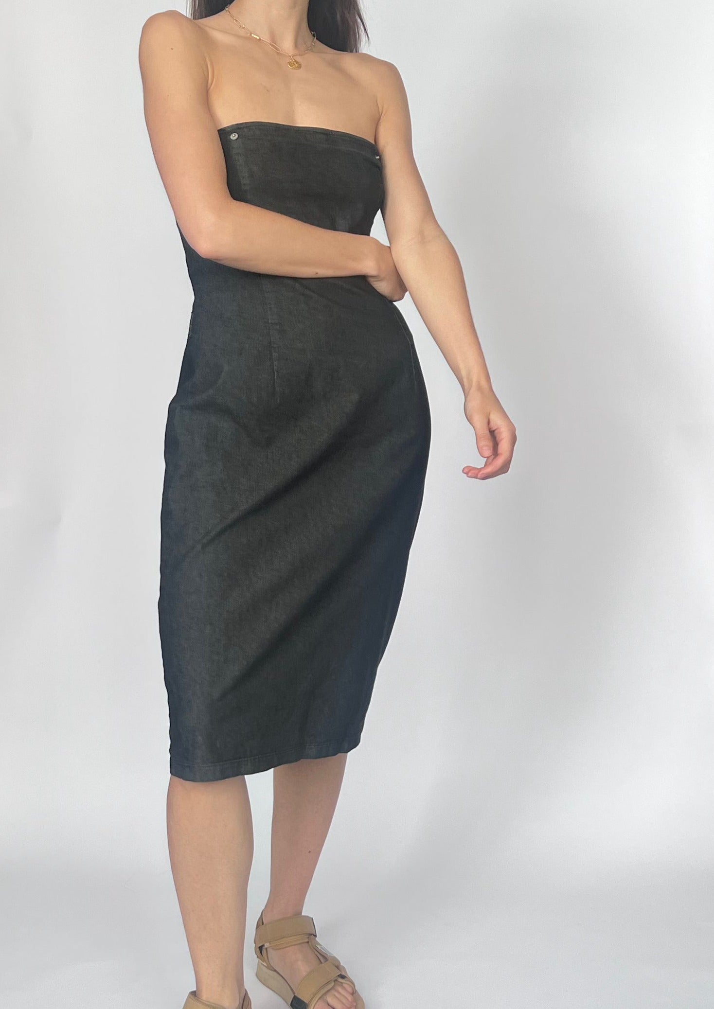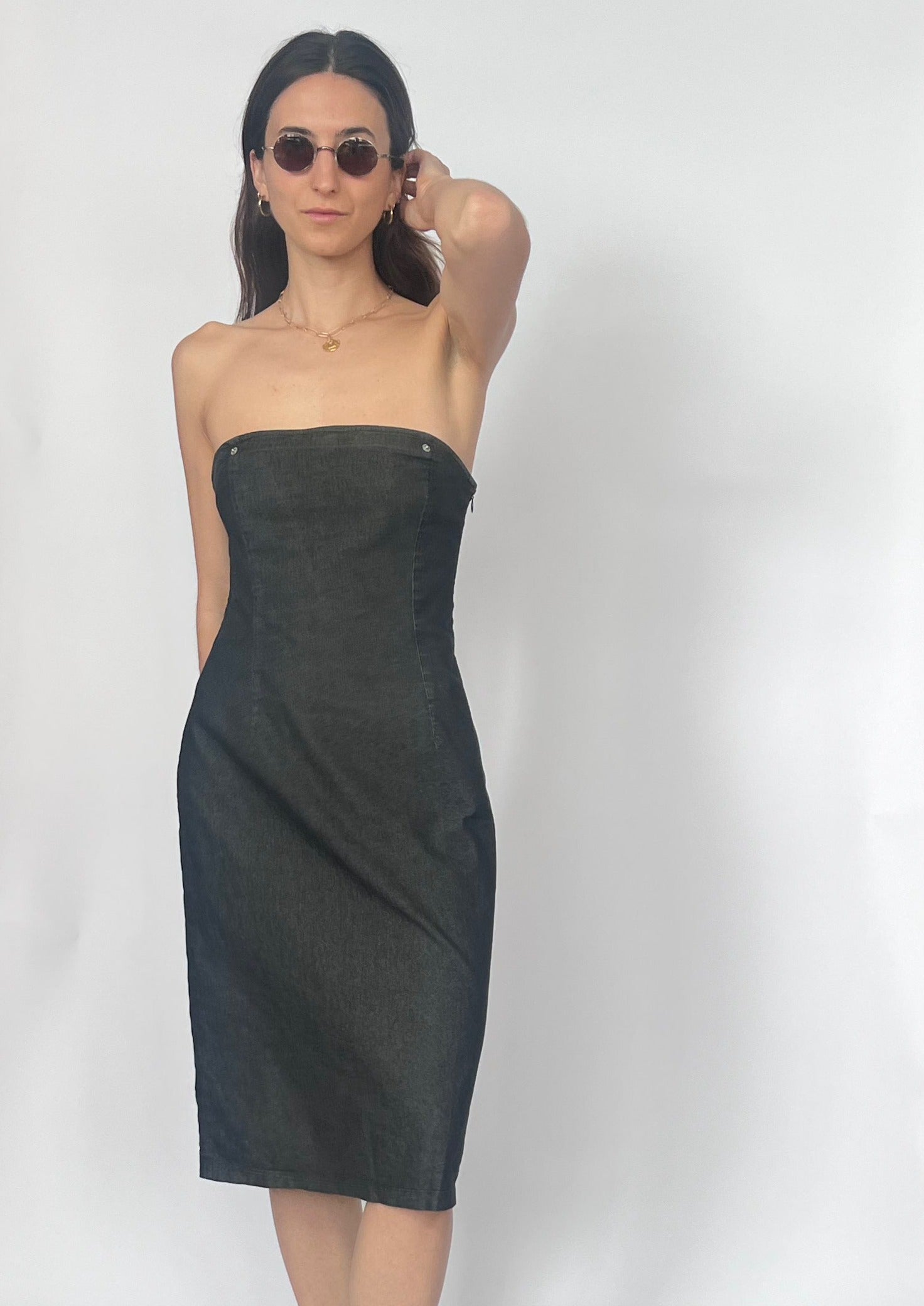 Vintage 90s Armani Jeans dress. Features a bandeau neckline, lightweight denim and fitted shape with a side zip.