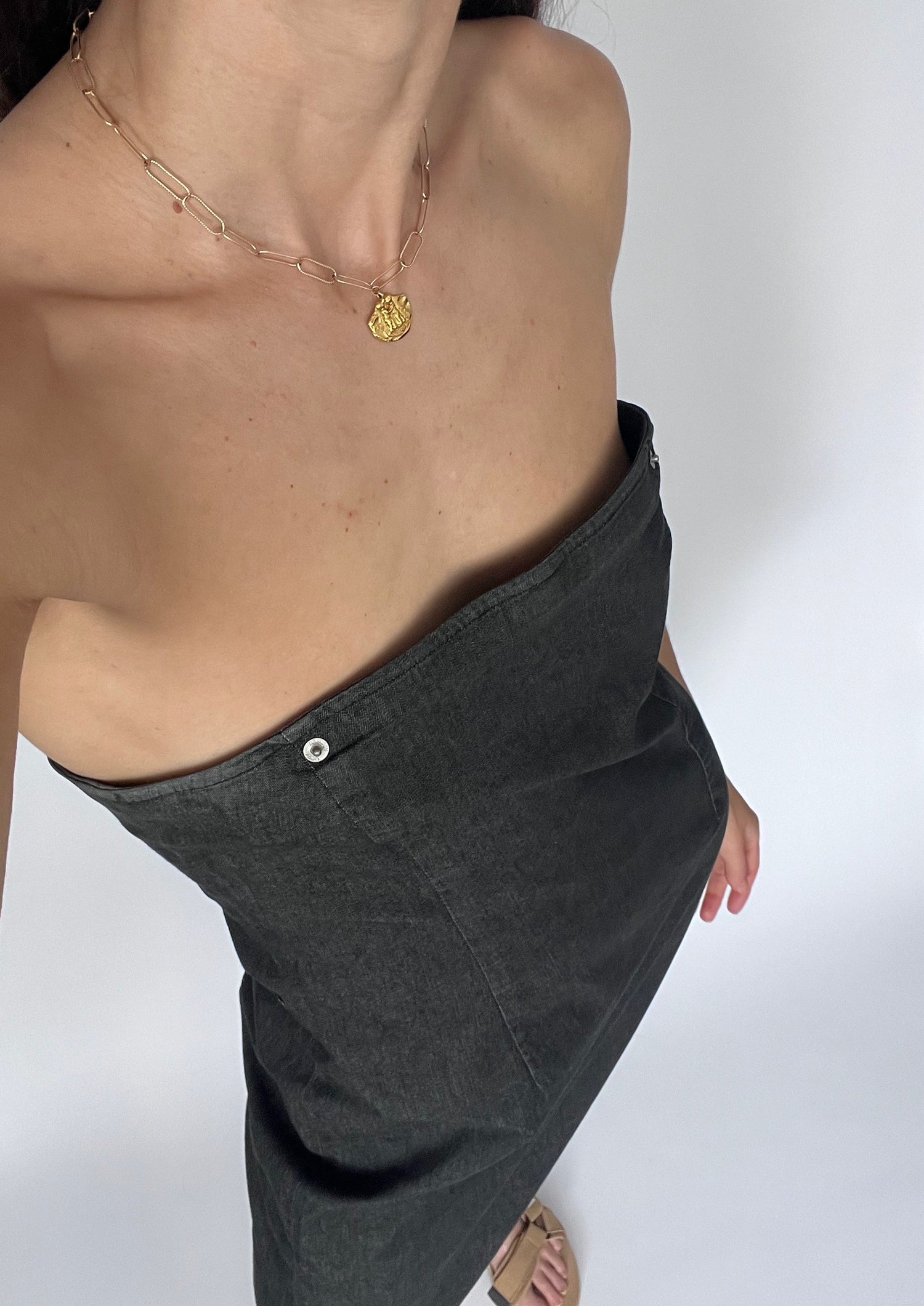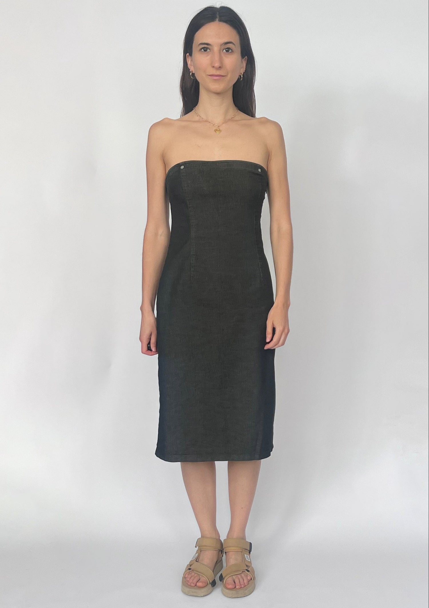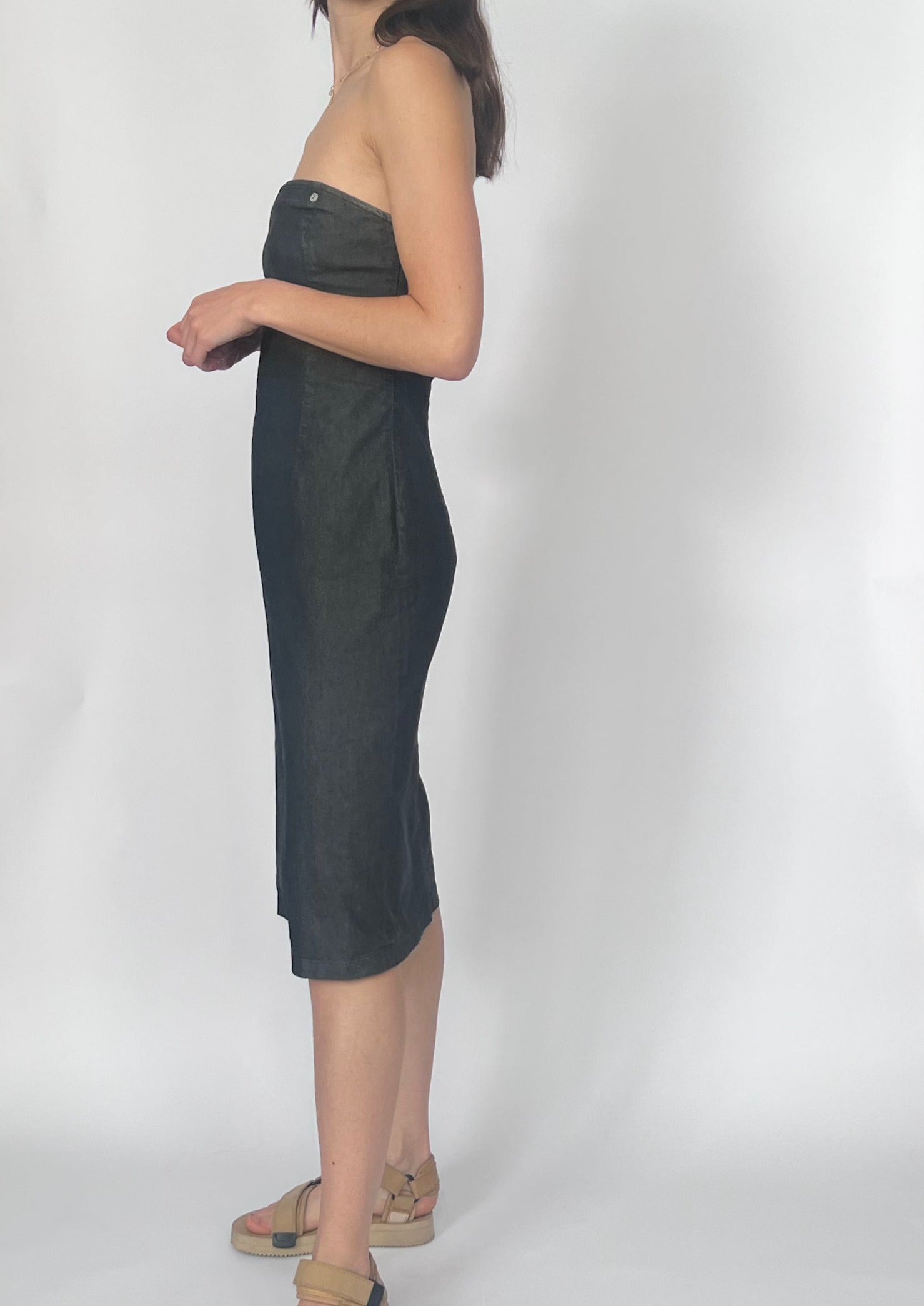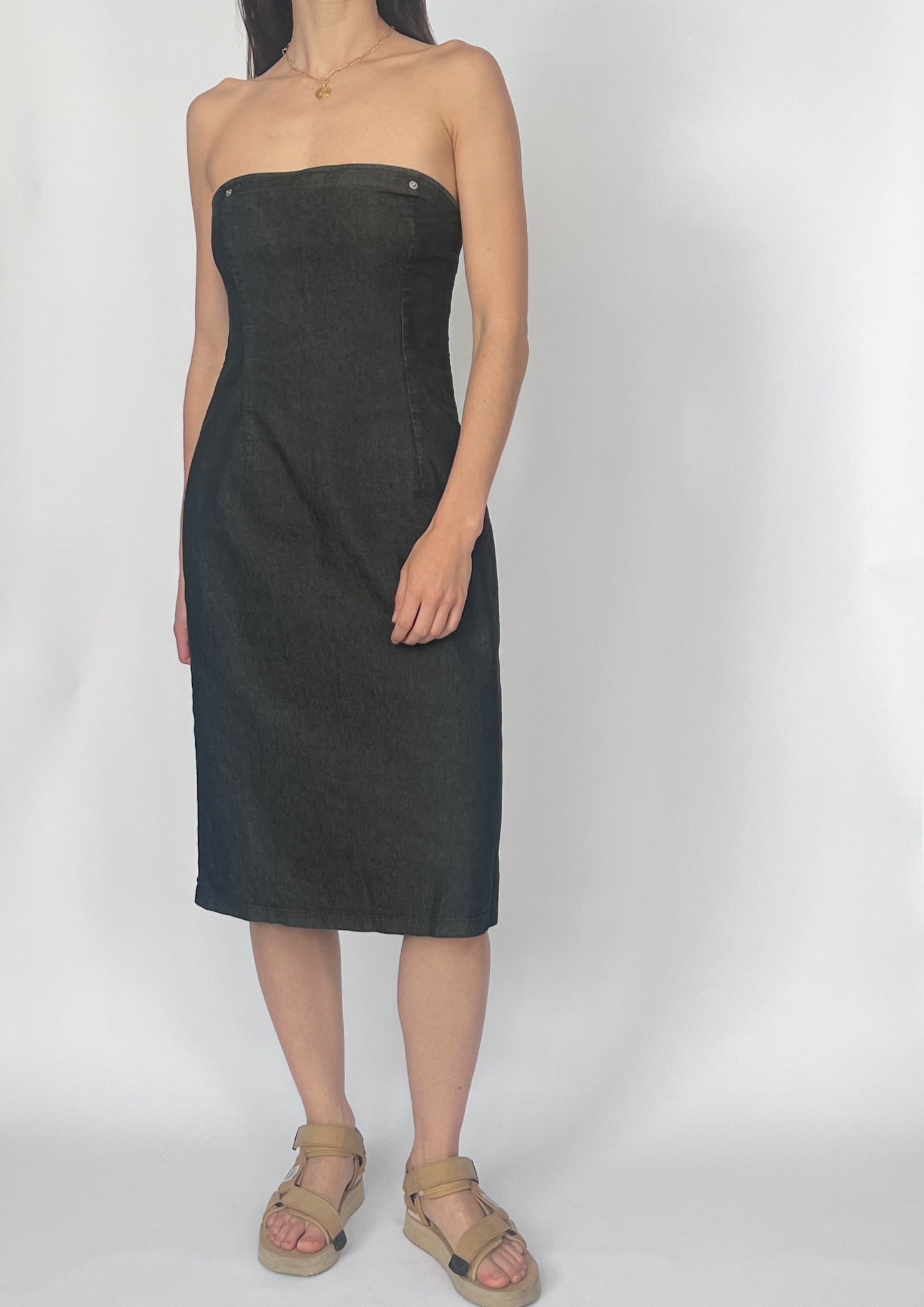 Vintage 90s Armani Jeans dress. Features a bandeau neckline, lightweight denim and fitted shape with a side zip.