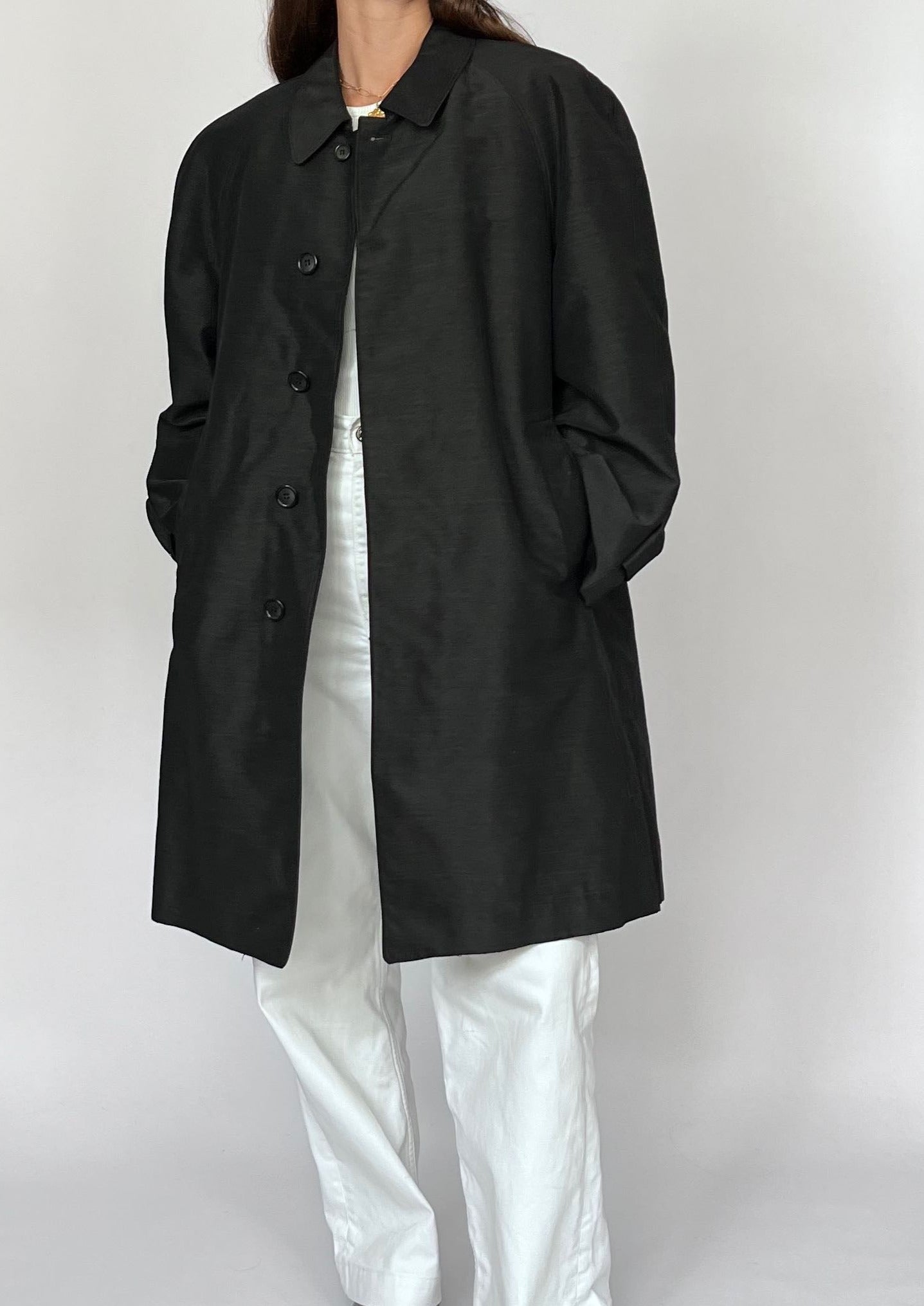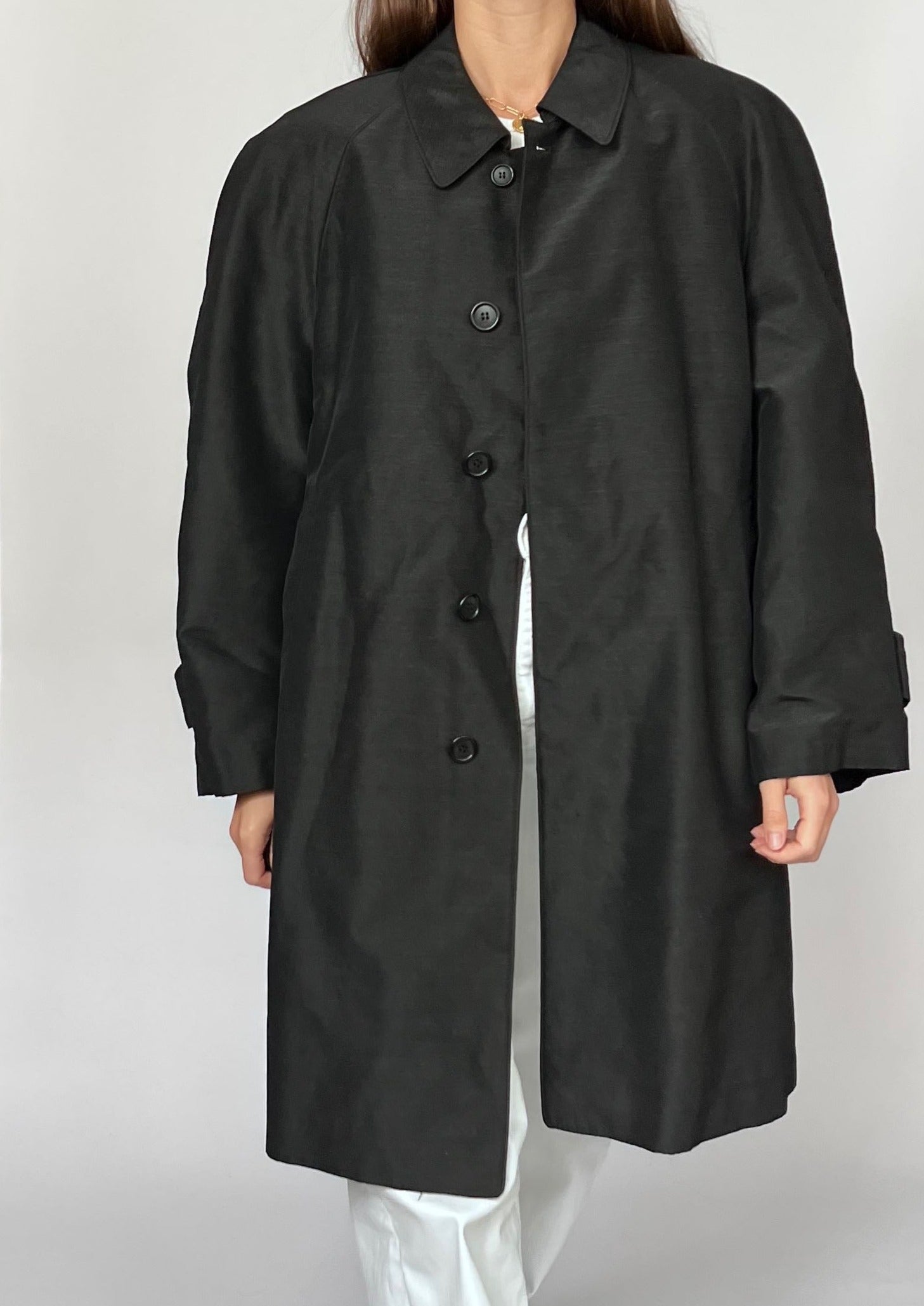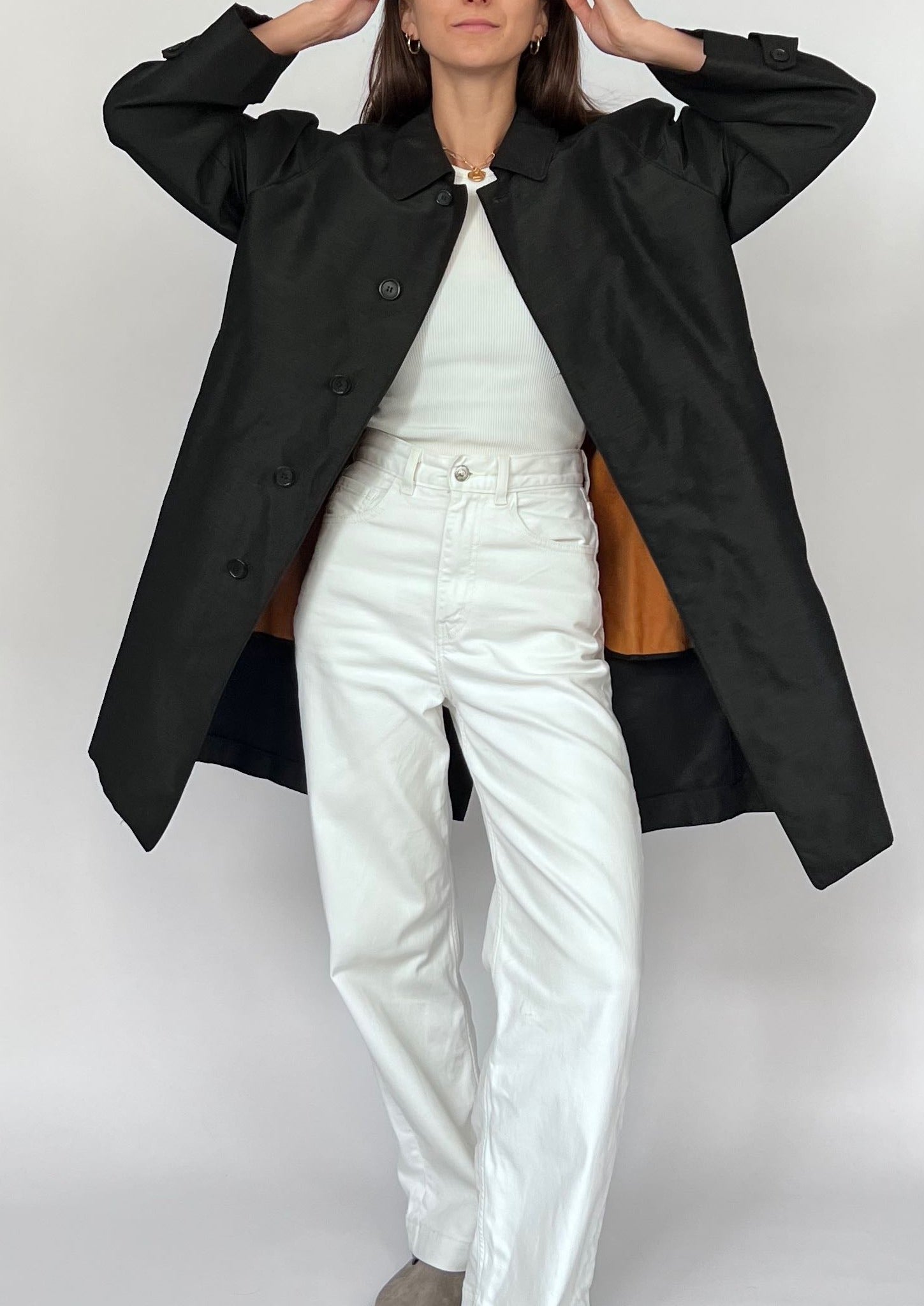 90s Black trench coat (car coat styling). Features two side pockets, a button fastening, fully lined with a removable insulated layer, and a clean cut.