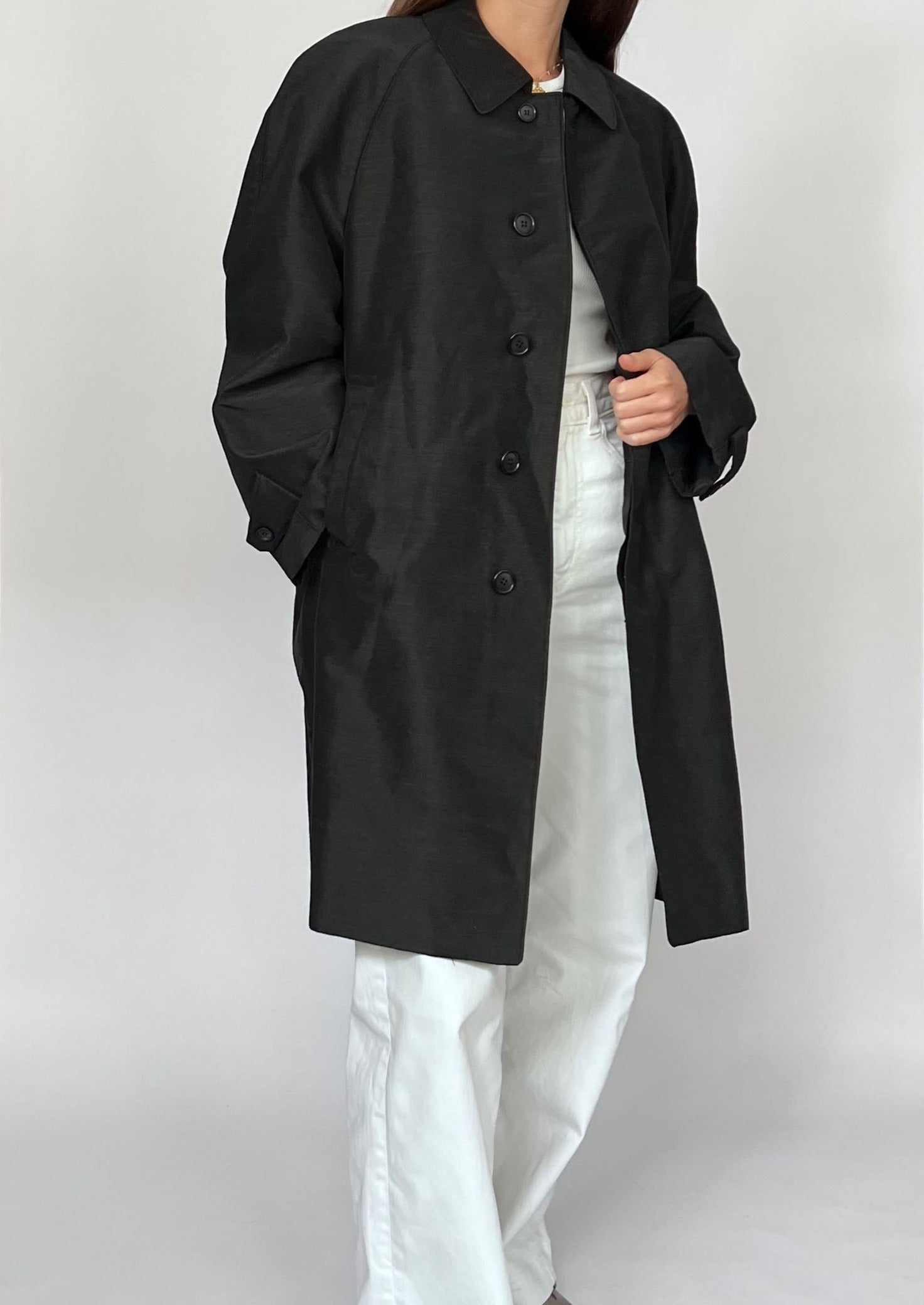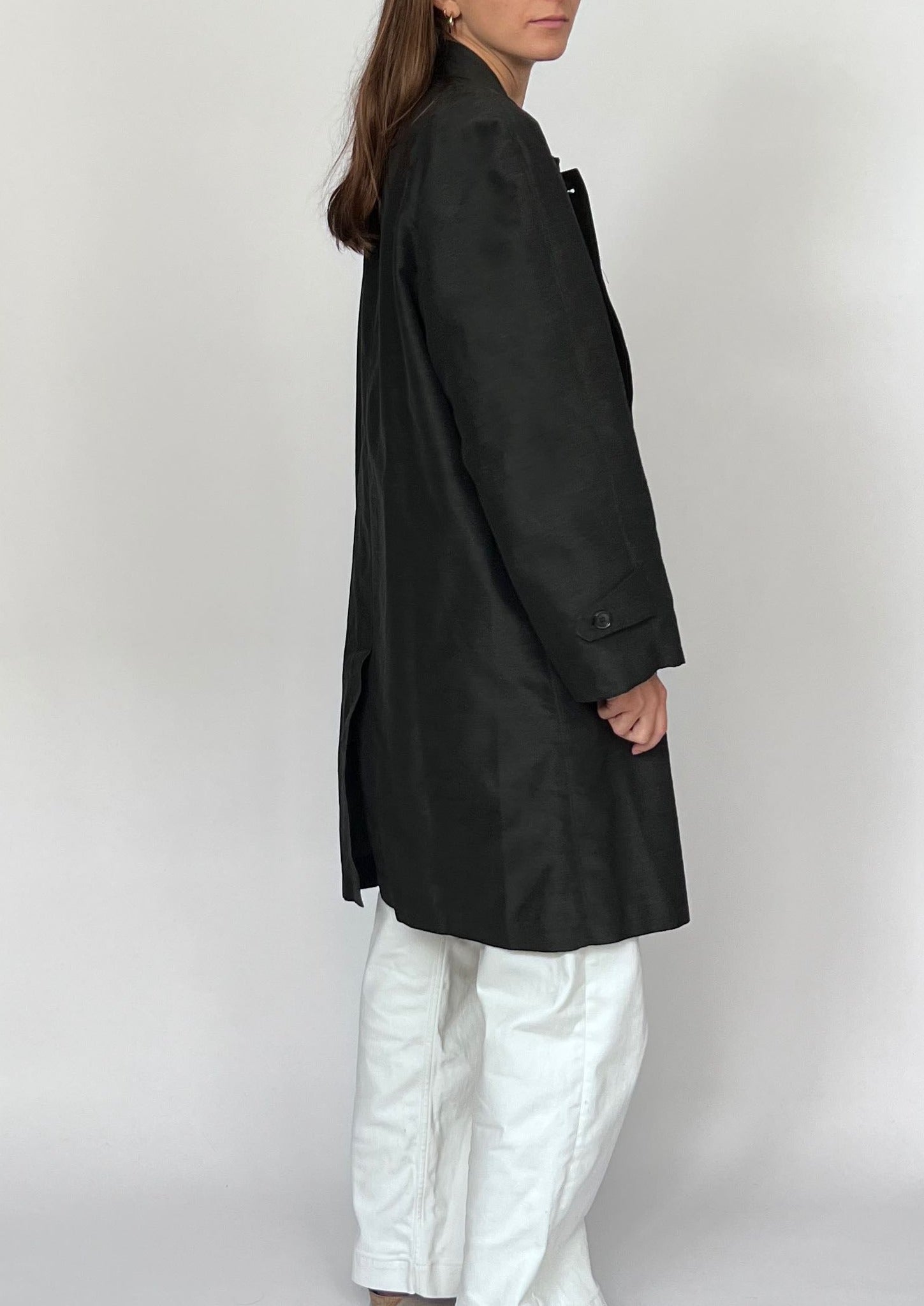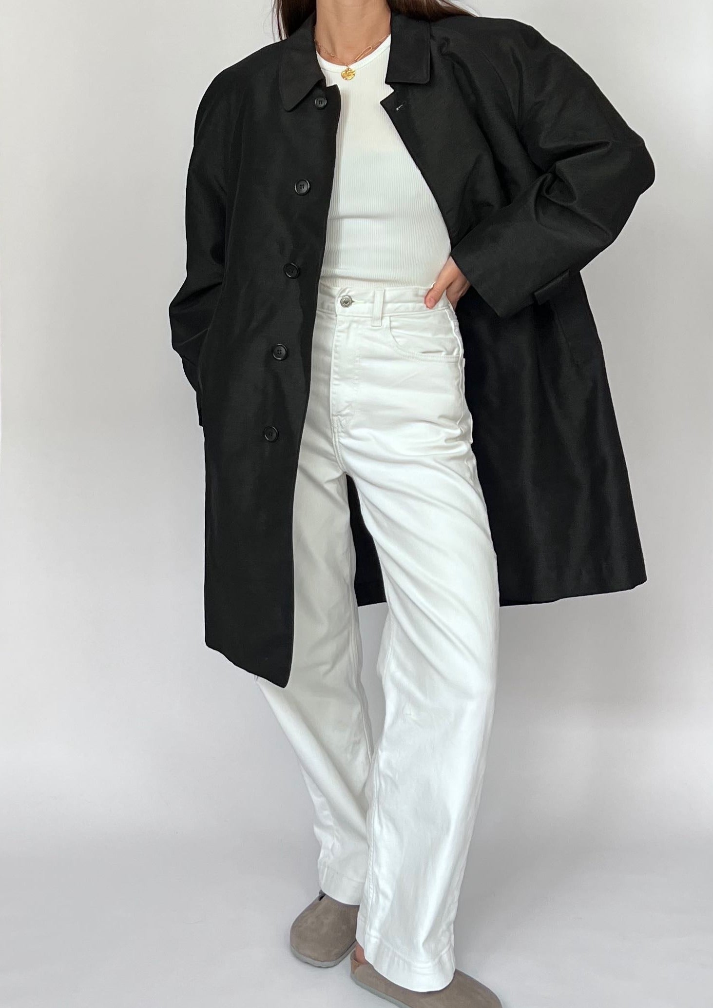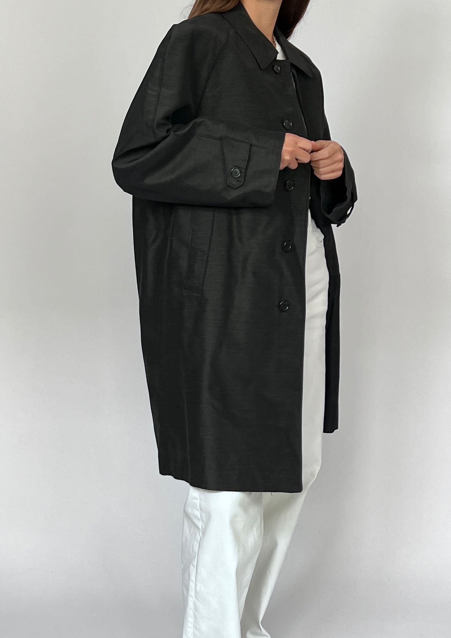 90s Black trench coat (car coat styling). Features two side pockets, a button fastening, fully lined with a removable insulated layer, and a clean cut.