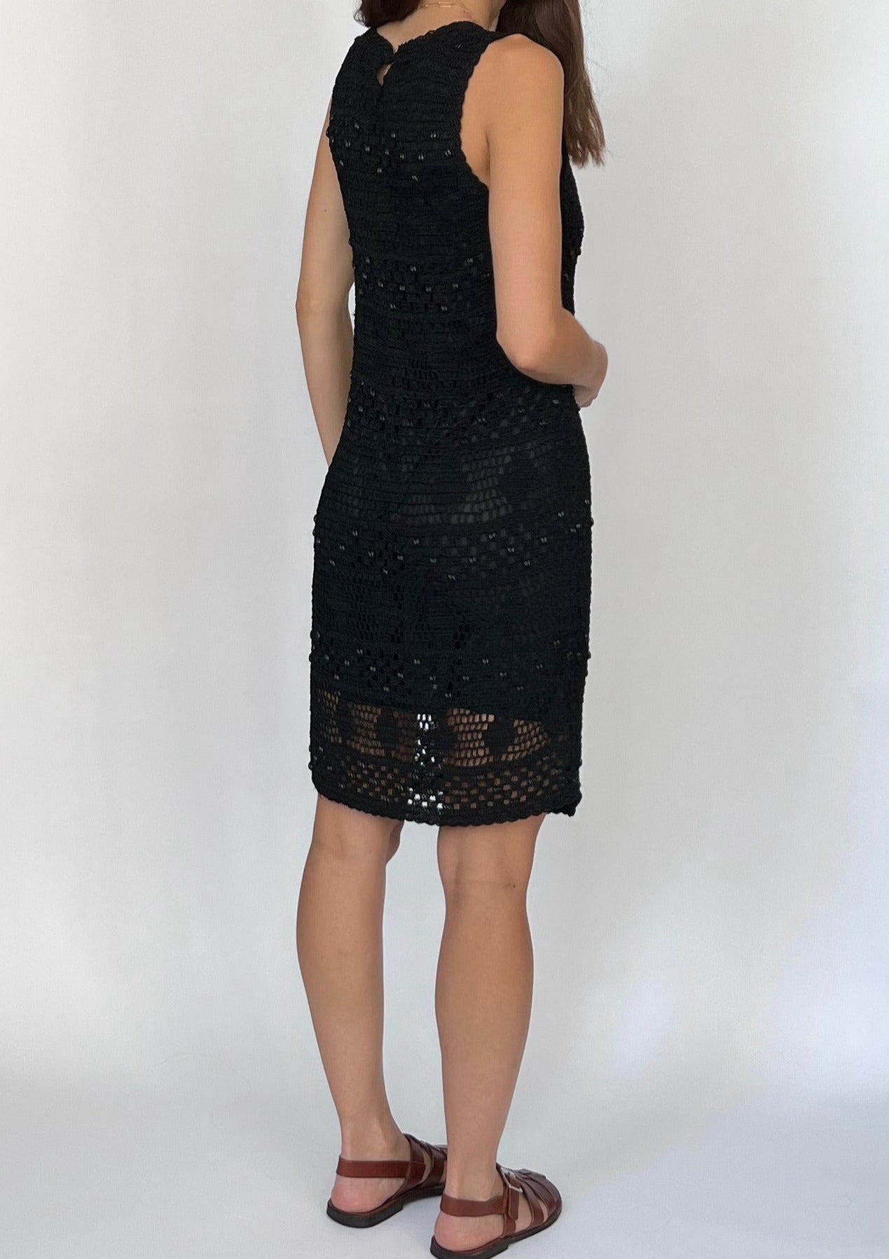 Black crochet column dress with a high round neck and black beading. Fully lined, most probably 90s. Fastens with one crochet button to the back neck