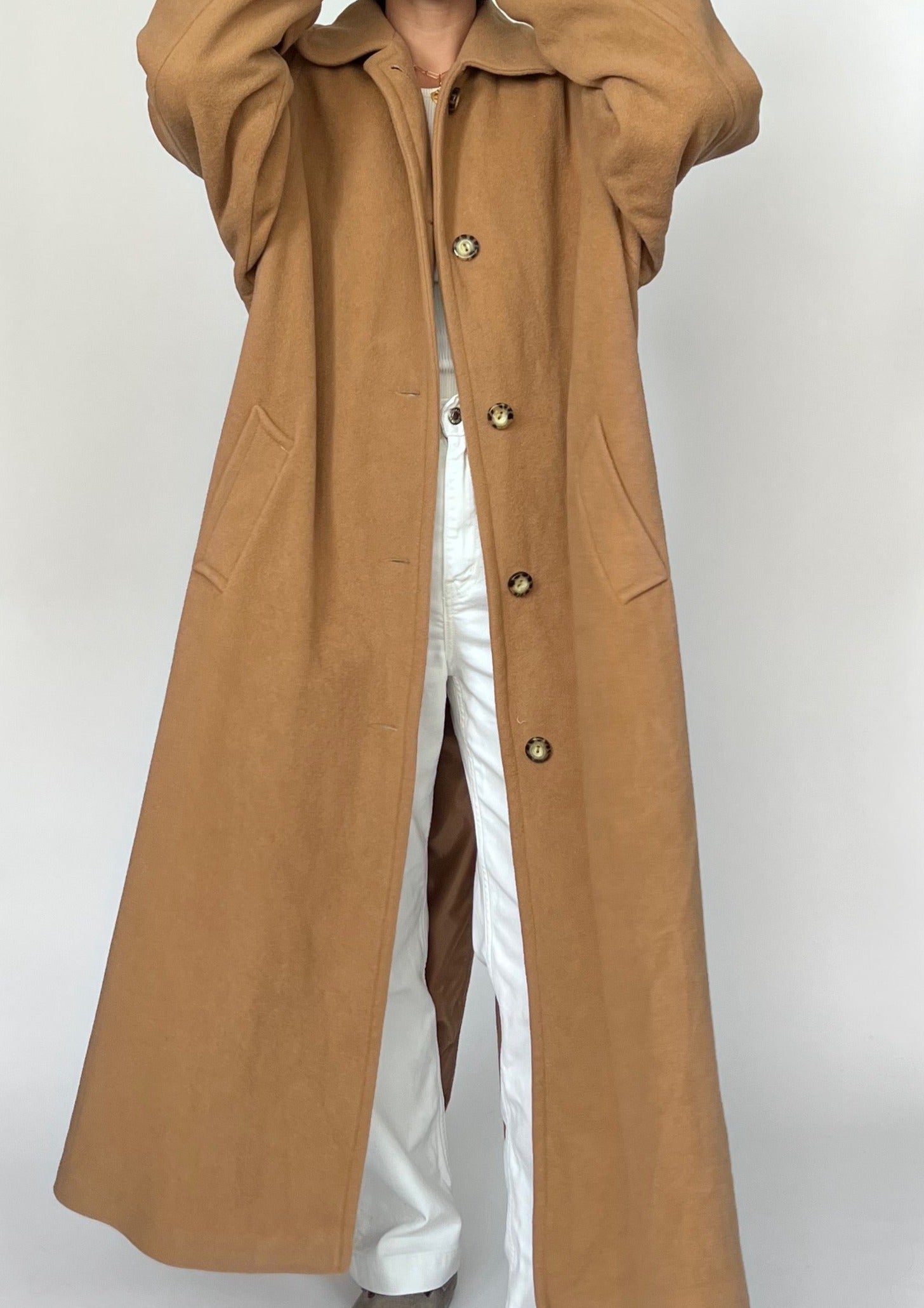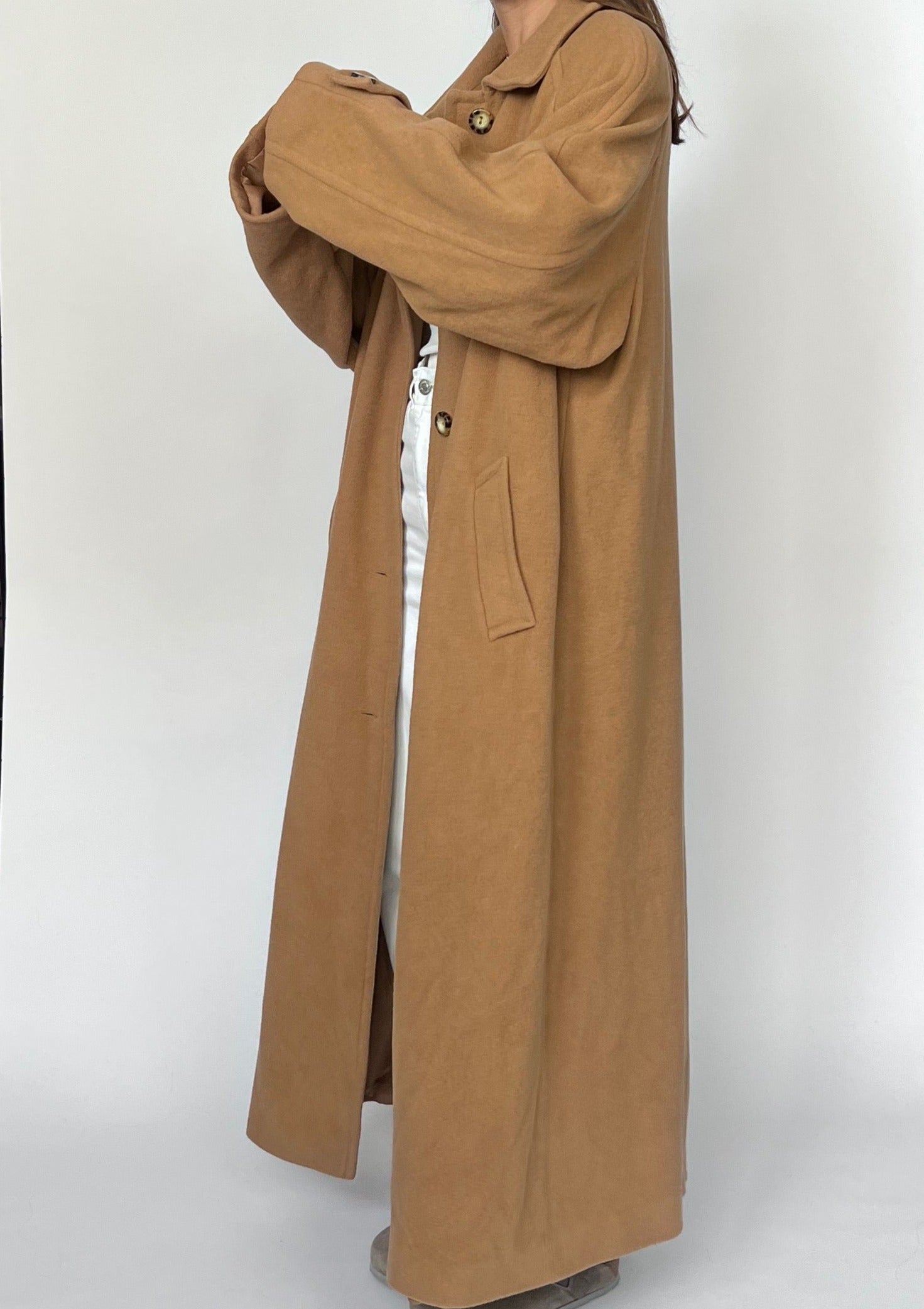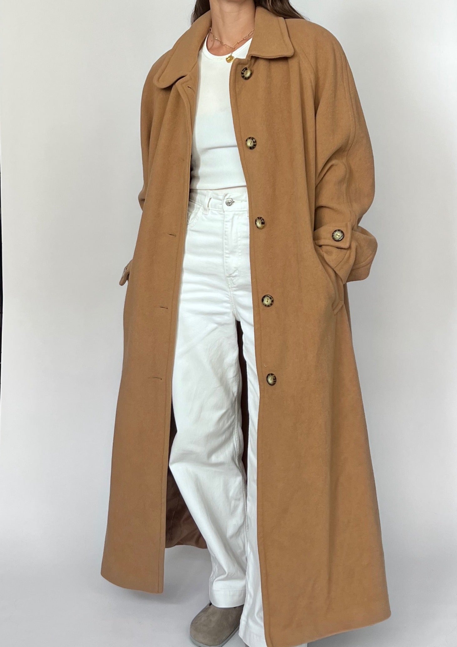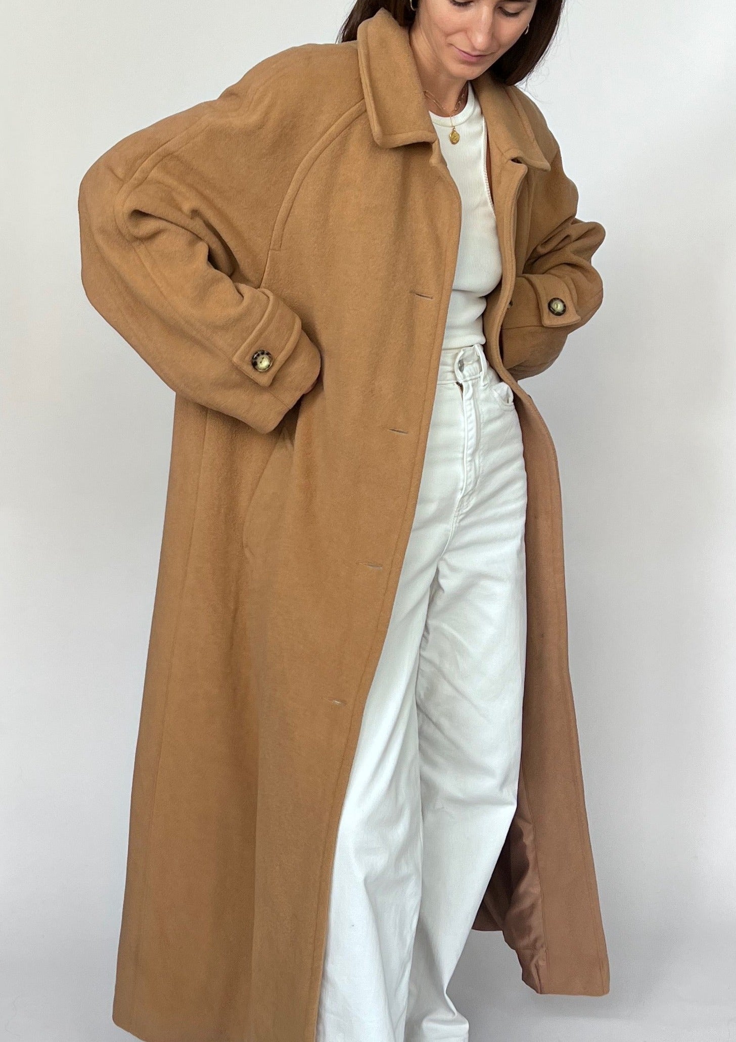 90s Caramel maxi coat. Features two side pockets, a button fastening, fully lined and a clean, maxi cut. With a raglan, the fit is relaxed.