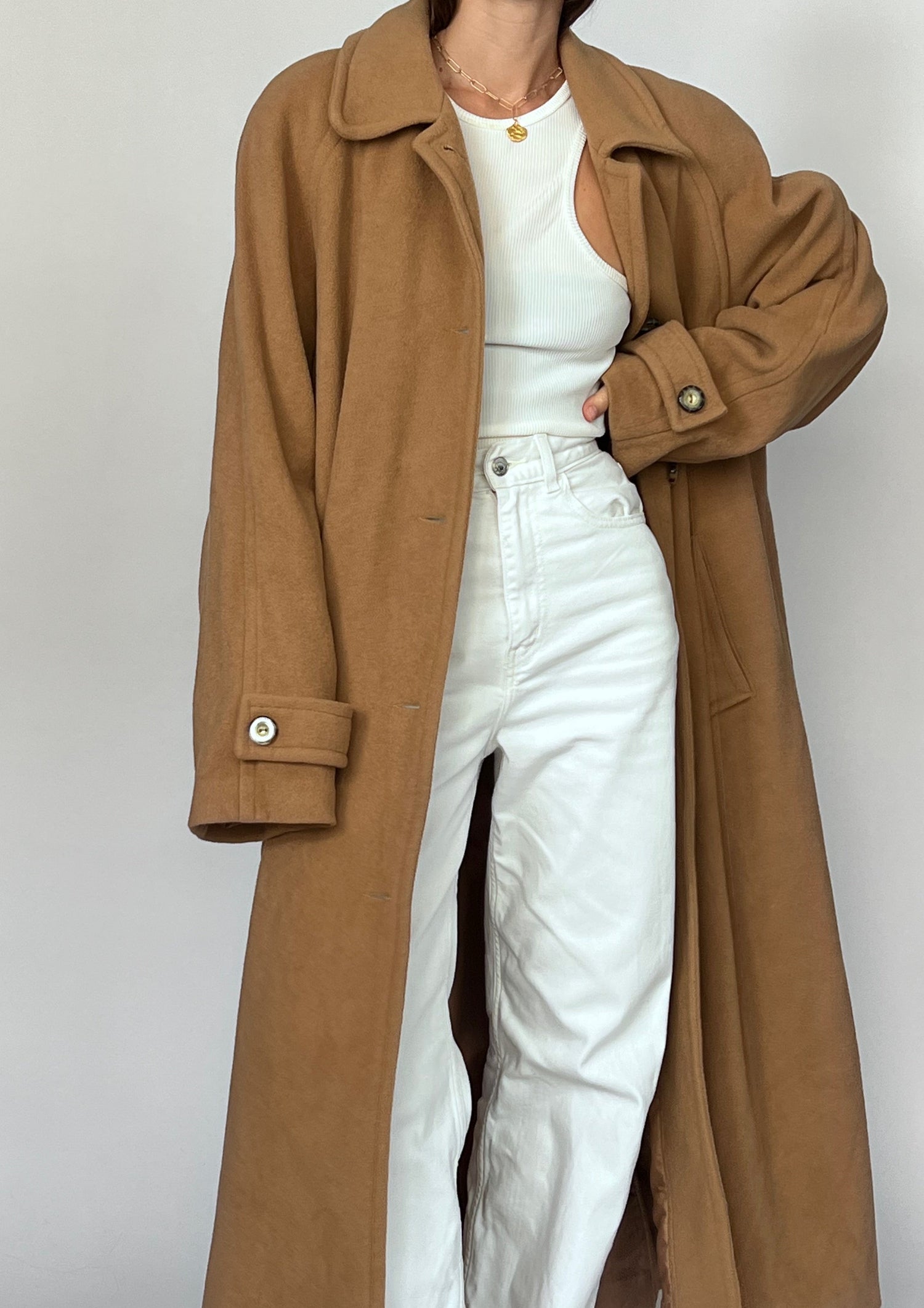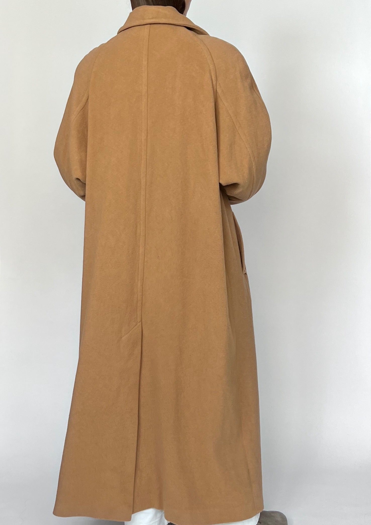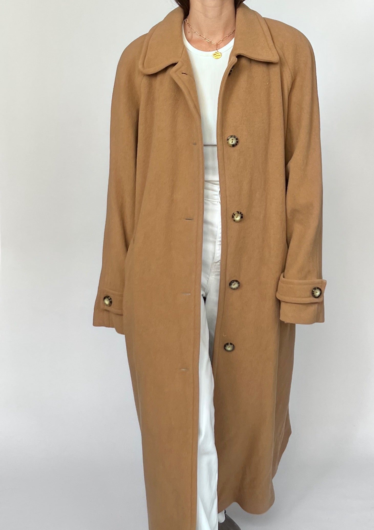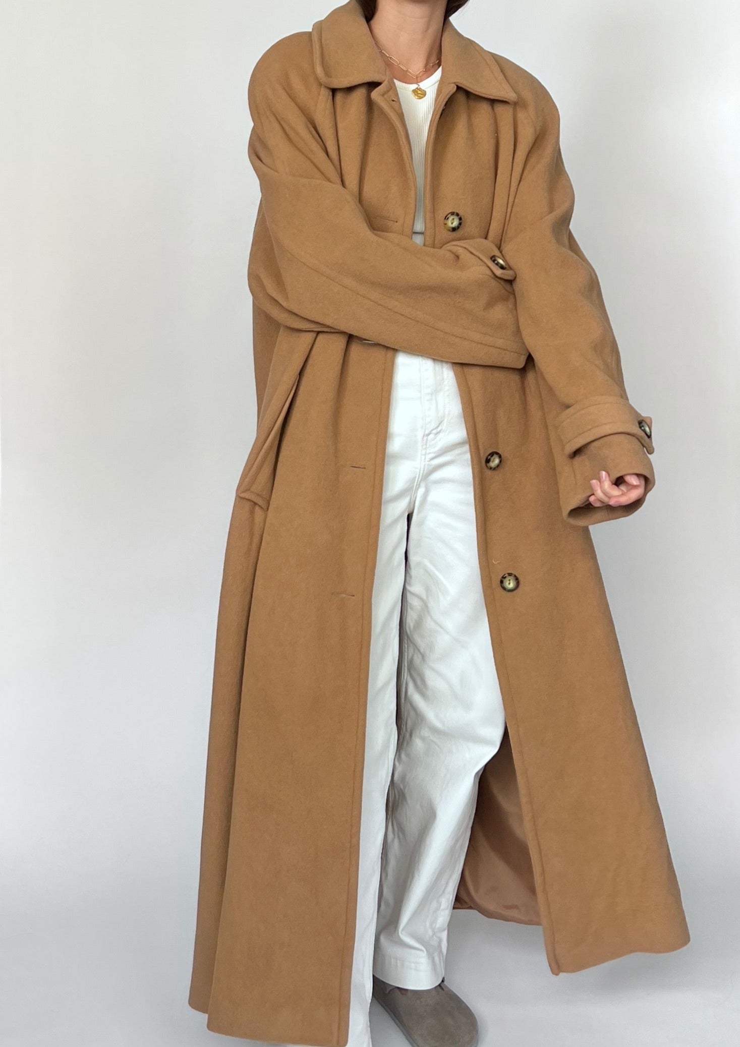 90s Caramel maxi coat. Features two side pockets, a button fastening, fully lined and a clean, maxi cut. With a raglan, the fit is relaxed.