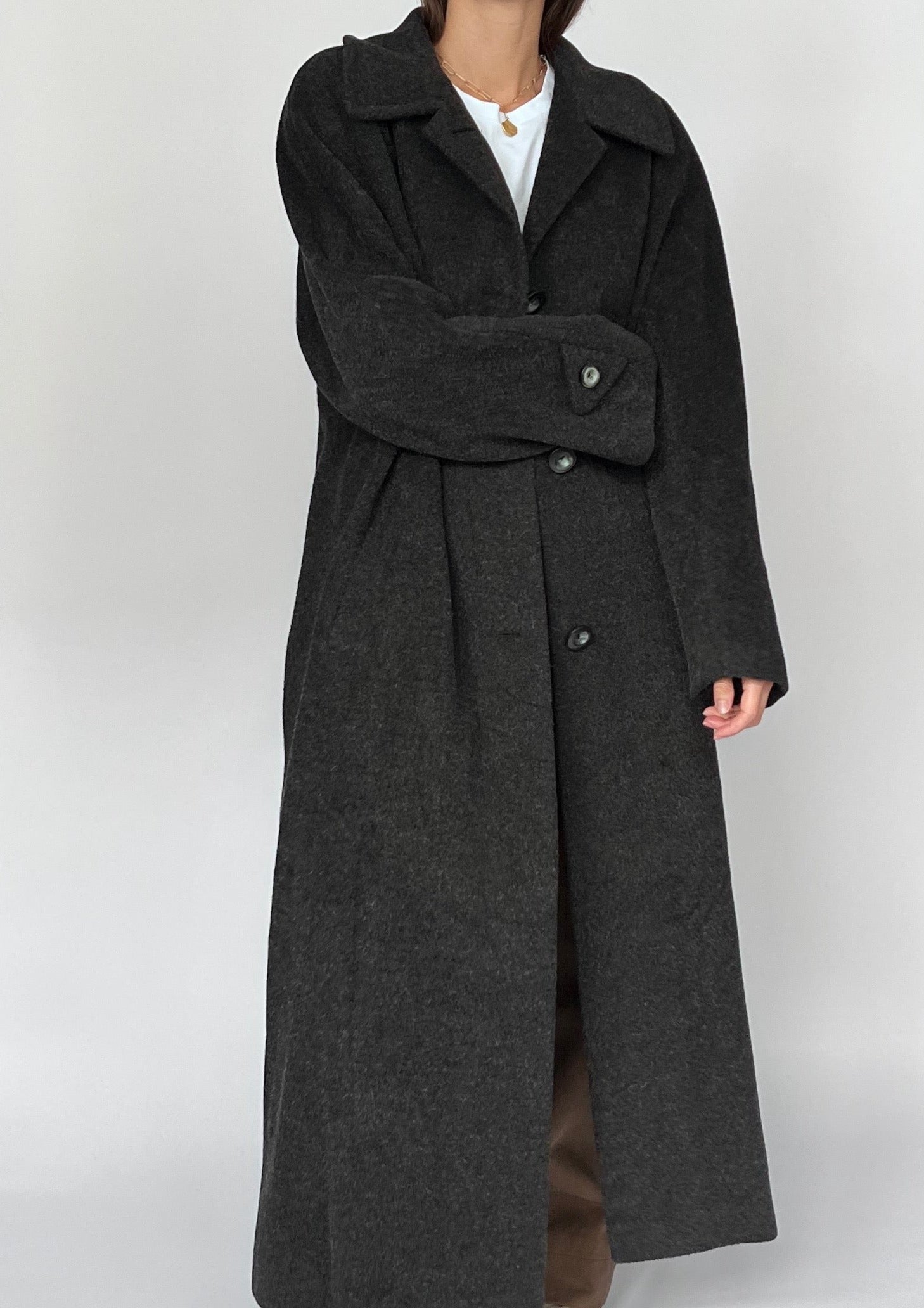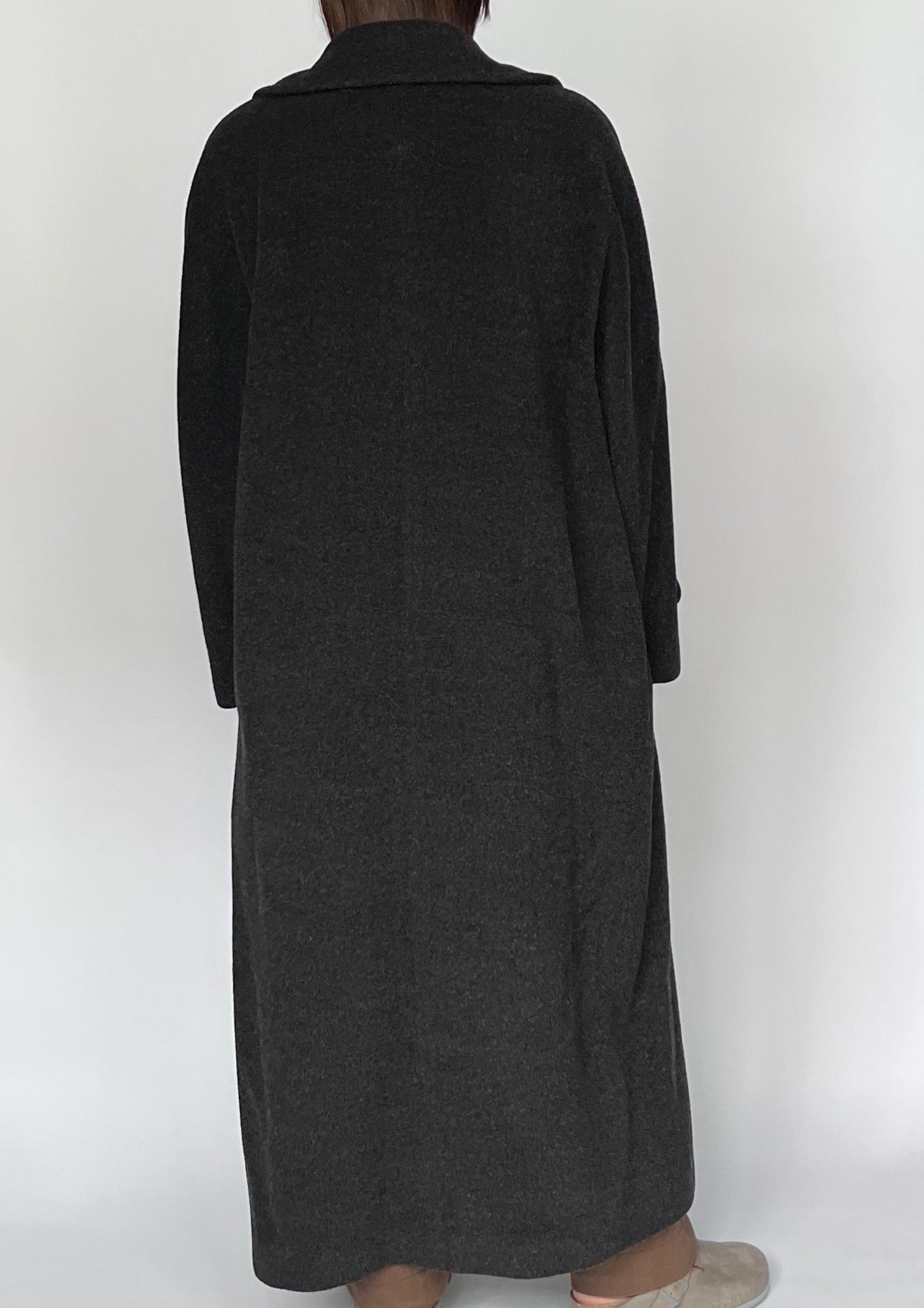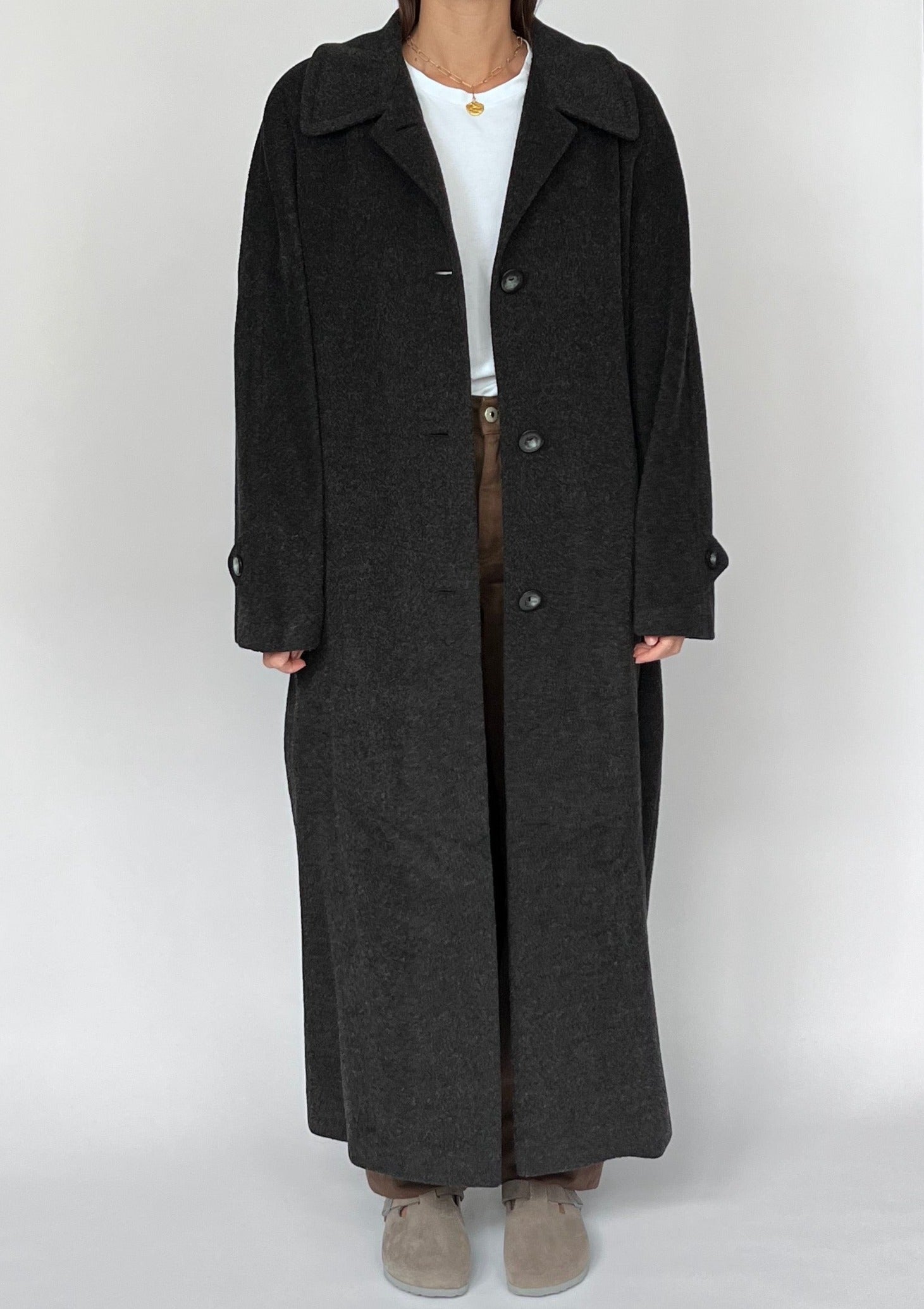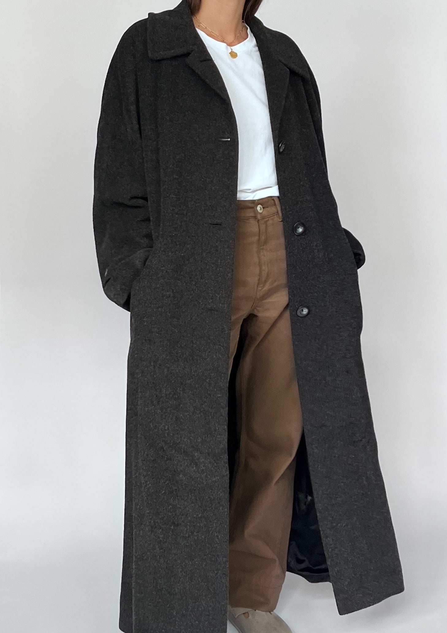 90s Charcoal maxi coat. Features two side pockets, a button fastening, fully lined and a clean, maxi cut. With a raglan, drop sleeve, the fit is relaxed.