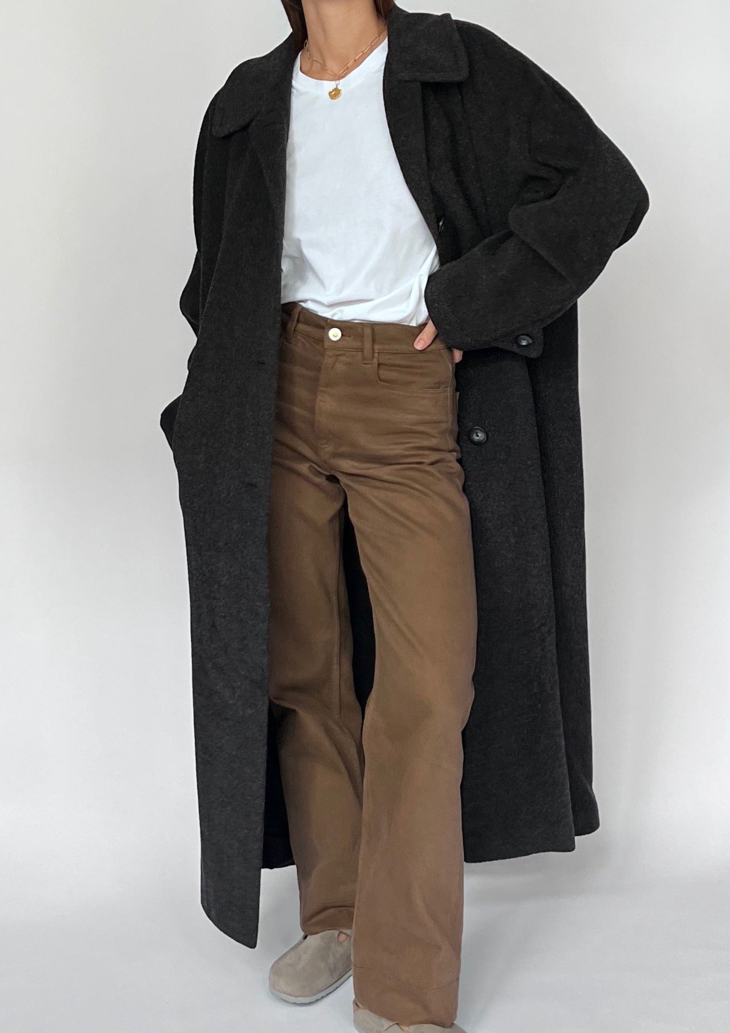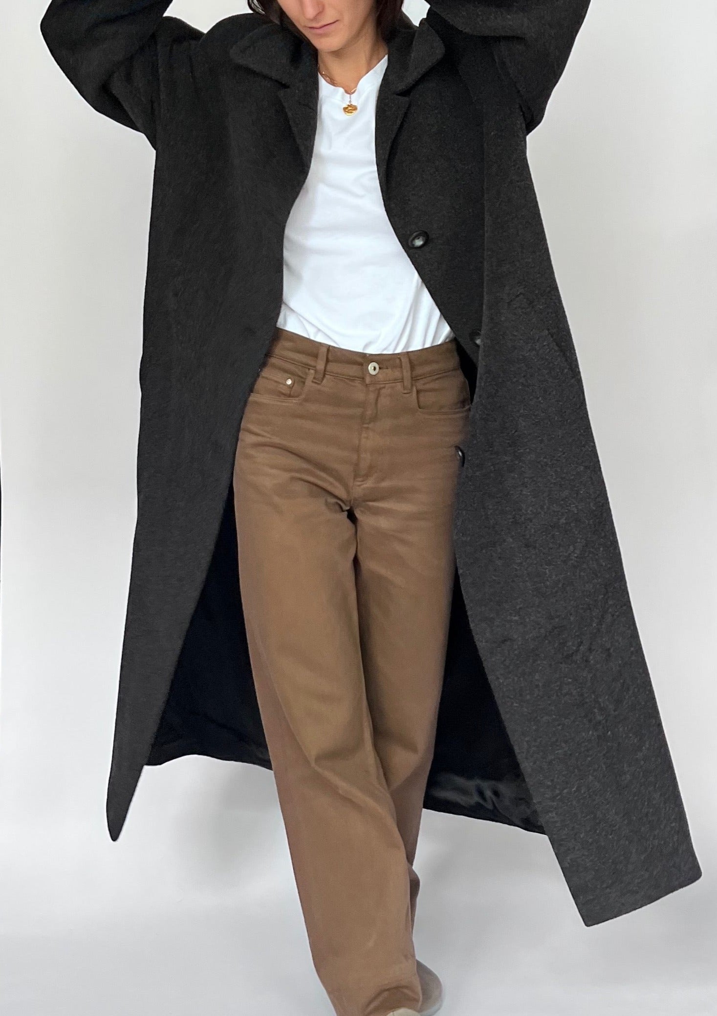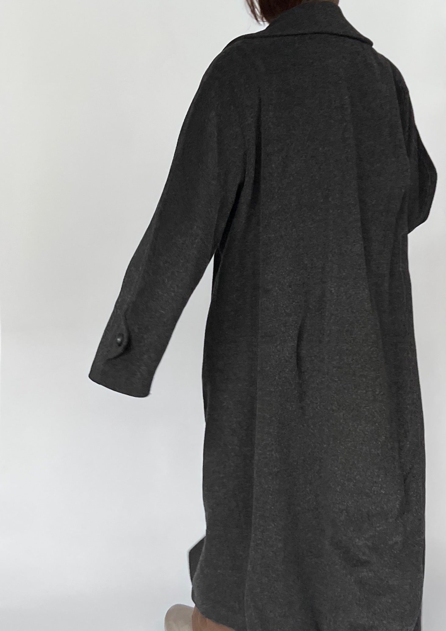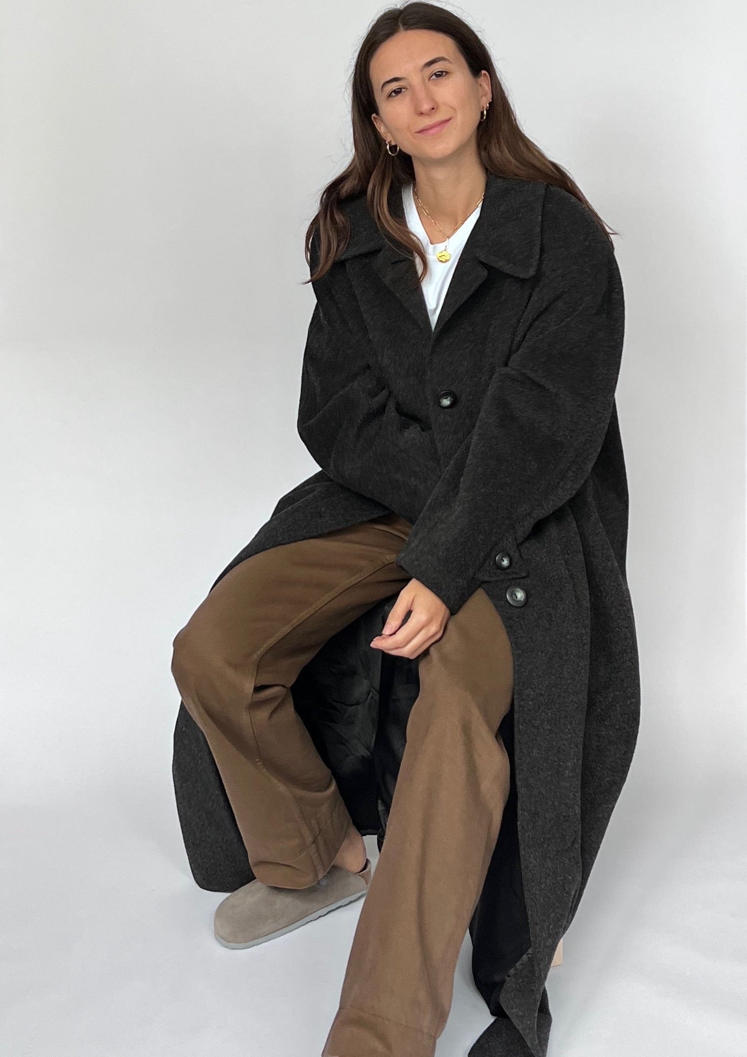 90s Charcoal maxi coat. Features two side pockets, a button fastening, fully lined and a clean, maxi cut. With a raglan, drop sleeve, the fit is relaxed.