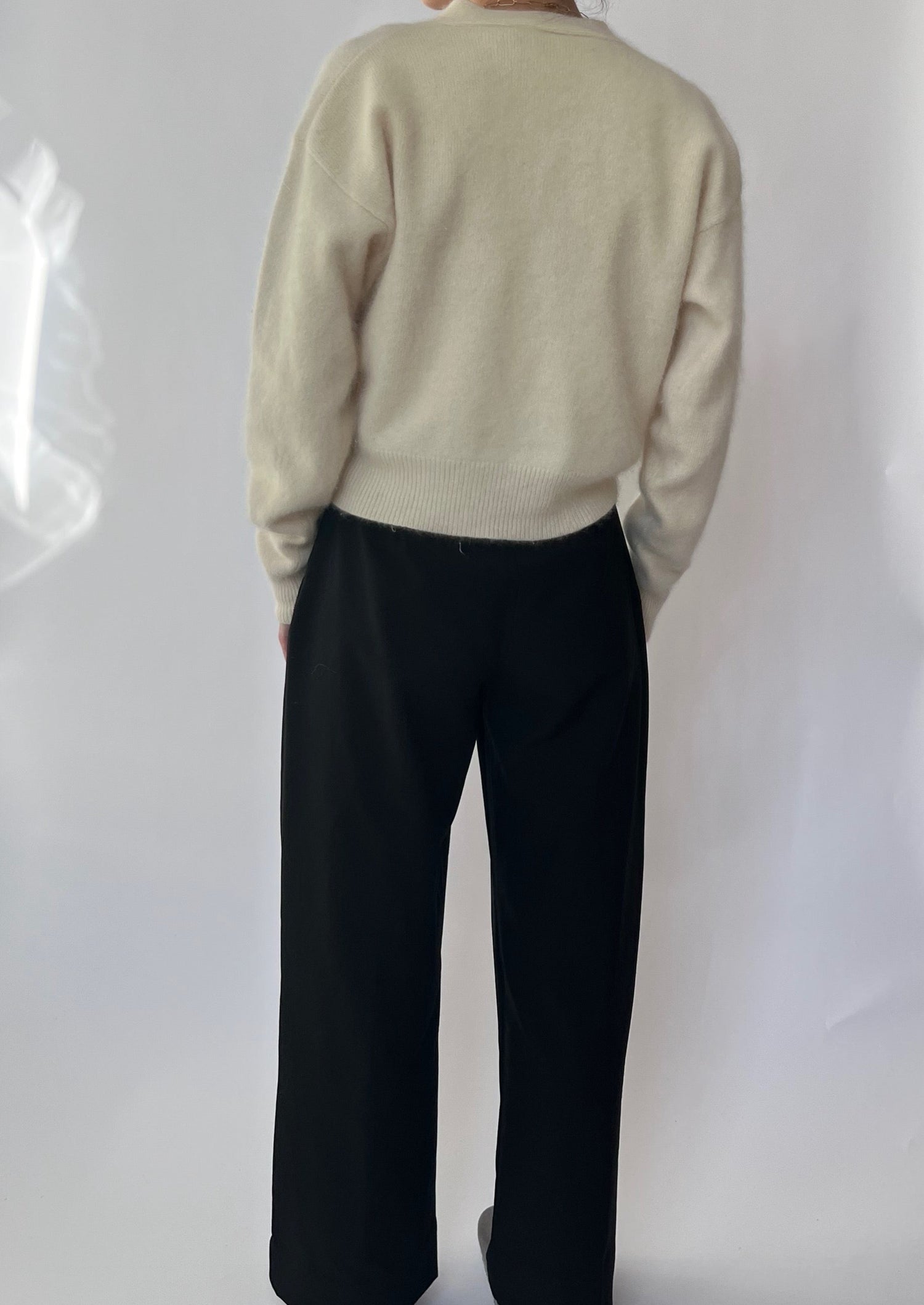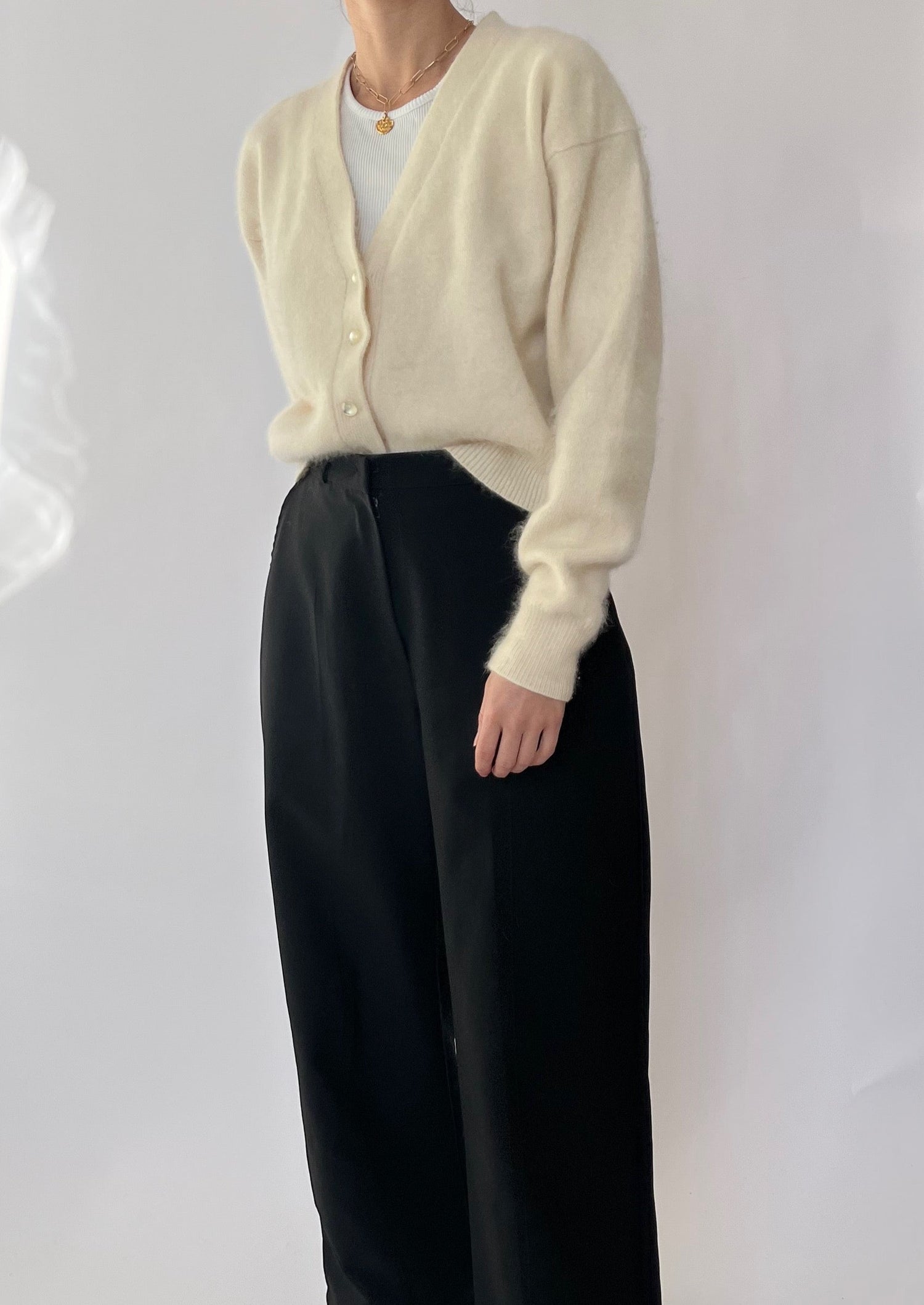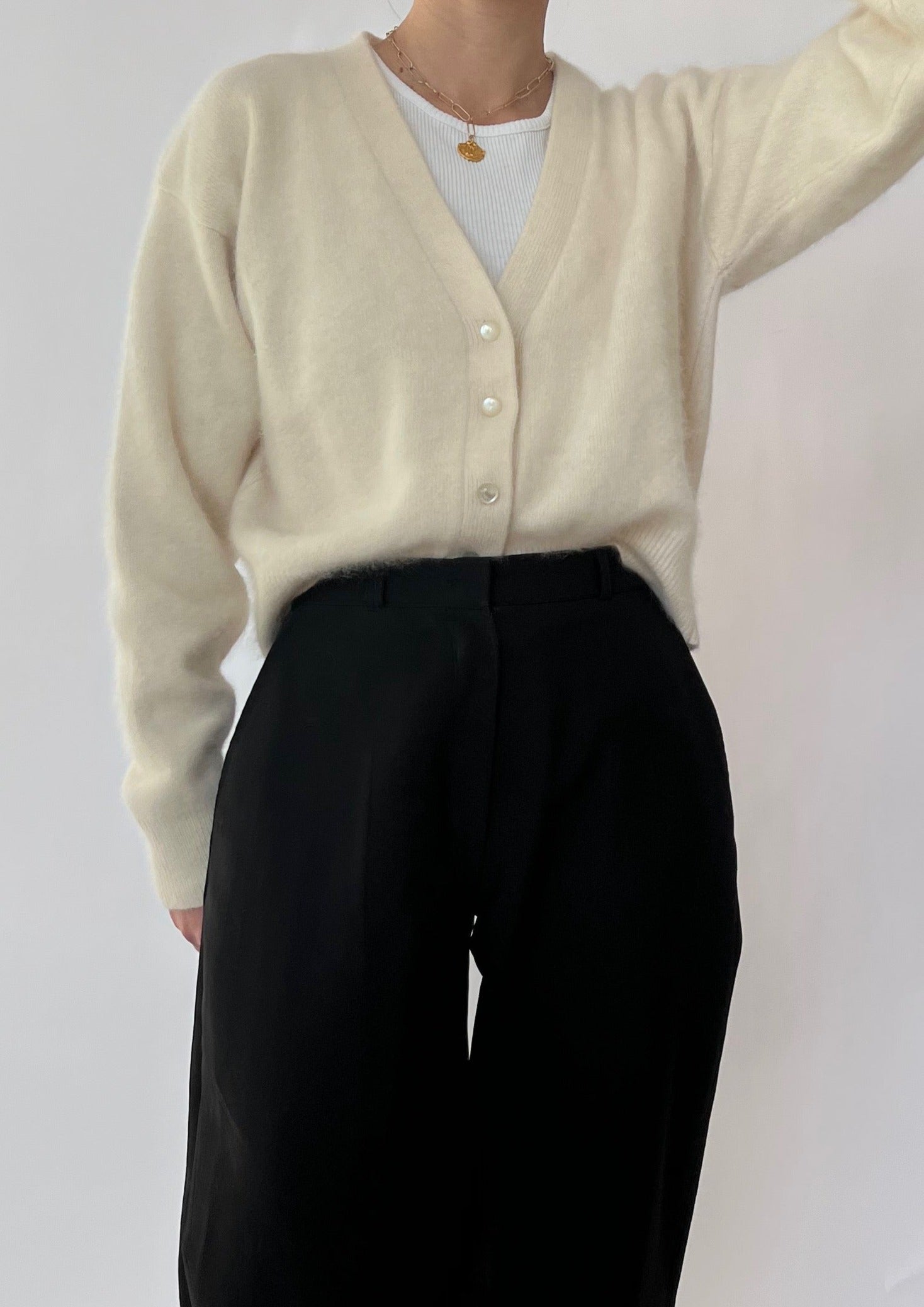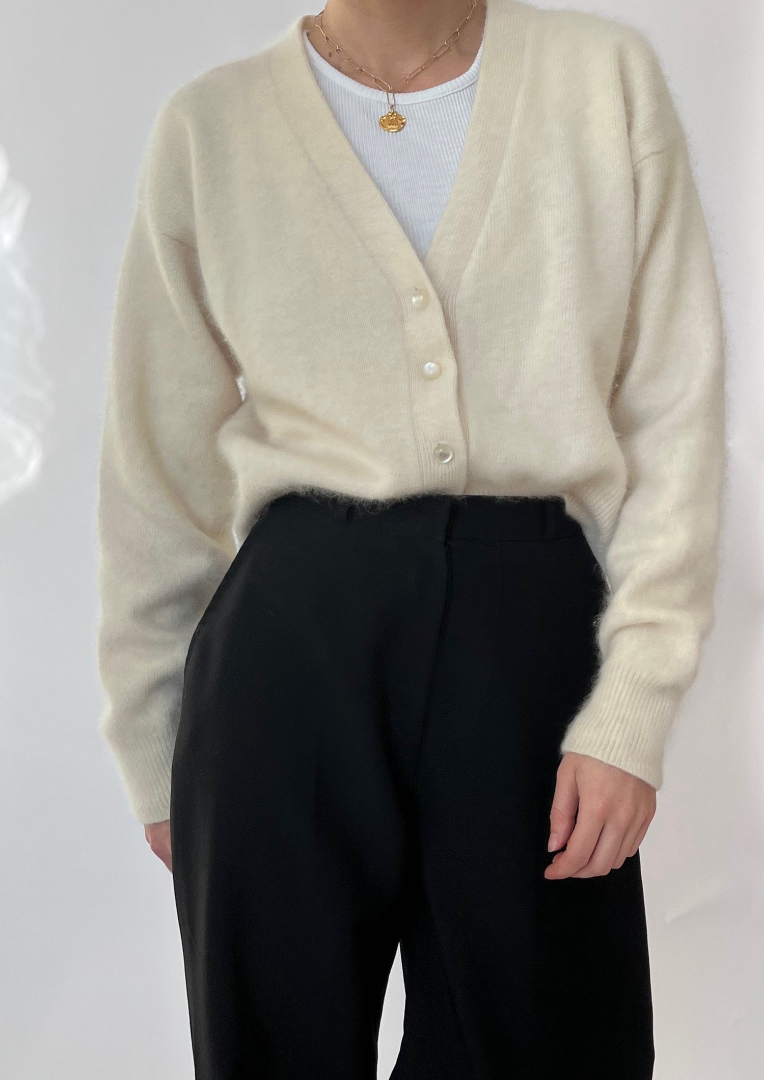 90s Cream angora cardigan. Features long sleeves, a v-neckline and a cropped length.
